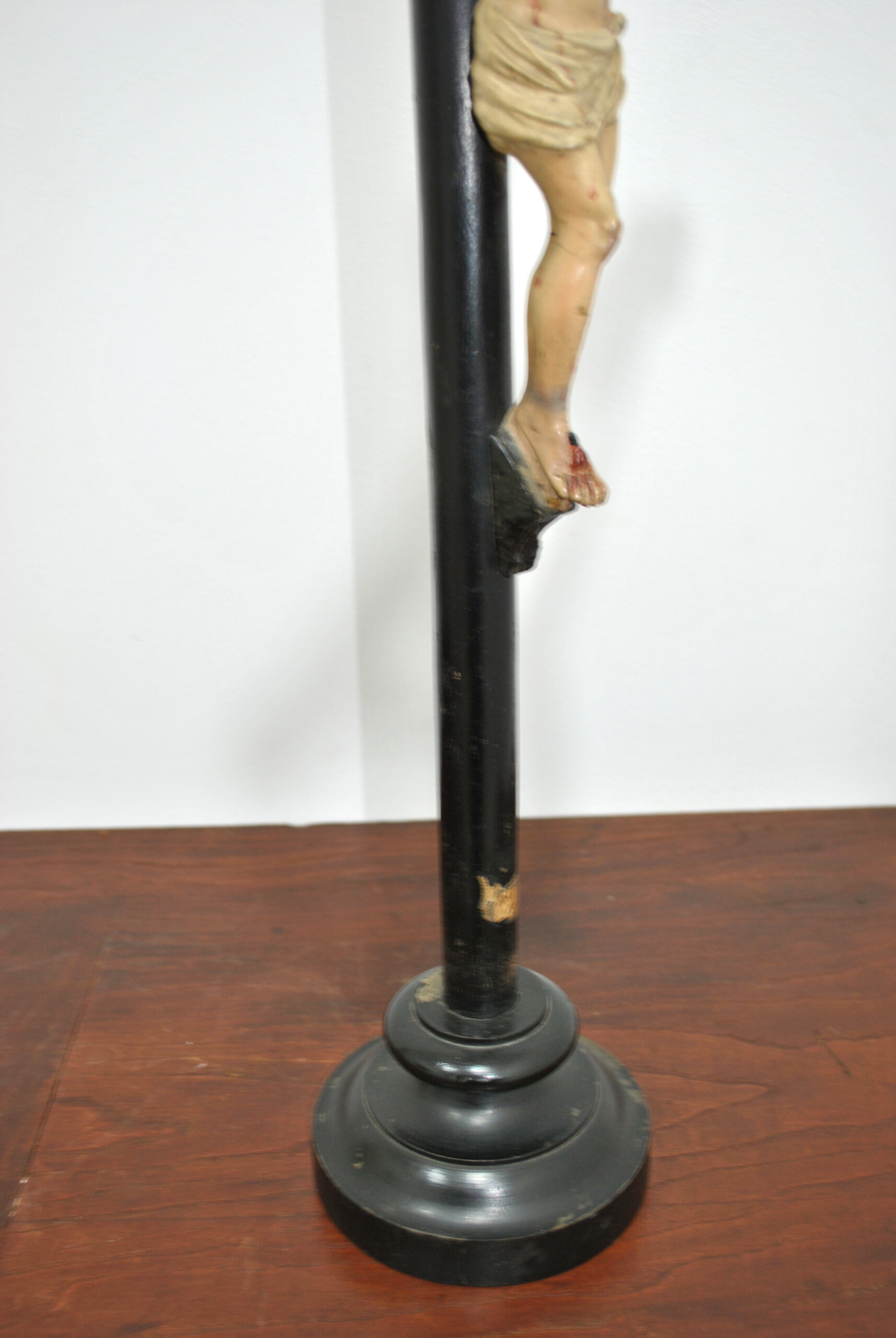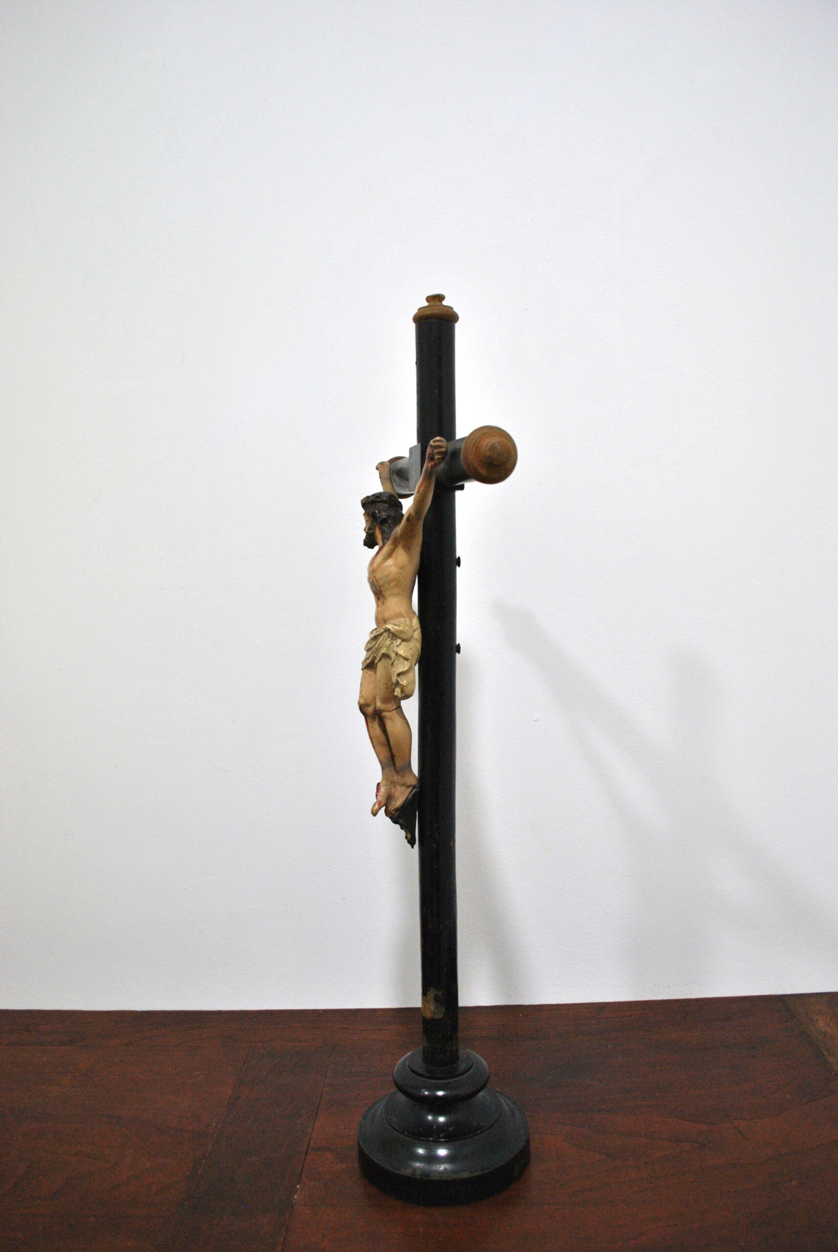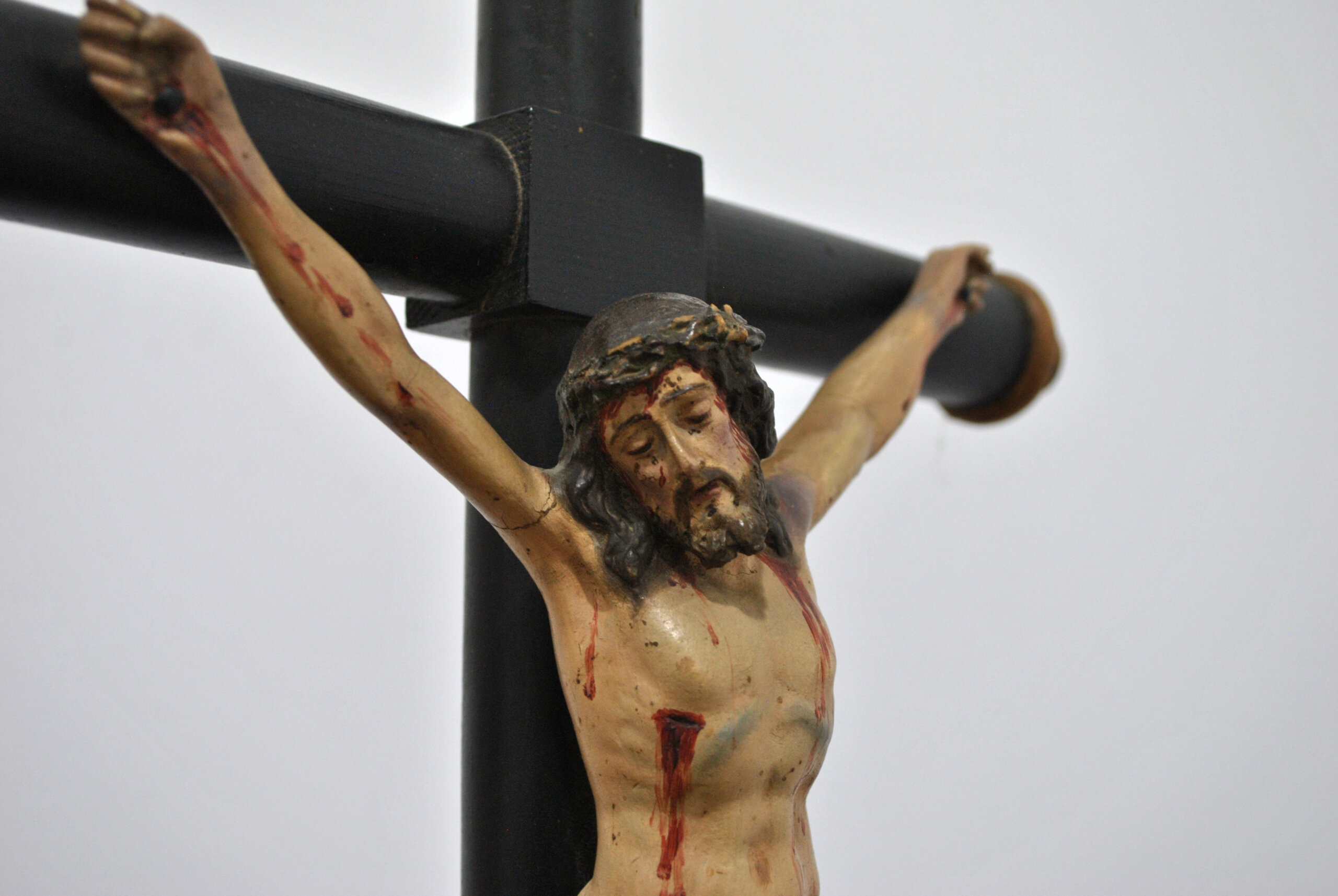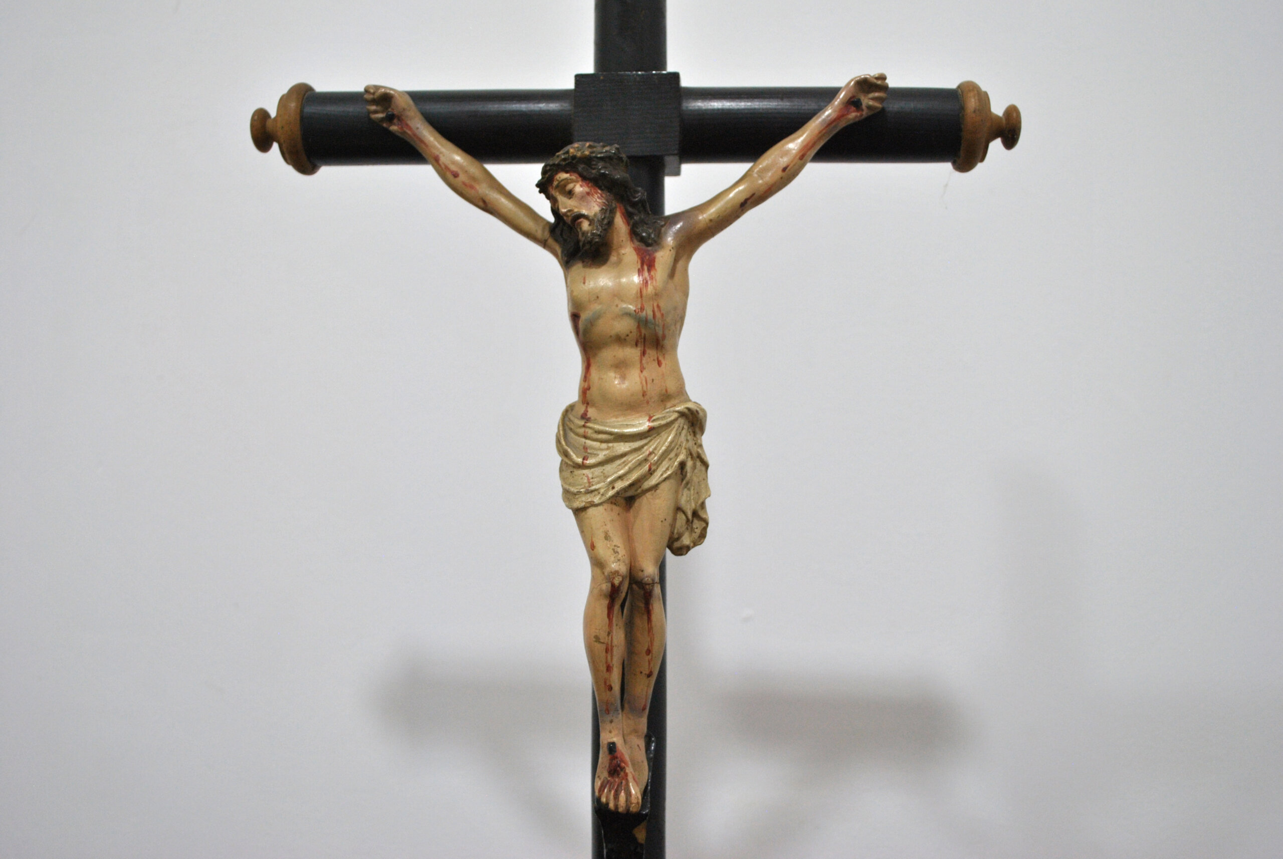 REF: 12182 – Crucifijo antiguo compuesto por una imagen de Cristo tallada y policromada, fijada sobre cruz de madera torneada en acabado oscuro. La figura presenta un modelado expresivo y naturalista, con cuidada anatomía y detallada policromía que resalta las heridas y la representación del sacrificio, siguiendo la tradición iconográfica cristiana.