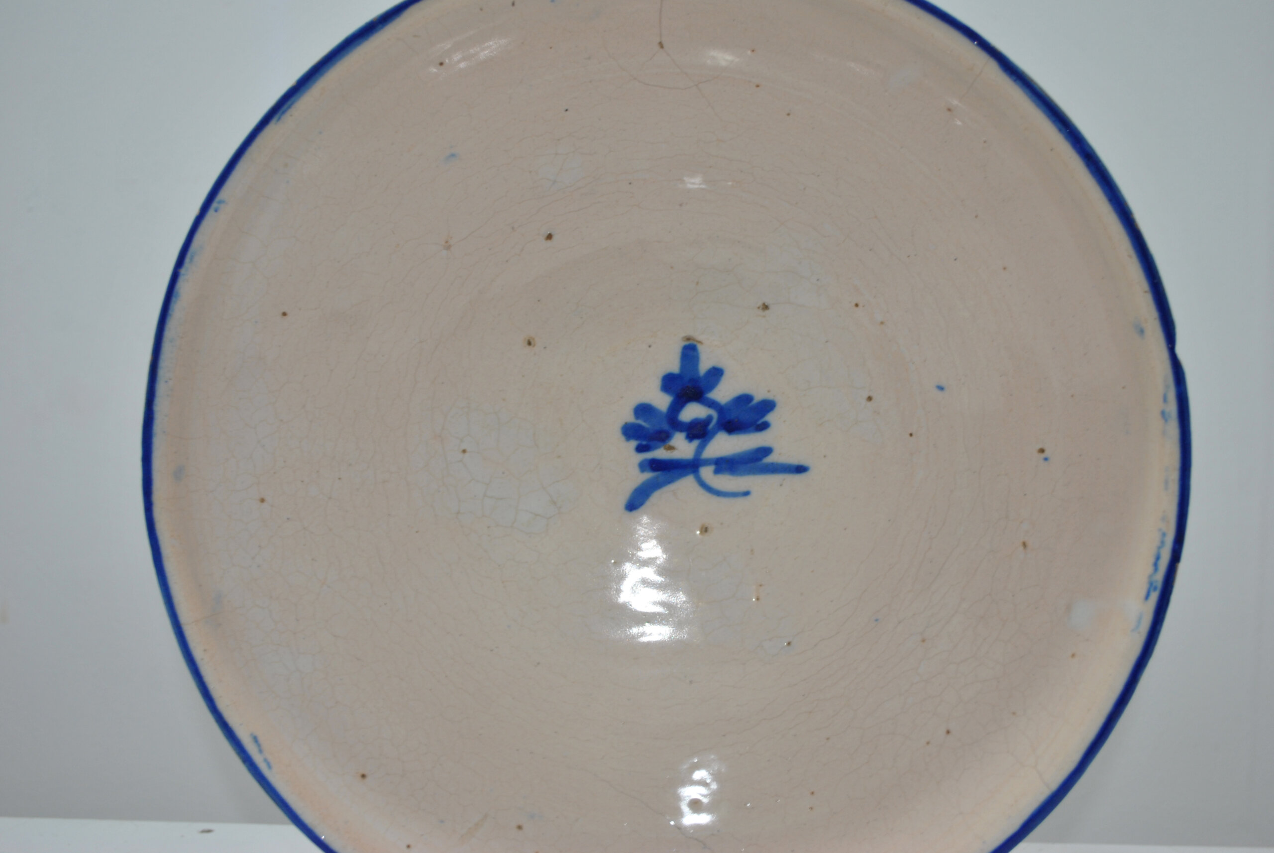 REF: 12236 – Bonito cuenco antiguo de cerámica esmaltada en tono beige con borde y detalle central en azul. Pieza de estilo rústico con marcas del tiempo que le aportan carácter y autenticidad (pequeñas imperfecciones y desgaste en el borde). Ideal para decoración, coleccionismo o uso como centro de mesa.