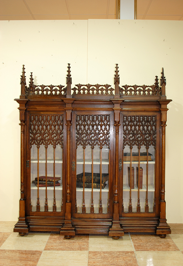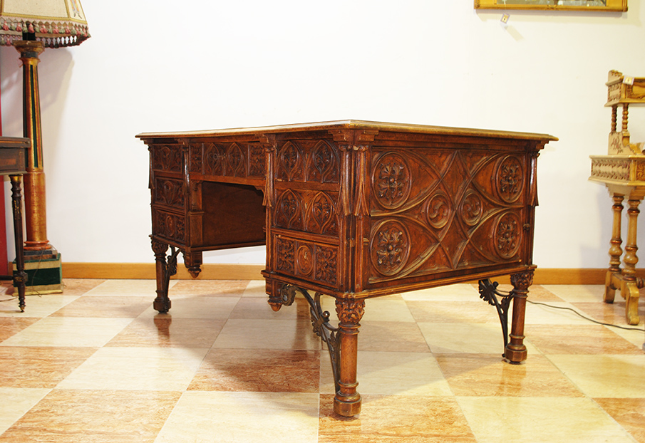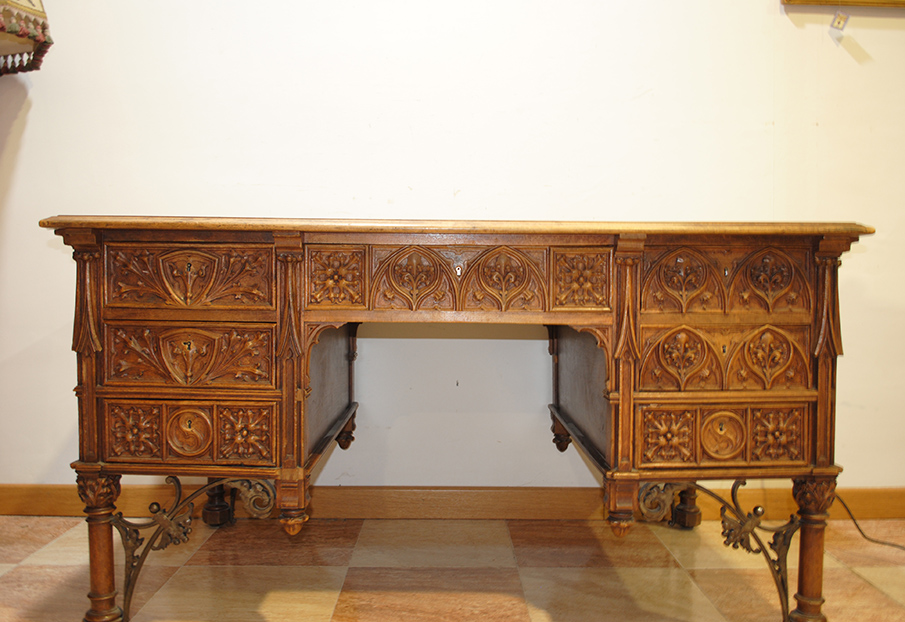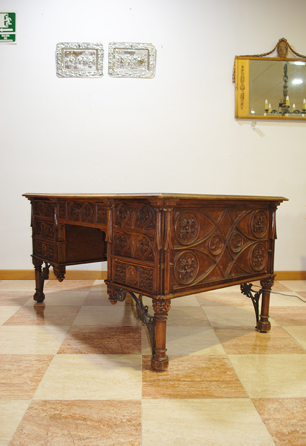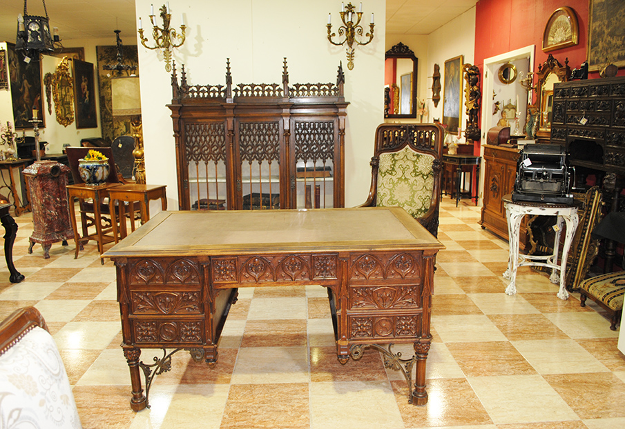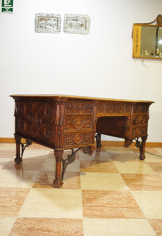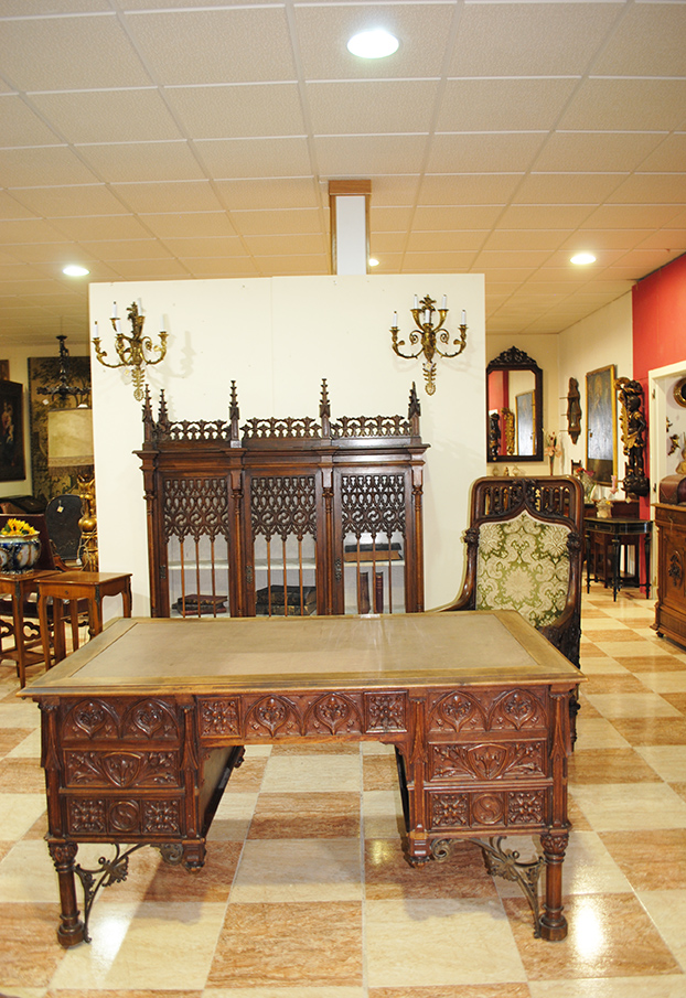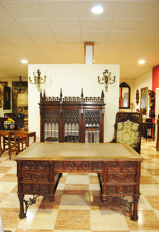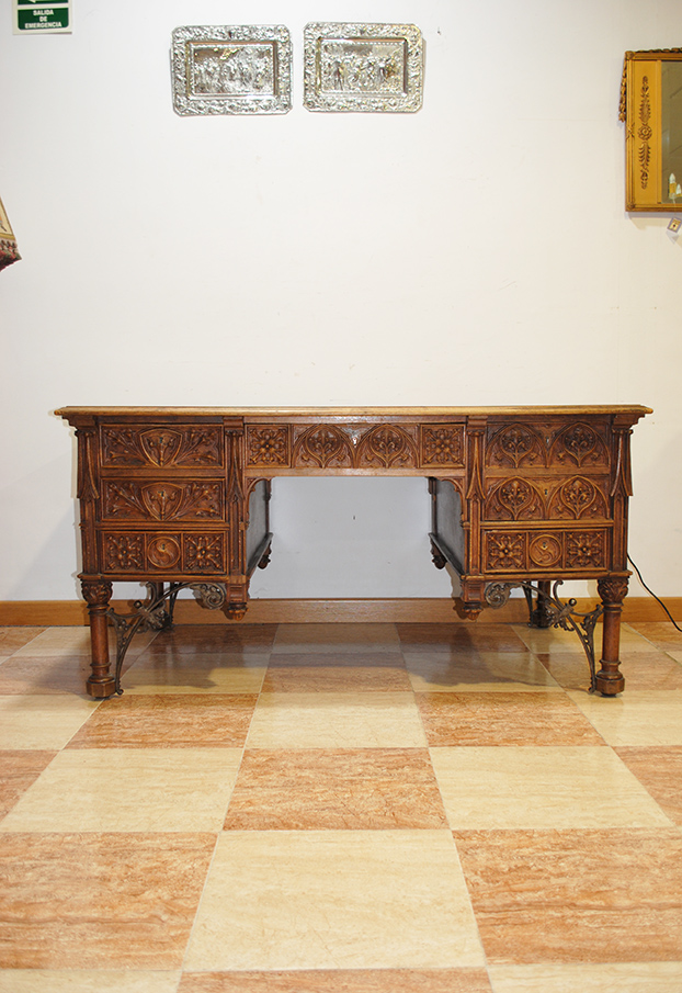 REF: 7646 – Imponente conjunto antiguo o despacho de estilo neogótico en madera maciza tallada, compuesto por gran escritorio de despacho con tapa amplia en tono claro y múltiples cajones (laterales y central) decorados con motivos geométricos y florales, apoyado sobre patas torneadas y refuerzos en hierro, ideal como mesa de trabajo o despacho señorial; se acompaña de una espectacular vitrina/librería de tres cuerpos con puertas acristaladas y tracerías góticas, rematada con crestería calada y pináculos, perfecta para exponer libros, vajilla o piezas de colección; y completa el conjunto un elegante sillón de brazos a juego, con estructura tallada y detalles de inspiración medieval, tapizado en tela damasco verde que realza su carácter clásico. Una pieza de gran presencia y calidad artesanal, ideal para decorar un despacho, biblioteca o salón con personalidad.