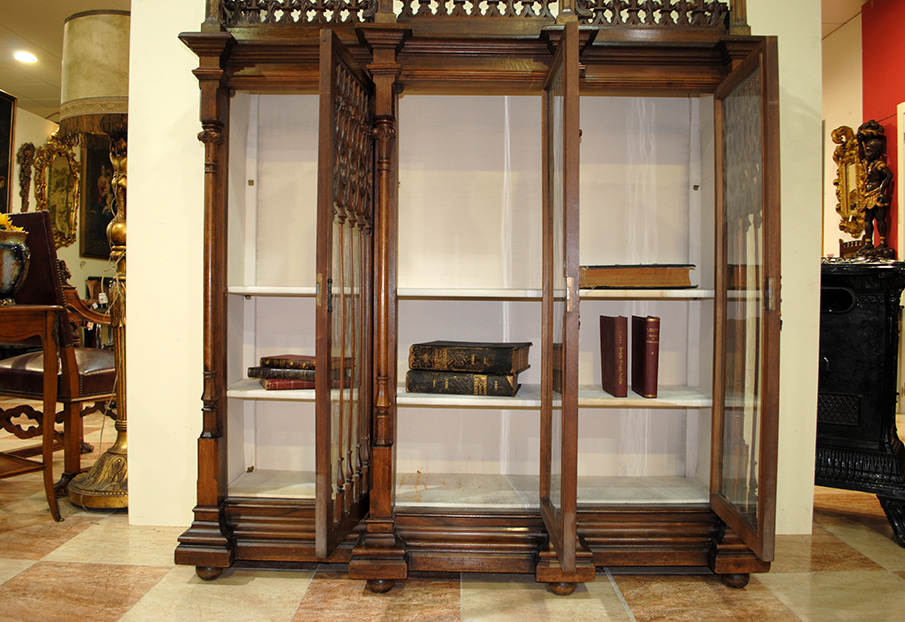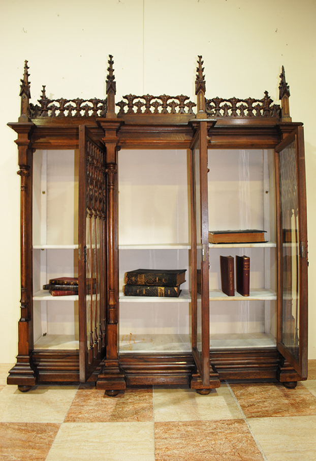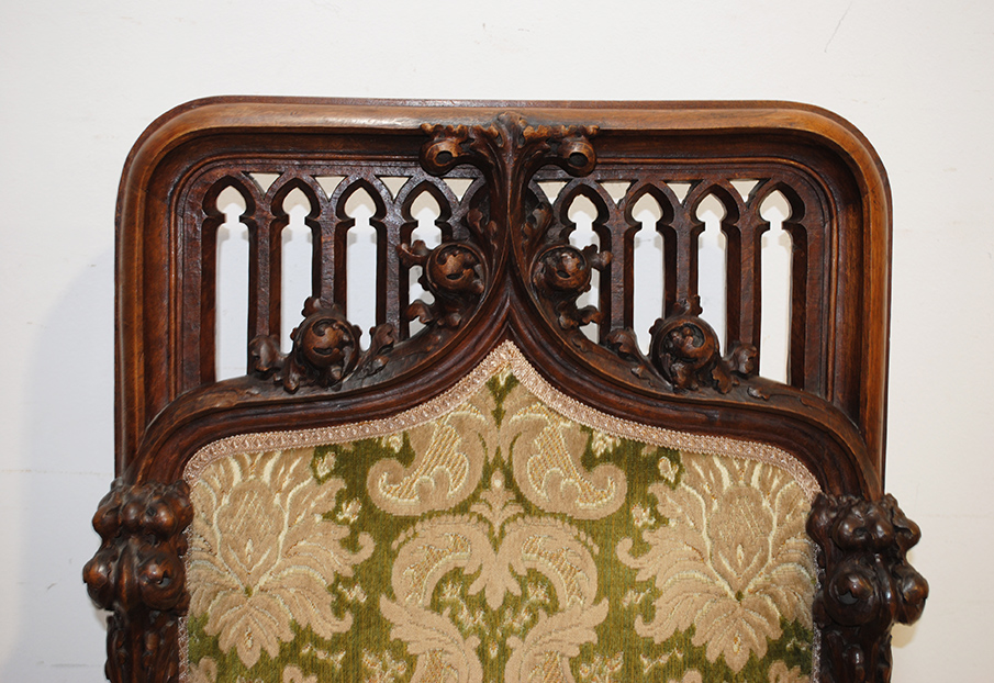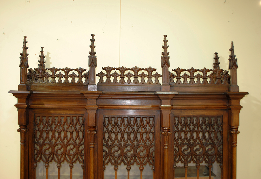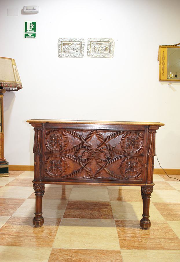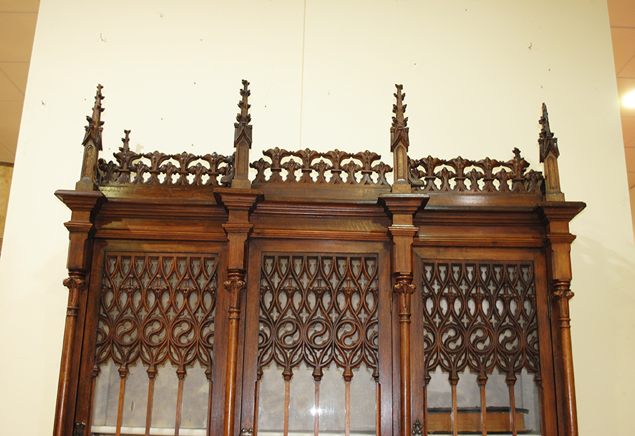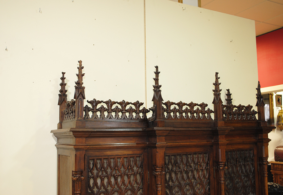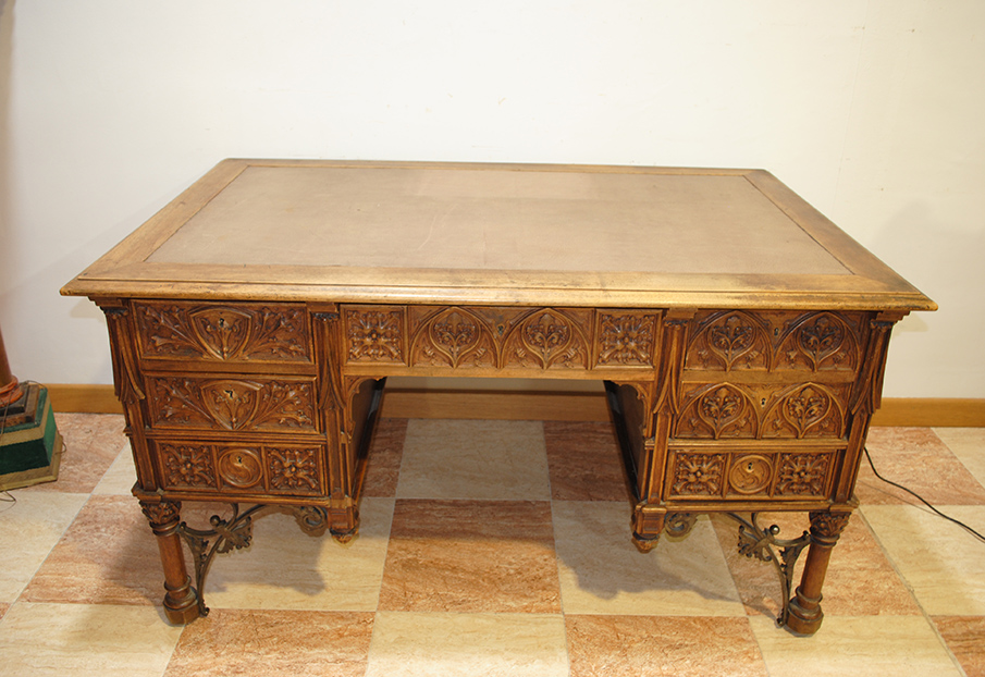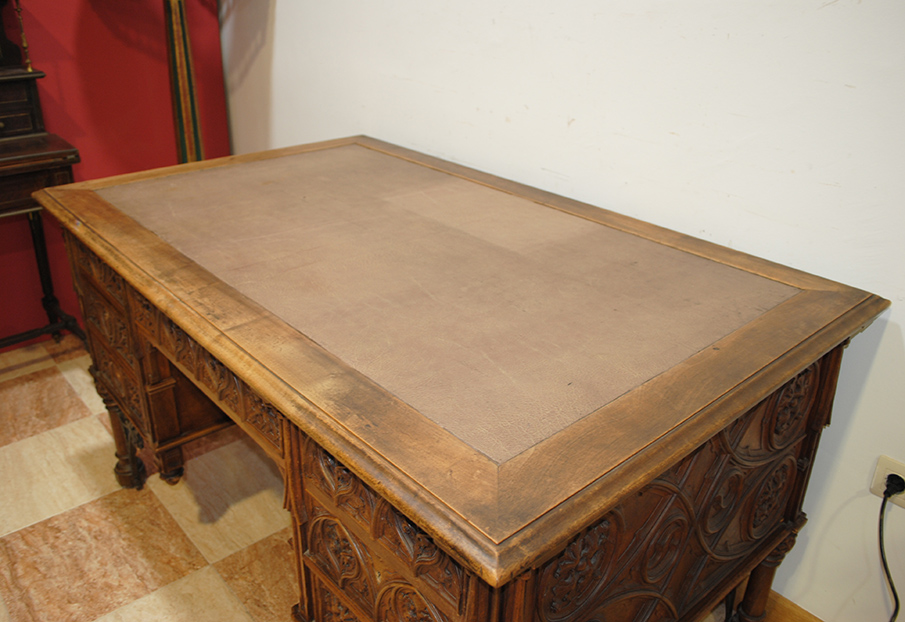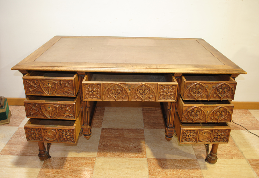 REF: 7646 – Imponente conjunto antiguo o despacho de estilo neogótico en madera maciza tallada, compuesto por gran escritorio de despacho con tapa amplia en tono claro y múltiples cajones (laterales y central) decorados con motivos geométricos y florales, apoyado sobre patas torneadas y refuerzos en hierro, ideal como mesa de trabajo o despacho señorial; se acompaña de una espectacular vitrina/librería de tres cuerpos con puertas acristaladas y tracerías góticas, rematada con crestería calada y pináculos, perfecta para exponer libros, vajilla o piezas de colección; y completa el conjunto un elegante sillón de brazos a juego, con estructura tallada y detalles de inspiración medieval, tapizado en tela damasco verde que realza su carácter clásico. Una pieza de gran presencia y calidad artesanal, ideal para decorar un despacho, biblioteca o salón con personalidad.