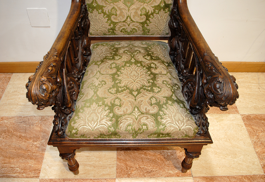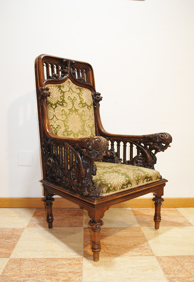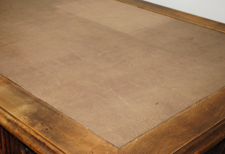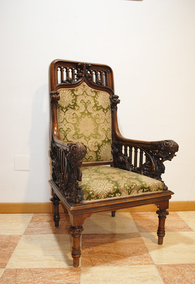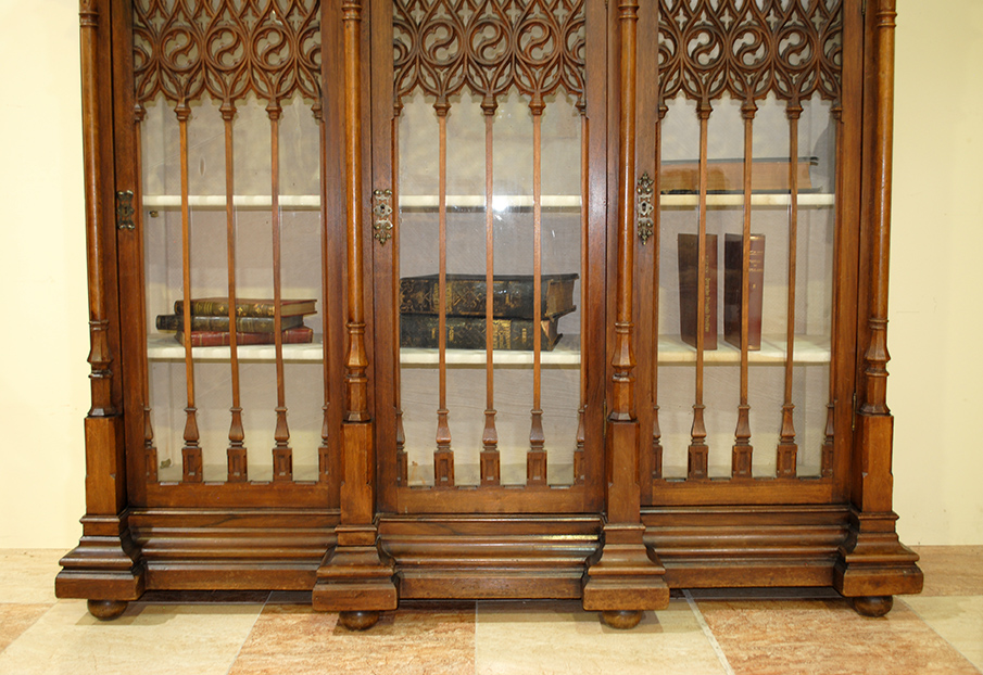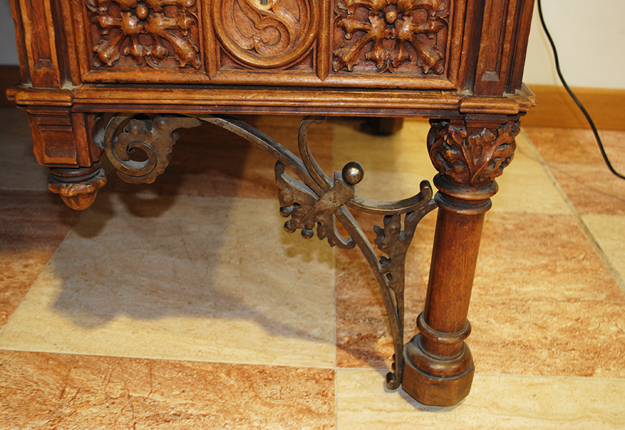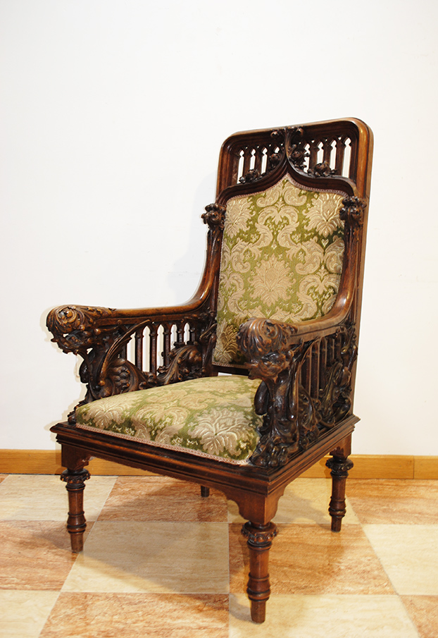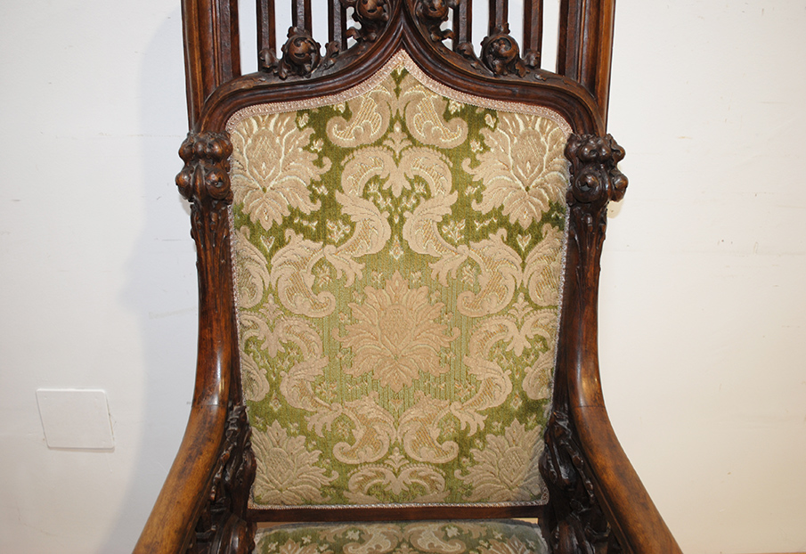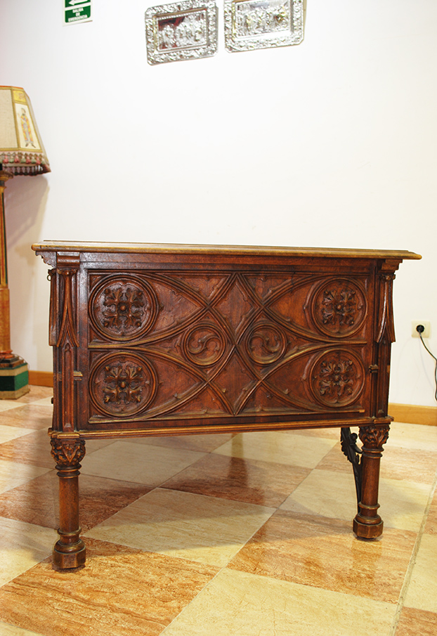REF: 7646 – Imponente conjunto antiguo o despacho de estilo neogótico en madera maciza tallada, compuesto por gran escritorio de despacho con tapa amplia en tono claro y múltiples cajones (laterales y central) decorados con motivos geométricos y florales, apoyado sobre patas torneadas y refuerzos en hierro, ideal como mesa de trabajo o despacho señorial; se acompaña de una espectacular vitrina/librería de tres cuerpos con puertas acristaladas y tracerías góticas, rematada con crestería calada y pináculos, perfecta para exponer libros, vajilla o piezas de colección; y completa el conjunto un elegante sillón de brazos a juego, con estructura tallada y detalles de inspiración medieval, tapizado en tela damasco verde que realza su carácter clásico. Una pieza de gran presencia y calidad artesanal, ideal para decorar un despacho, biblioteca o salón con personalidad.