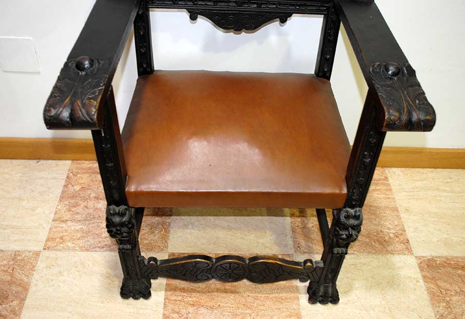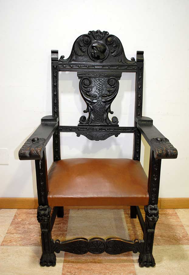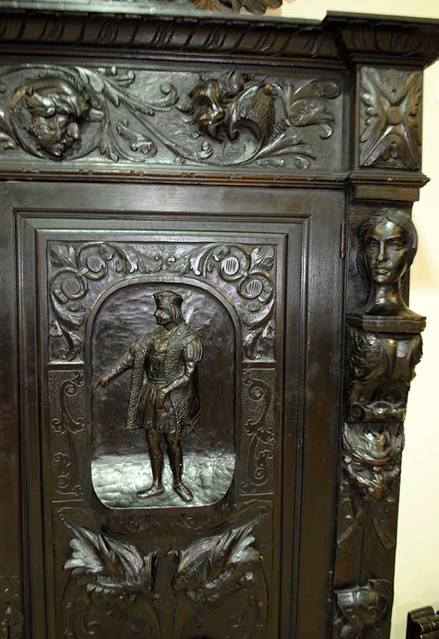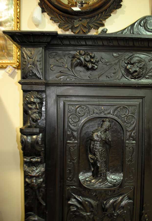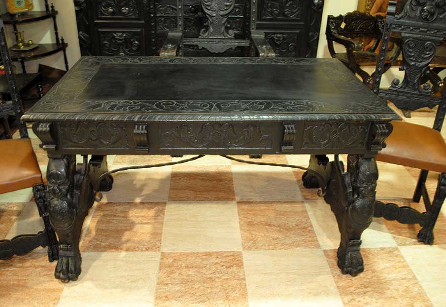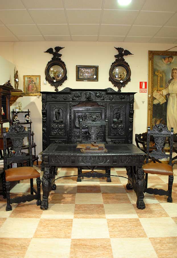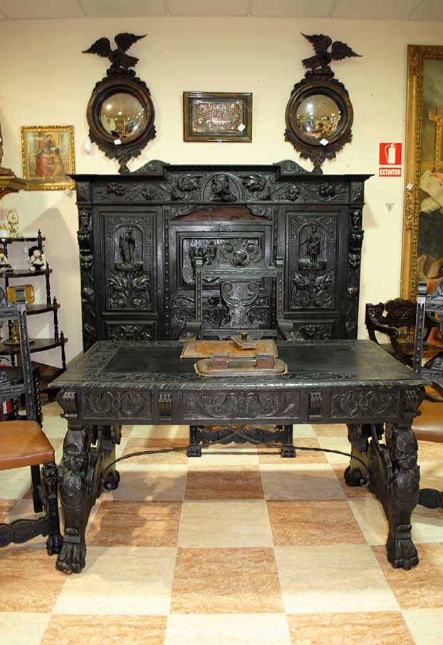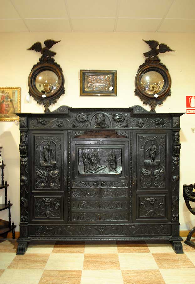 REF: 7519 – Espectacular despacho antiguo de estilo Renacimiento, realizado en madera maciza ebonizada con una talla artesanal impresionante y gran presencia decorativa.