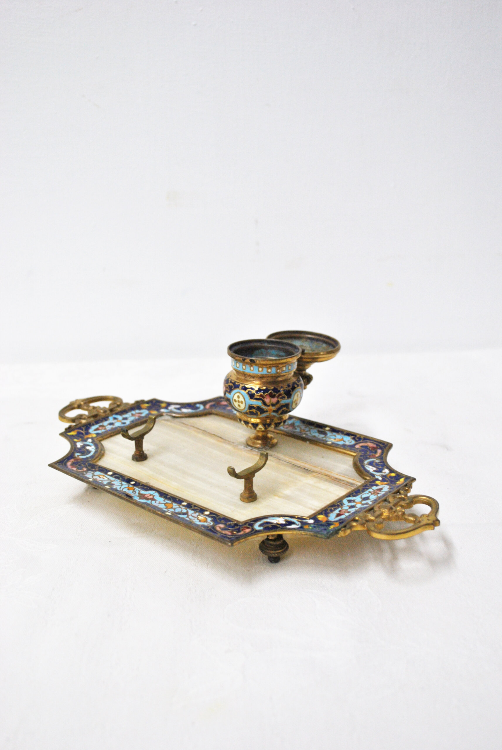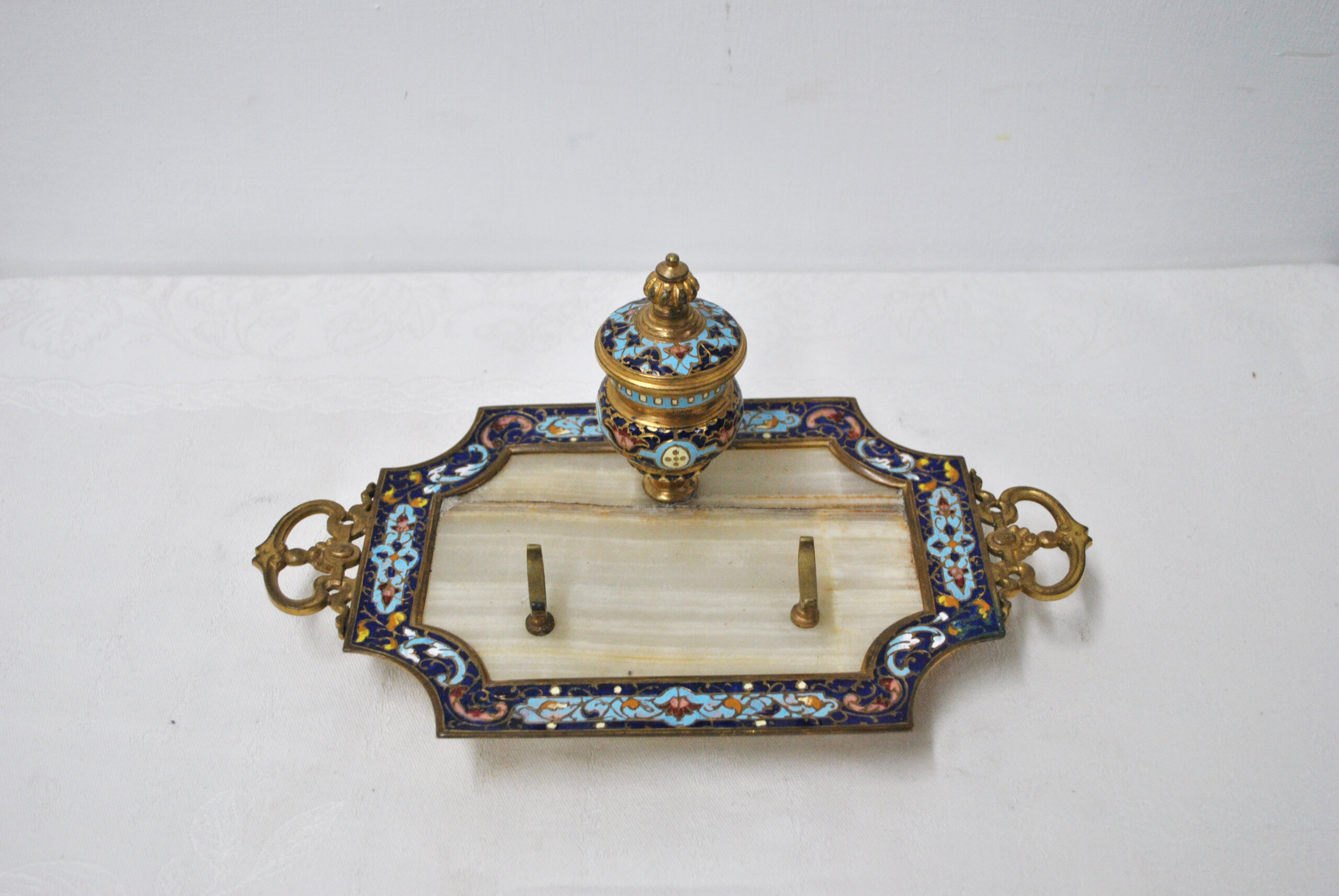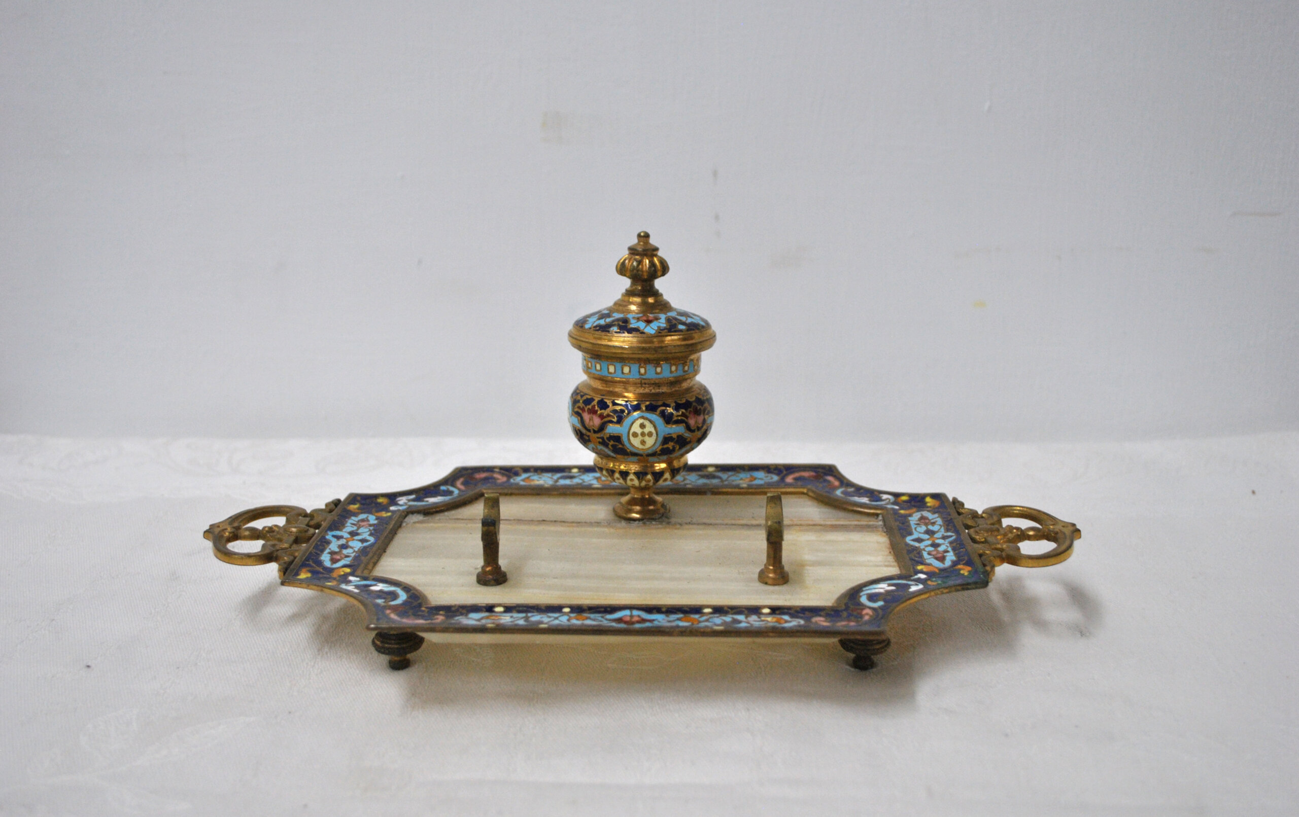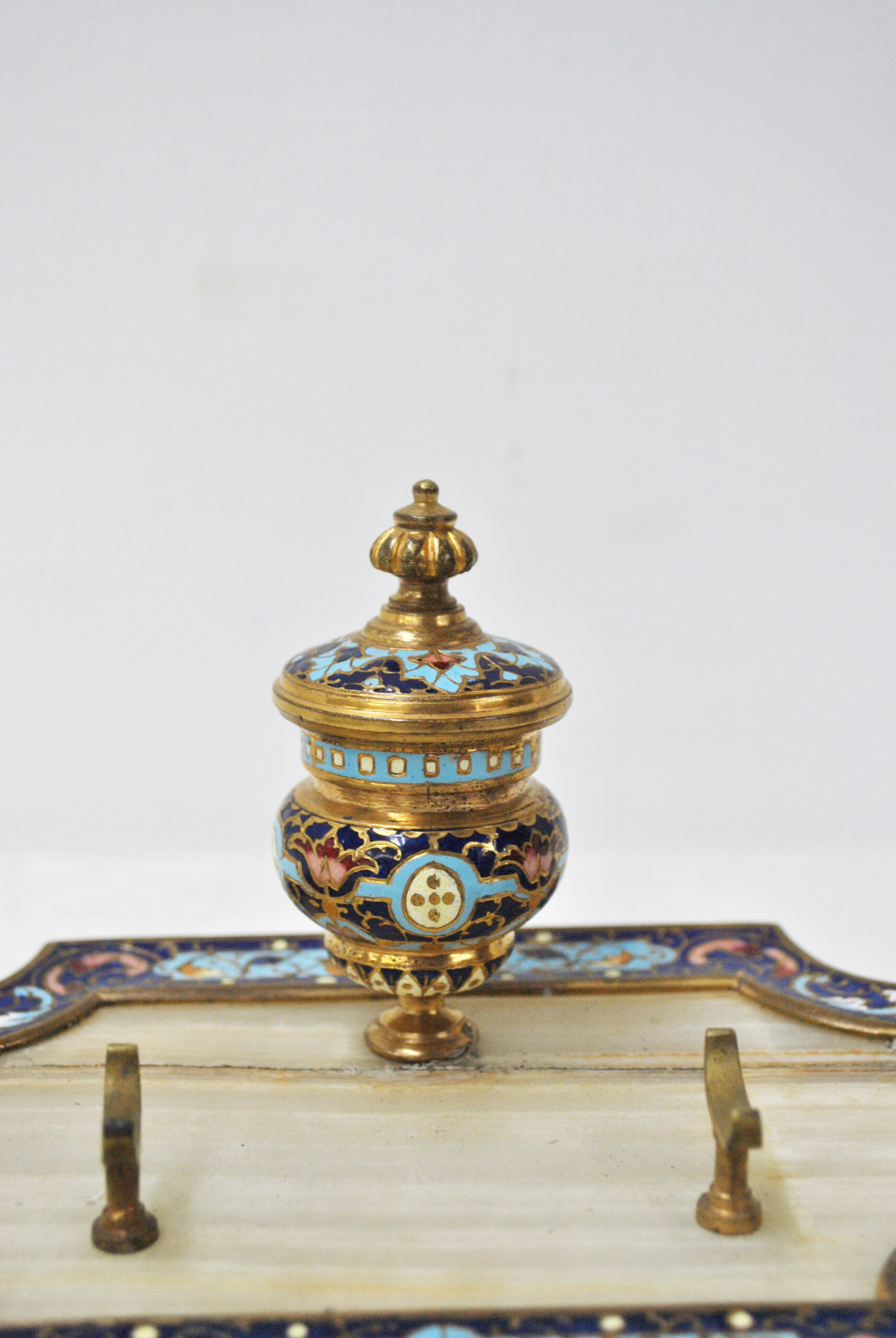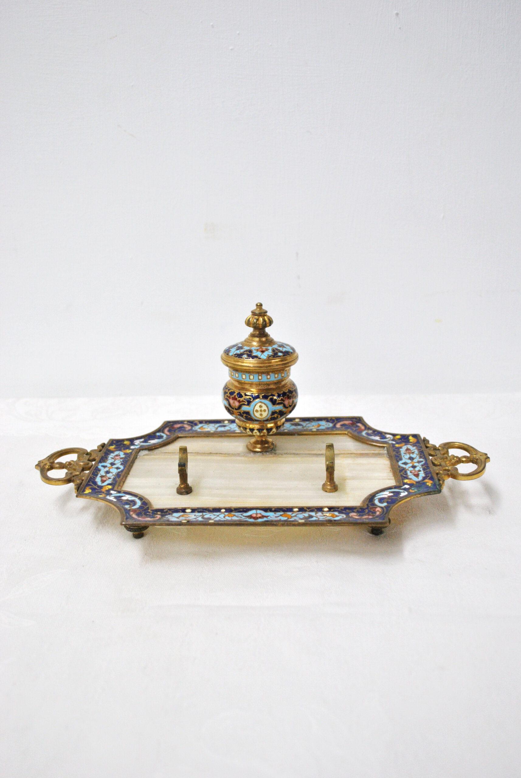 En la parte central destaca un tintero con tapa, finamente decorado con motivos ornamentales esmaltados y detalles en dorado, que aportan un gran valor estético a la pieza. Además, cuenta con dos soportes metálicos para pluma o utensilios de escritura, conservando su funcionalidad original.