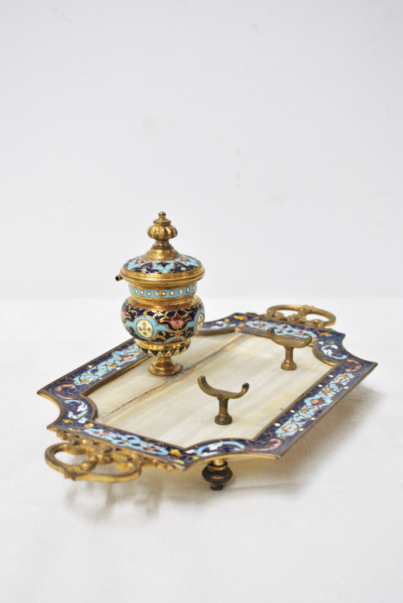 REF: 12400 – Elegante escribanía antigua de sobremesa, una pieza muy decorativa que combina materiales nobles y un exquisito trabajo artesanal. La base está realizada en mármol claro con veta natural, enmarcada por una estructura metálica con rica decoración esmaltada en tonos azules, dorados y rojizos, siguiendo el estilo cloisonné de inspiración oriental.