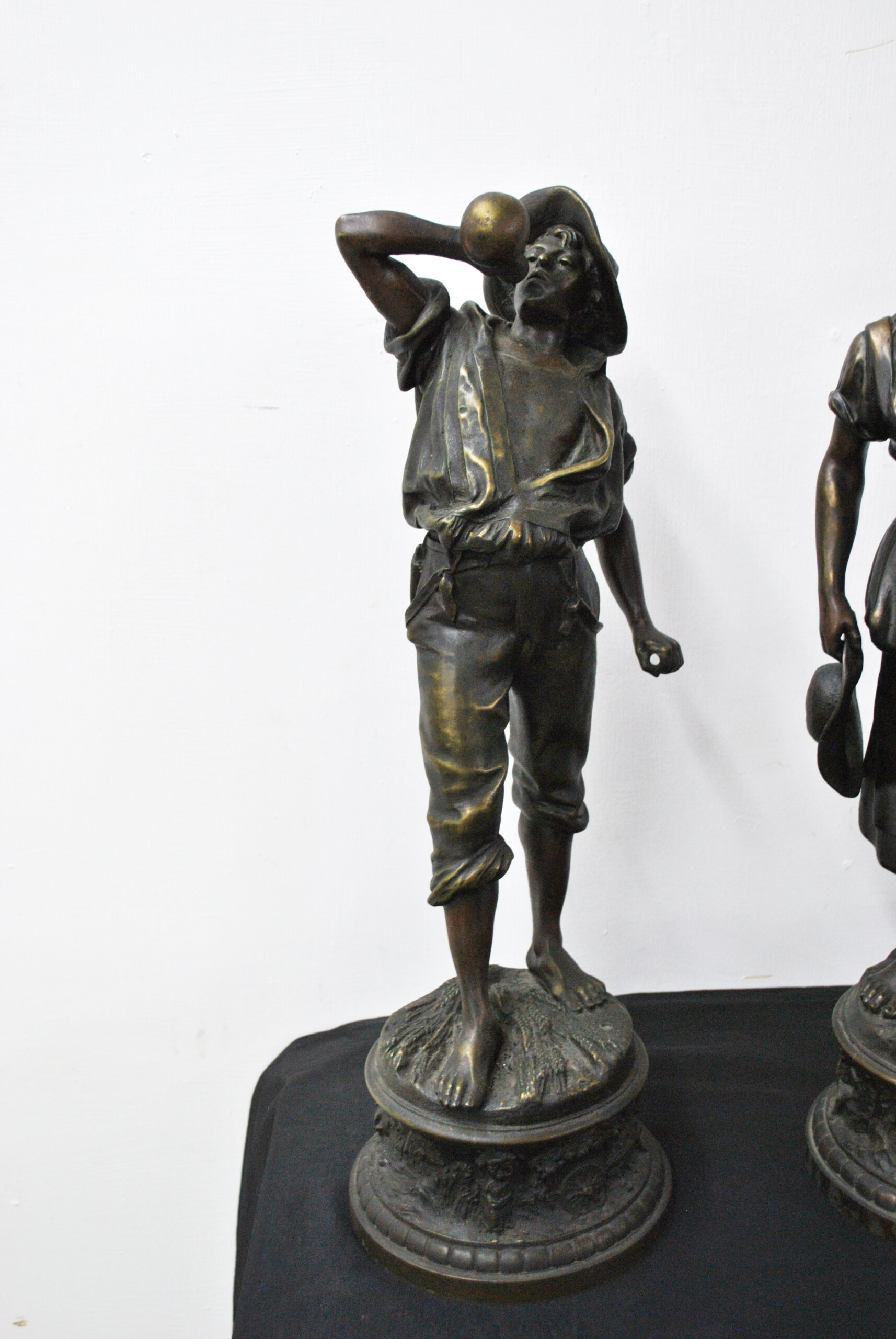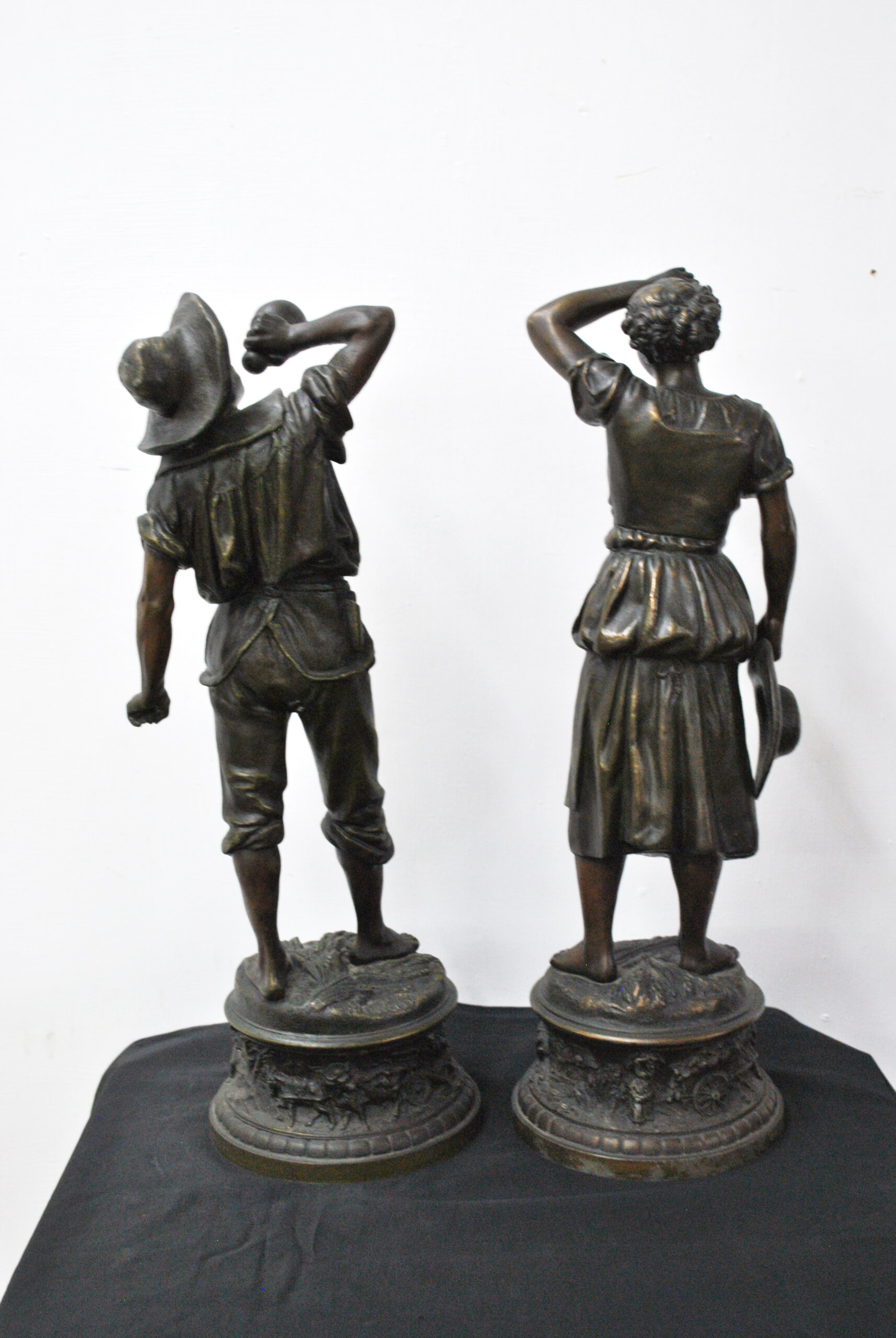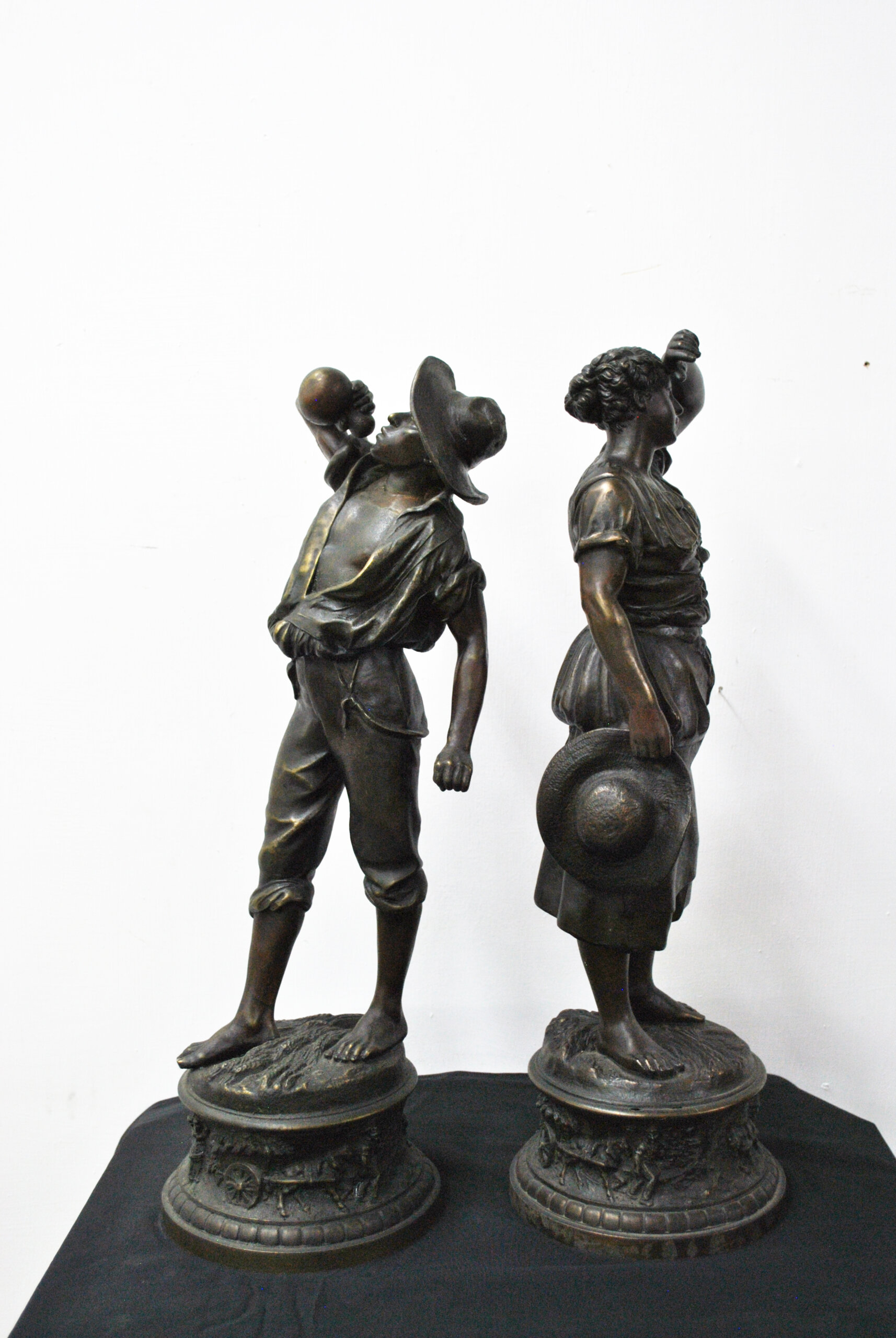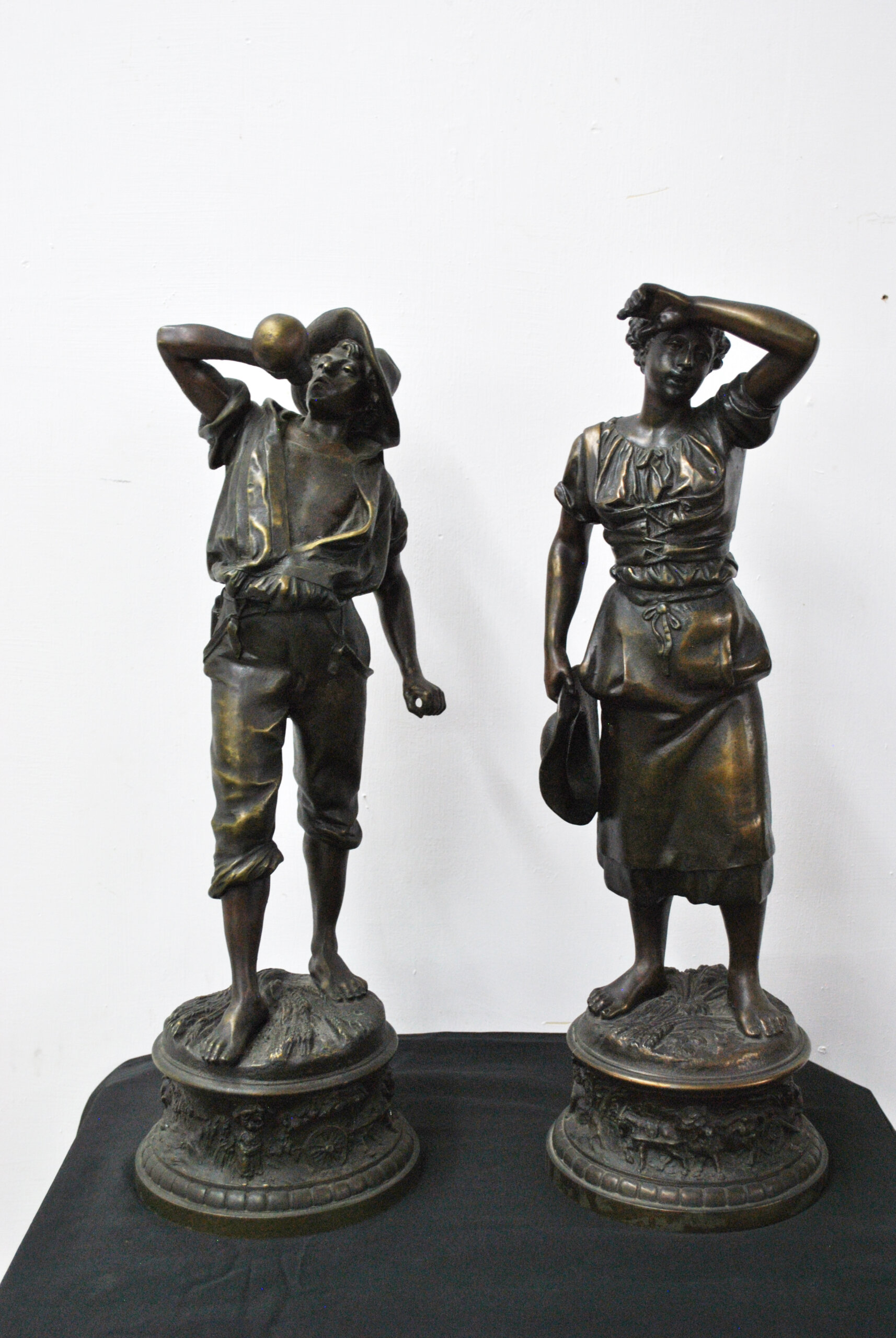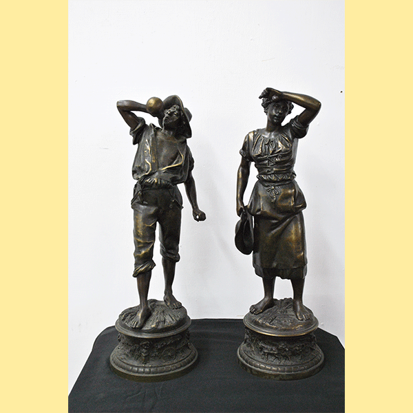 REF: 11899 – Bonita pareja de esculturas de calamina acabado bronce patinado firmadas por H. Weisse, representando una pareja de campesinos en actitudes de descanso, tras una jornada de trabajo. Las figuras, de excelente modelado y naturalismo, destacan por la expresividad de los rostros y el dinamismo de las posturas. Se tratan de dos personajes; un joven con sombrero y una mujer sosteniendo el suyo. Están apoyadas sobre bases circulares ricamente decoradas con relieves alusivos al trabajo agrícola, motivos florales y ruedas de carro, en clara alusión al mundo rural. El acabado oscuro con sutiles reflejos dorados realza la textura del metal y los detalles.