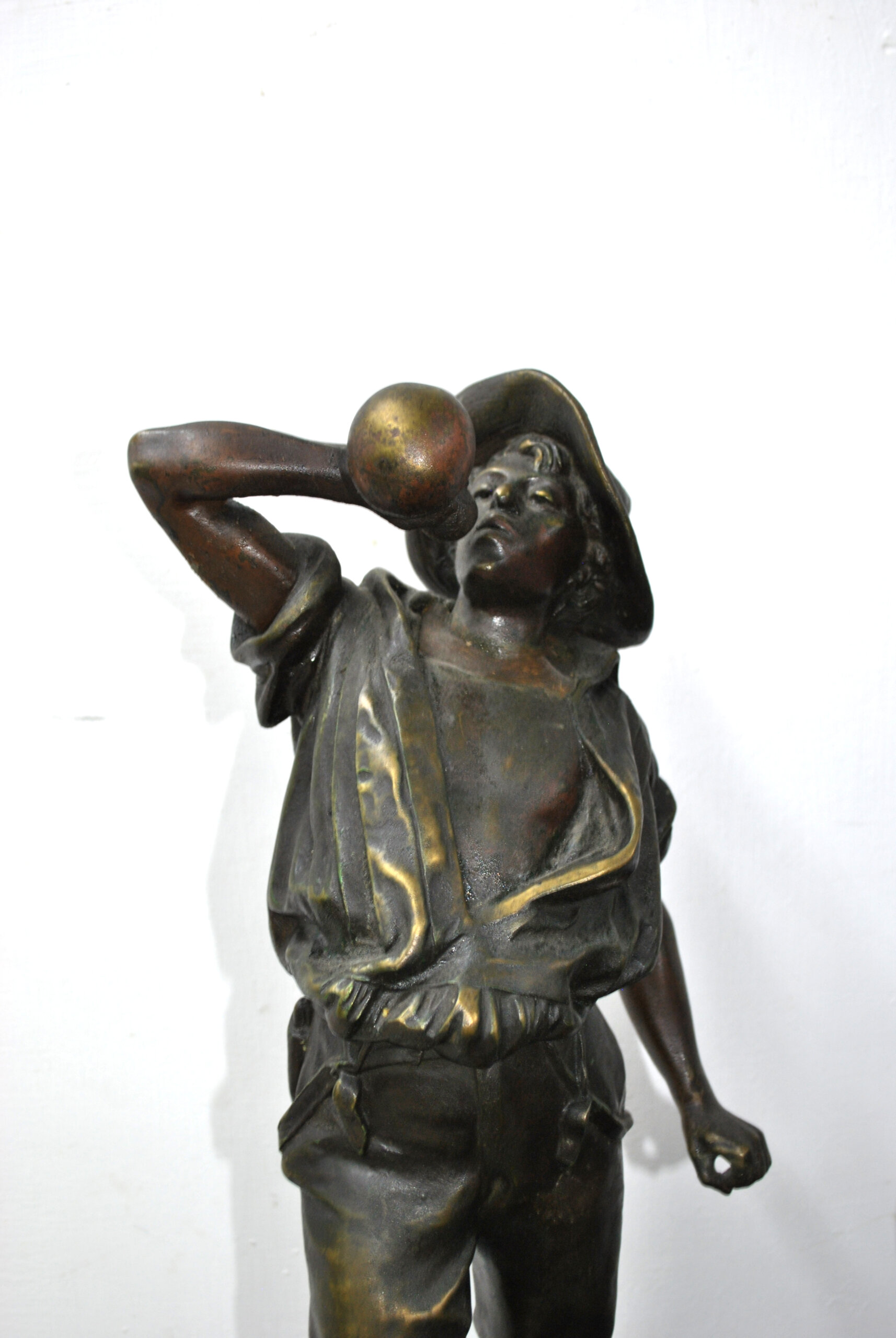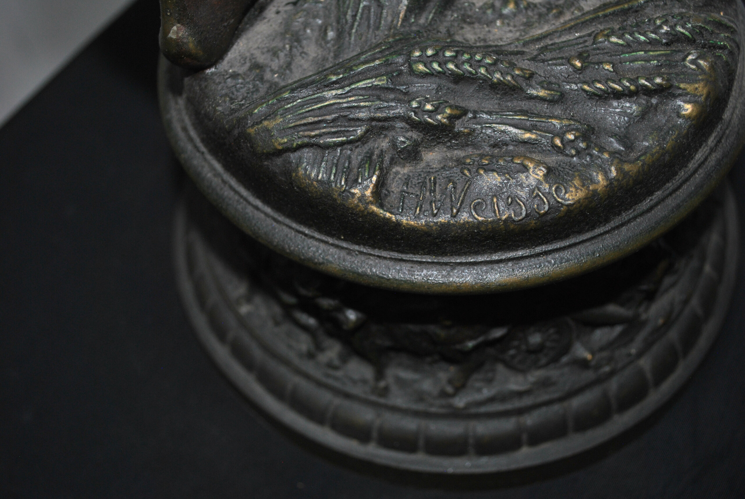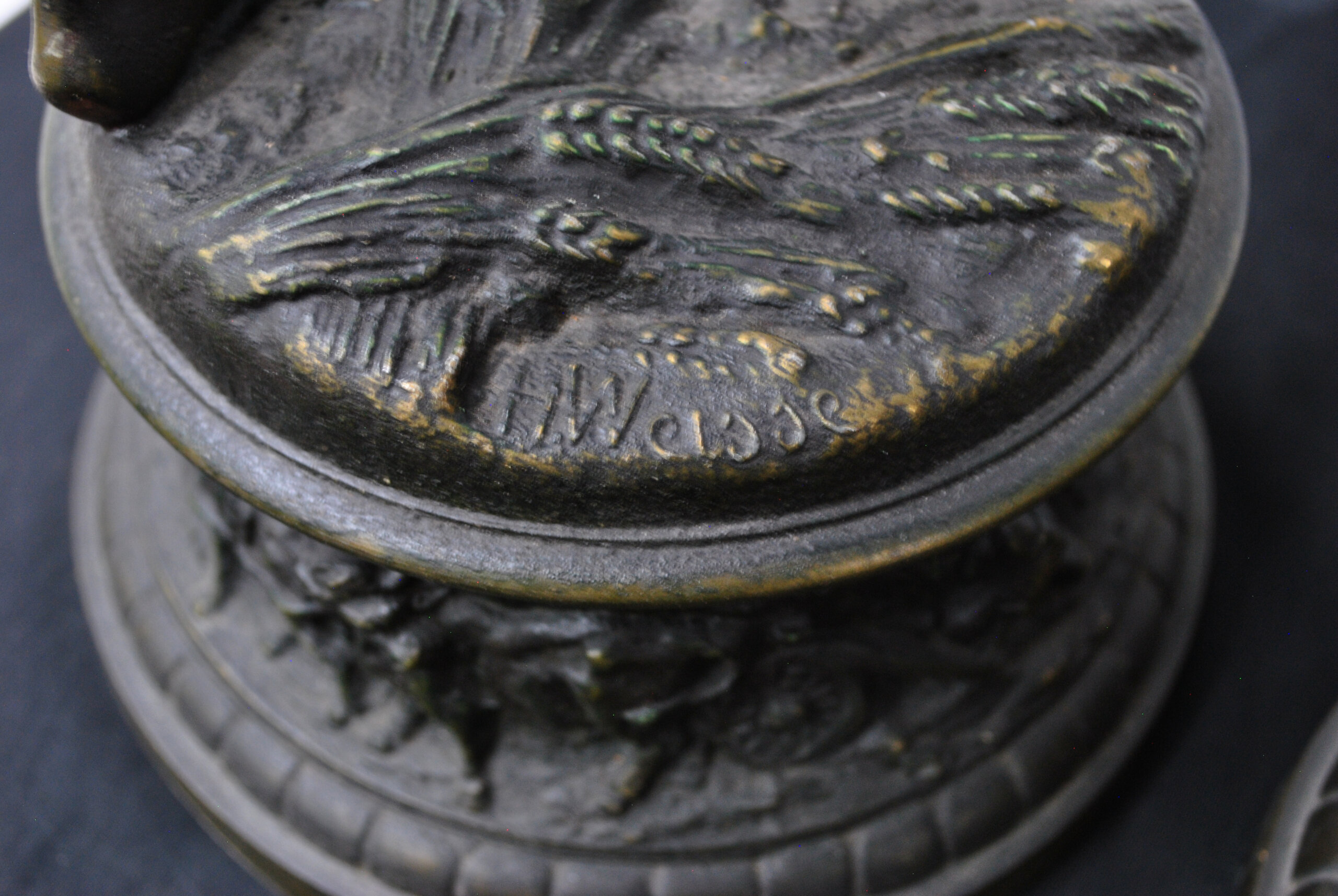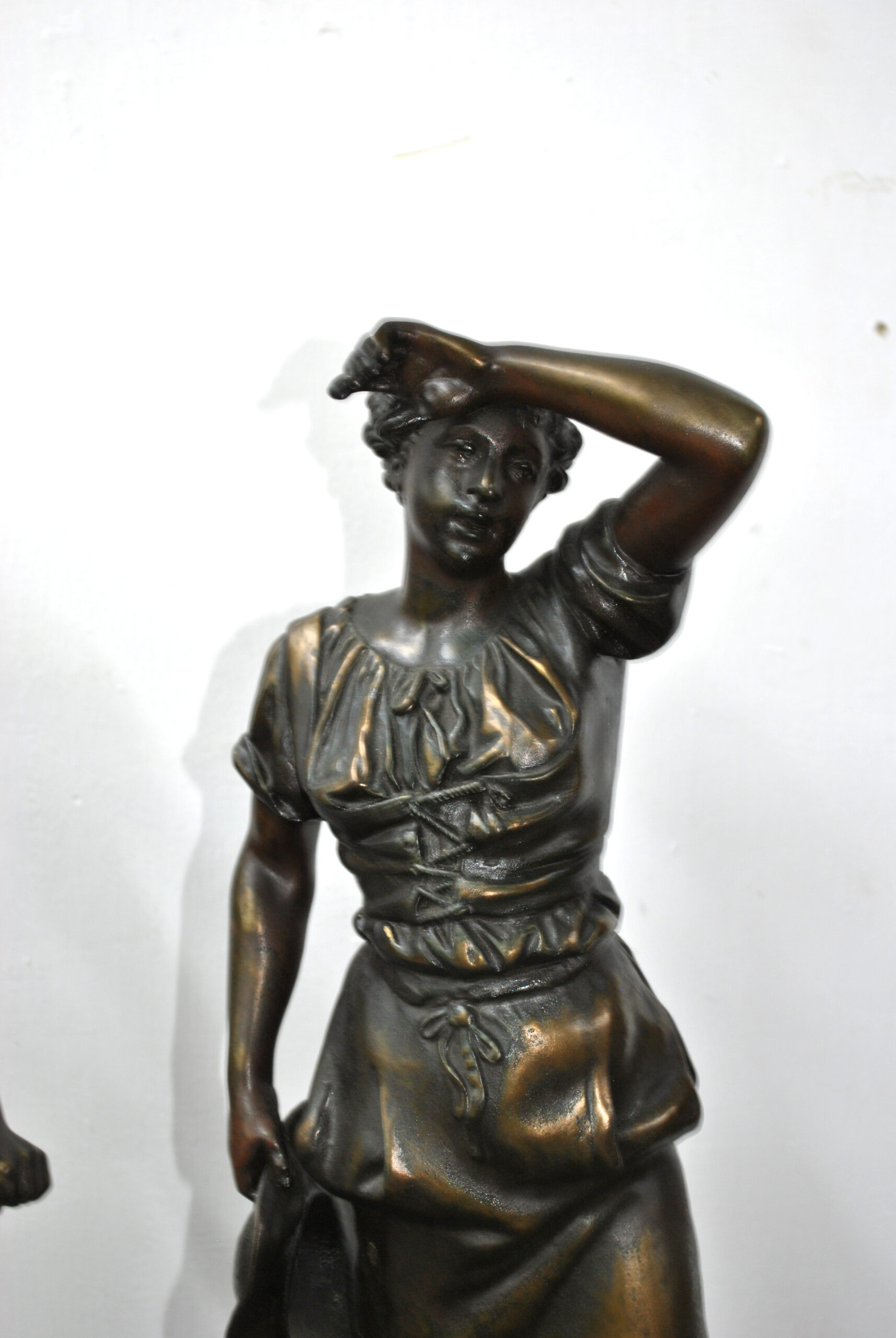 REF: 11899 – Bonita pareja de esculturas de calamina acabado bronce patinado firmadas por H. Weisse, representando una pareja de campesinos en actitudes de descanso, tras una jornada de trabajo. Las figuras, de excelente modelado y naturalismo, destacan por la expresividad de los rostros y el dinamismo de las posturas. Se tratan de dos personajes; un joven con sombrero y una mujer sosteniendo el suyo. Están apoyadas sobre bases circulares ricamente decoradas con relieves alusivos al trabajo agrícola, motivos florales y ruedas de carro, en clara alusión al mundo rural. El acabado oscuro con sutiles reflejos dorados realza la textura del metal y los detalles.