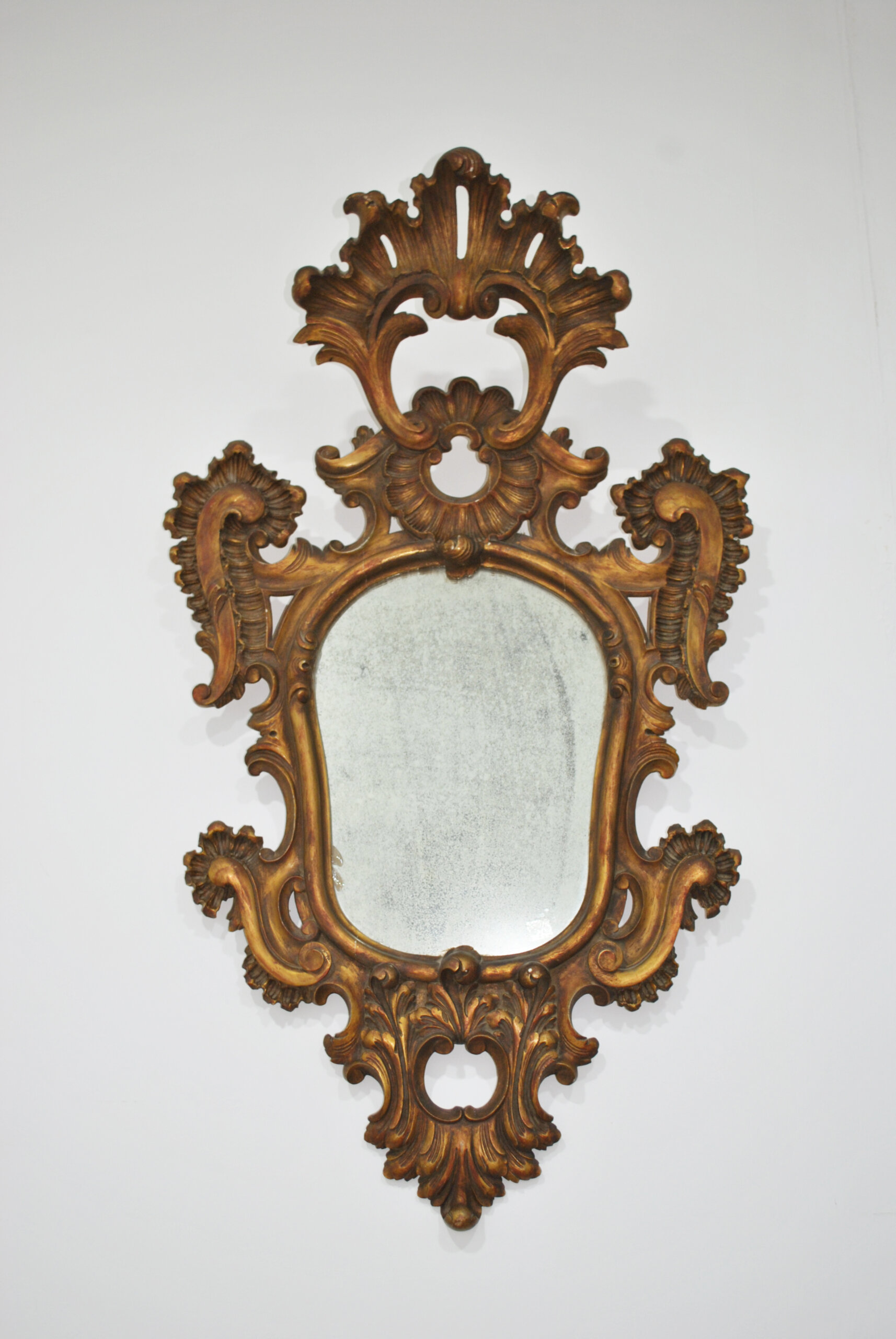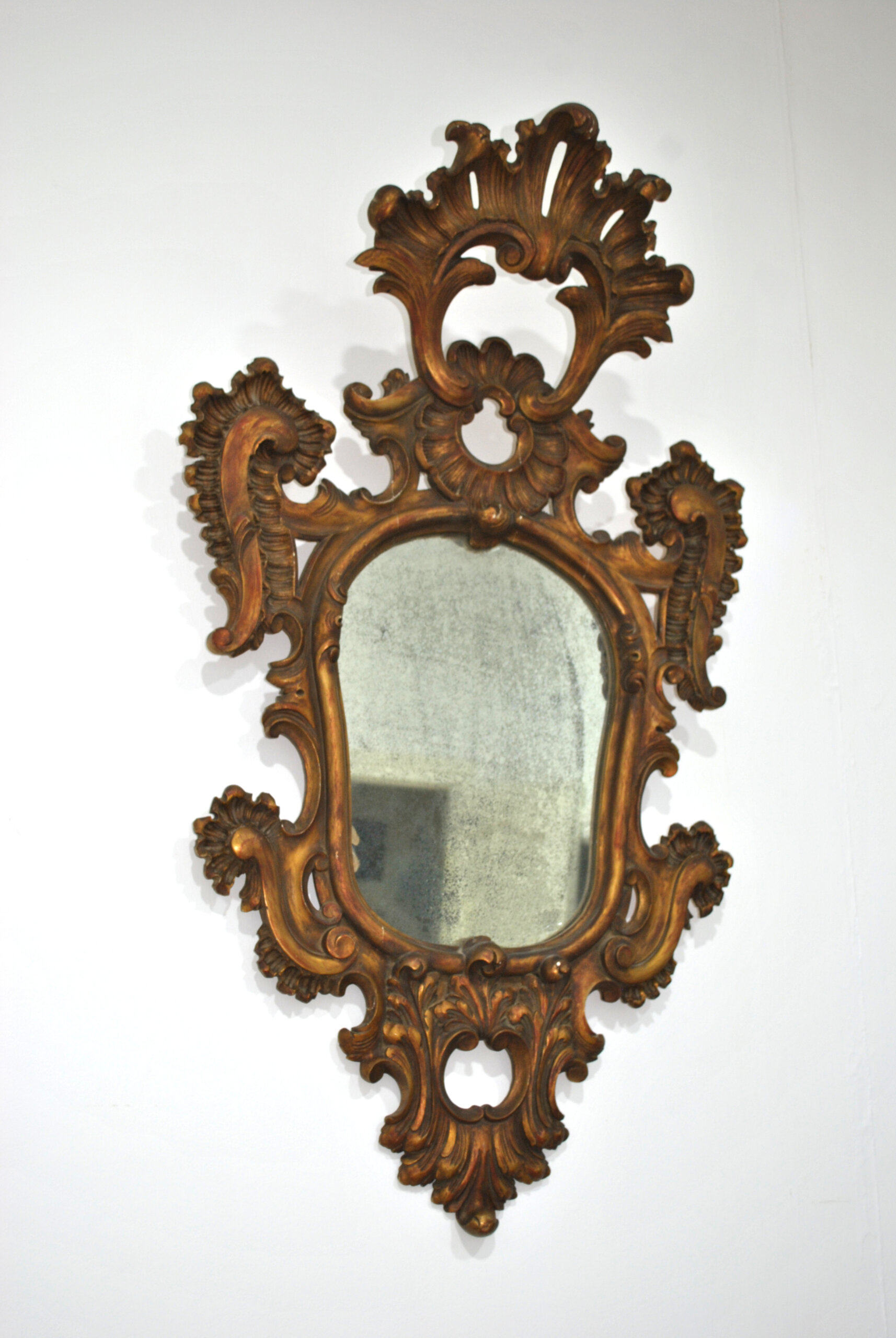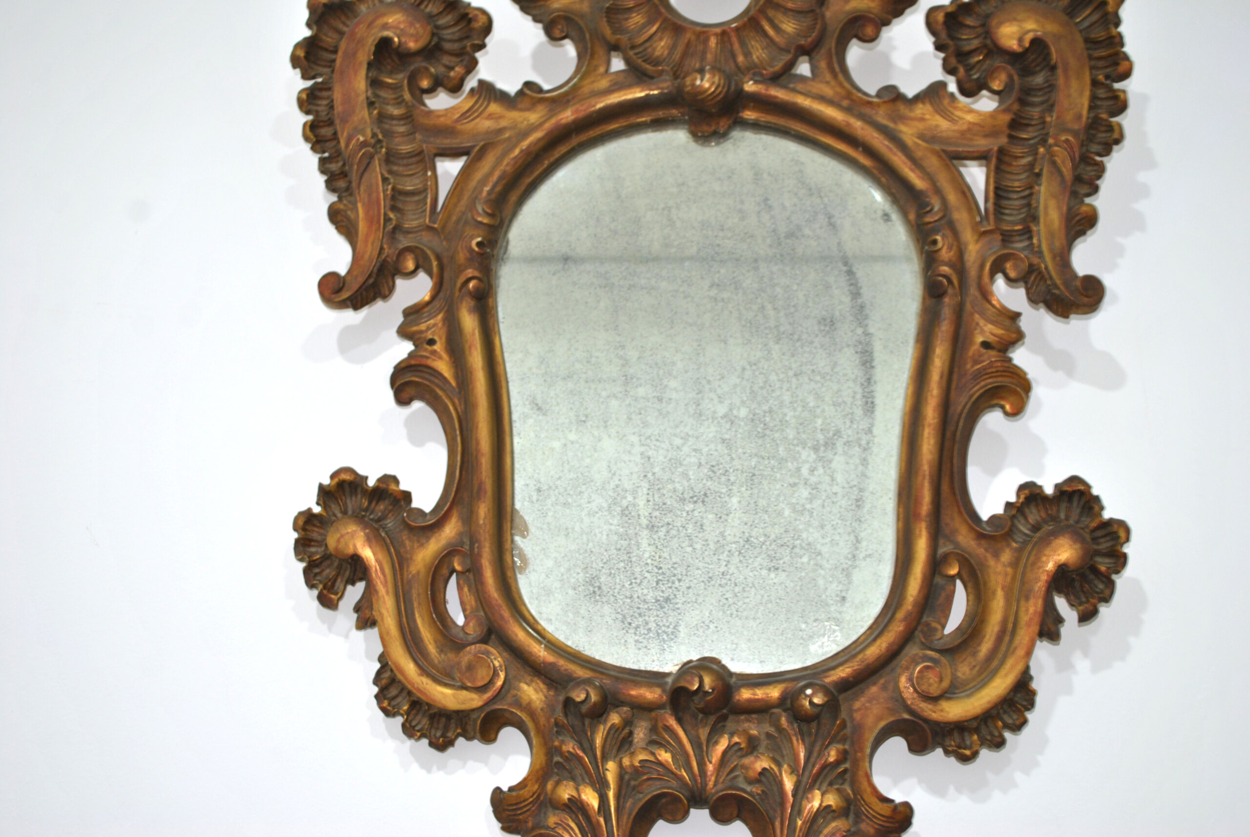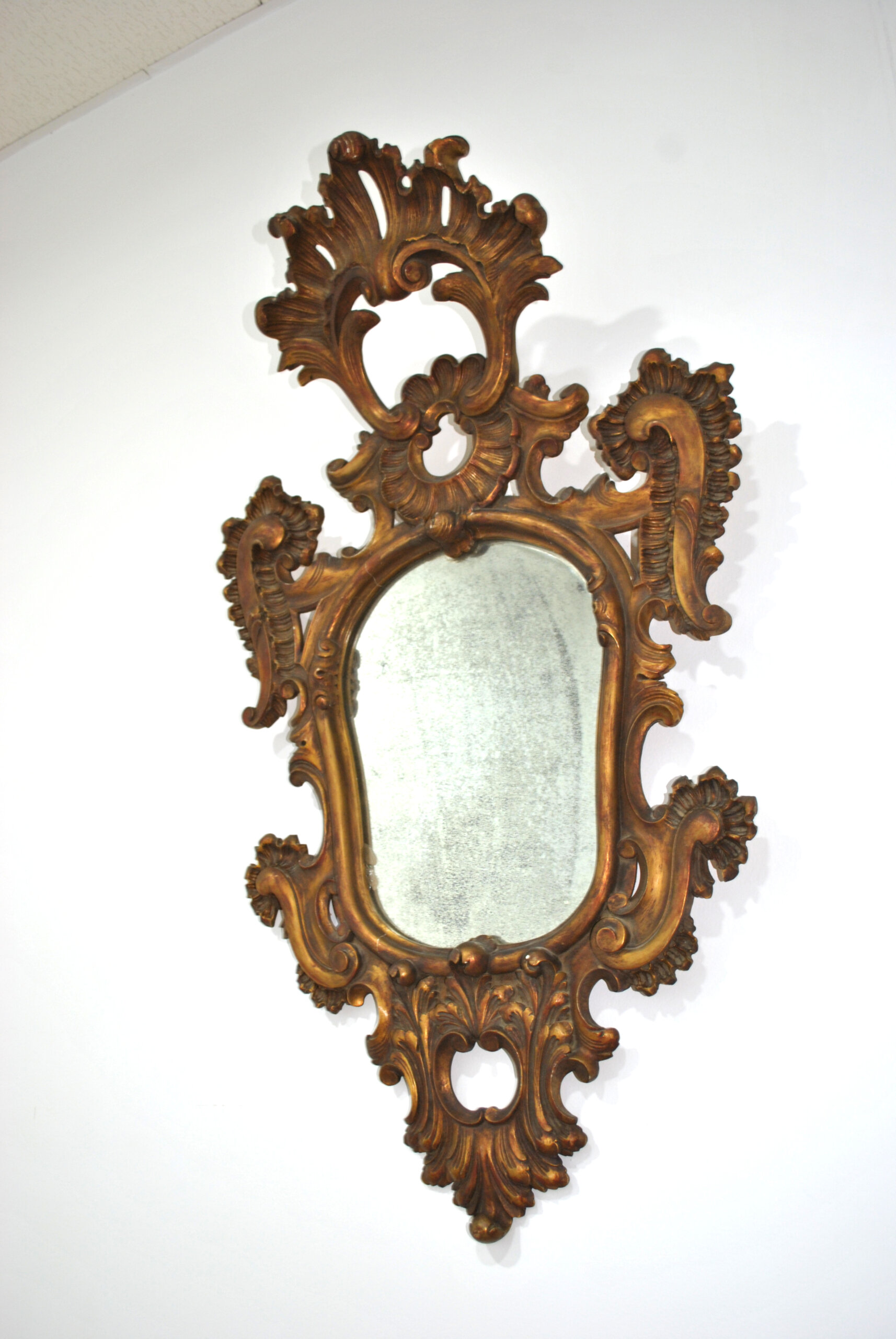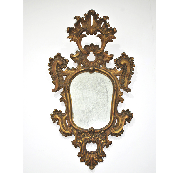 REF: 12251 – Elegante espejo antiguo con marco ricamente tallado en madera y acabado dorado, inspirado en el estilo barroco / rococó. Destaca por su espectacular decoración con volutas, hojas y motivos ornamentales, que aportan gran presencia y carácter decorativo.