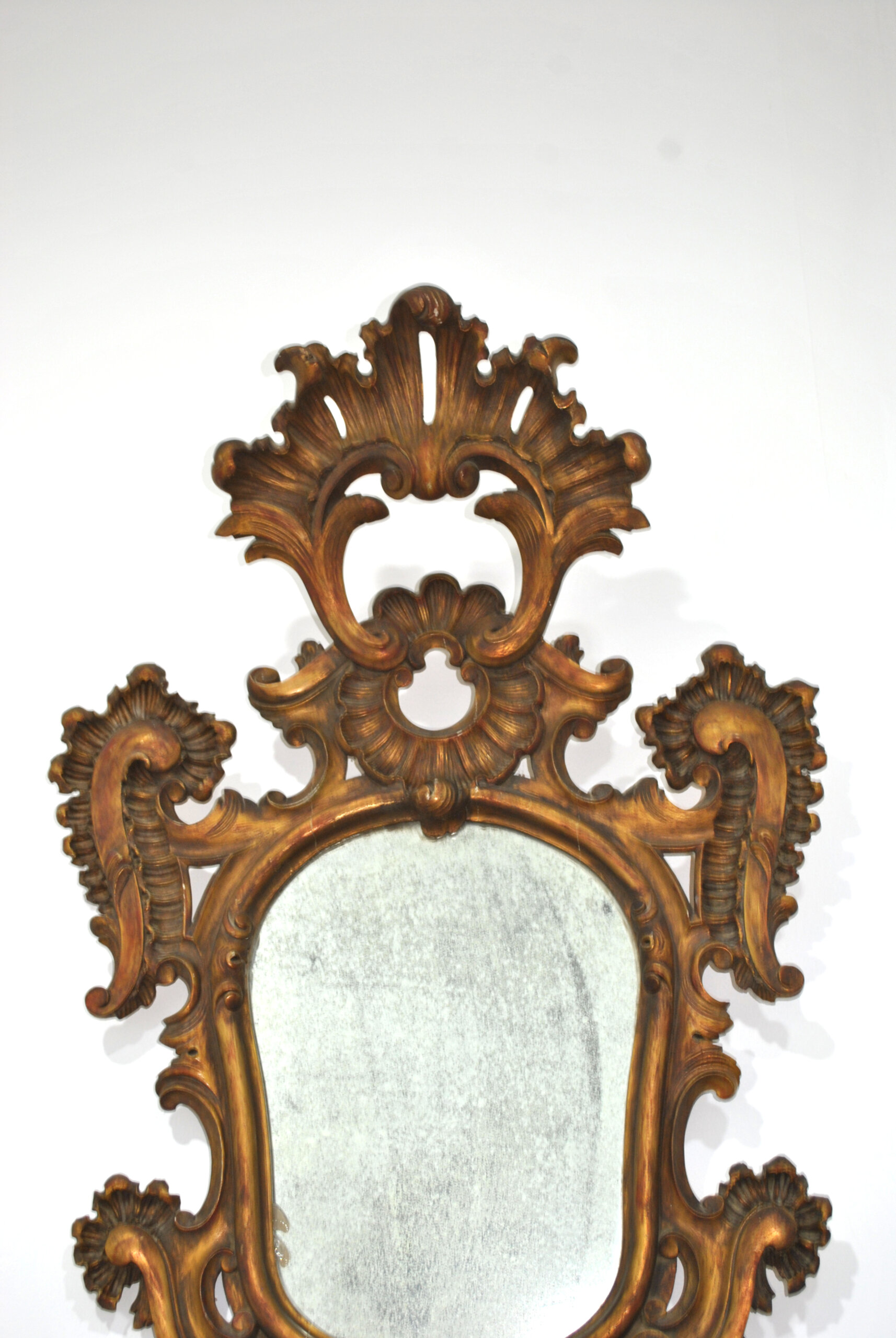 El marco presenta una elaborada crestería superior y detalles tallados en todo su contorno, con un bonito acabado dorado envejecido que realza su aspecto antiguo. El espejo central mantiene su cristal con pátina del tiempo, lo que aporta autenticidad y encanto.
