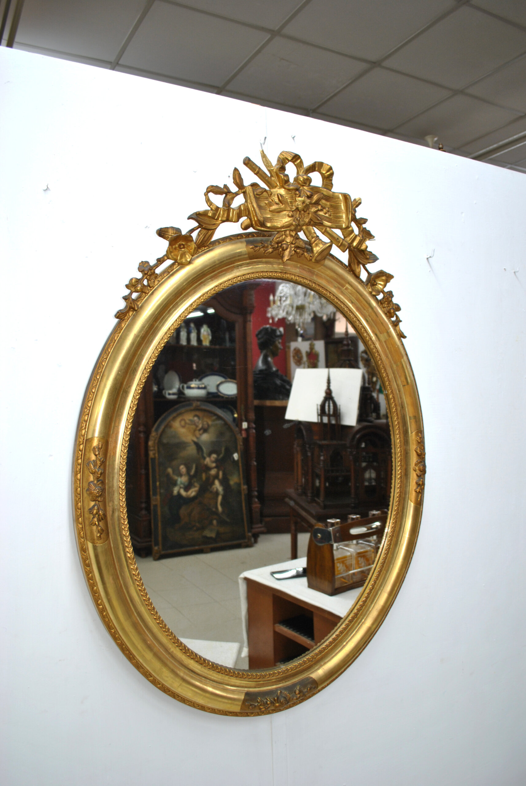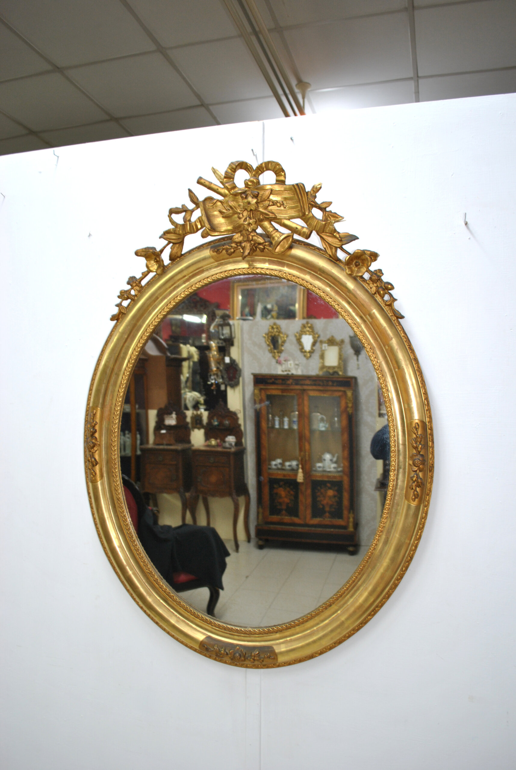 El marco presenta un acabado dorado con pátina natural del tiempo, realzado por finos detalles en relieve como motivos florales y cenefas perimetrales. En la parte superior destaca un espectacular copete tallado con elementos ornamentales (lazos, flores y detalles musicales), que aporta gran elegancia y personalidad a la pieza.