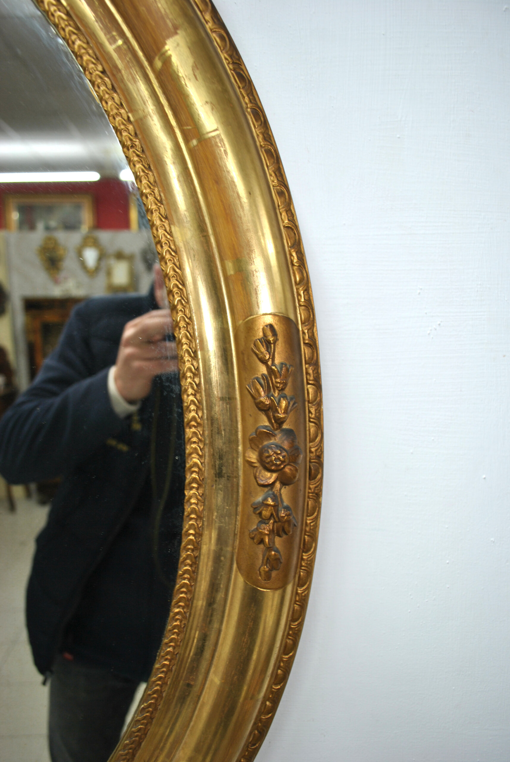 REF: 12372 – Precioso espejo antiguo de formato ovalado con marco dorado y elaborado copete superior ricamente decorado, al más estilo Isabelino.