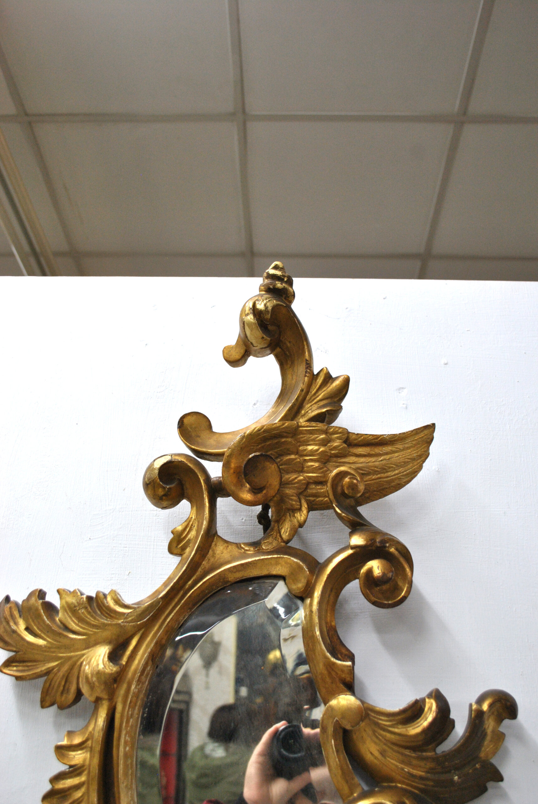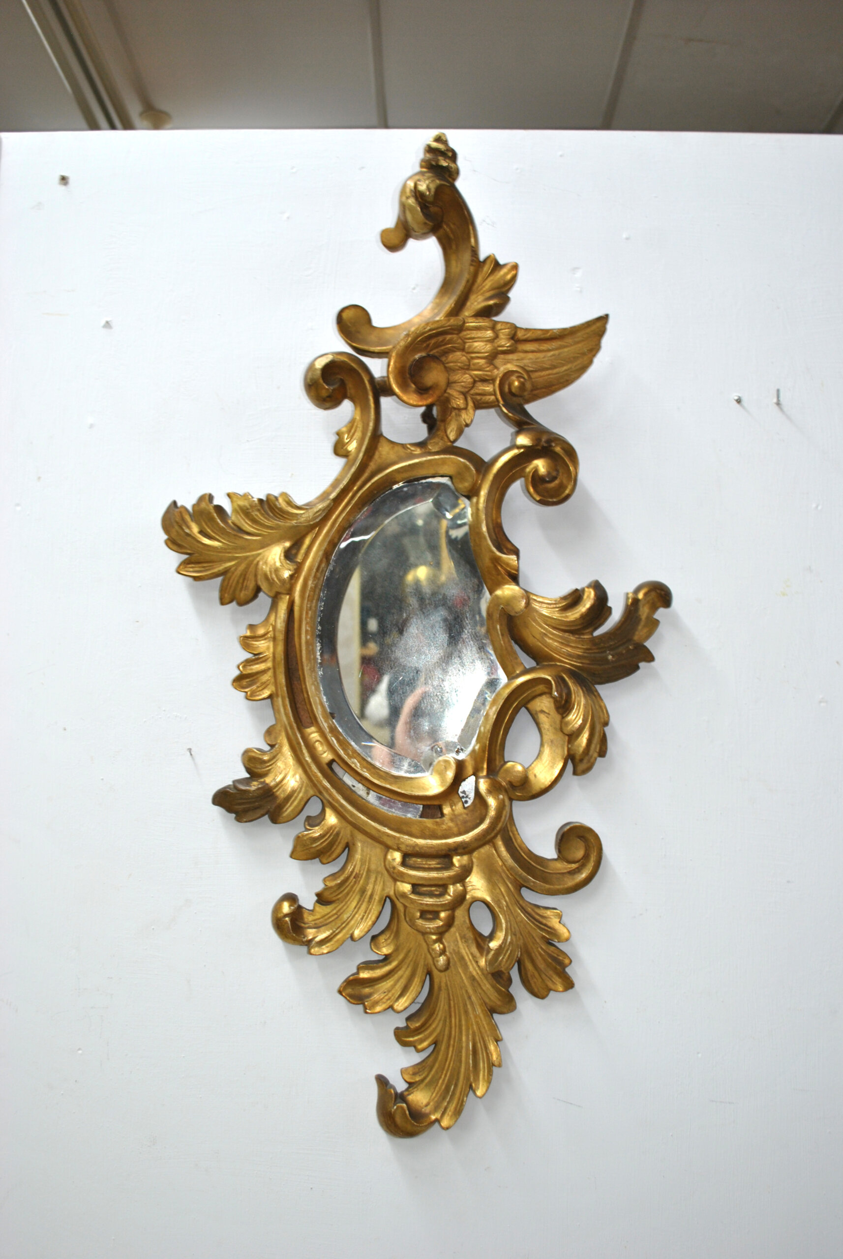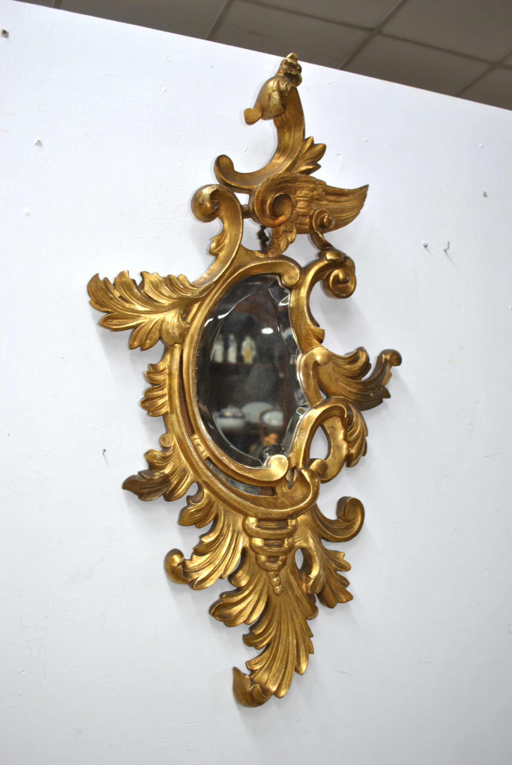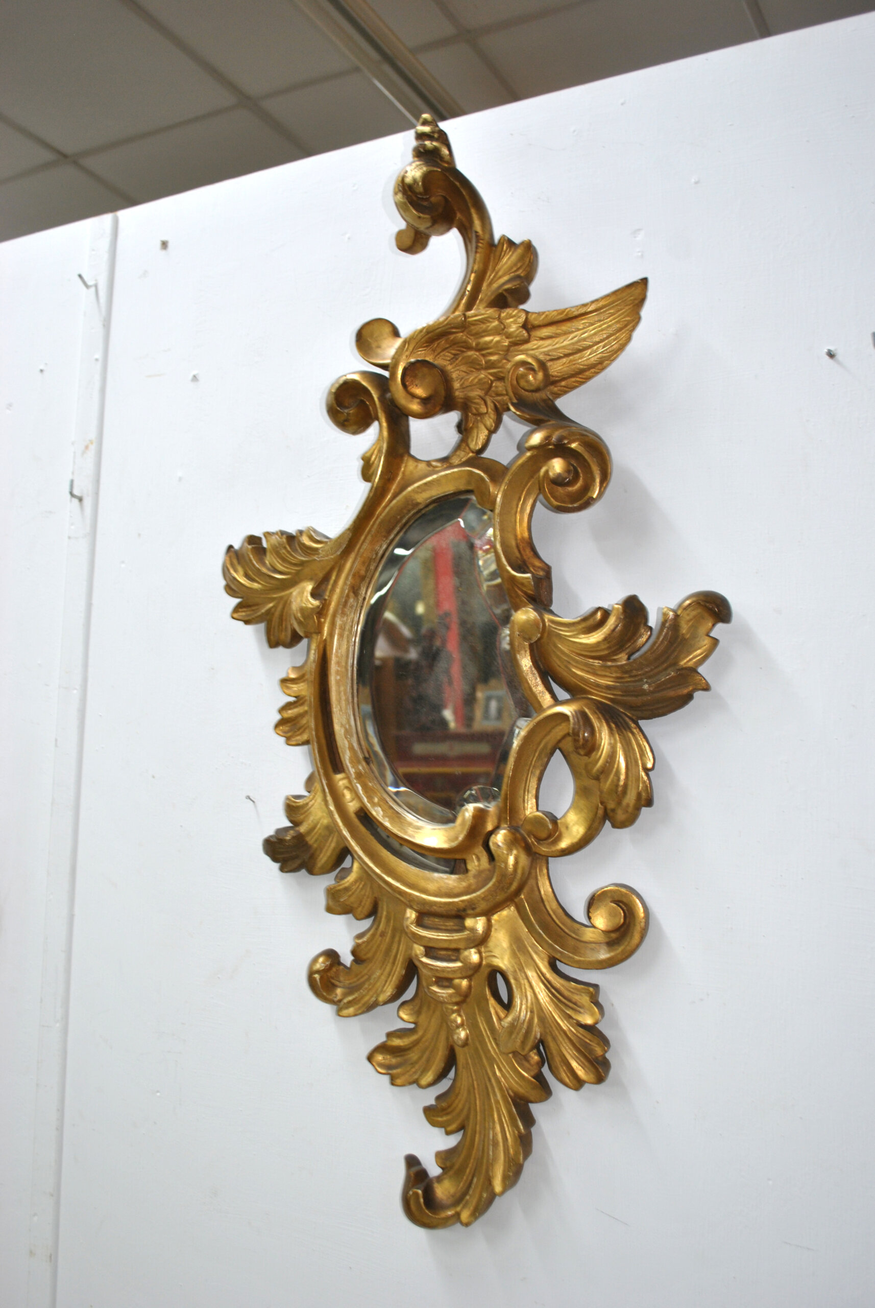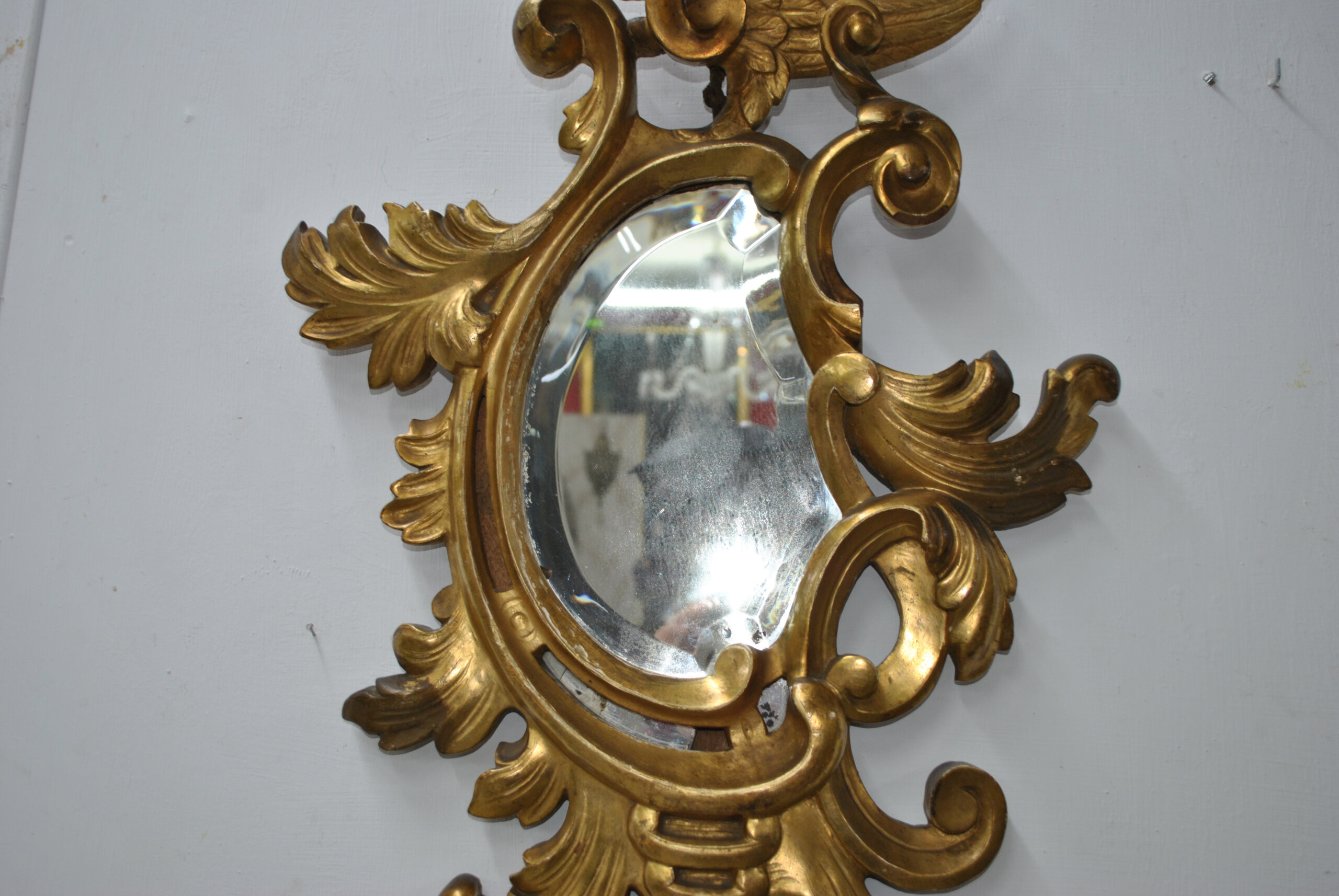 REF:PA-237 : Precioso espejo de pared estilo Rococó, tallado íntegramente en madera maciza y terminado con pan de oro, de gran movimiento y refinamiento ornamental. Su marco, profusamente decorado con roleos, acantos y volutas asimétricas, culmina en un elegante remate superior con motivos alados y curvas dinámicas, .SXIX.