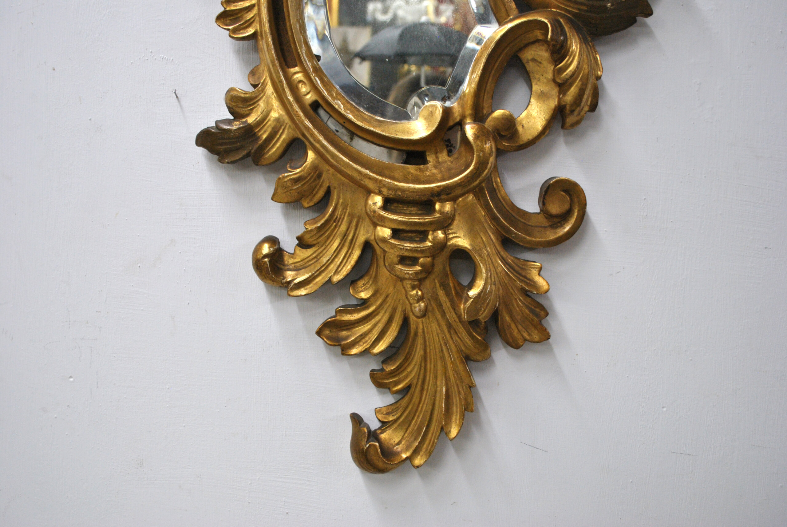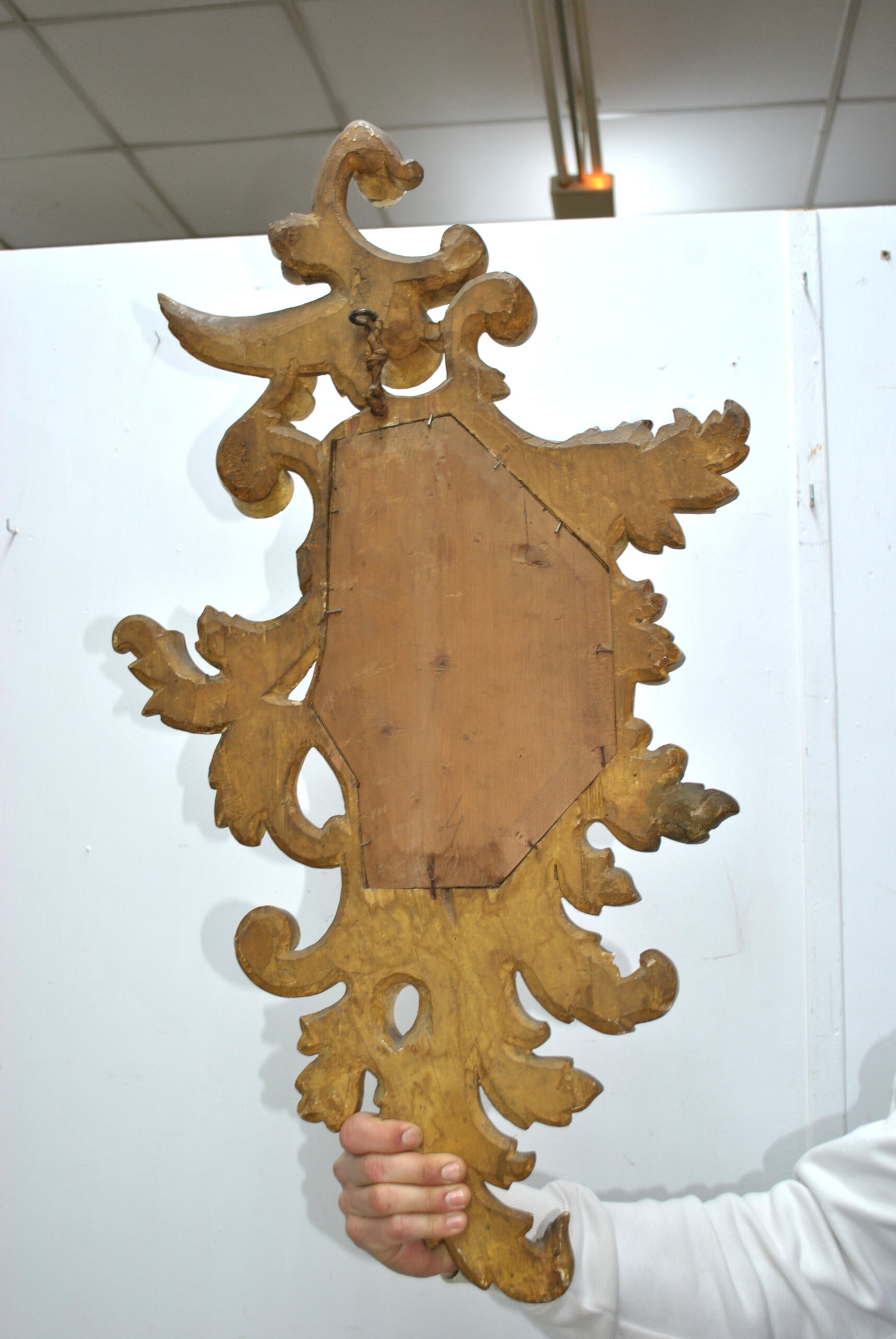El espejo, de cristal biselado con contorno sinuoso, se integra armoniosamente en el conjunto, aportando profundidad y brillo al dorado cálido de la talla. La trasera de madera conserva su estructura original, evidenciando su elaboración artesanal.