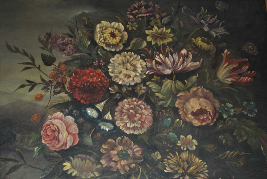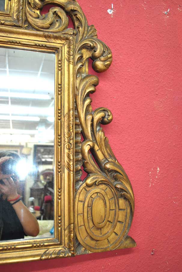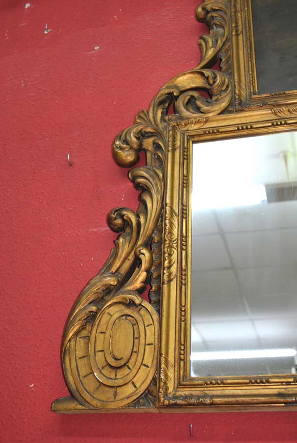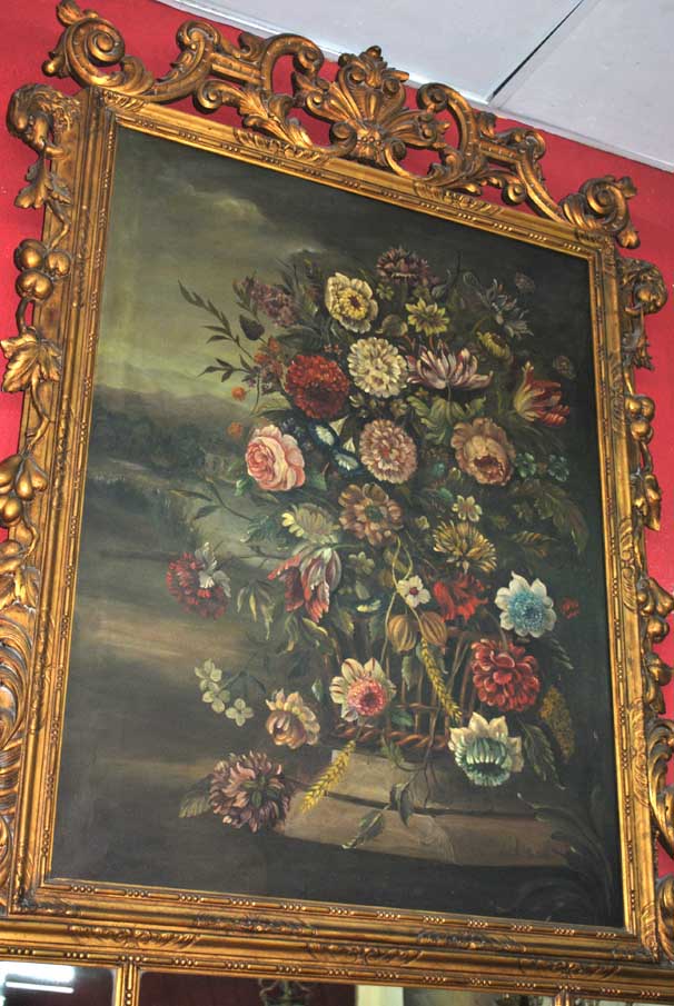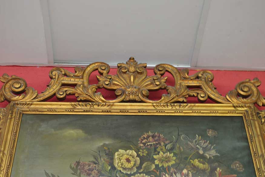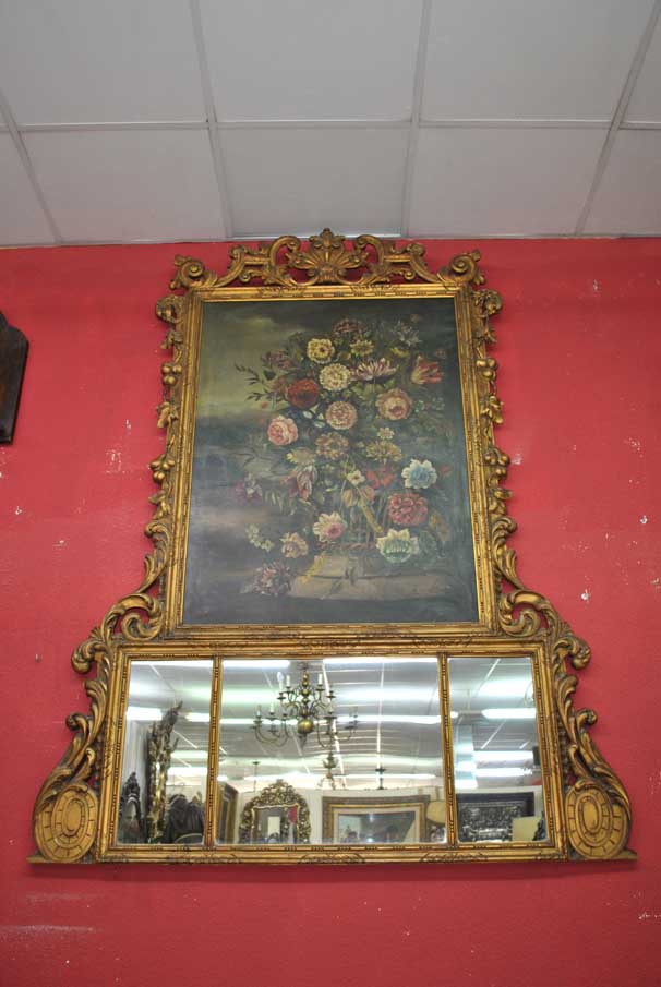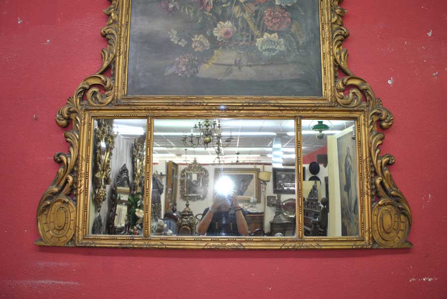 REF: 9687 – Espectacular espejo Trumeau antiguo de gran tamaño, una pieza clásica francesa muy decorativa, formada por dos cuerpos: en la parte superior incorpora un precioso panel pictórico con bodegón floral con un ramo de flores en jarrón sobre fondo oscuro, con gran detalle y riqueza de color, enmarcado con moldura tallada, y en la parte inferior presenta el espejo dividido en 4 paños con finas separaciones, ideal para aportar luminosidad y amplitud a cualquier estancia; todo el conjunto está rematado por un impresionante marco de madera tallada y pan de oro de estilo barroco rococó, con abundantes roleos, hojas de acanto, volutas y copete superior central, convirtiéndolo en una pieza protagonista perfecta para entradas, salones, chimeneas, pasillos o comercios con encanto.