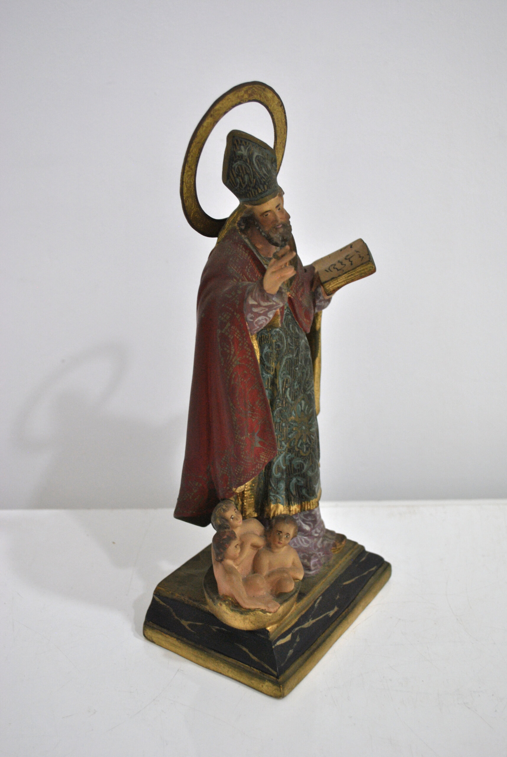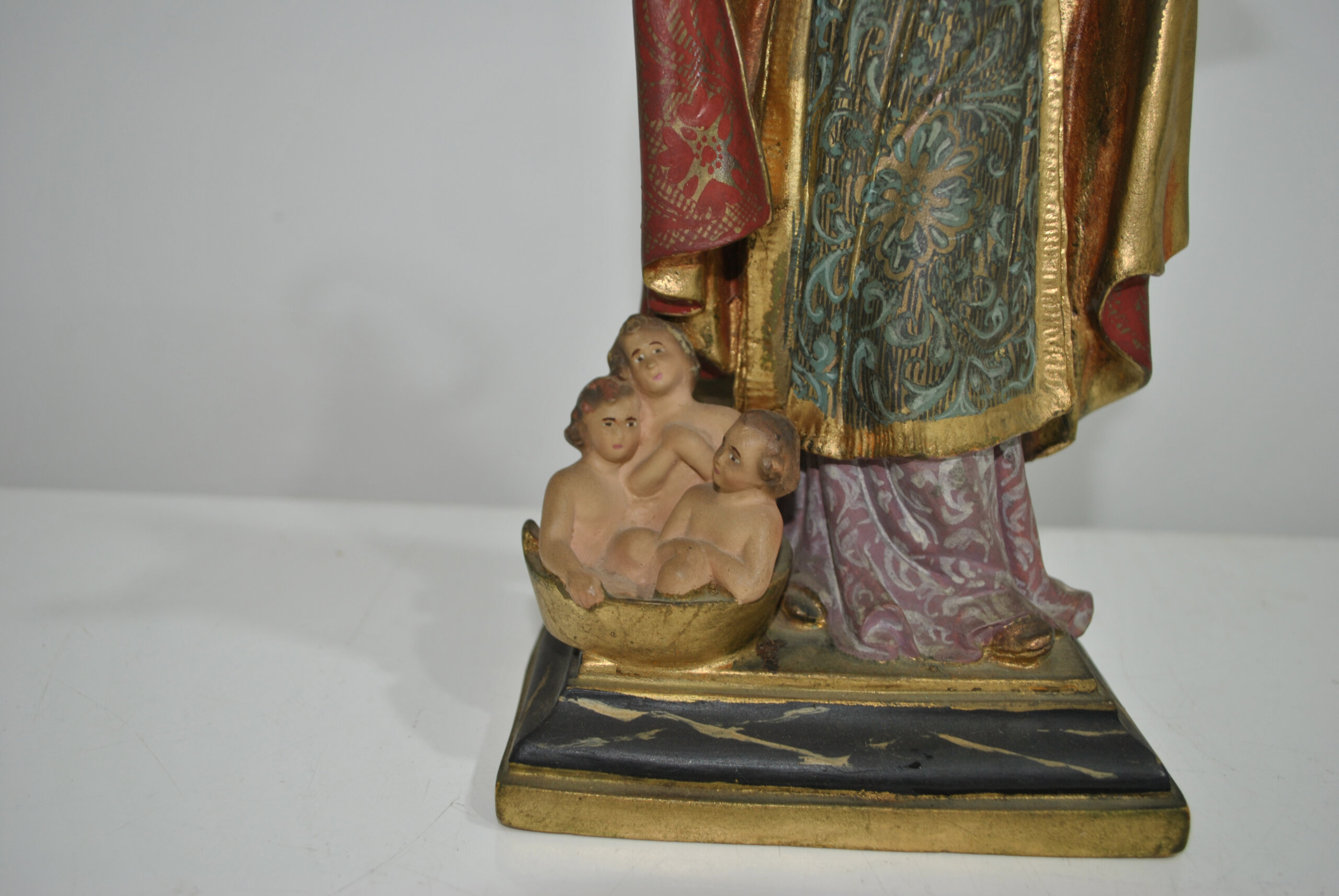 El santo aparece con libro en mano y gesto de bendición, acompañado de tres niños en la base, iconografía clásica de San Nicolás. Conserva su aureola dorada y una bonita policromía con tonos rojos, verdes y dorados.