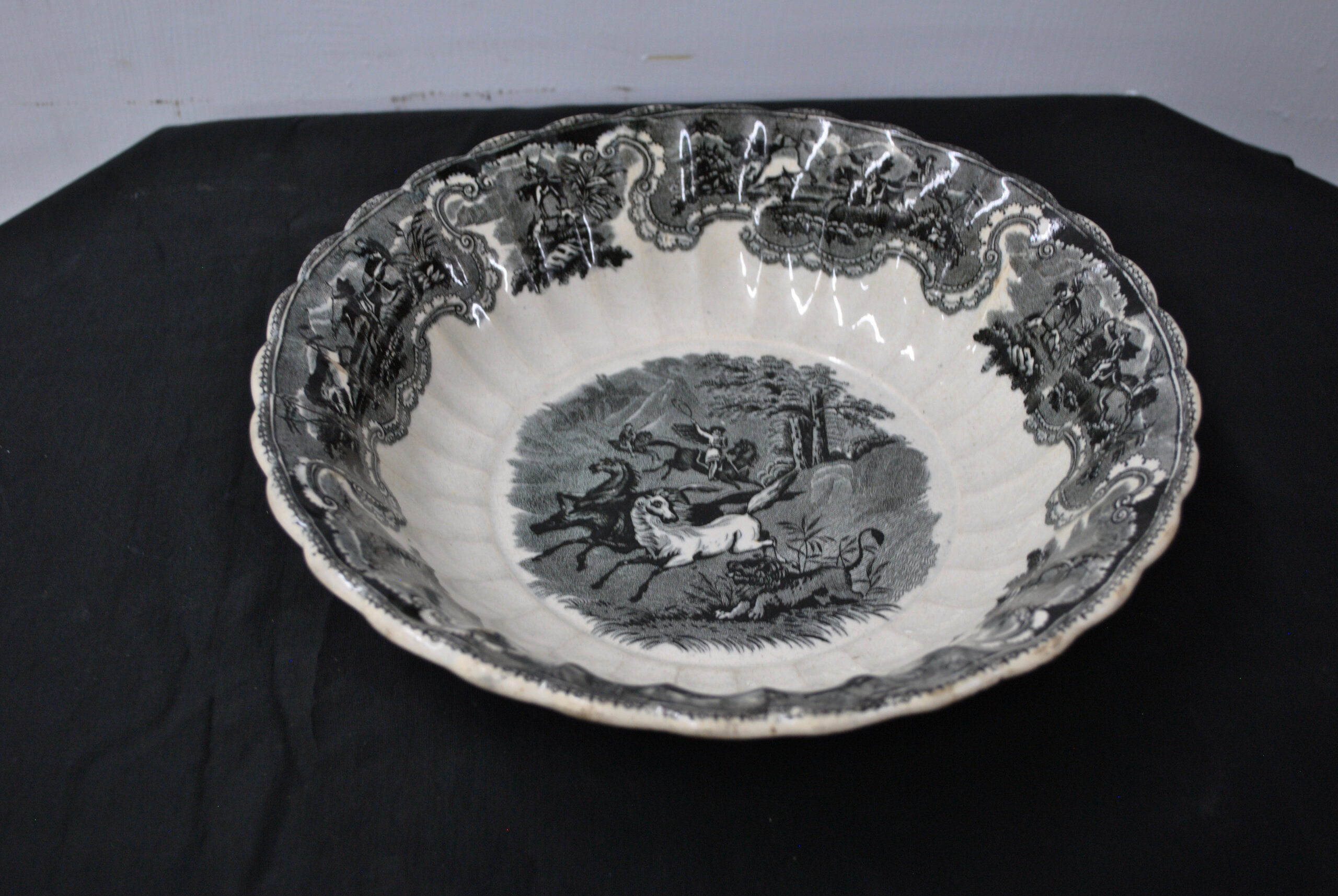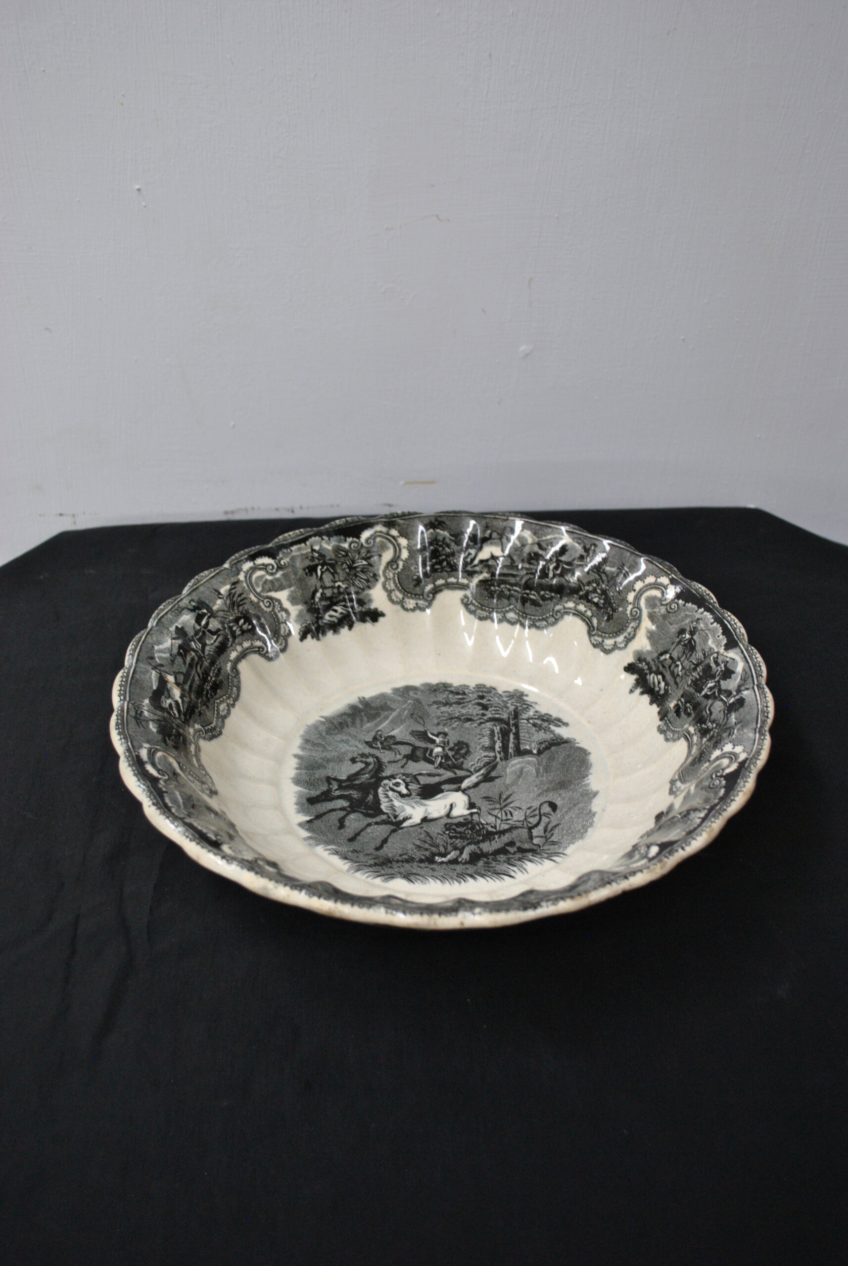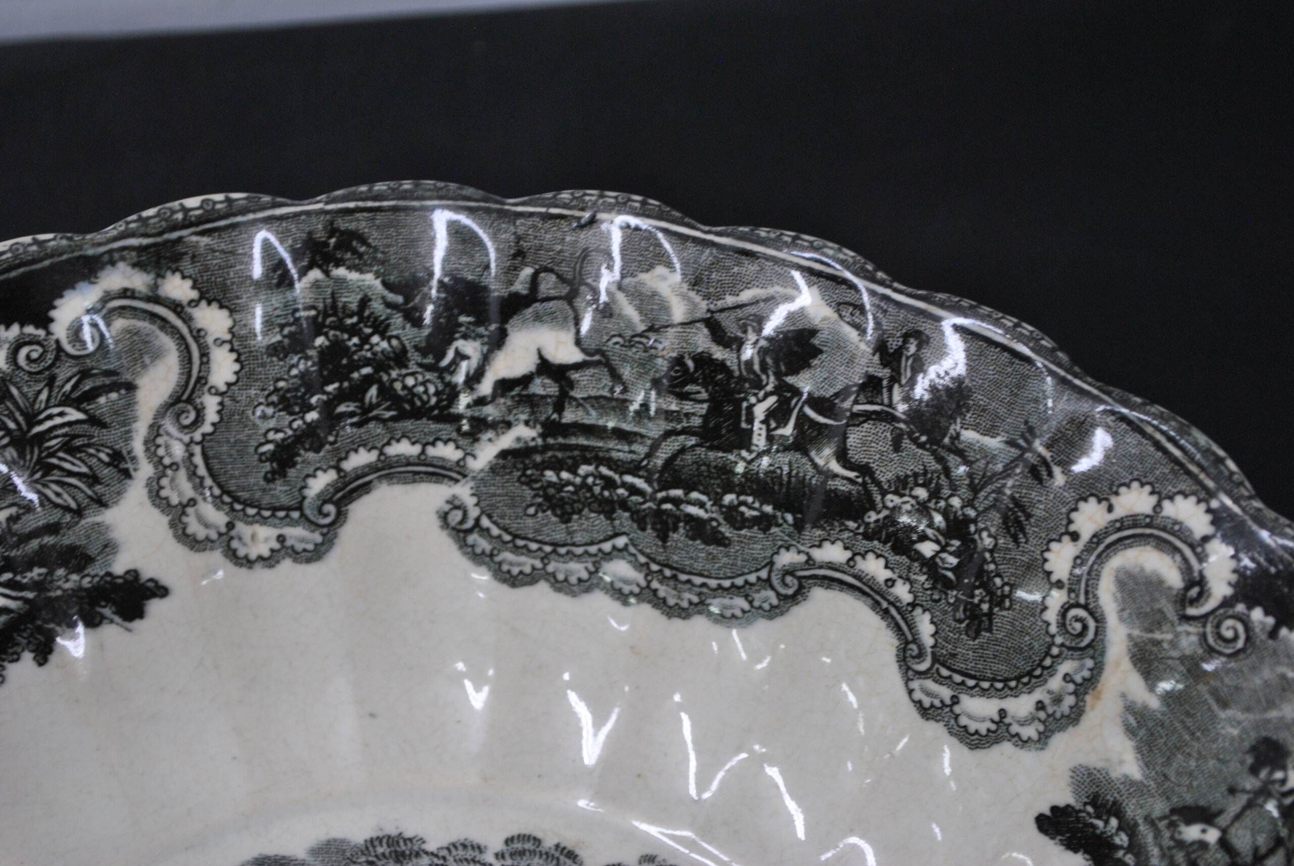 REF: 11911 – Bonita fuente honda o cuenco fabricado en loza con sello Cartagena. En el centro de la pieza se representa una escena de caza de inspiración romántica, con jinetes a caballo y perros persiguiendo animales salvajes en un paisaje boscoso. La escena central está rodeada por una cenefa ornamentada con motivos florales y escenas ecuestres, todo en intrincado grabado negro sobre loza blanca. El borde es ondulado y suavemente festoneado, detalle típico de la estética victoriana.
