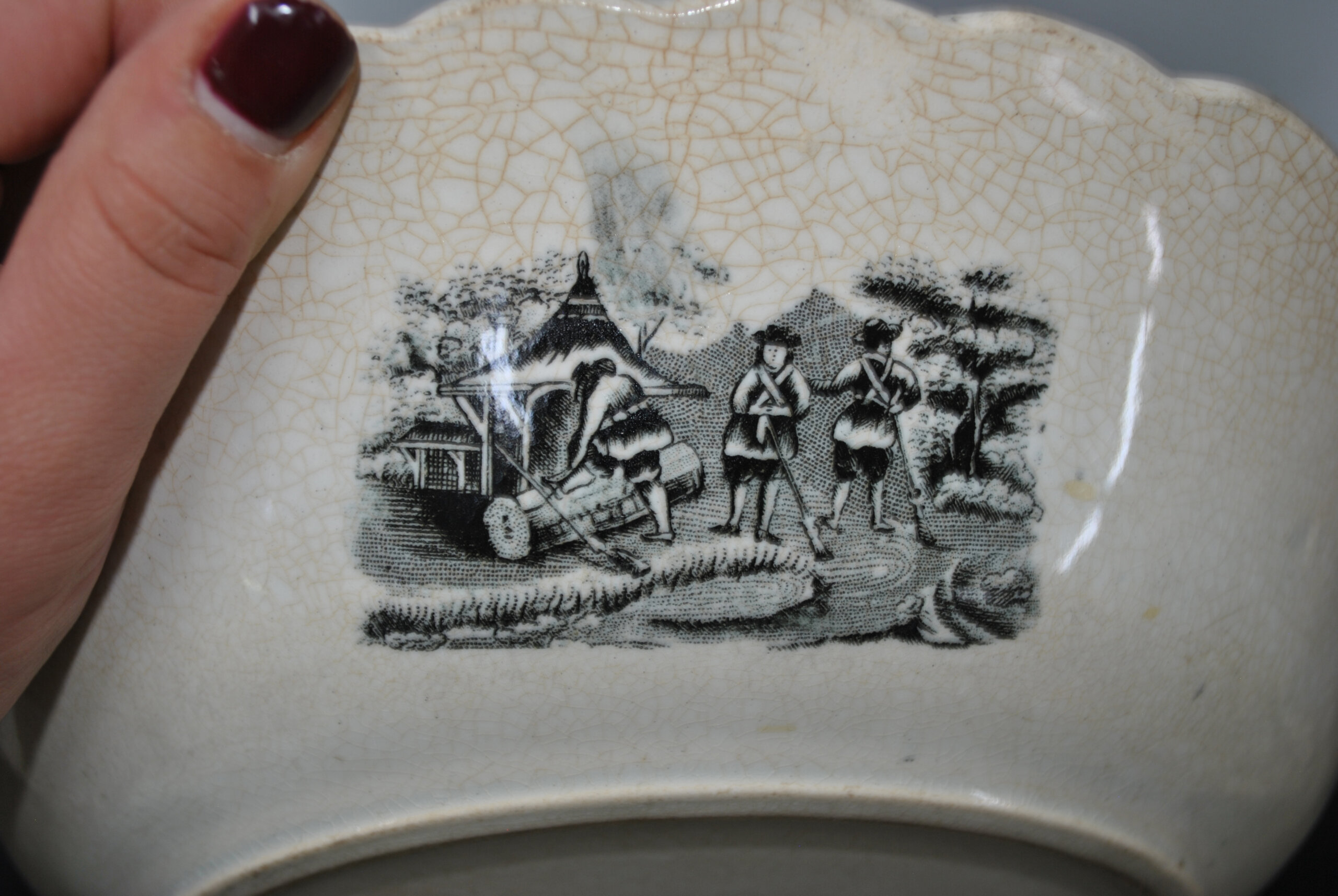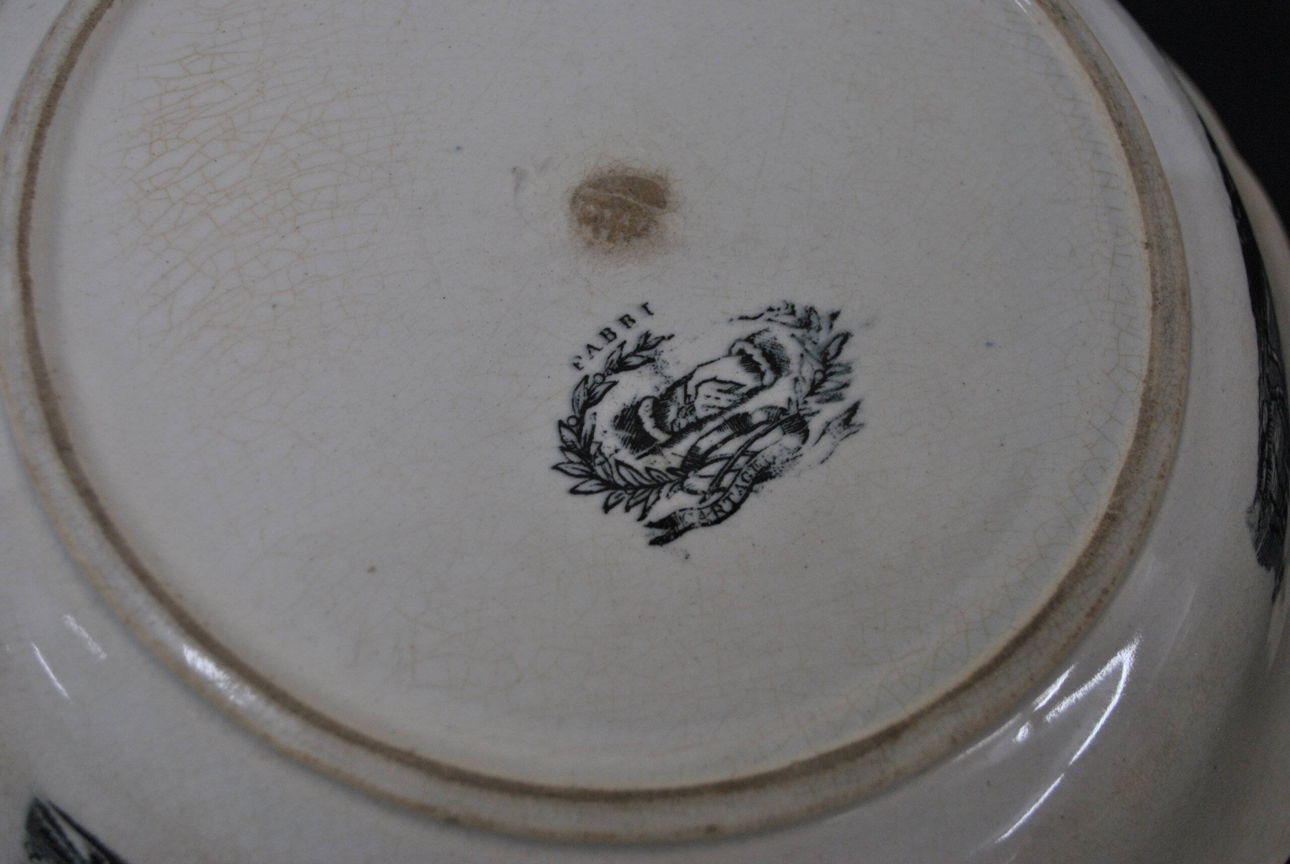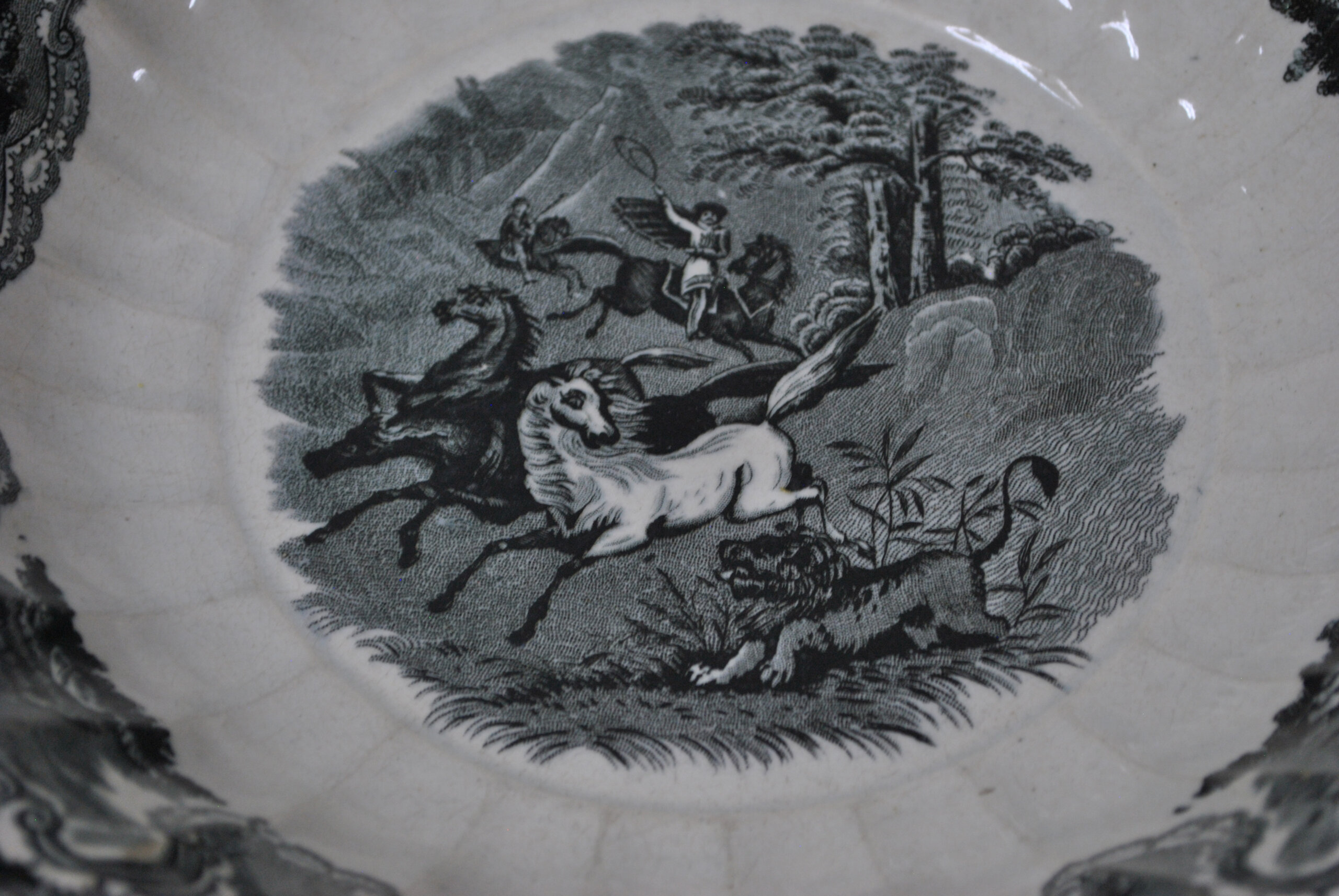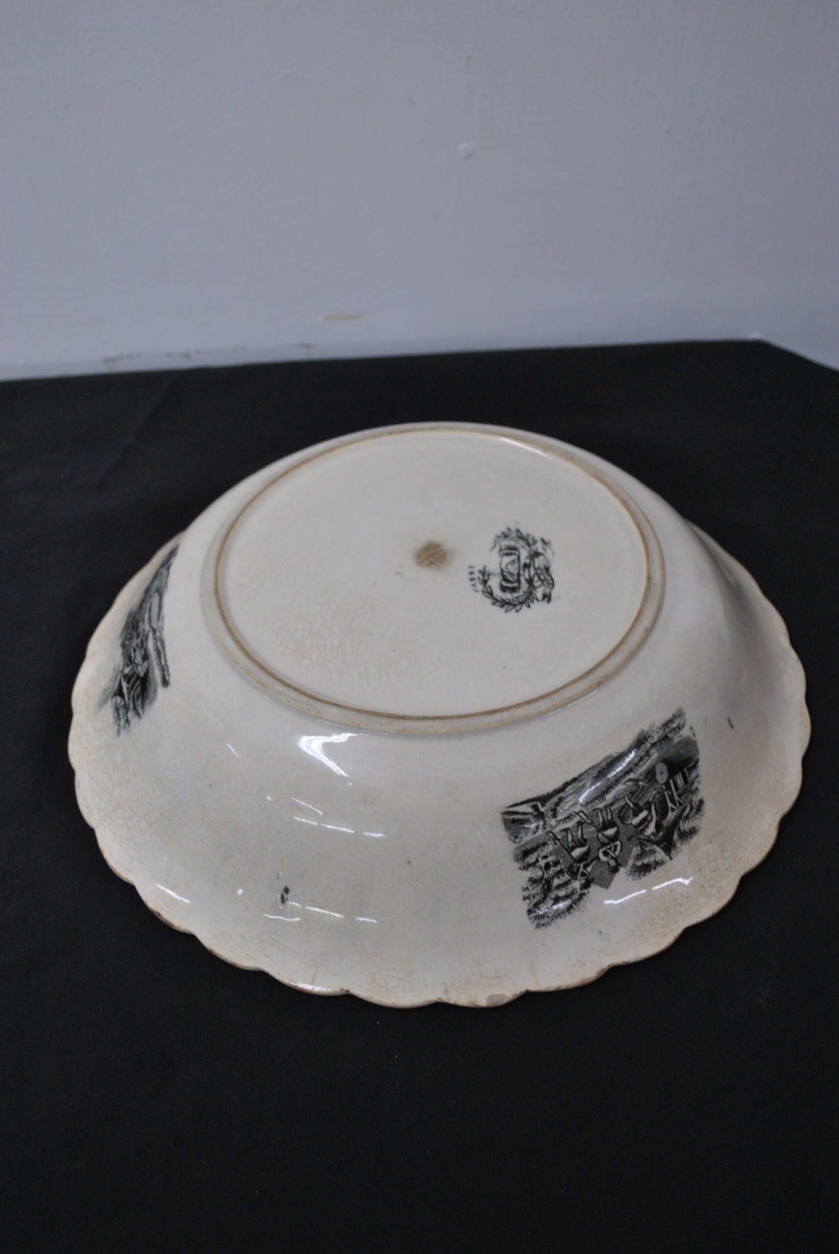 REF: 11911 – Bonita fuente honda o cuenco fabricado en loza con sello Cartagena. En el centro de la pieza se representa una escena de caza de inspiración romántica, con jinetes a caballo y perros persiguiendo animales salvajes en un paisaje boscoso. La escena central está rodeada por una cenefa ornamentada con motivos florales y escenas ecuestres, todo en intrincado grabado negro sobre loza blanca. El borde es ondulado y suavemente festoneado, detalle típico de la estética victoriana.