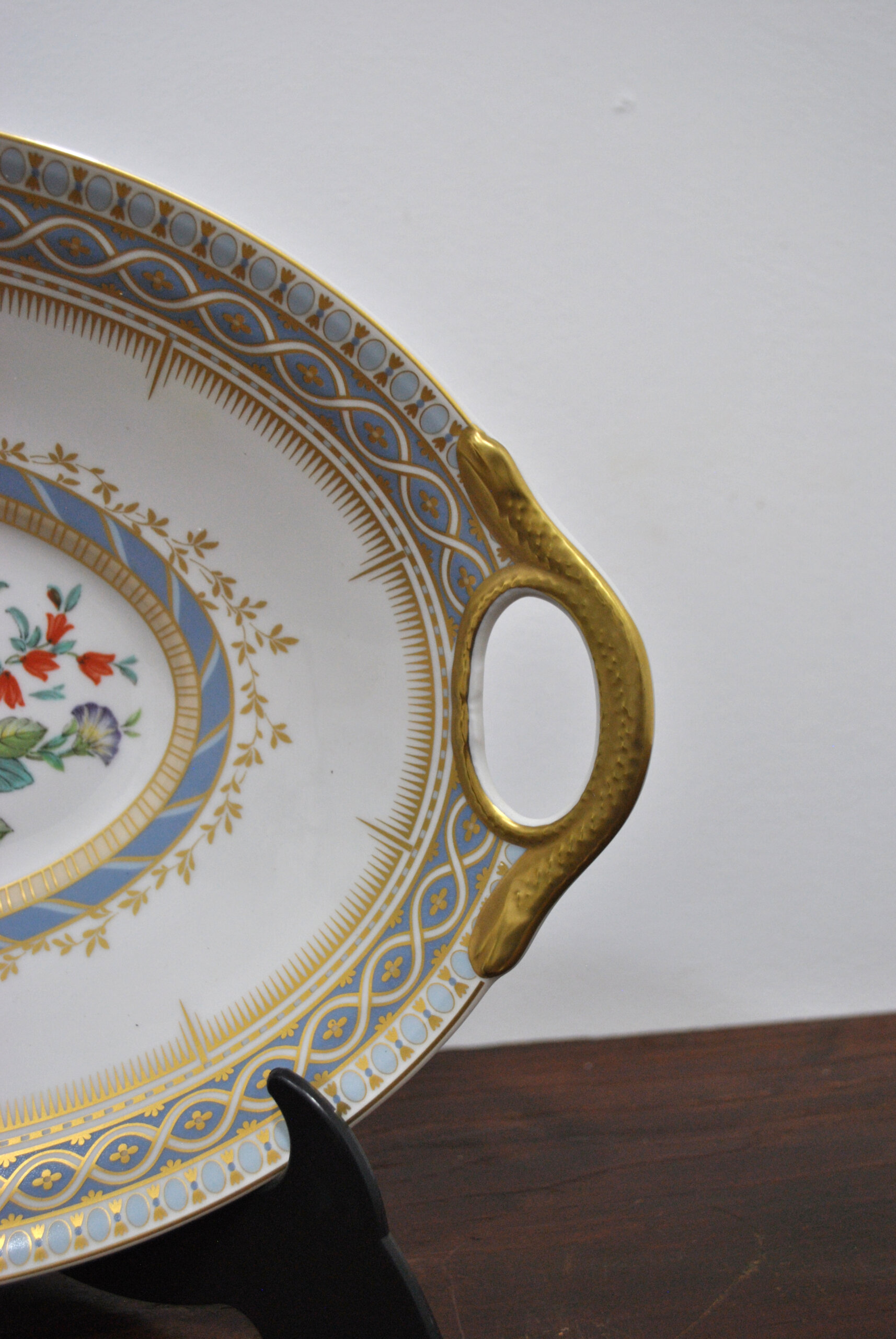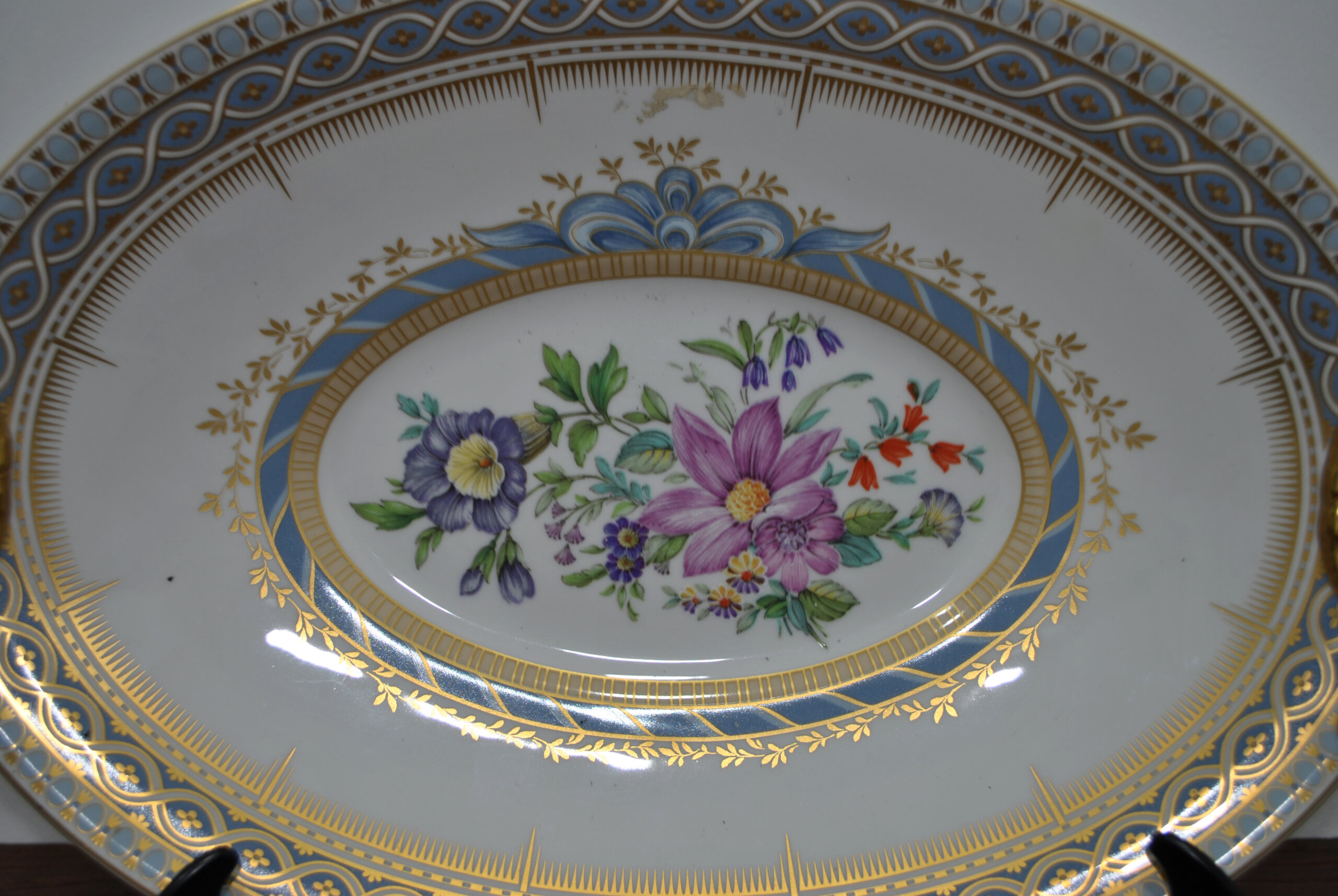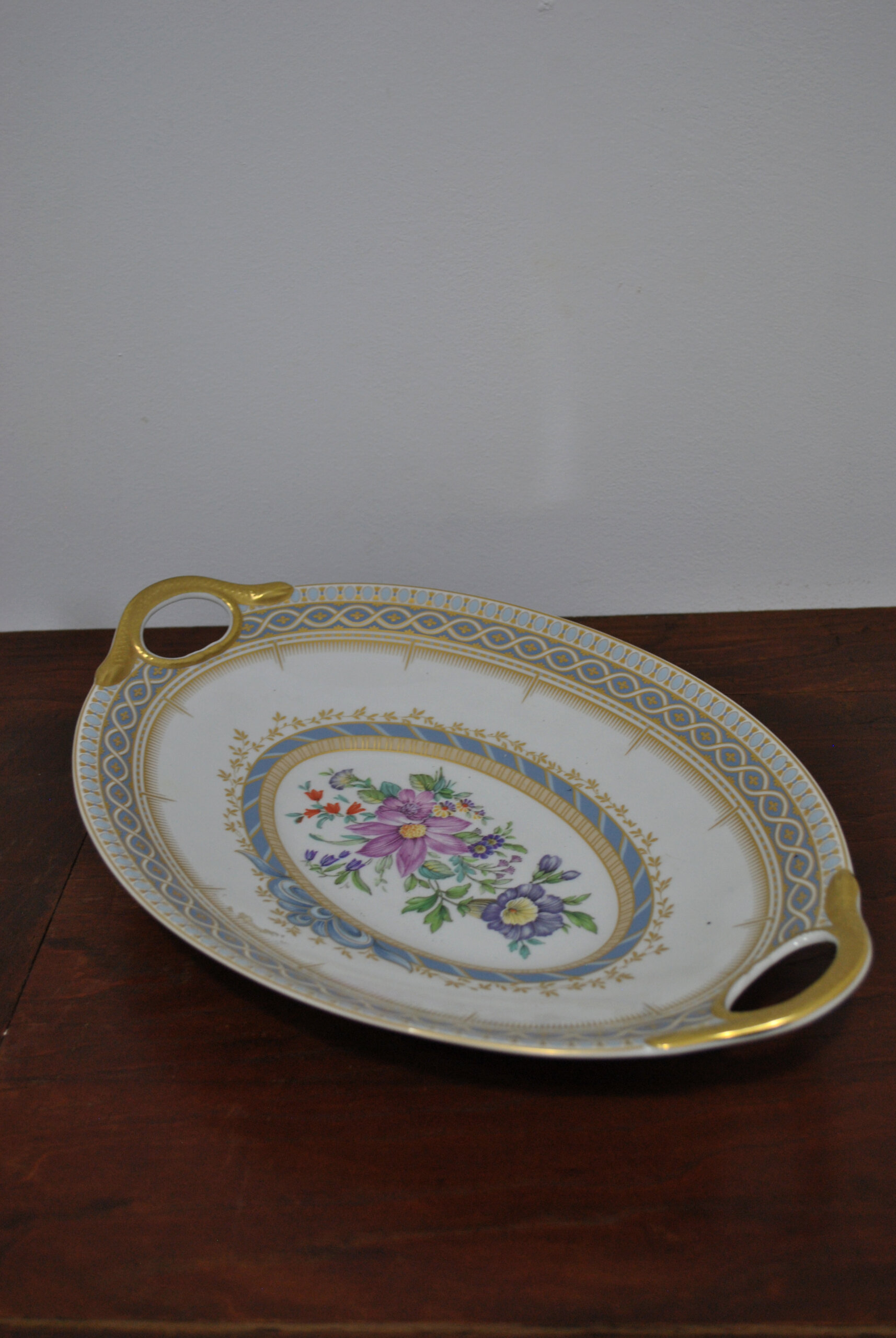 Realizada en fina porcelana blanca de gran calidad, presenta una delicada decoración central floral policromada en tonos malva, lila, azul y verde, con composición equilibrada y refinada. El conjunto está enmarcado por una cenefa oval en azul suave con detalles geométricos y finos fileteados en oro, que aportan distinción y luminosidad a la pieza.