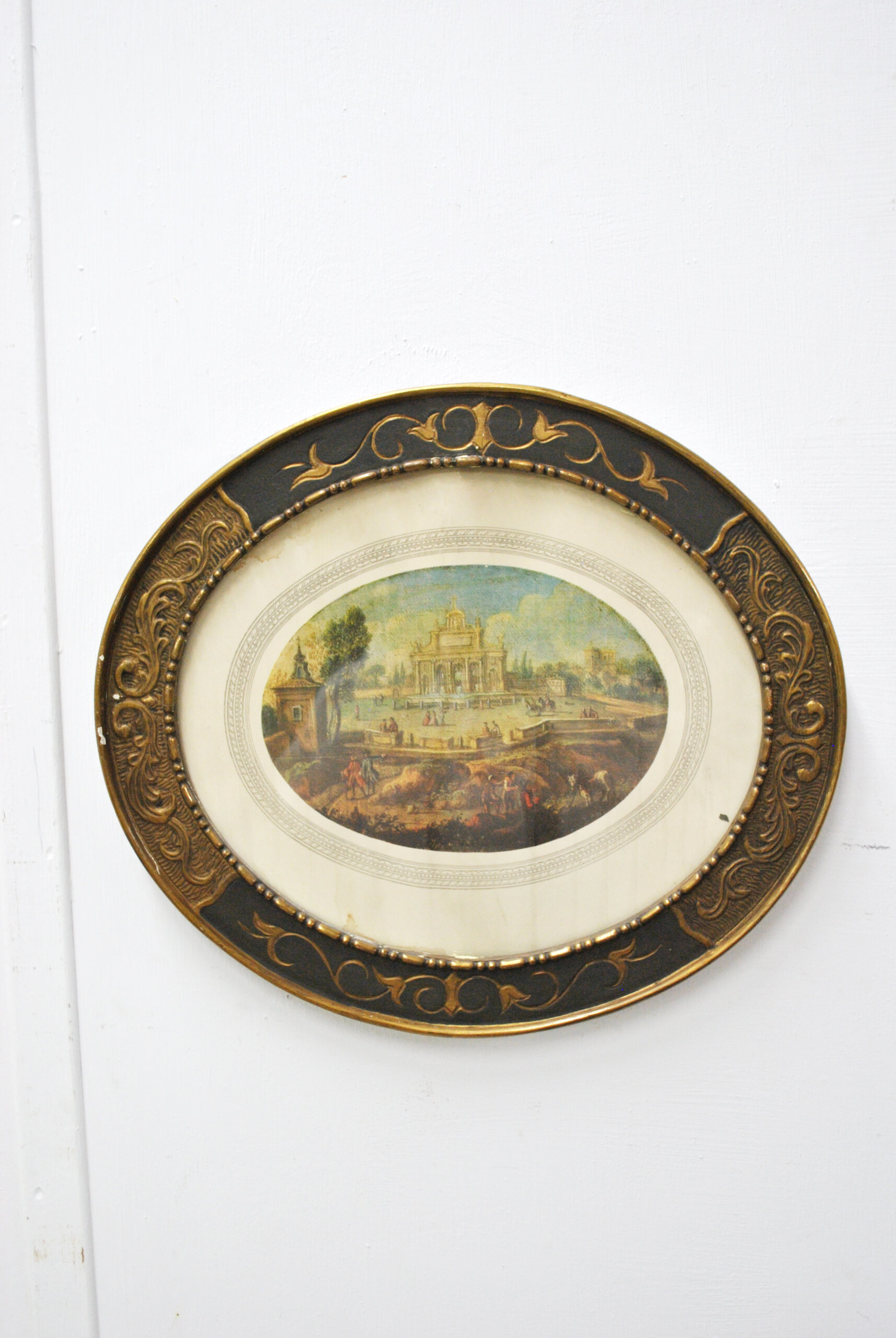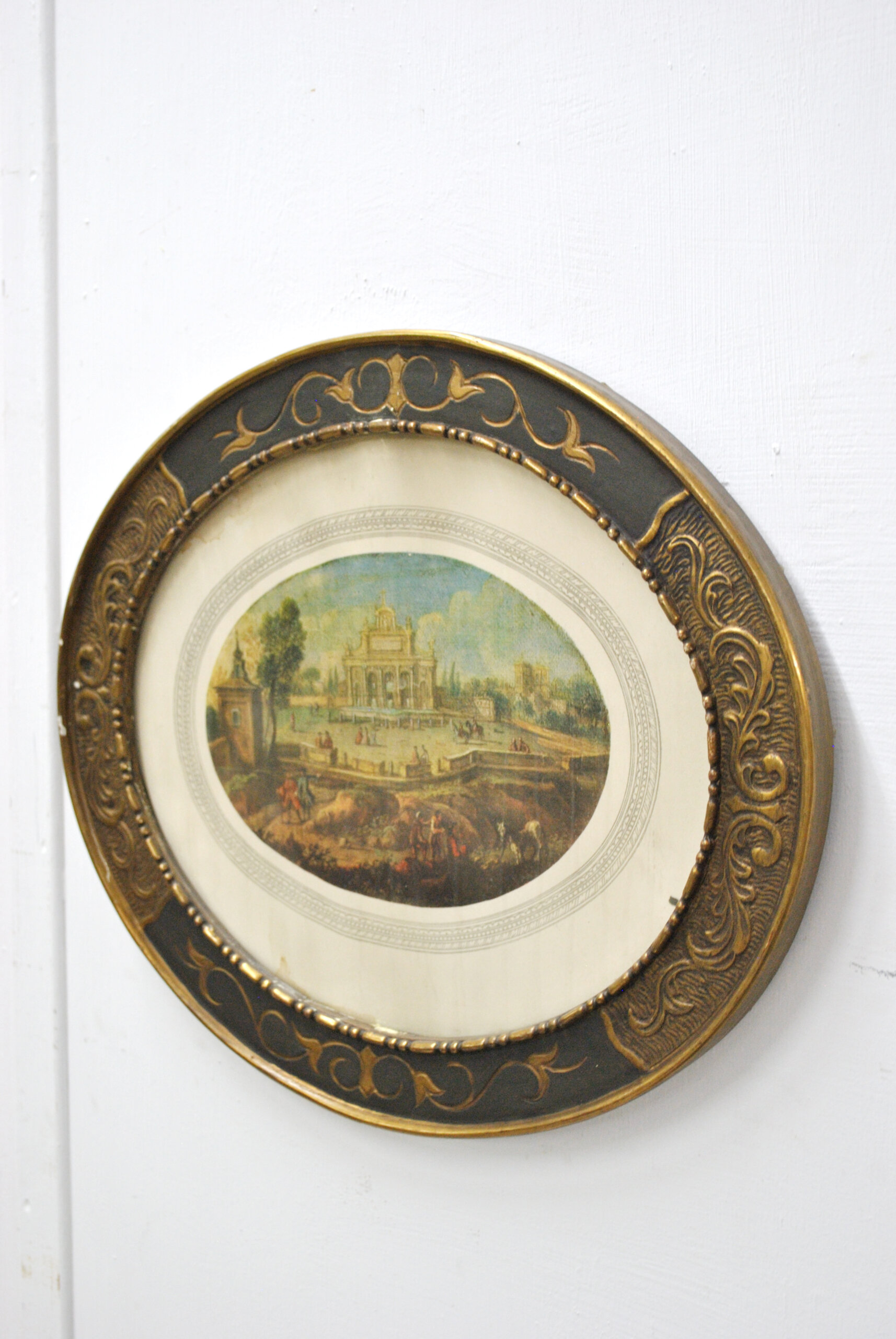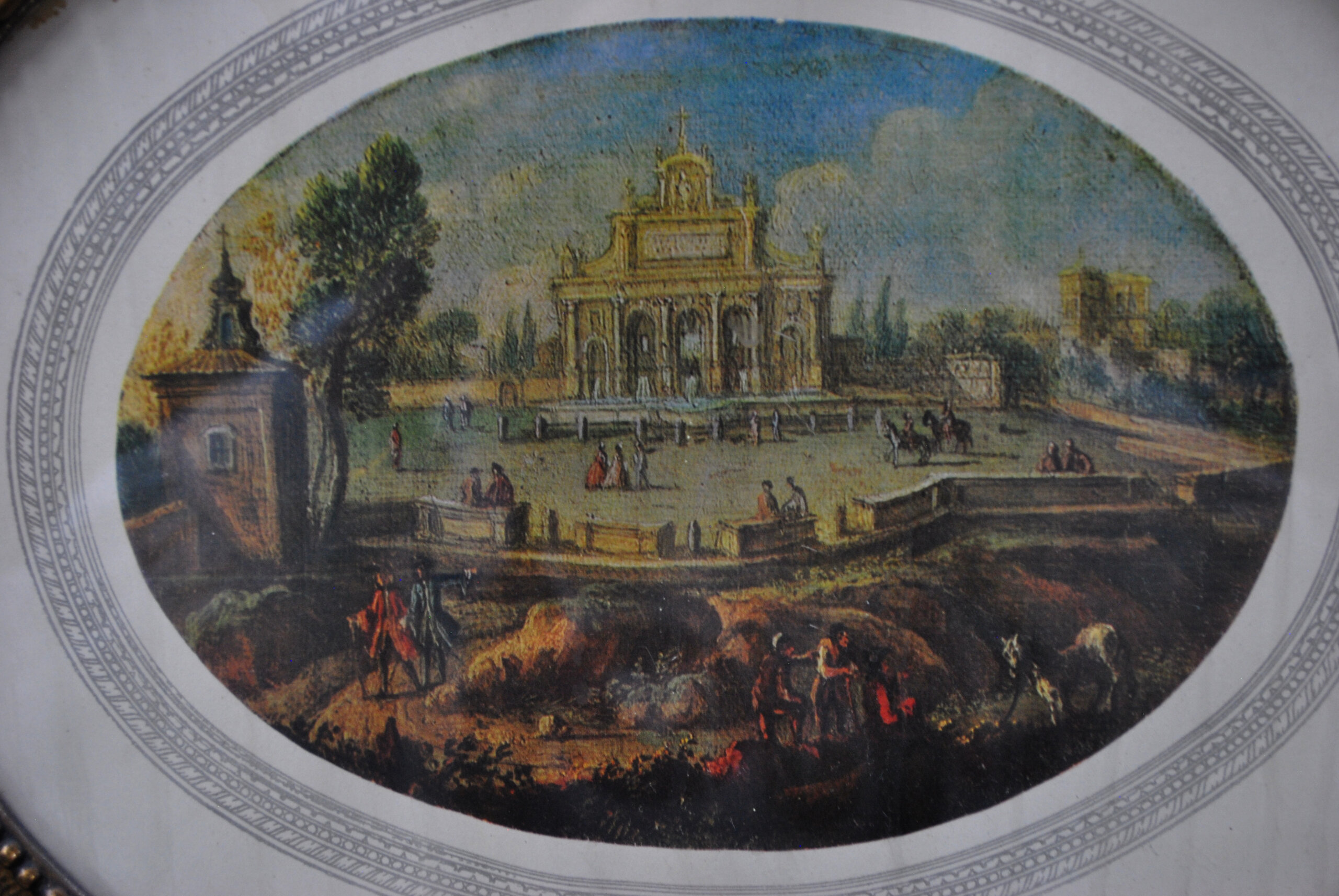 REF: 11906 – Elegante grabado antiguo de tema arquitectónico, representando una plaza ajardinada con fuente central y un edificio monumental de estilo clásico al fondo, rodeado de figuras paseando y caballeros a caballo. El grabado está enmarcado en un marco ovalado de madera estucada y dorada, con relieves en volutas y motivos vegetales, y un paspartú beige con filetes ornamentales que enmarcan la escena. El contraste entre el dorado del marco y los tonos cálidos de la estampa resalta la profundidad de la composición.