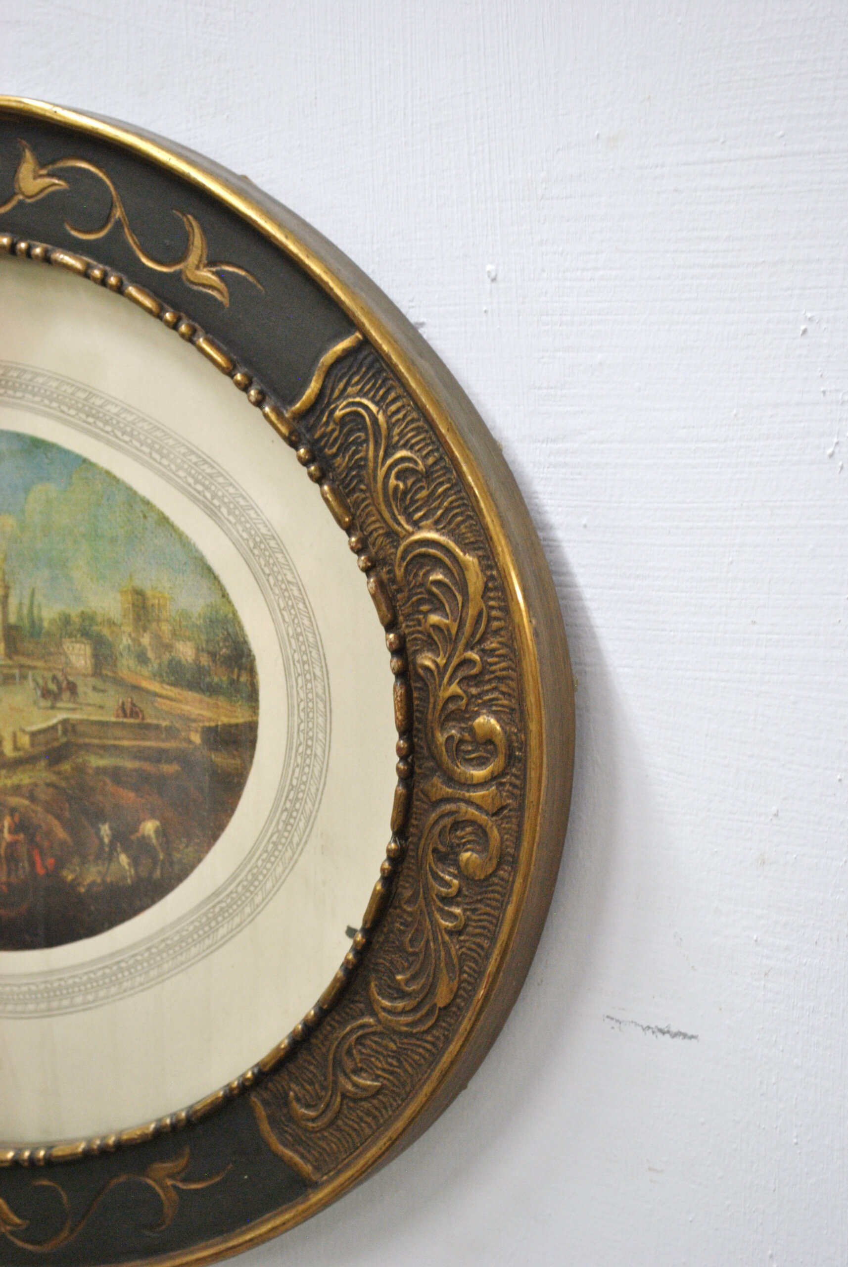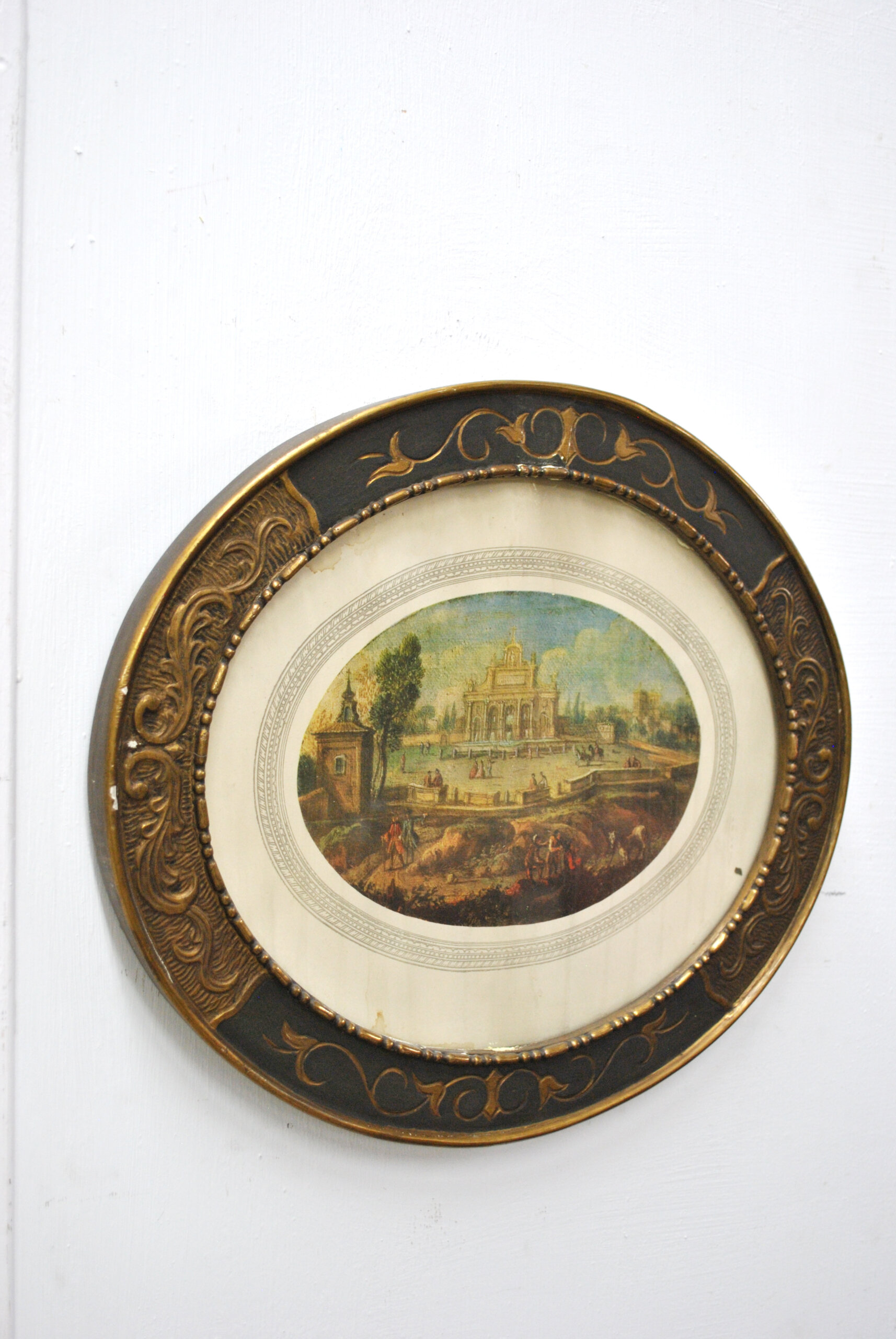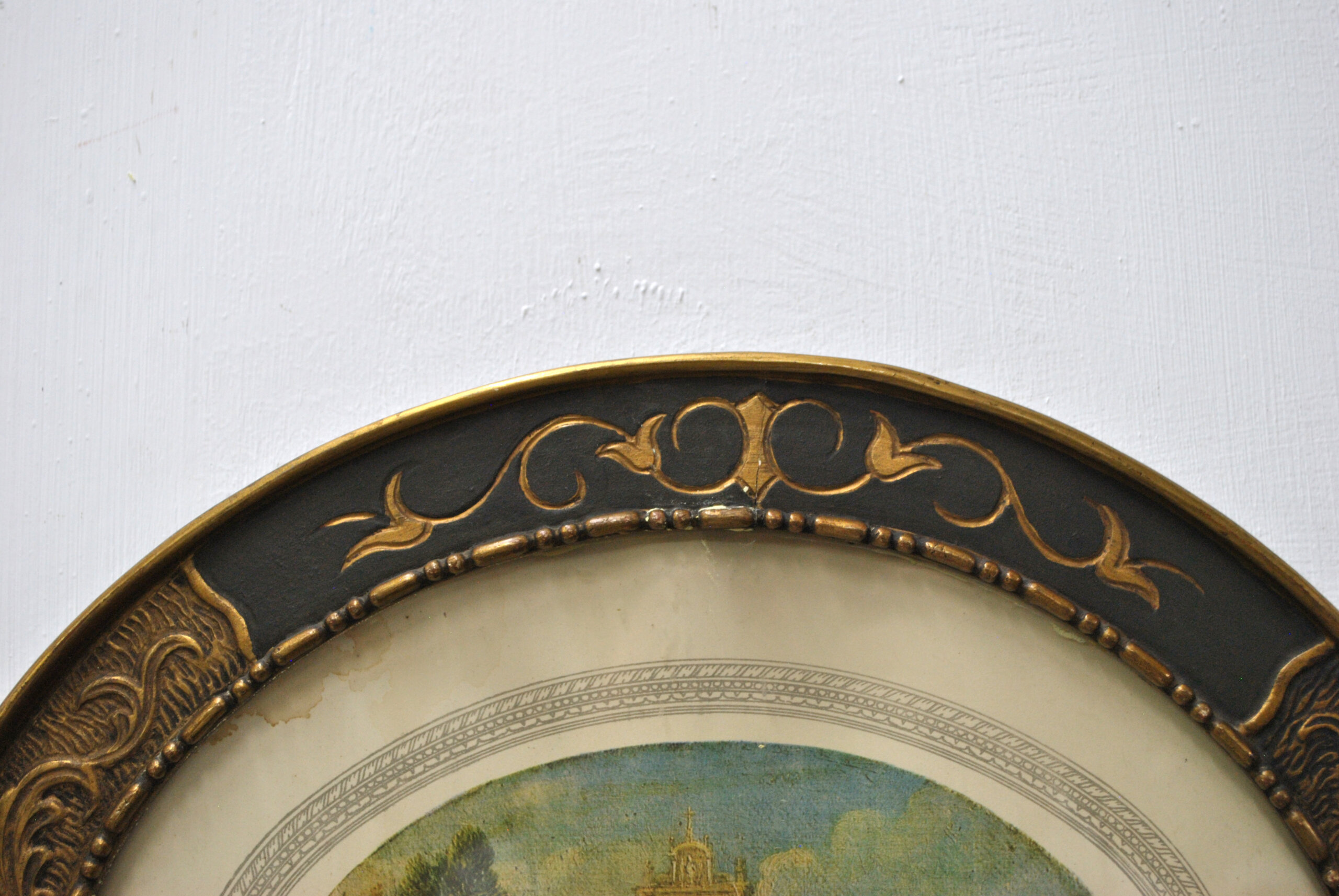 REF: 11906 – Elegante grabado antiguo de tema arquitectónico, representando una plaza ajardinada con fuente central y un edificio monumental de estilo clásico al fondo, rodeado de figuras paseando y caballeros a caballo. El grabado está enmarcado en un marco ovalado de madera estucada y dorada, con relieves en volutas y motivos vegetales, y un paspartú beige con filetes ornamentales que enmarcan la escena. El contraste entre el dorado del marco y los tonos cálidos de la estampa resalta la profundidad de la composición.