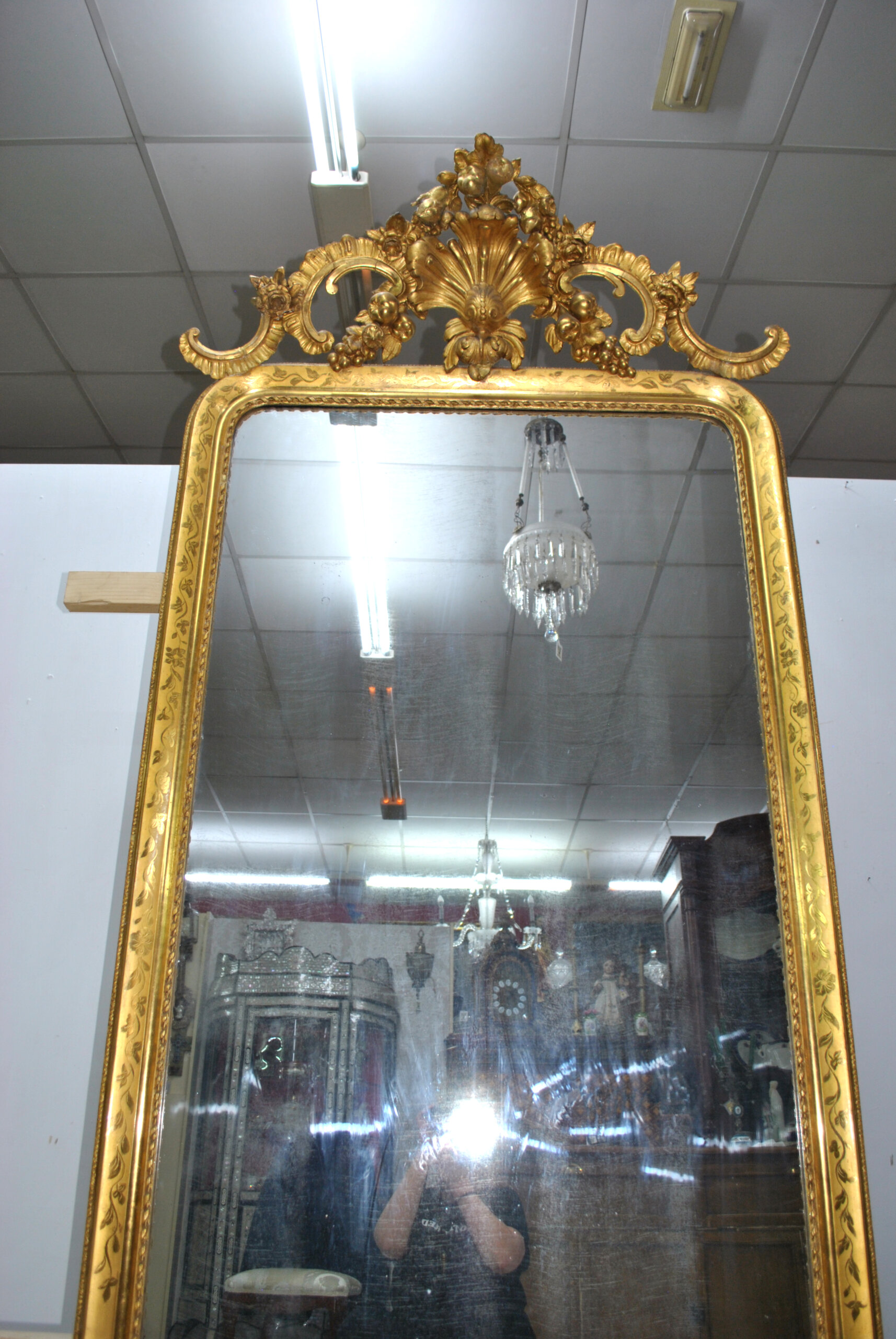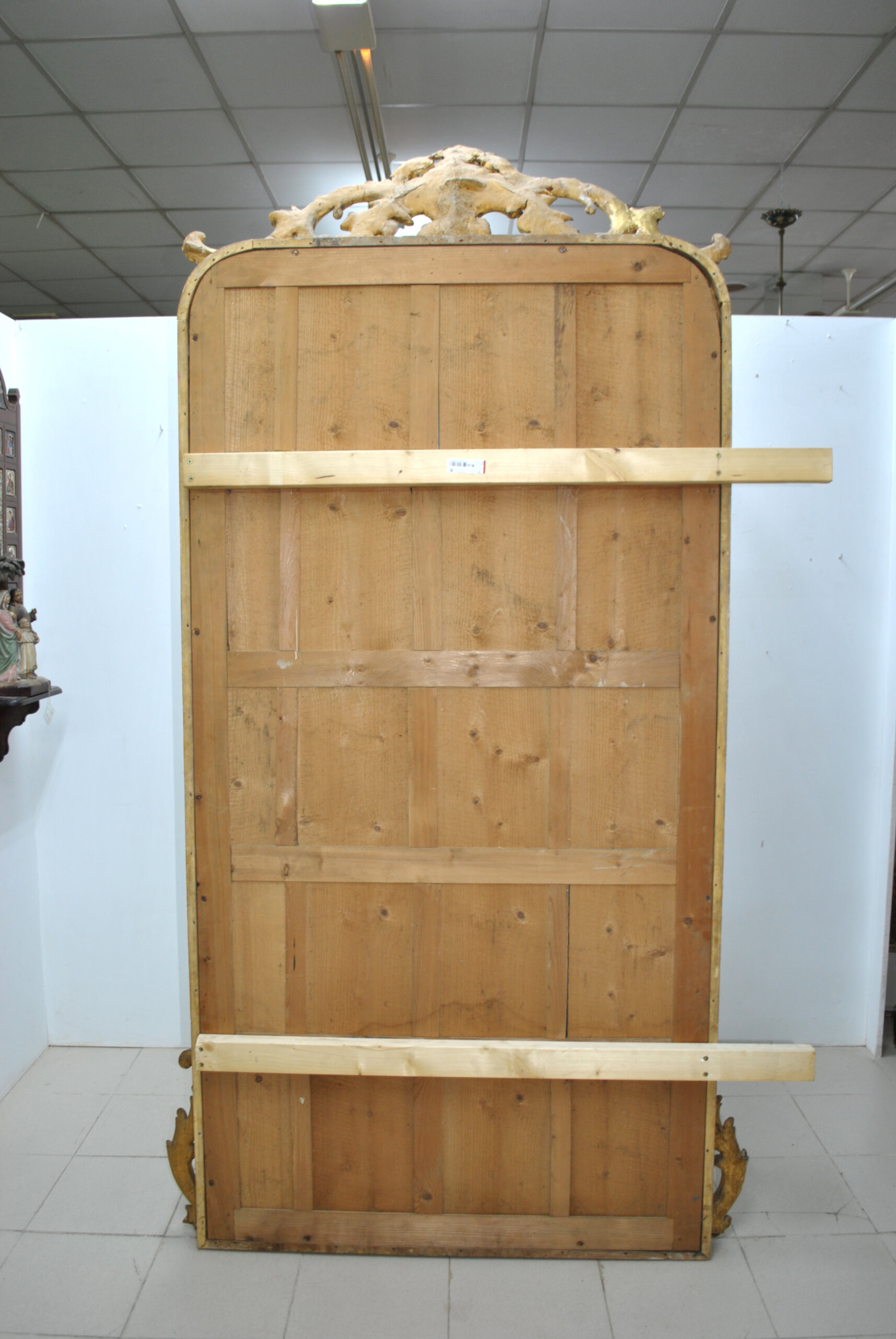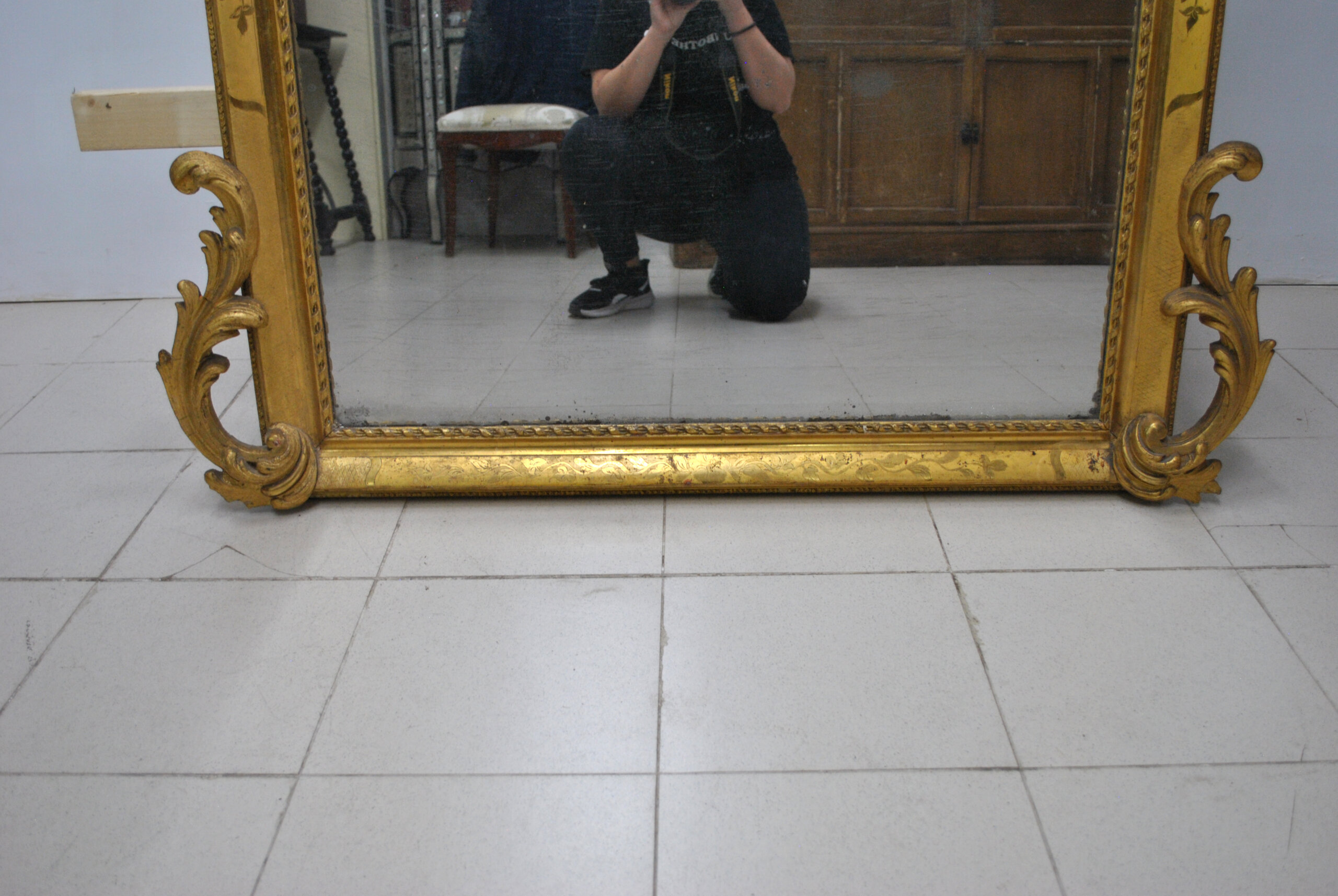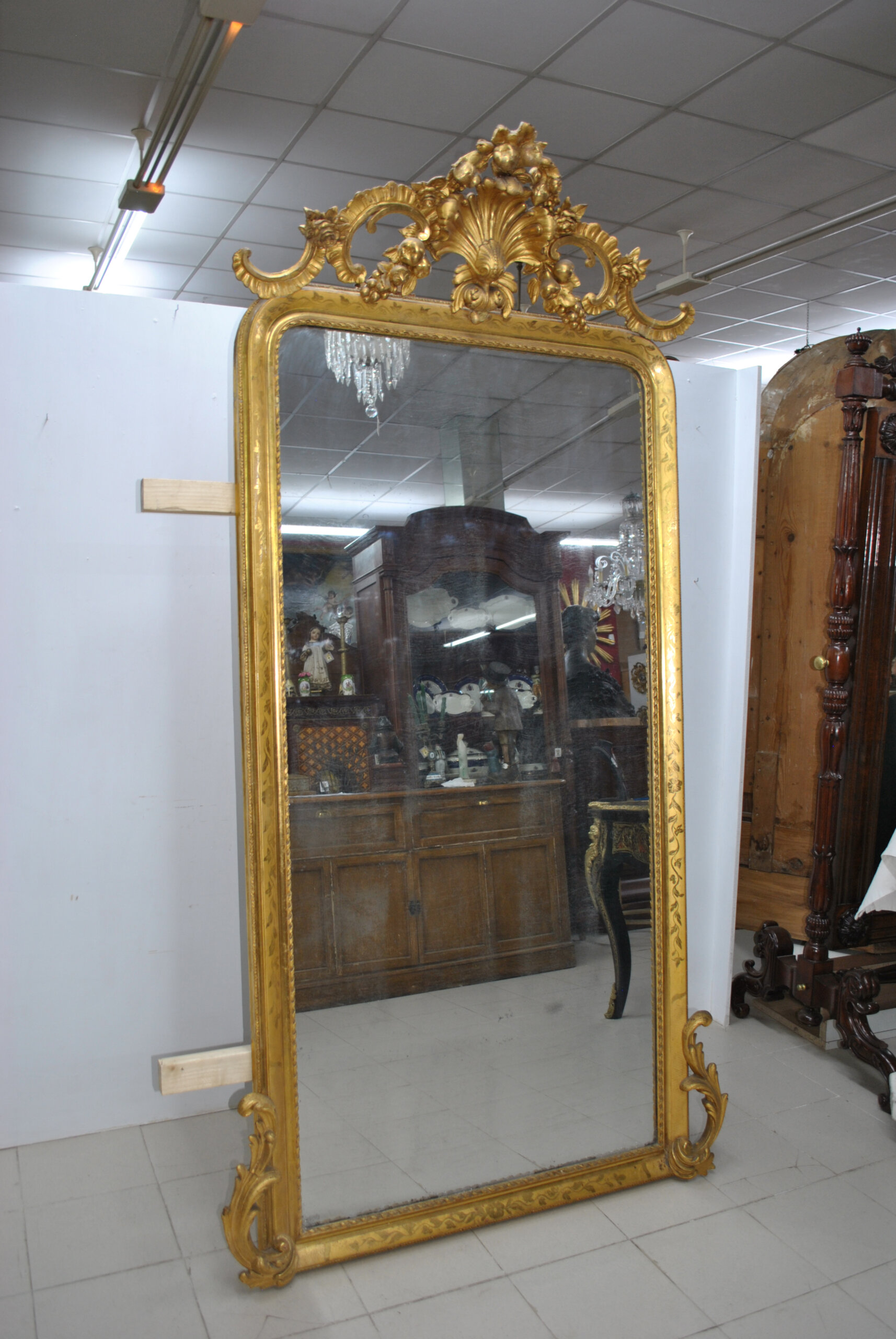 REF: AJ-117 – Este impresionante espejo antiguo de gran formato es una pieza excepcional de estilo Luis XVI, realizada en madera tallada y dorada al pan de oro, con una decoración de exquisito detalle y un aire majestuoso propio de los interiores aristocráticos del siglo XIX. Su marco presenta un delicado trabajo de talla con motivos florales, roleos y guirnaldas que recorren todo el contorno, culminando en una coronación superior ricamente ornamentada con una gran concha central rodeada de flores, hojas y frutos, símbolo de elegancia y abundancia. La parte inferior cuenta con elaboradas volutas que refuerzan su equilibrio visual y aportan un toque de dinamismo barroco. En la parte trasera, se puede observar la estructura sólida de madera maciza, cuidadosamente ensamblada, que garantiza su estabilidad. Su imponente tamaño y refinado acabado hacen de este espejo una pieza protagonista, ideal para realzar espacios clásicos, salones, recibidores o chimeneas, así como para ambientes contemporáneos que busquen un contraste sofisticado con una pieza cargada de historia y personalidad.