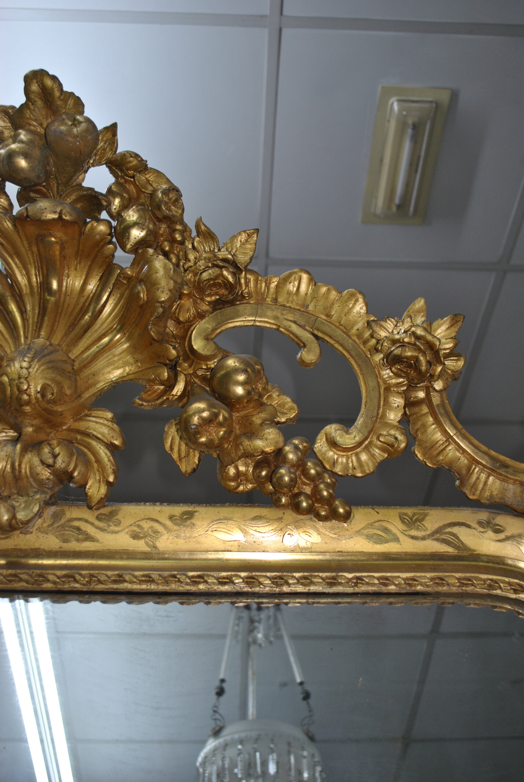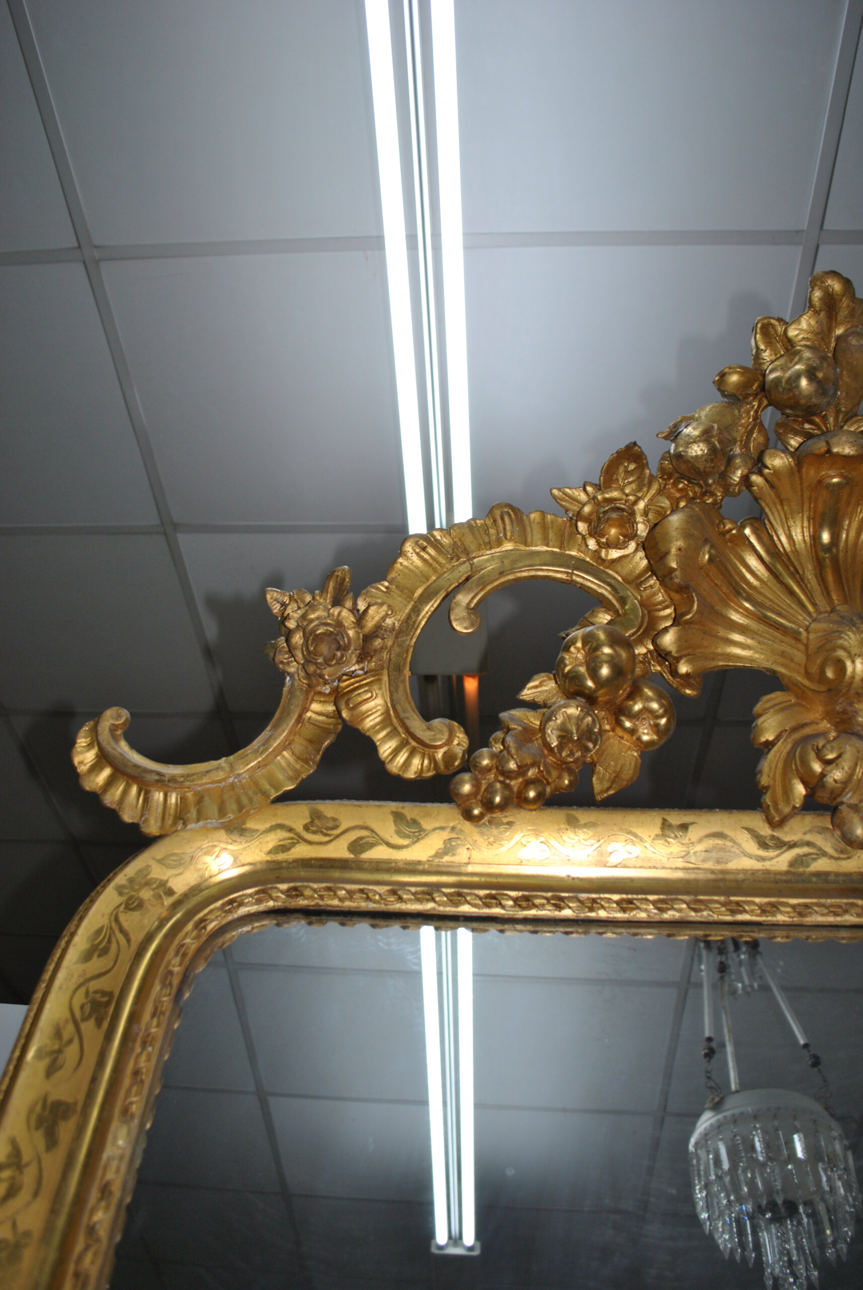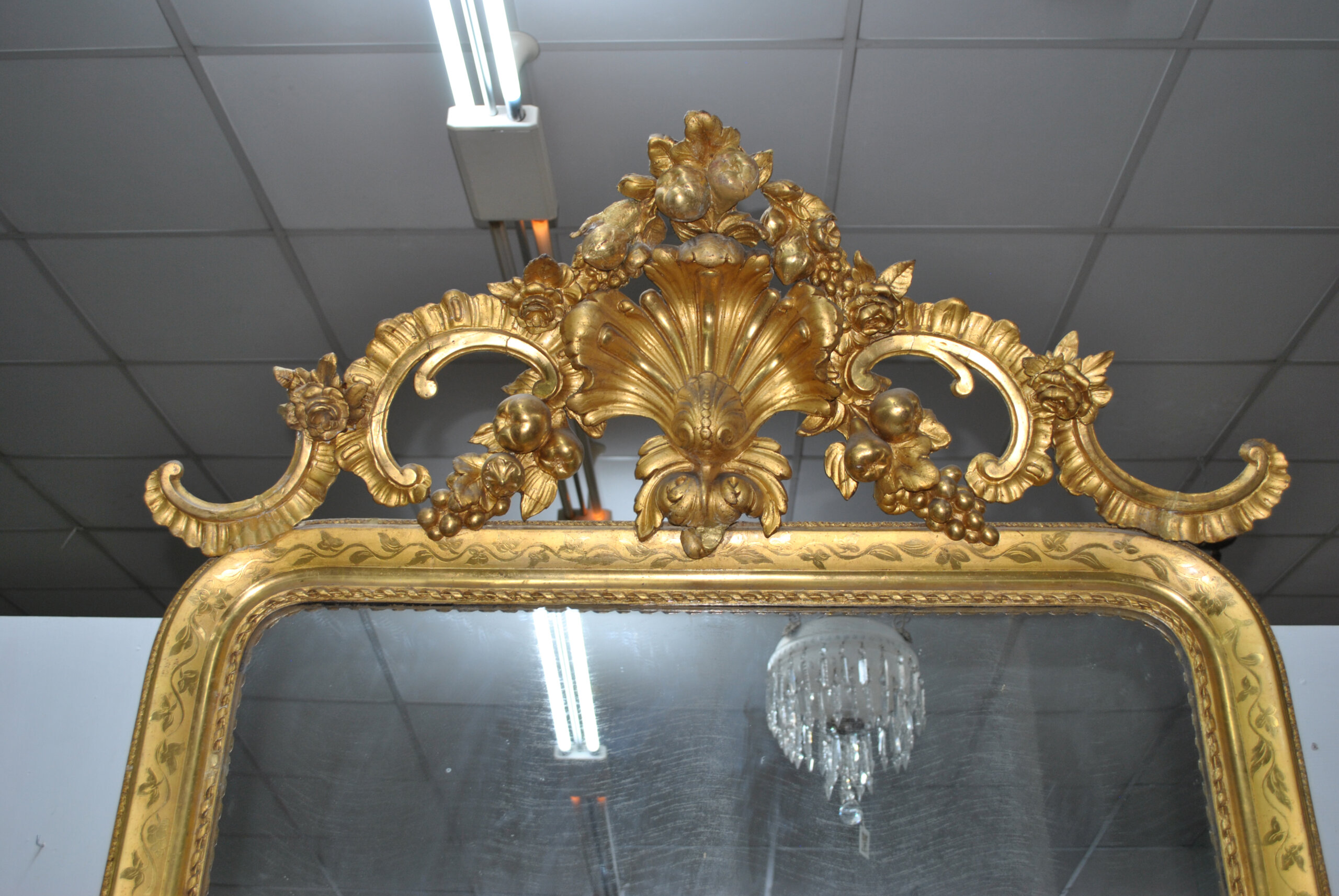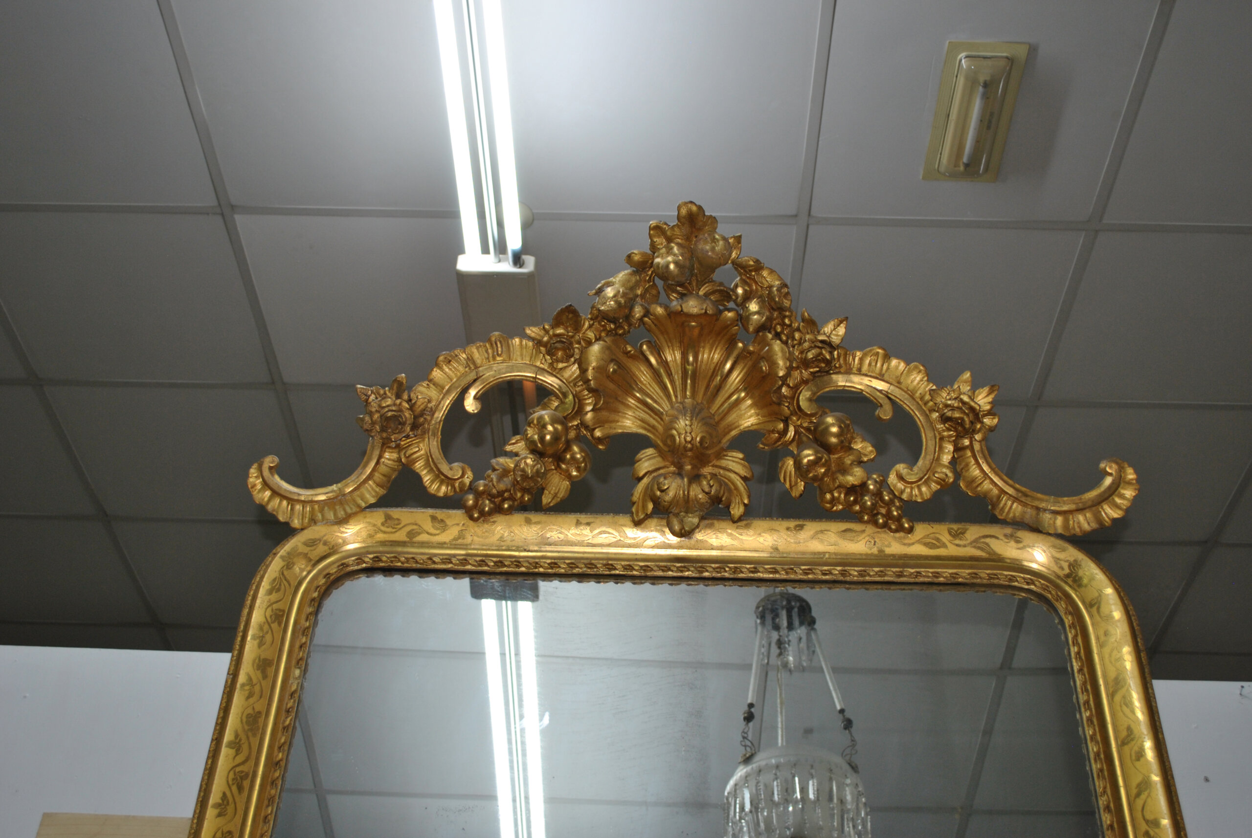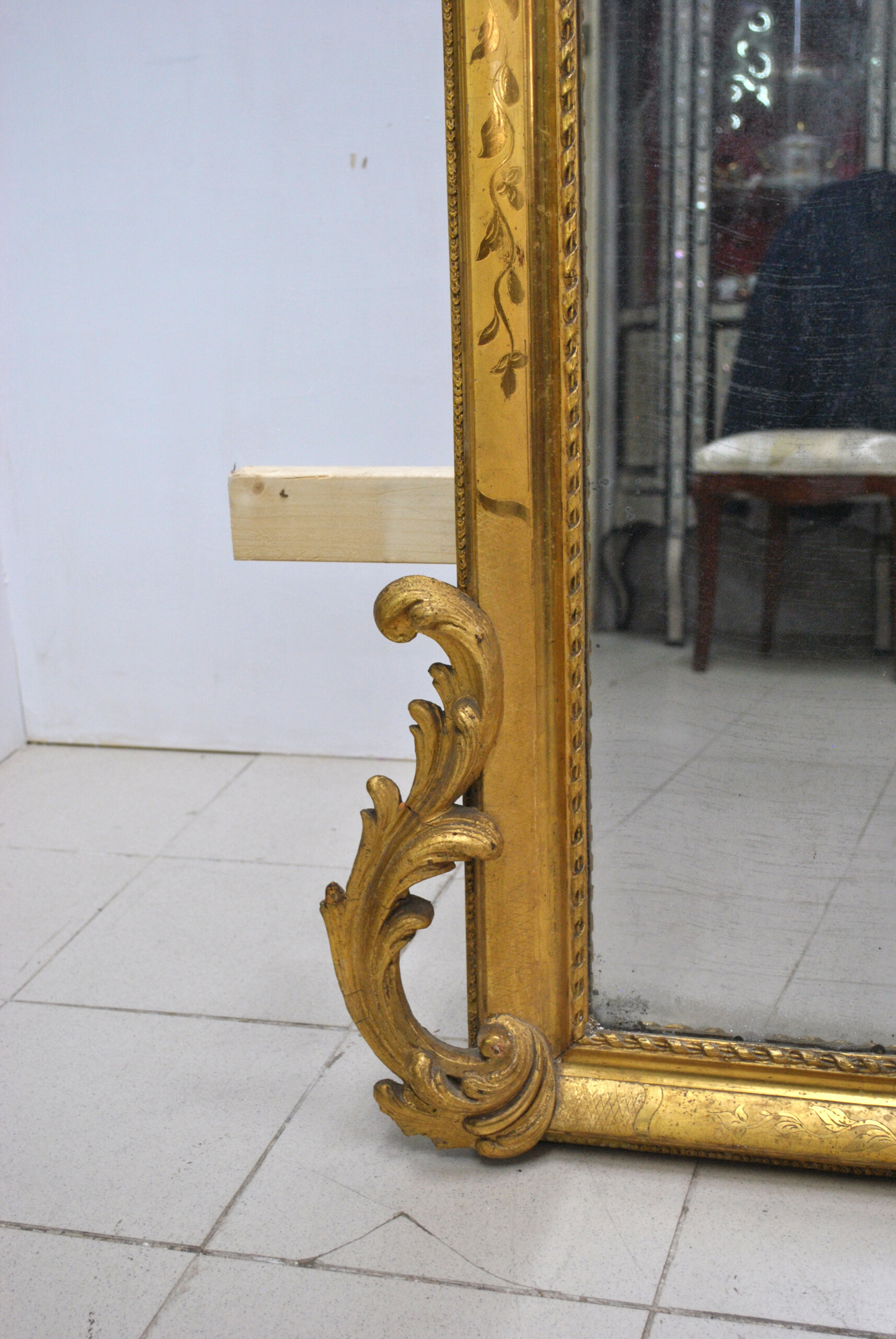 REF: AJ-117 – Este impresionante espejo antiguo de gran formato es una pieza excepcional de estilo Luis XVI, realizada en madera tallada y dorada al pan de oro, con una decoración de exquisito detalle y un aire majestuoso propio de los interiores aristocráticos del siglo XIX. Su marco presenta un delicado trabajo de talla con motivos florales, roleos y guirnaldas que recorren todo el contorno, culminando en una coronación superior ricamente ornamentada con una gran concha central rodeada de flores, hojas y frutos, símbolo de elegancia y abundancia. La parte inferior cuenta con elaboradas volutas que refuerzan su equilibrio visual y aportan un toque de dinamismo barroco. En la parte trasera, se puede observar la estructura sólida de madera maciza, cuidadosamente ensamblada, que garantiza su estabilidad. Su imponente tamaño y refinado acabado hacen de este espejo una pieza protagonista, ideal para realzar espacios clásicos, salones, recibidores o chimeneas, así como para ambientes contemporáneos que busquen un contraste sofisticado con una pieza cargada de historia y personalidad.