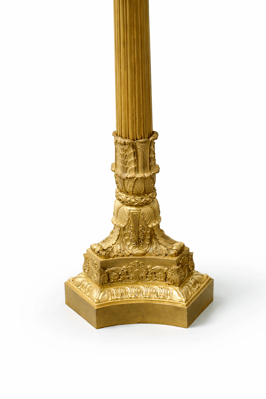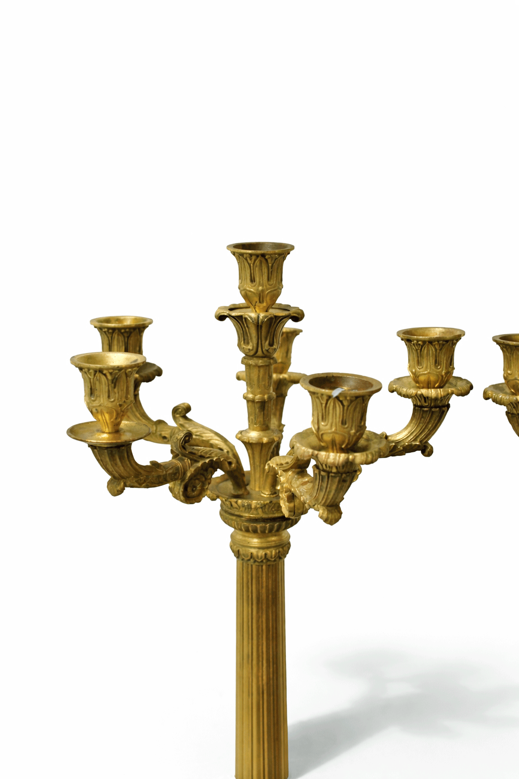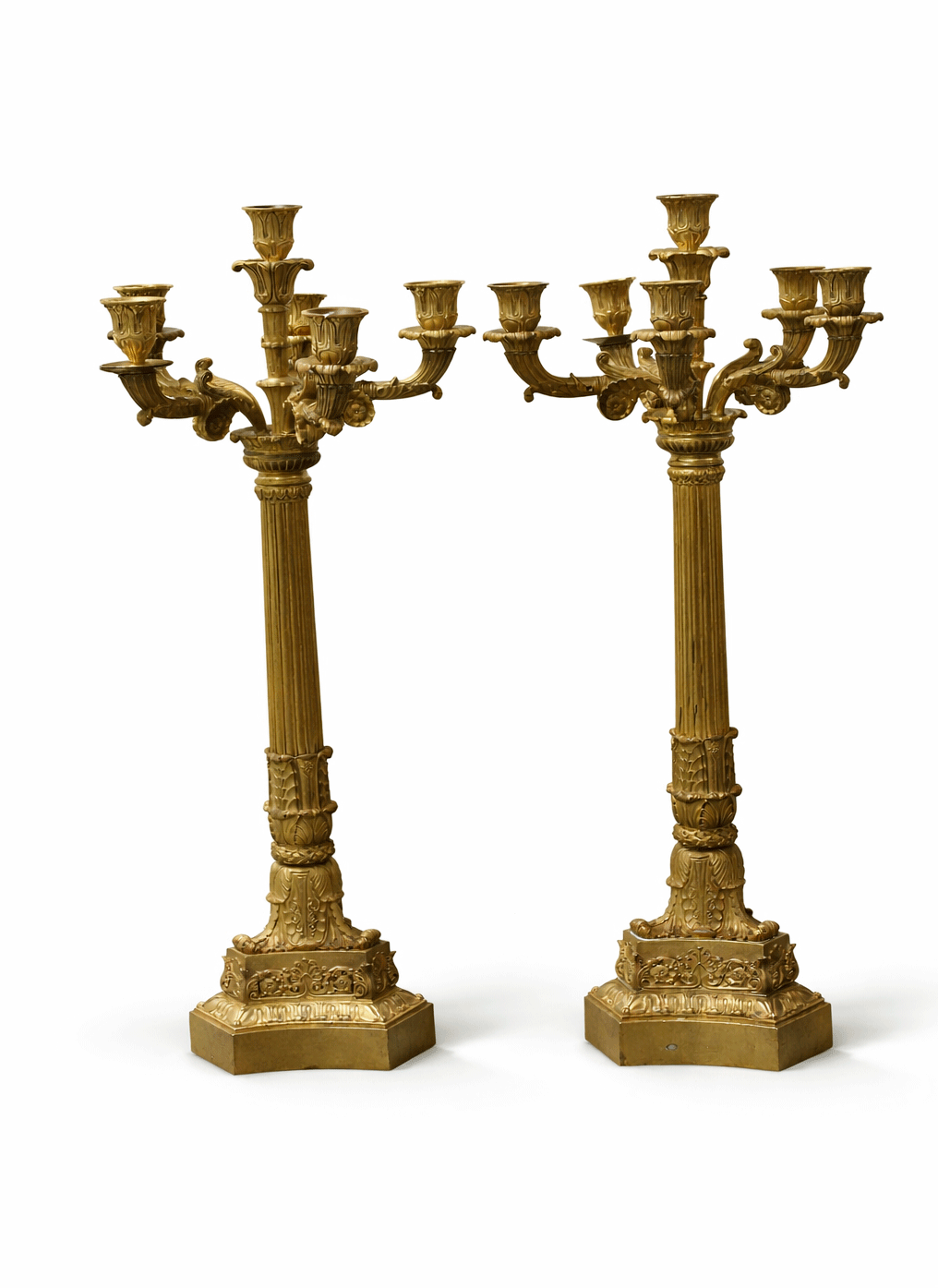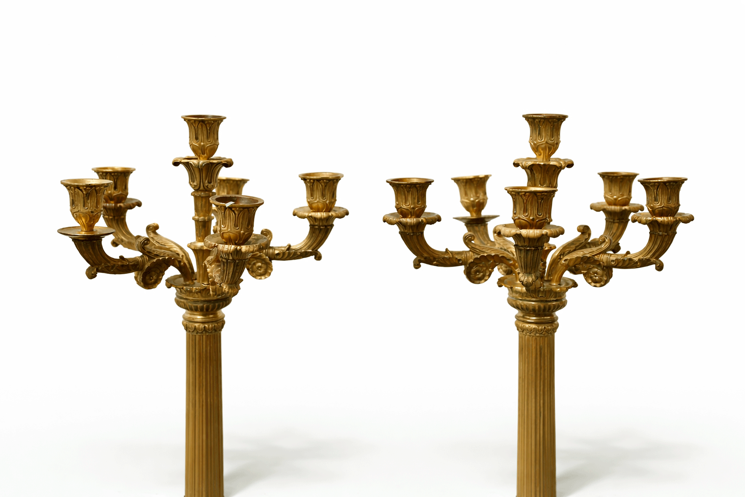REF: 302 – Elegante pareja de hacheros o candelabros antiguos realizados en bronce dorado, de cuidada factura y gran riqueza ornamental. Cada pieza se alza sobre una base poligonal profusamente decorada con relieves clásicos y motivos vegetales, dando paso a un fuste estriado de inspiración neoclásica que aporta esbeltez y equilibrio al conjunto.