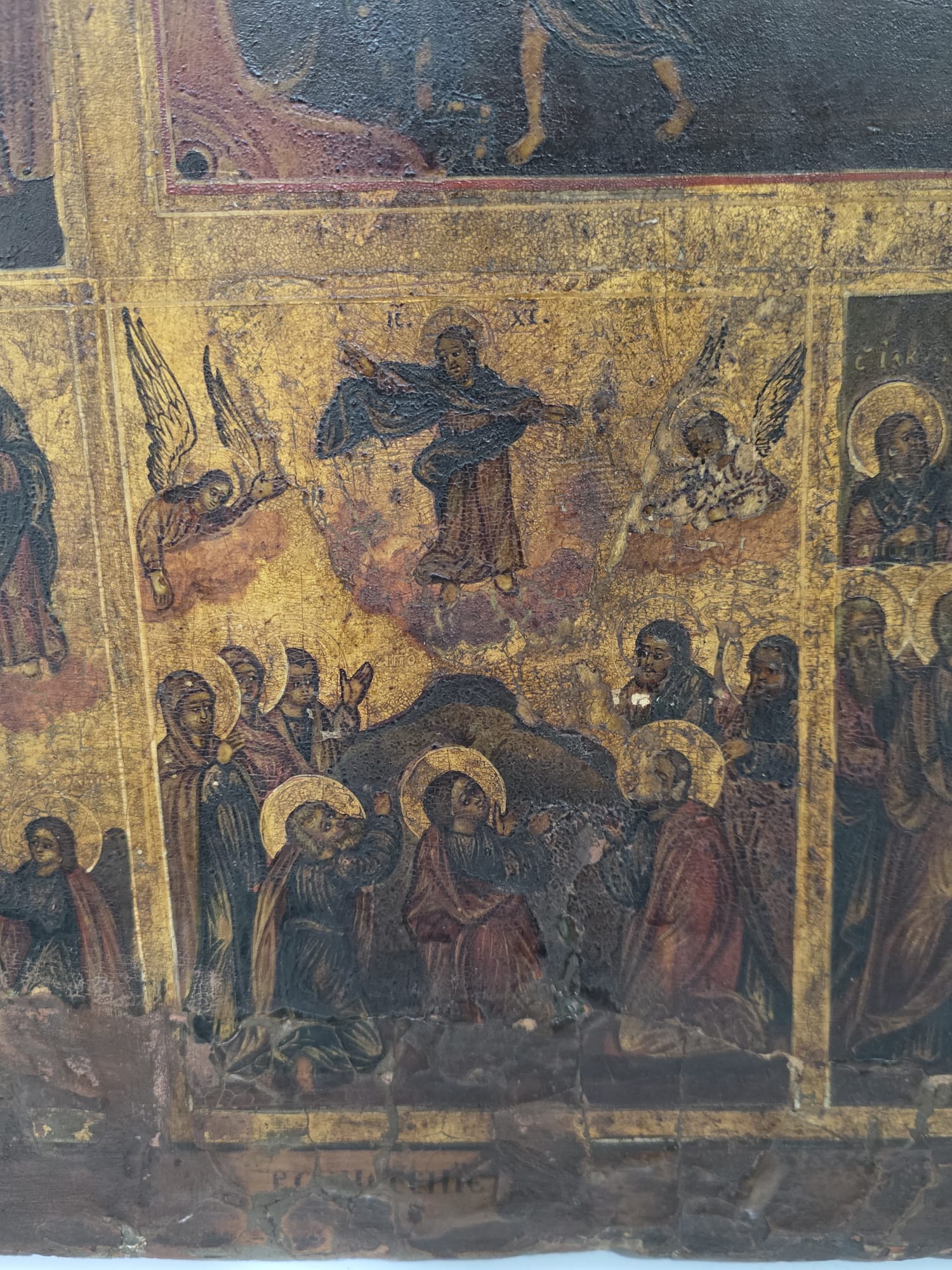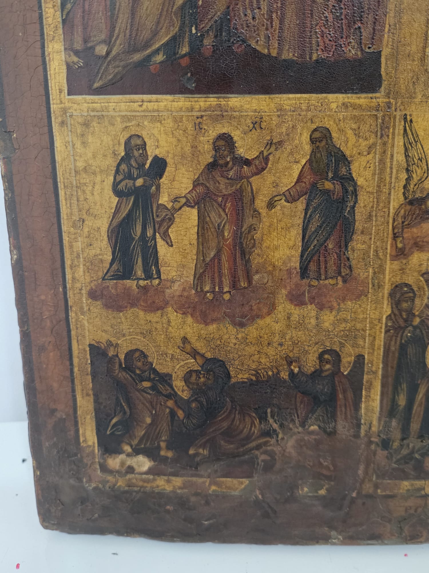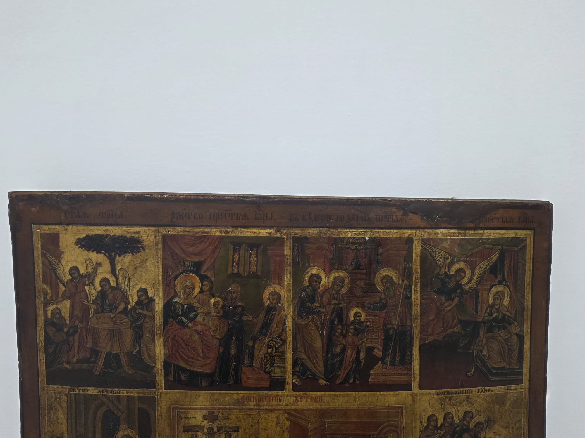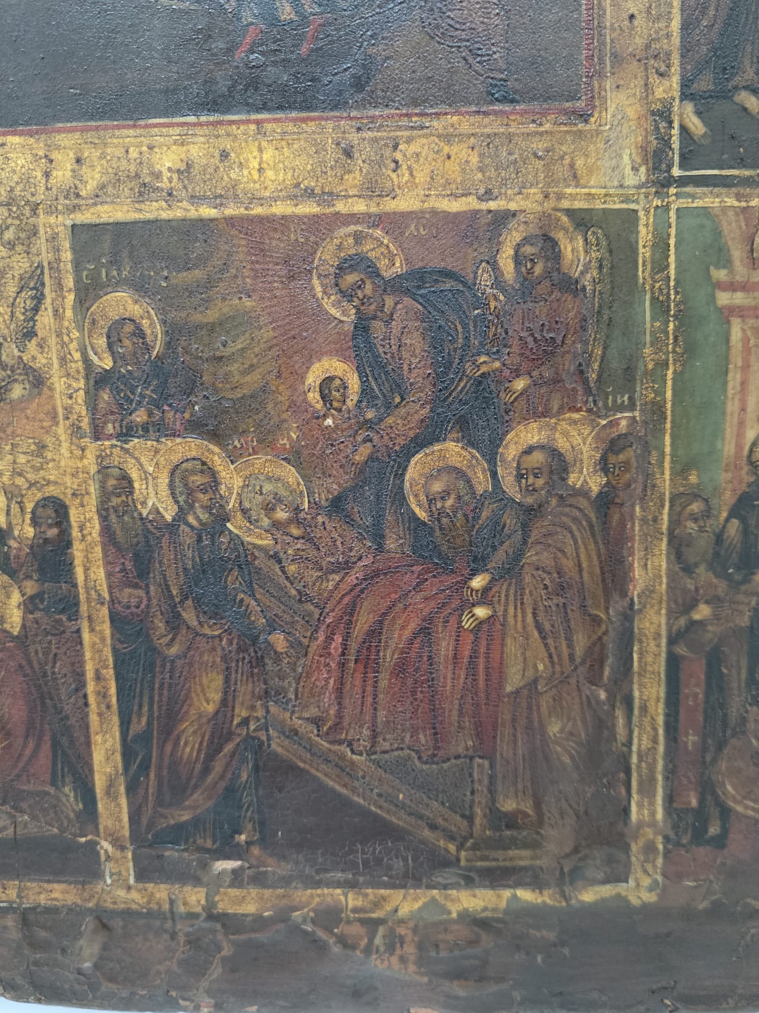 REF: AJ-142 : Magnífico icono religioso pintado sobre tabla, estructurado en compartimentos narrativos que representan distintas escenas de la vida de la Virgen María y de Cristo, siguiendo la tradición iconográfica oriental y bizantina.