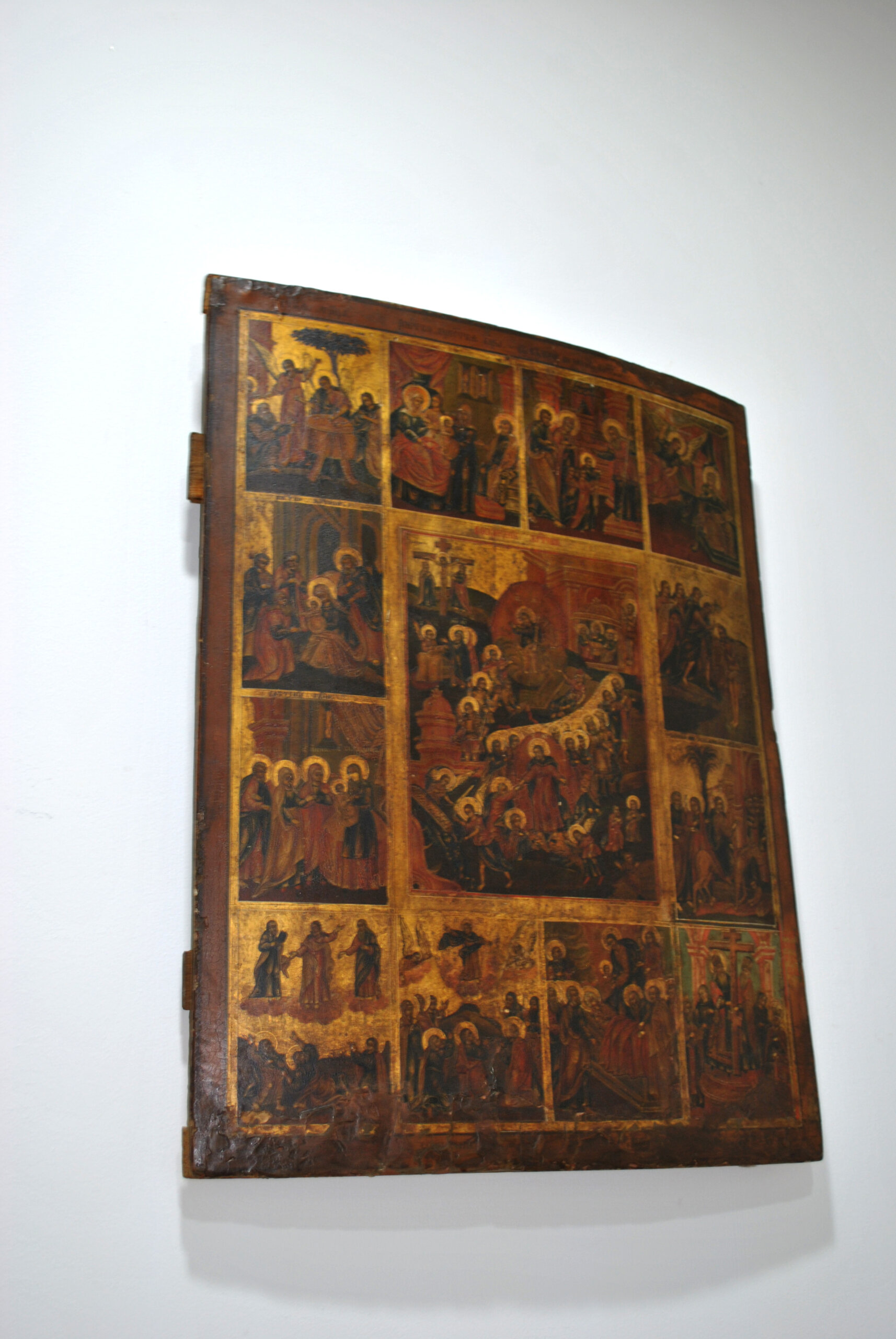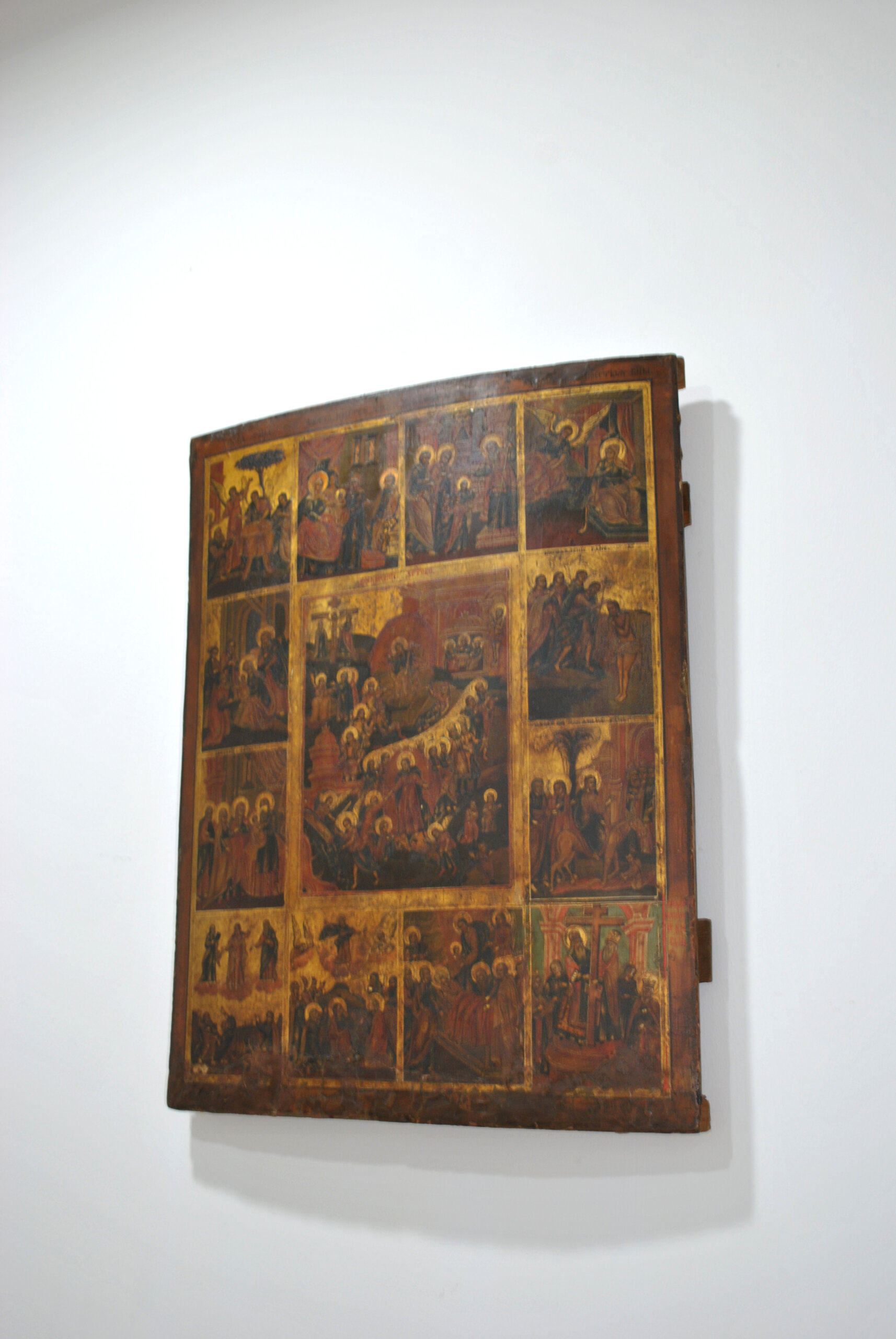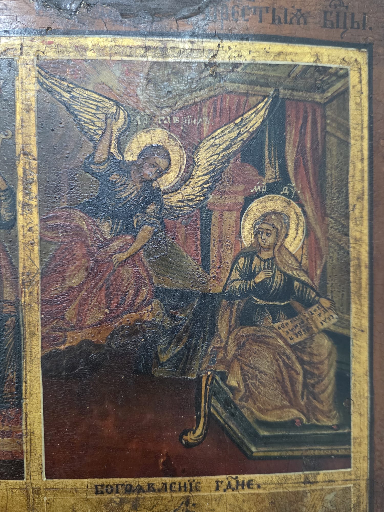 REF: AJ-142 : Magnífico icono religioso pintado sobre tabla, estructurado en compartimentos narrativos que representan distintas escenas de la vida de la Virgen María y de Cristo, siguiendo la tradición iconográfica oriental y bizantina.