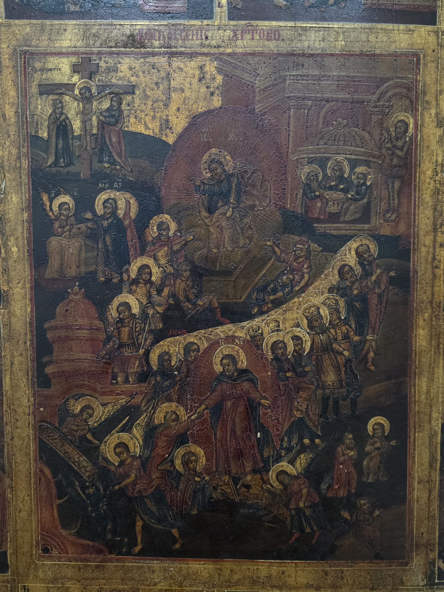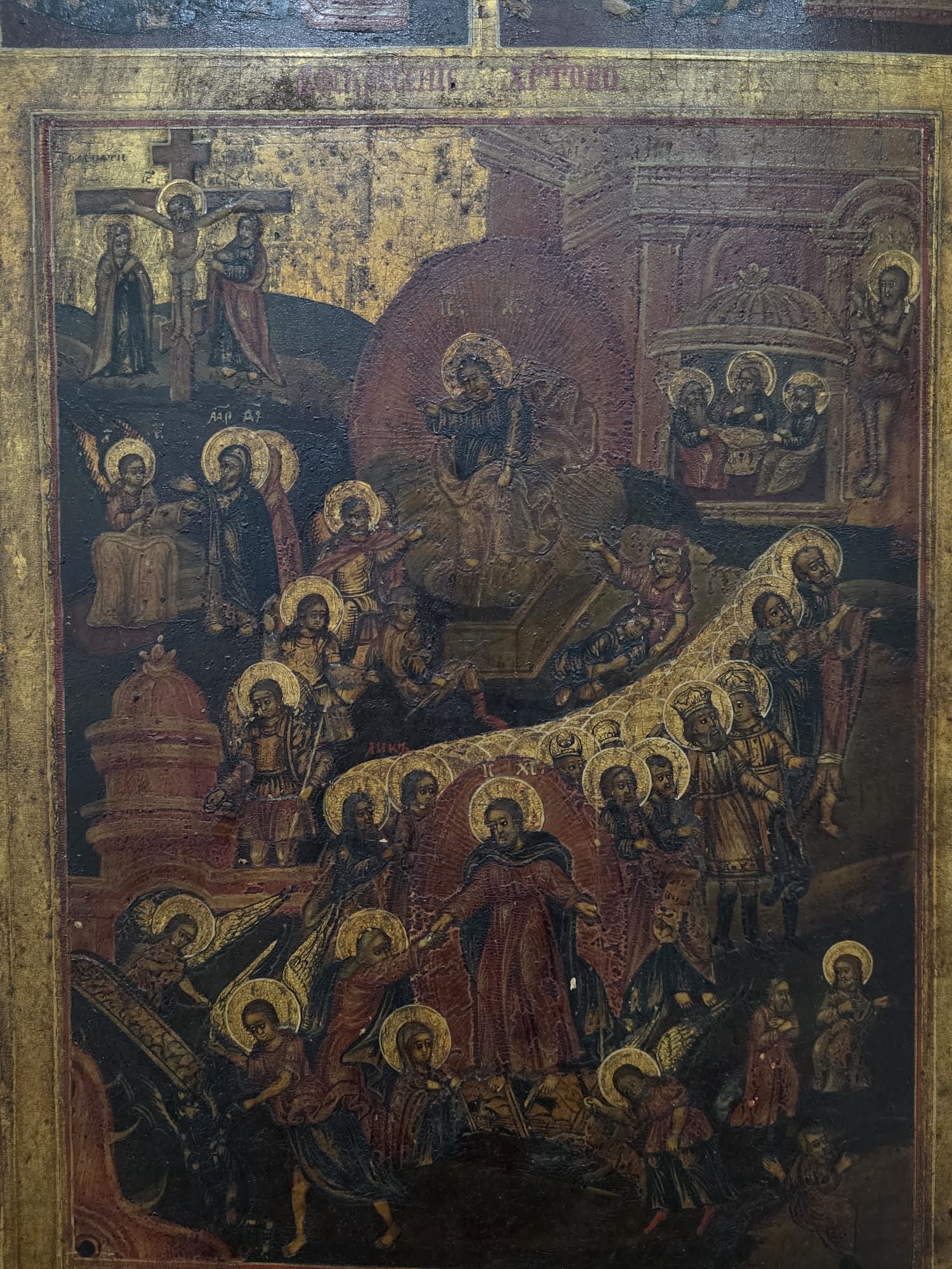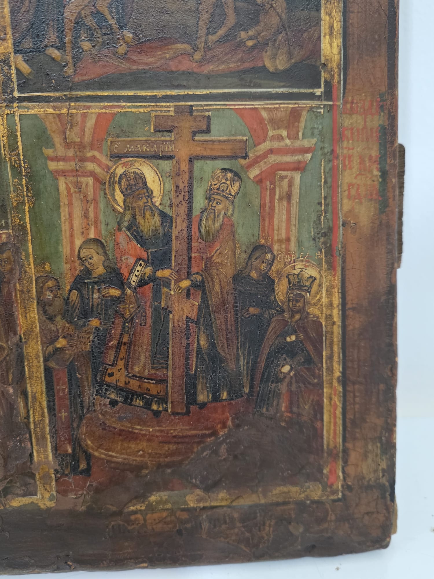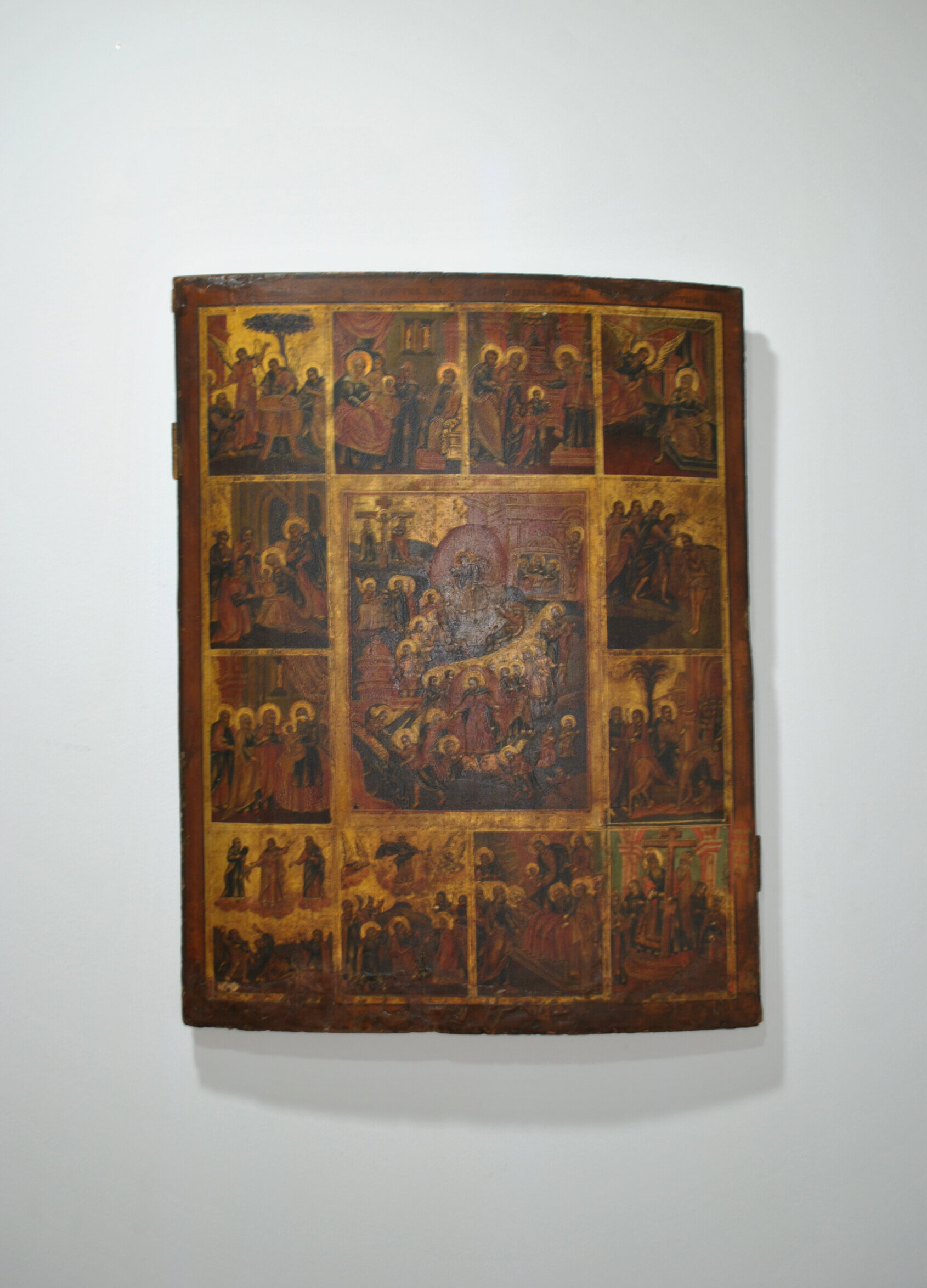 REF: AJ-142 : Magnífico icono religioso pintado sobre tabla, estructurado en compartimentos narrativos que representan distintas escenas de la vida de la Virgen María y de Cristo, siguiendo la tradición iconográfica oriental y bizantina.