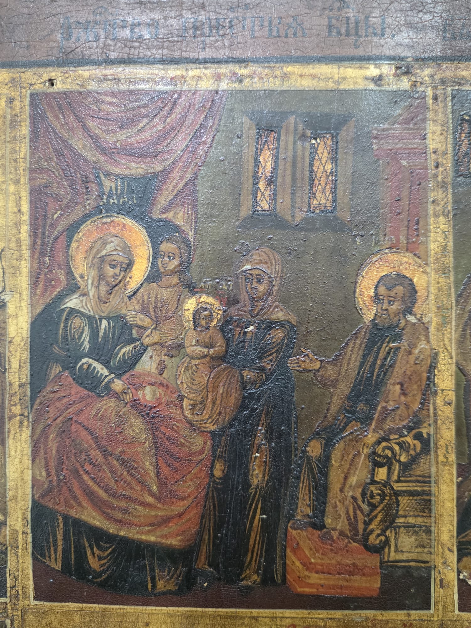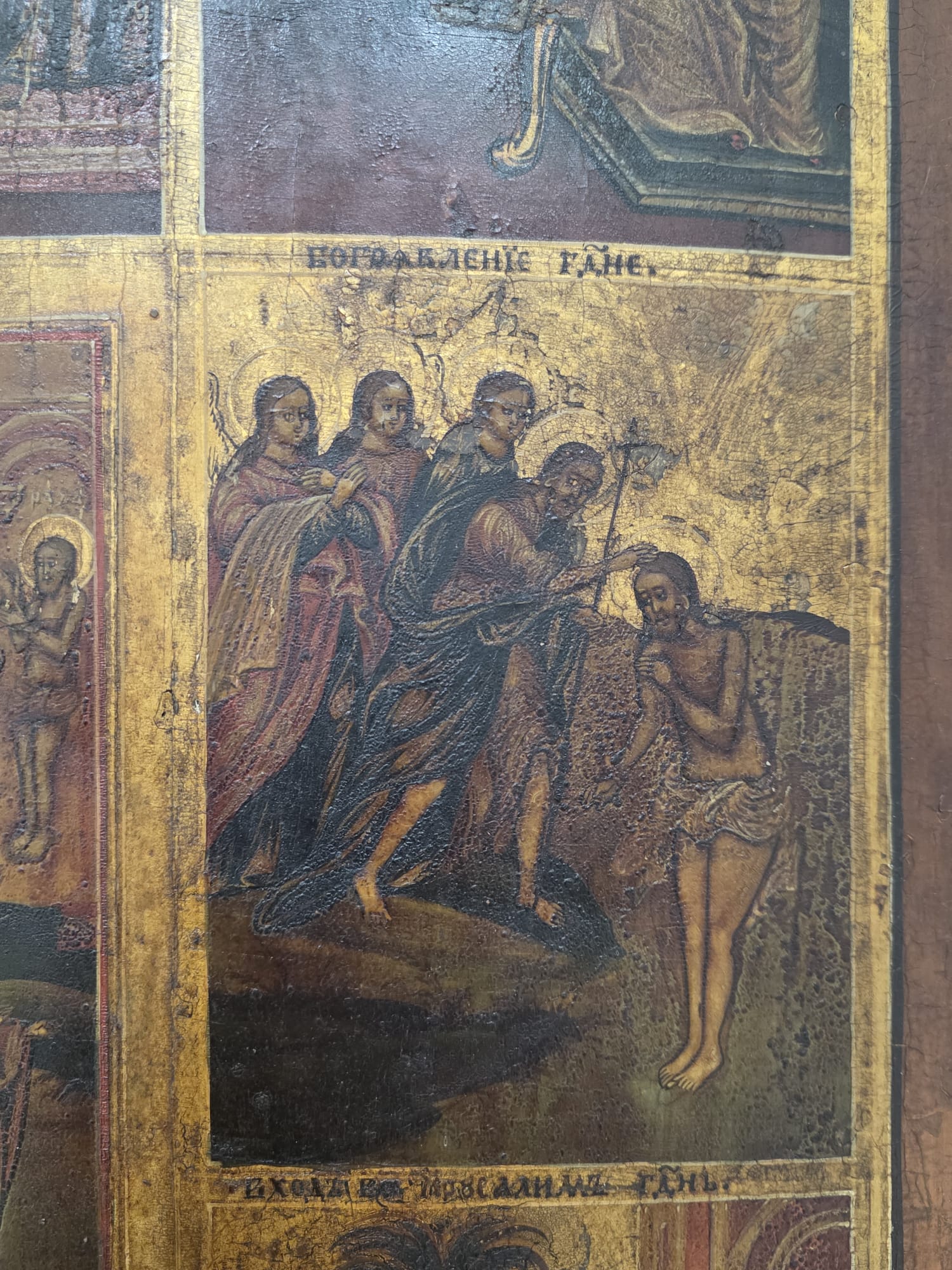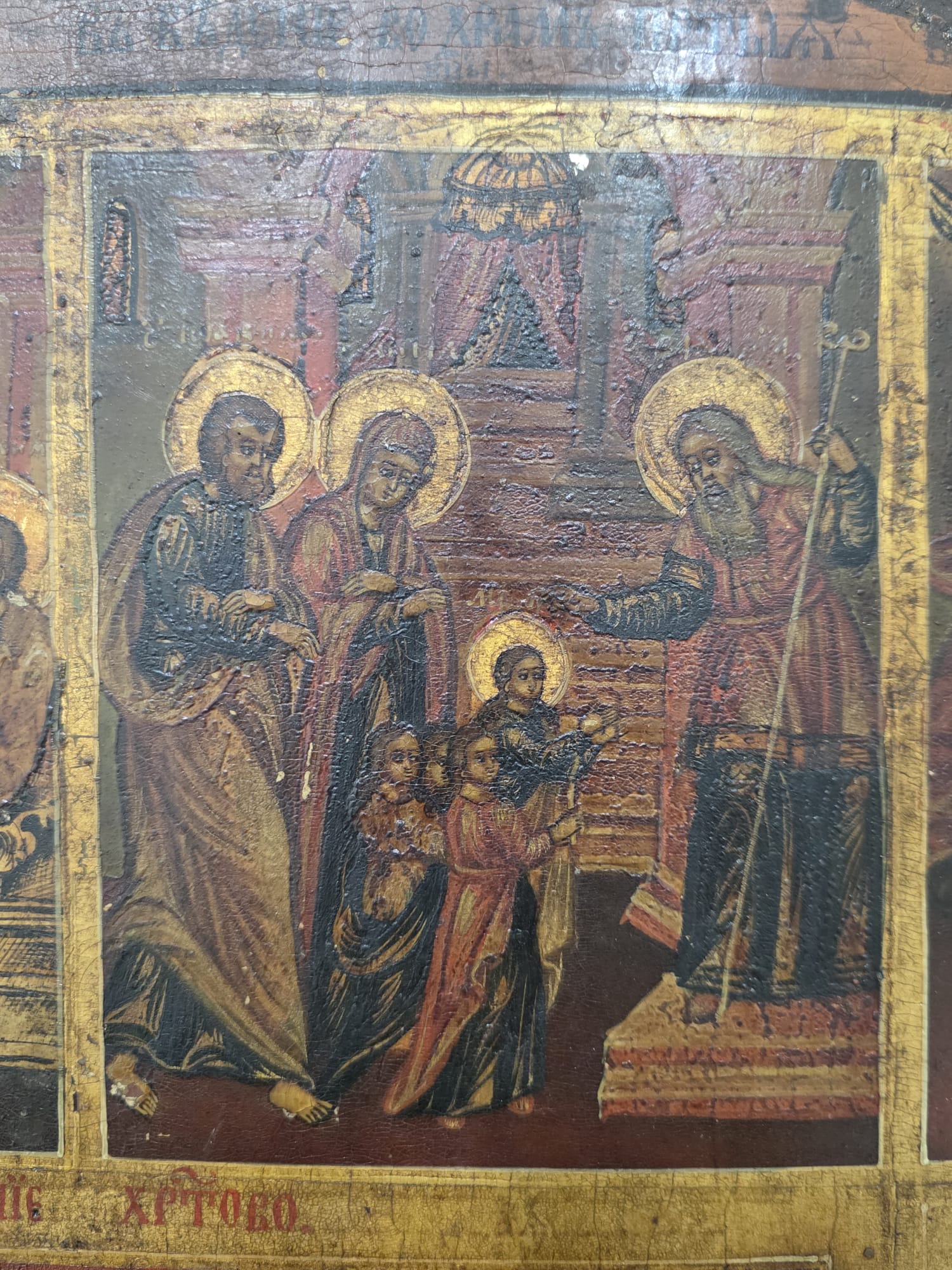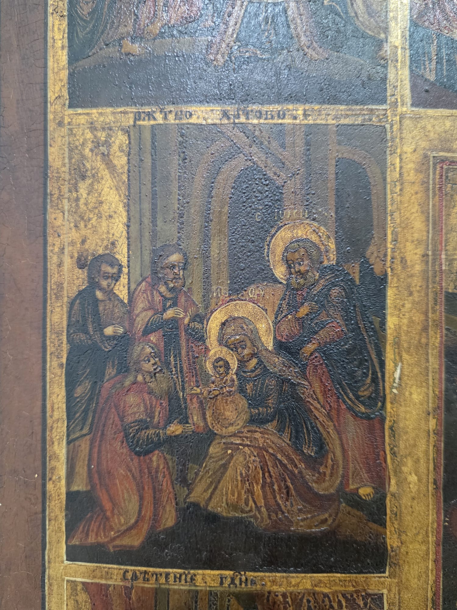 REF: AJ-142: Magnífico icono religioso pintado sobre tabla Siglo XVIII, estructurado en compartimentos narrativos que representan distintas escenas de la vida de la Virgen María y de Cristo, siguiendo la tradición iconográfica oriental y bizantina.