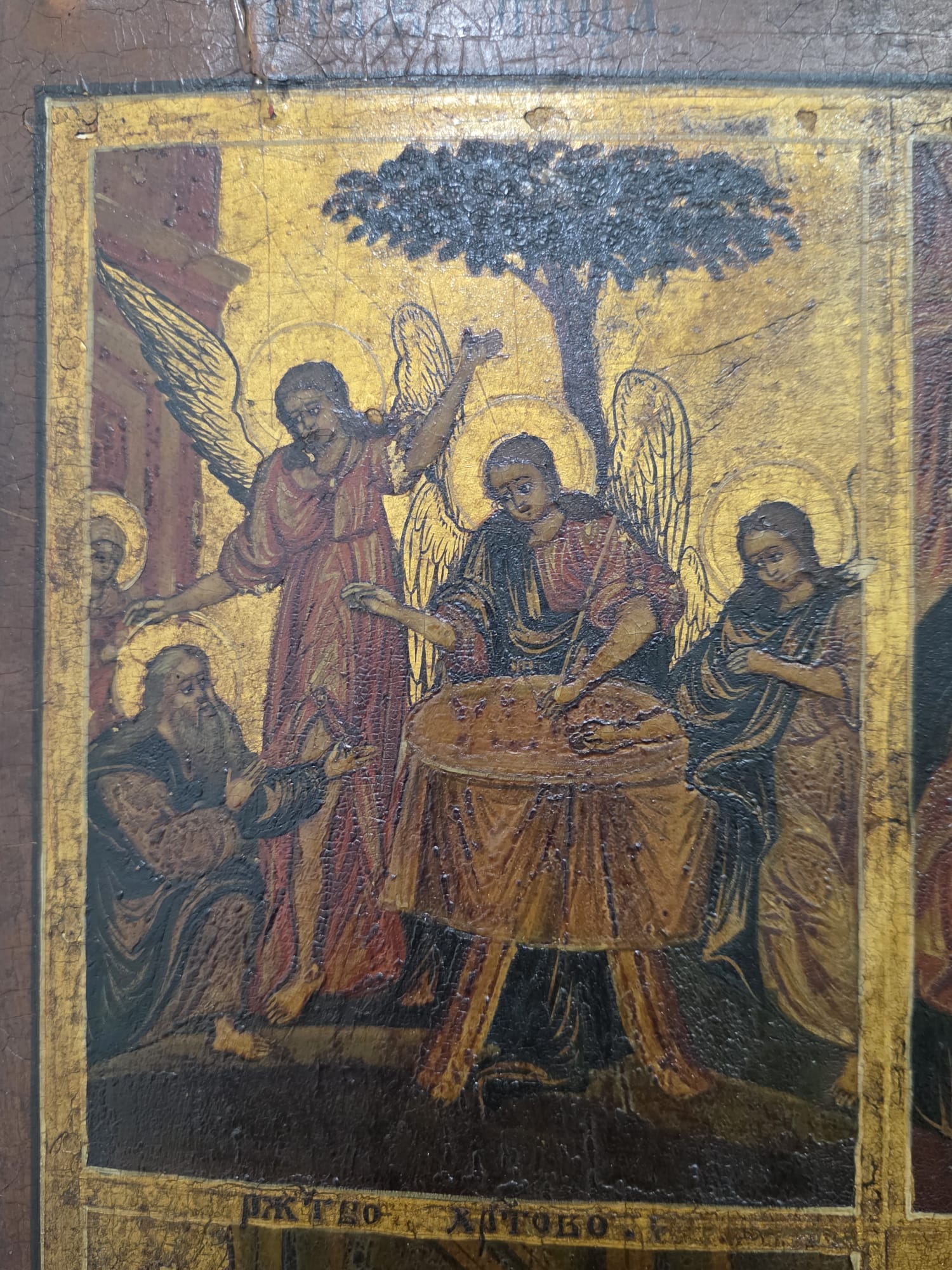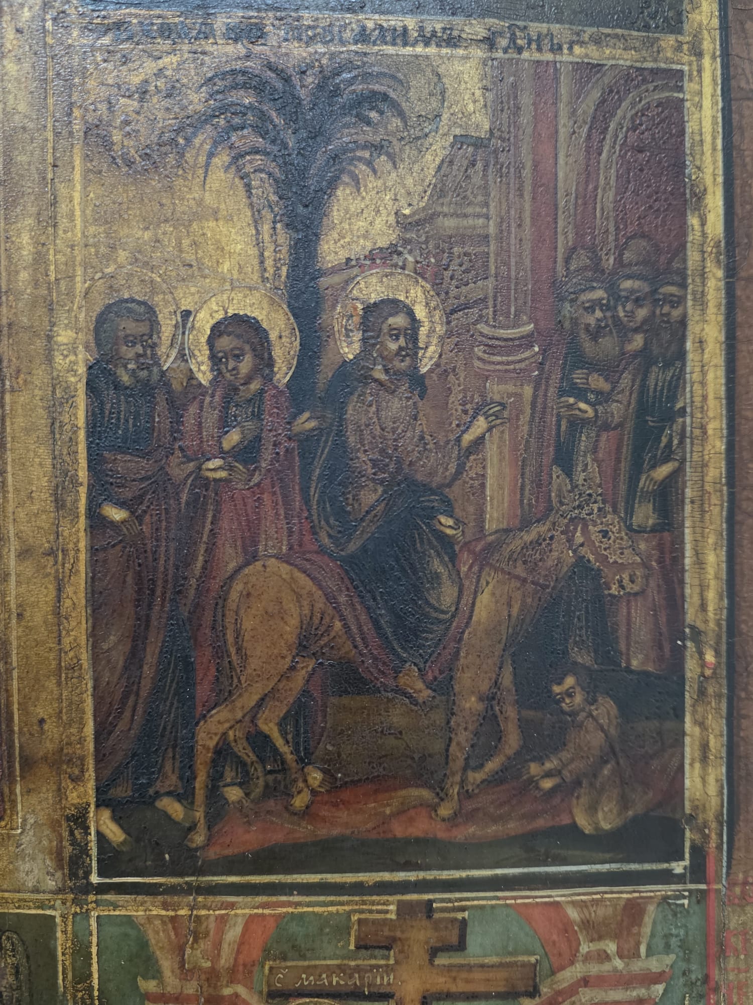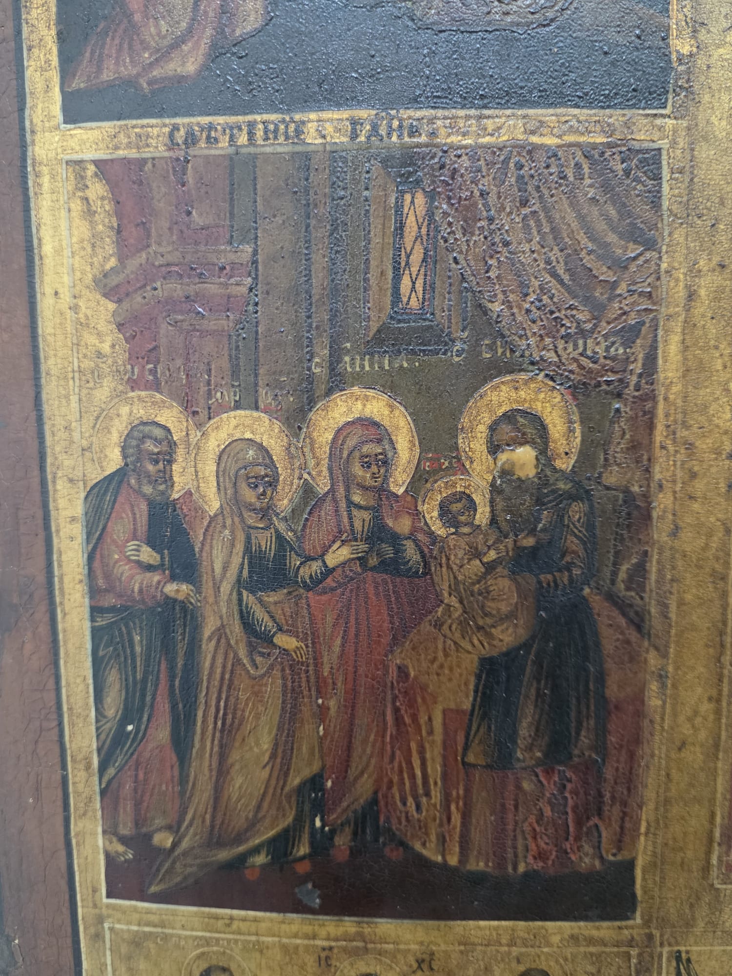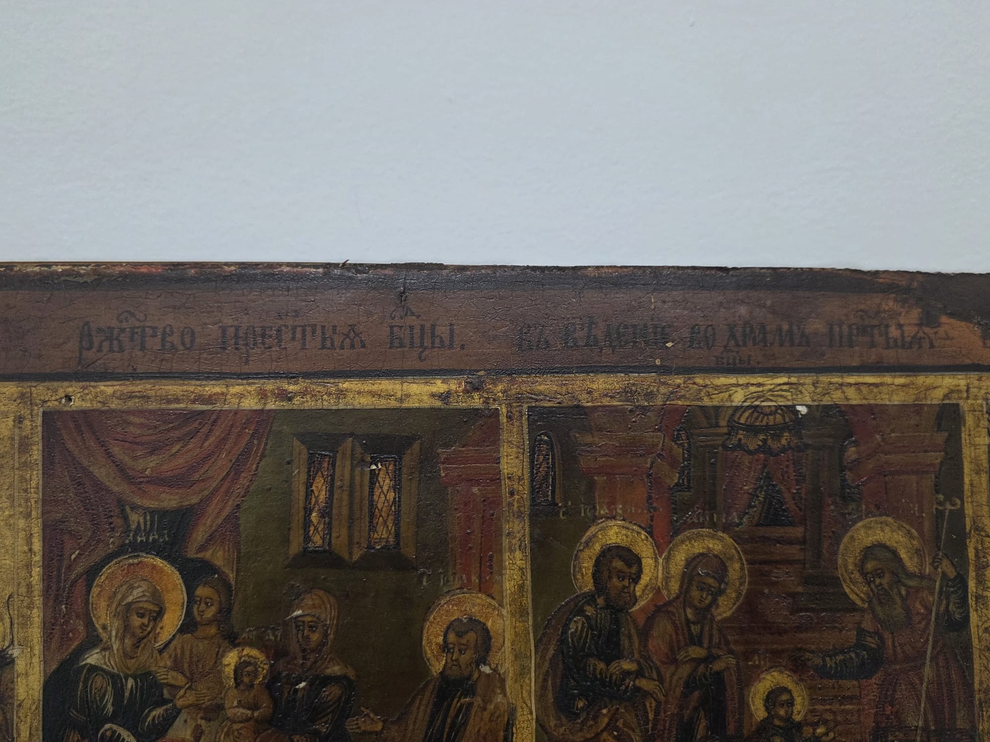 REF: AJ-142: Magnífico icono religioso pintado sobre tabla Siglo XVIII, estructurado en compartimentos narrativos que representan distintas escenas de la vida de la Virgen María y de Cristo, siguiendo la tradición iconográfica oriental y bizantina.