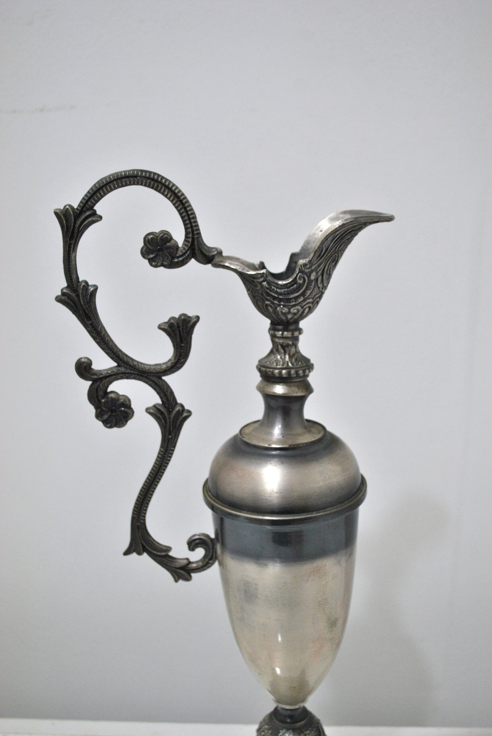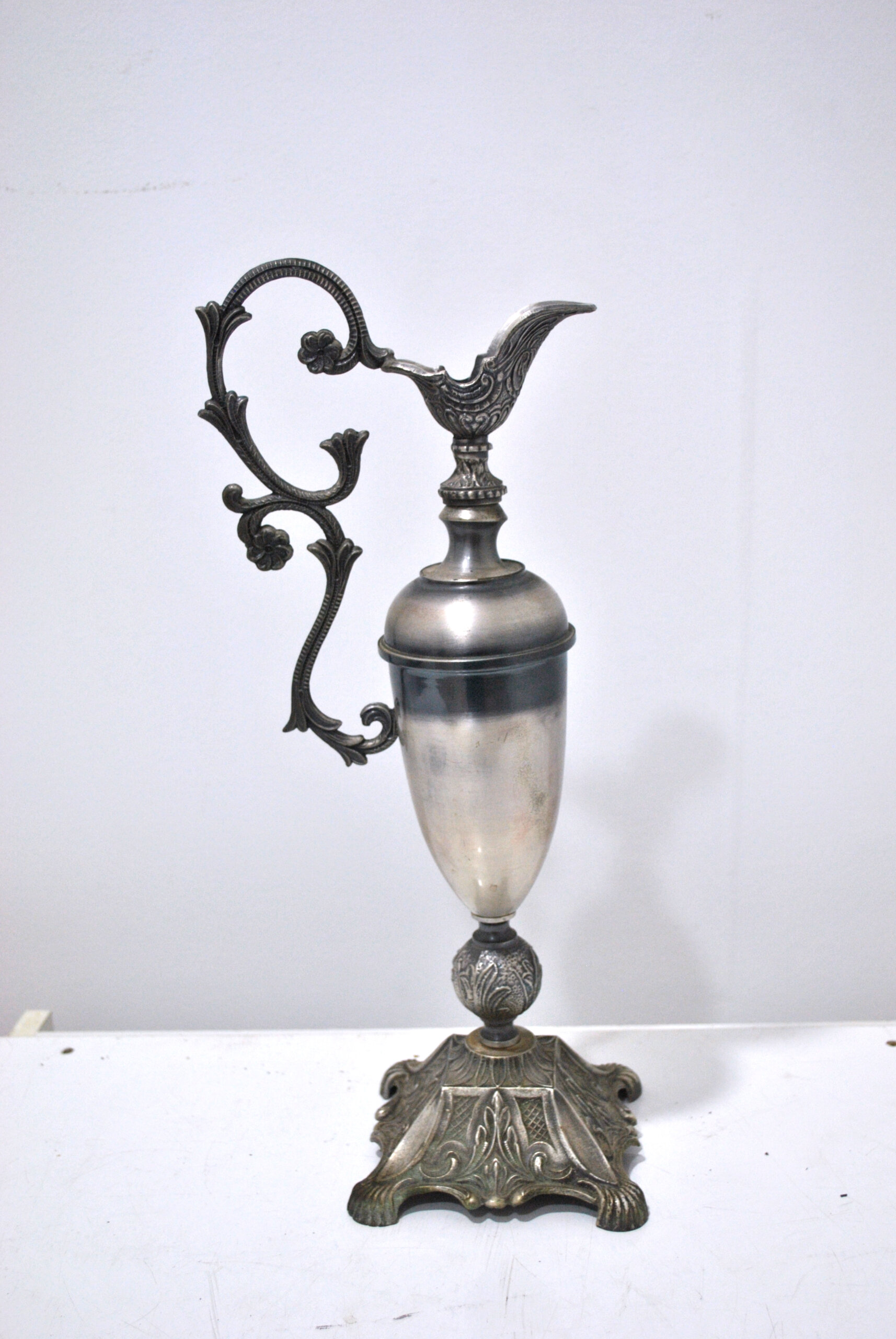 REF: 12356 – Elegante jarra antigua de metal con un diseño clásico y muy decorativo. Destaca su espectacular asa lateral con formas vegetales y su base trabajada con detalles ornamentales, que le aportan un aire sofisticado y de época.