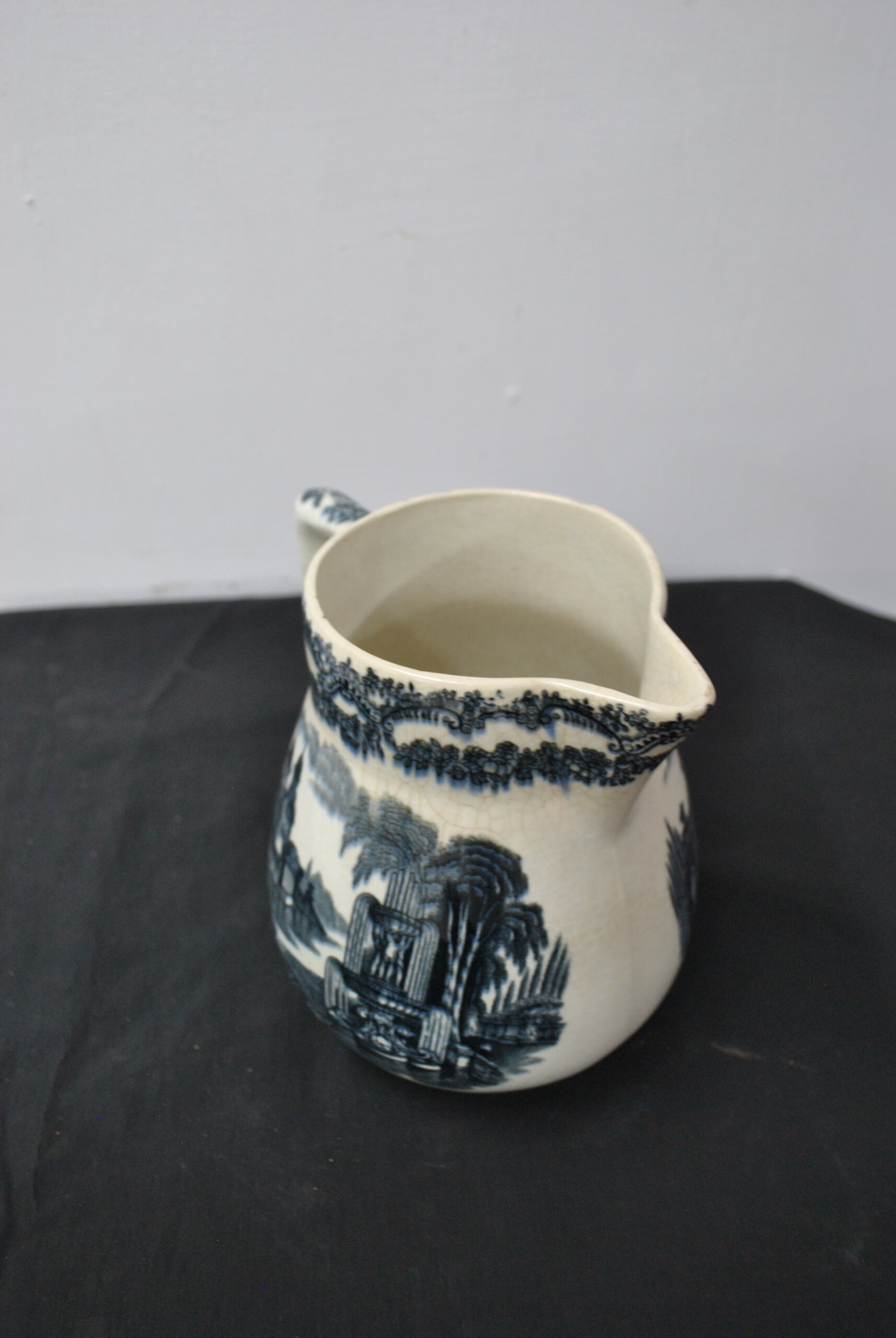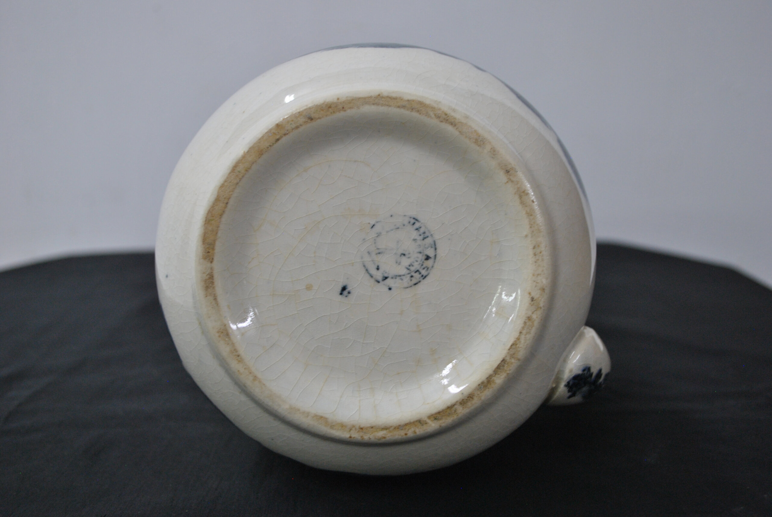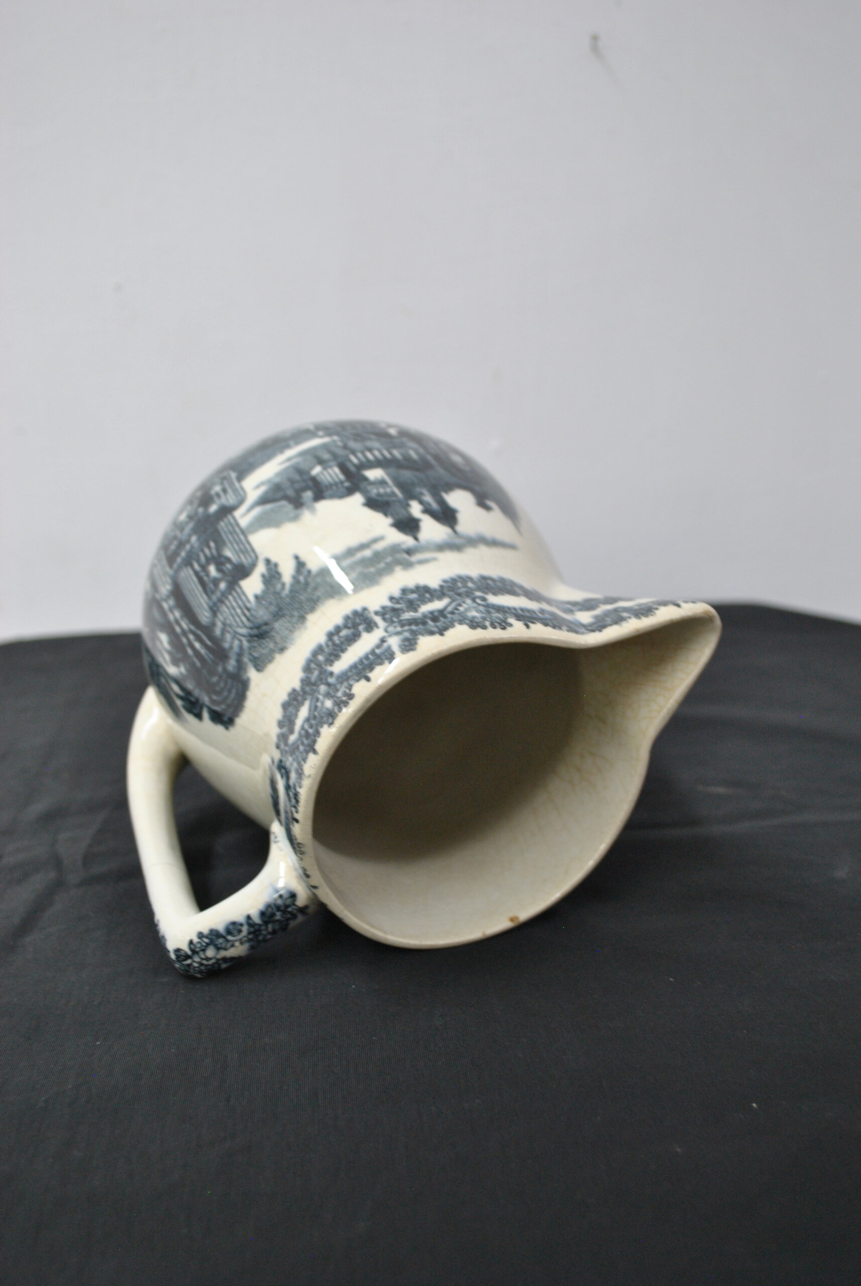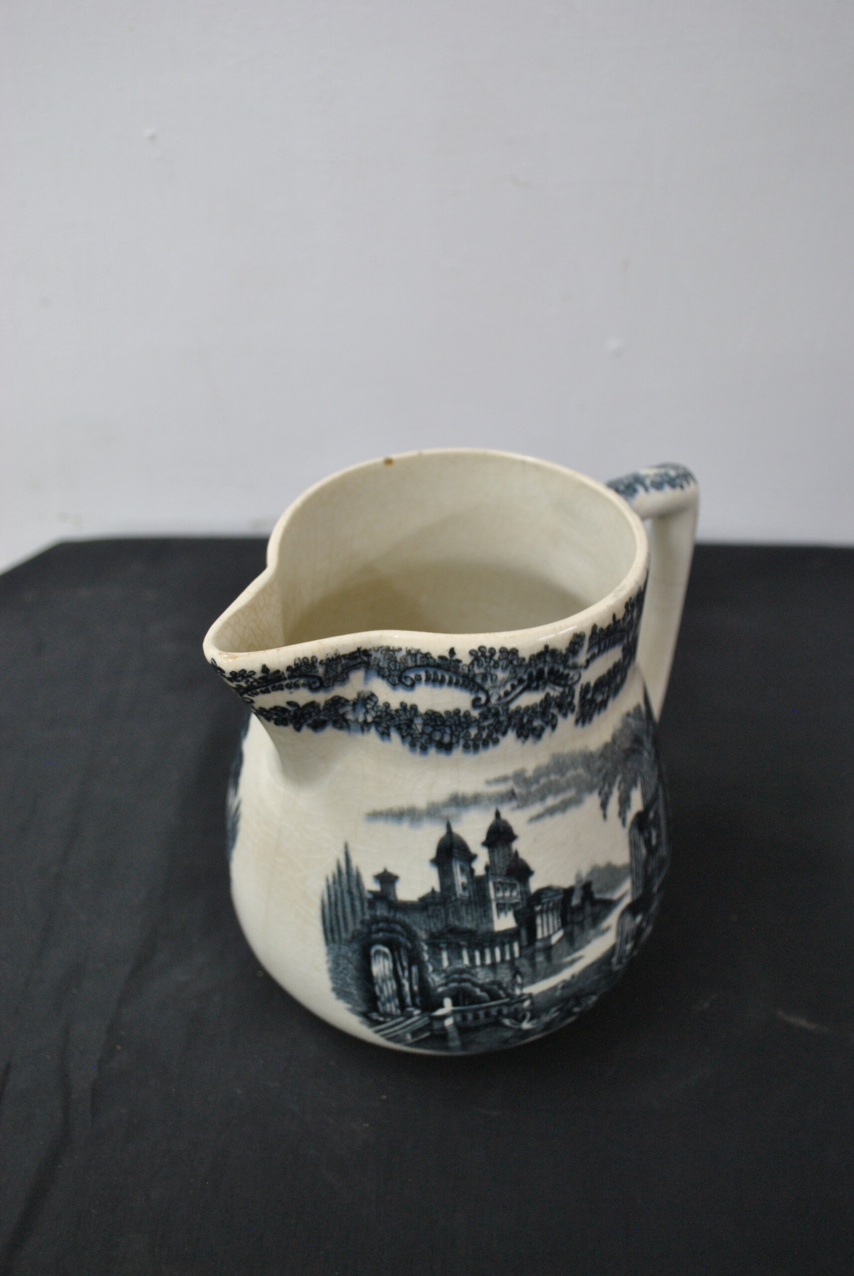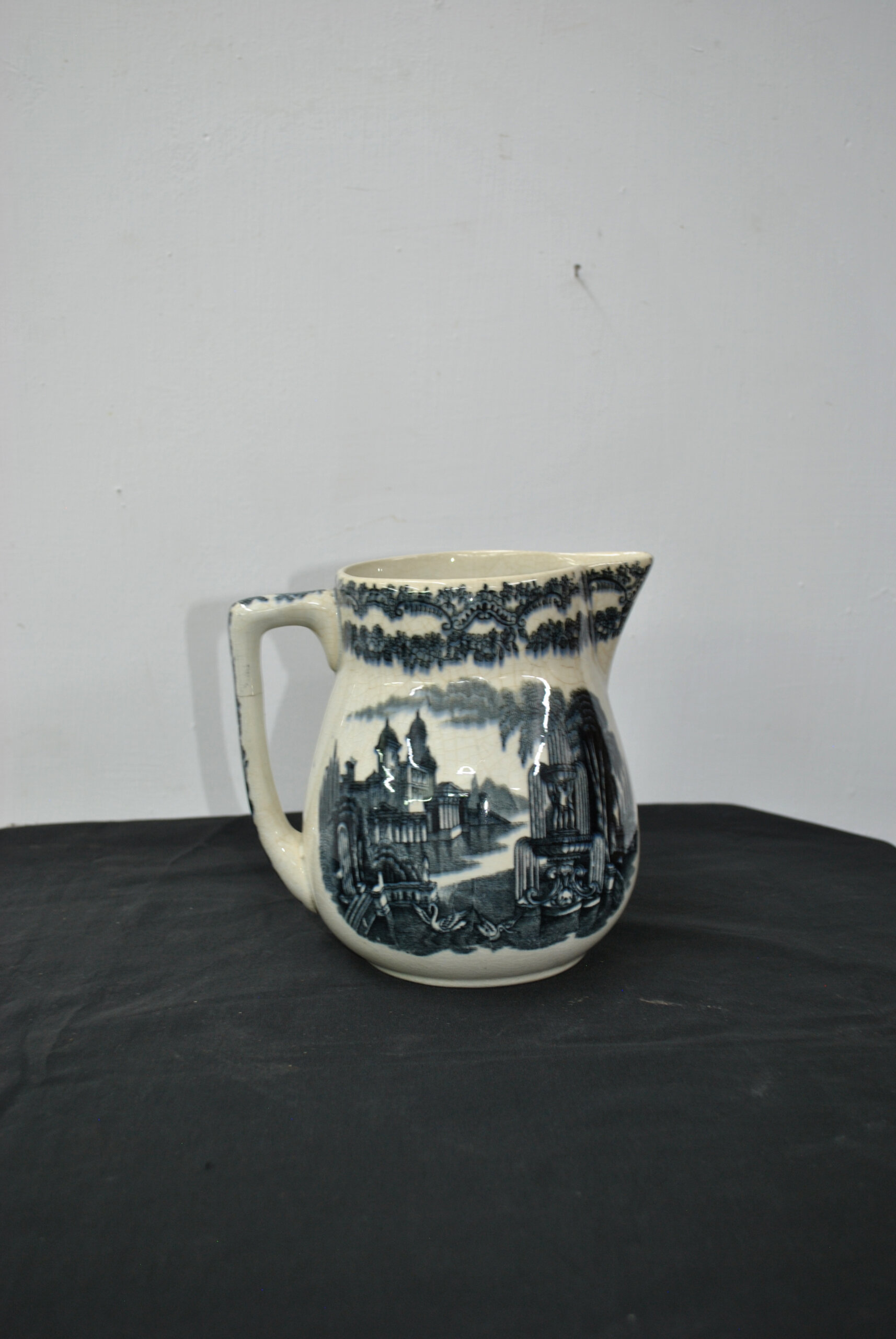 REF: 11910 – Bonita jarra o pequeña jofaina fabricada en loza por la prestigiosa casa Pickman La Cartuja de Sevilla. La jarra muestra una exquisita La jarra muestra una exquisita escena arquitectónica romántica, con un majestuoso edificio de estilo neoclásico, jardines, fuentes ornamentales y cisnes en un estanque. En la parte superior, una cenefa floral y geométrica recorre el borde, aportando elegancia y equilibrio visual al conjunto.