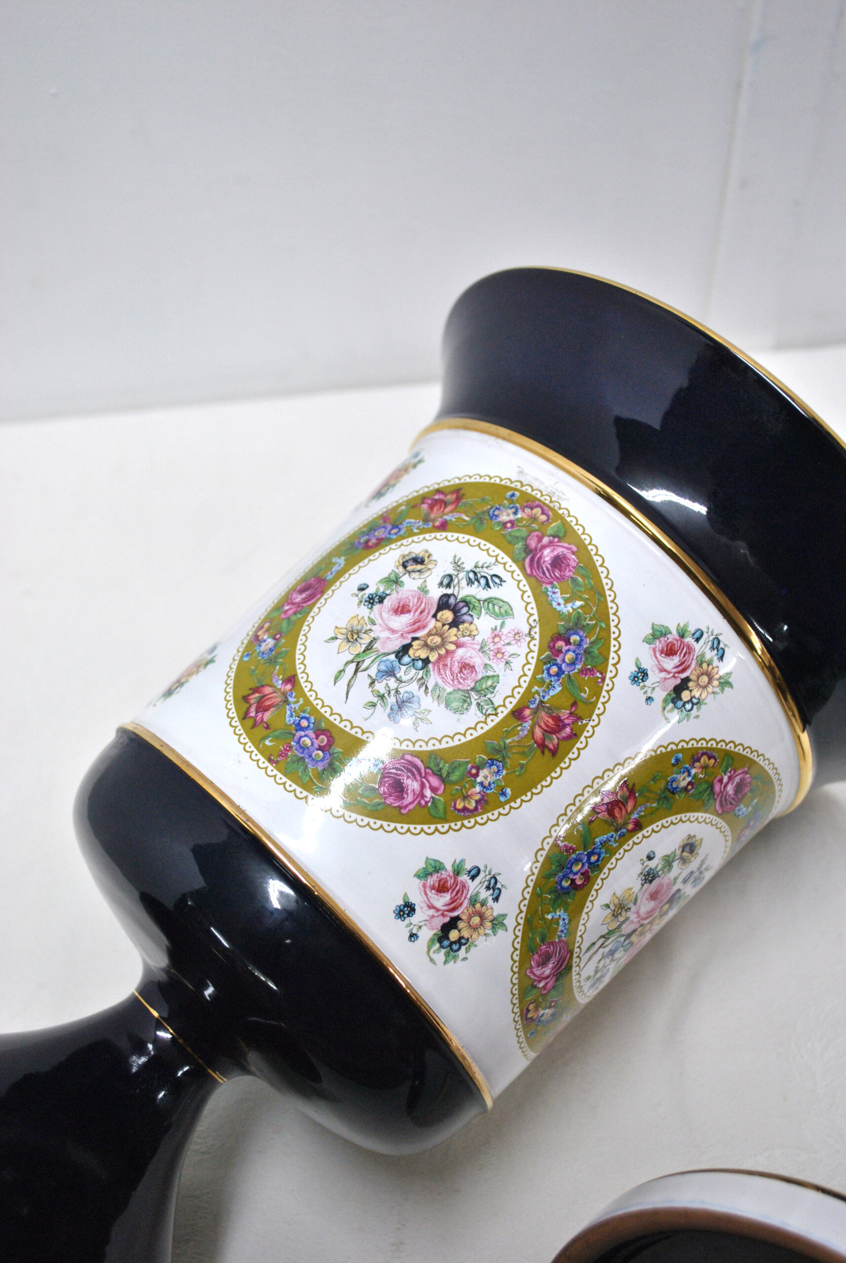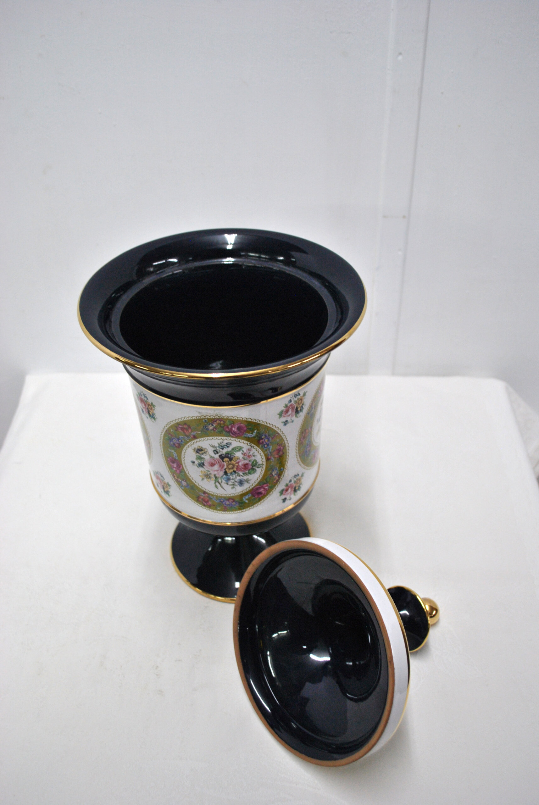 Fabricado en porcelana esmaltada, presenta una combinación muy sofisticada de fondo negro brillante con detalles en blanco y dorado, acompañados de medallones florales ricamente decorados en tonos vivos. La tapa coronada con remate dorado aporta un acabado clásico y distinguido.