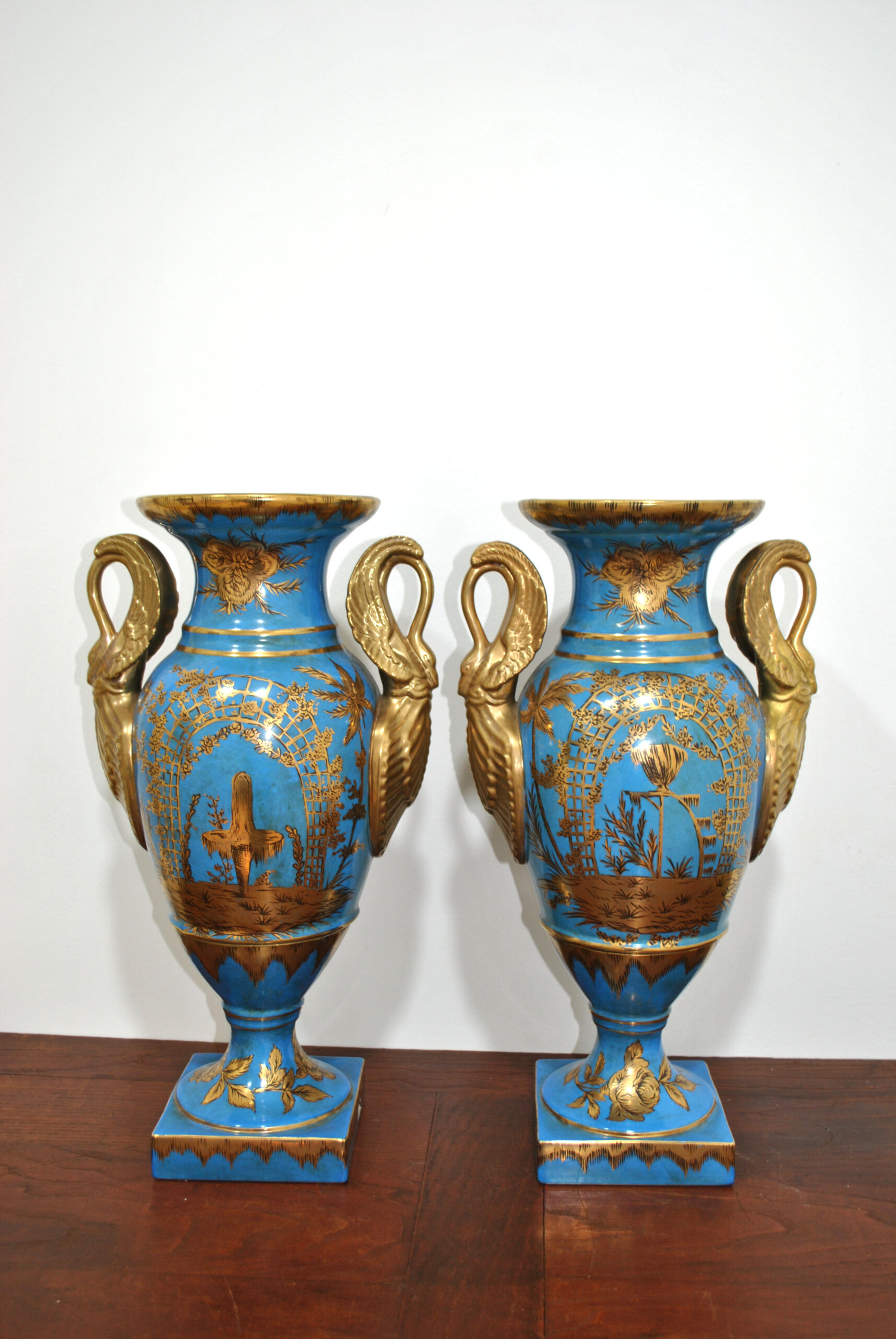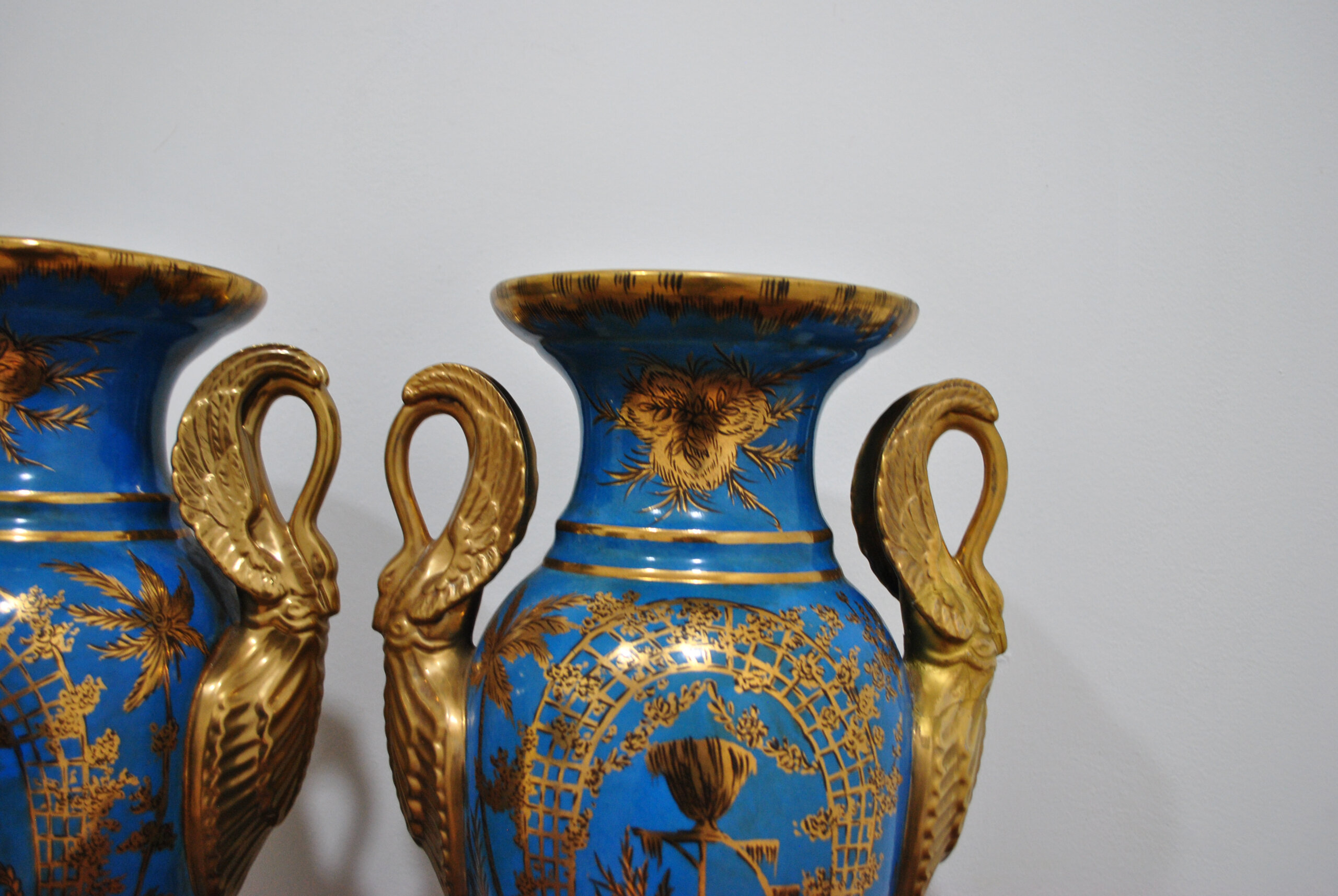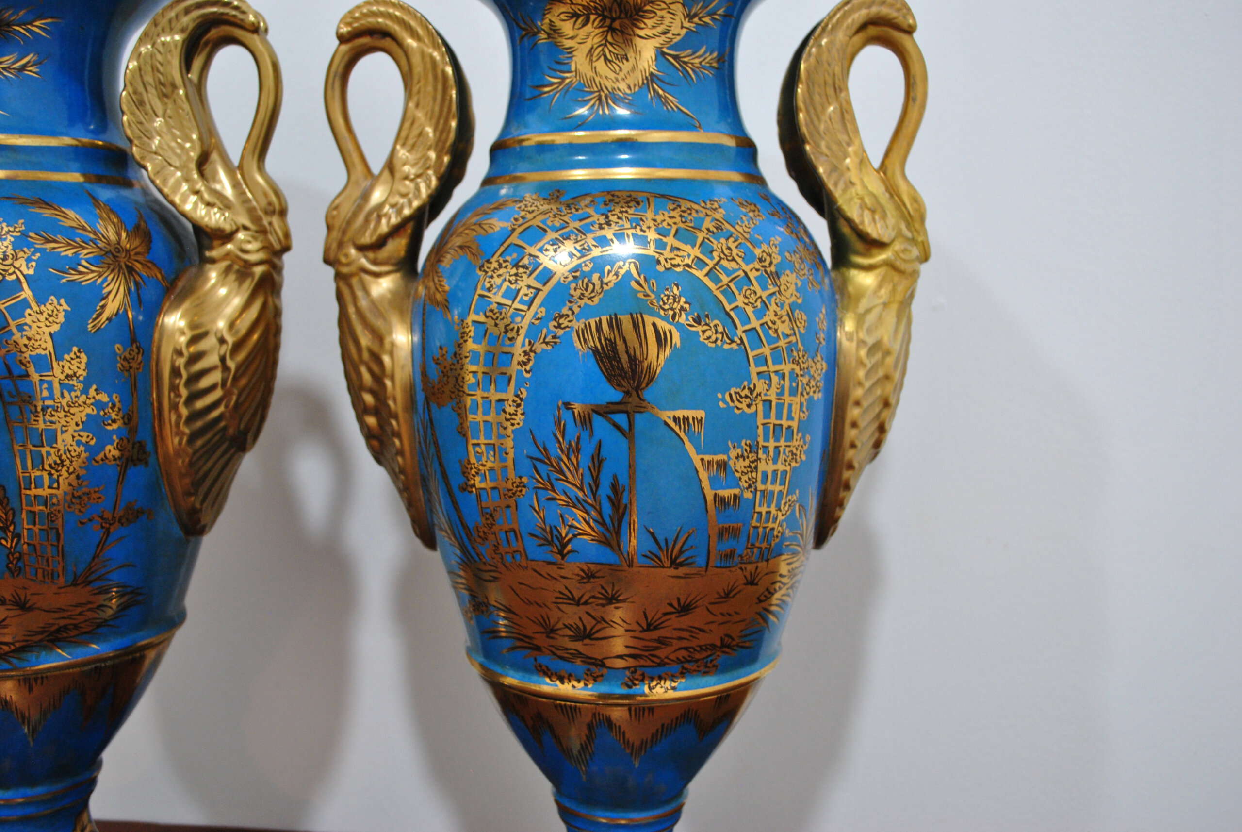 Cada pieza presenta cuerpo estilizado sobre peana cuadrada, cuello acampanado y espectaculares asas laterales en forma de cisne alado en relieve dorado, que aportan elegancia escultórica y gran presencia decorativa.