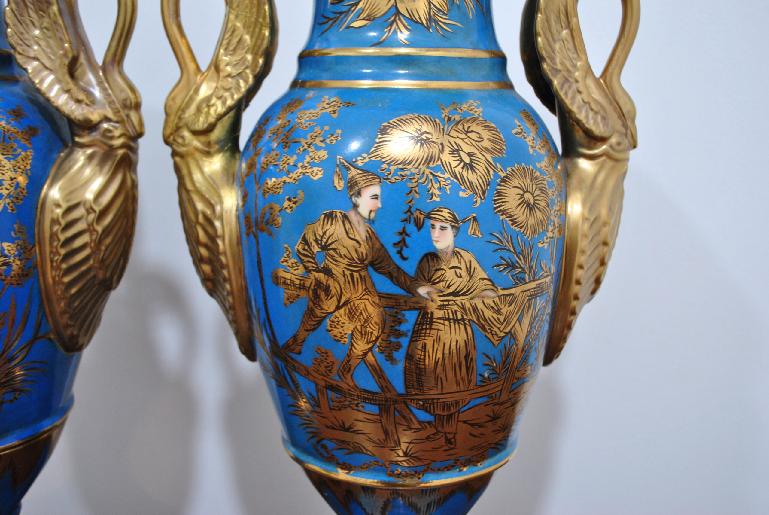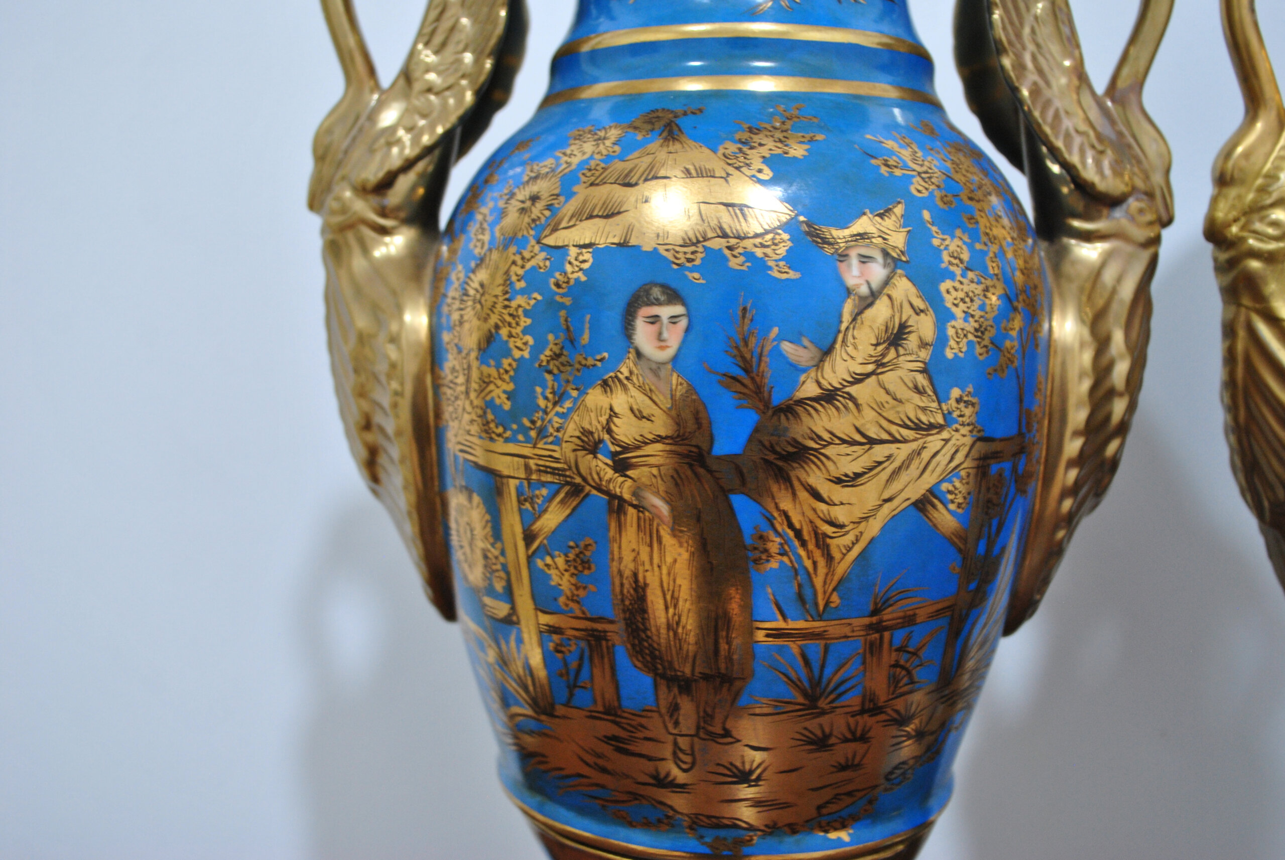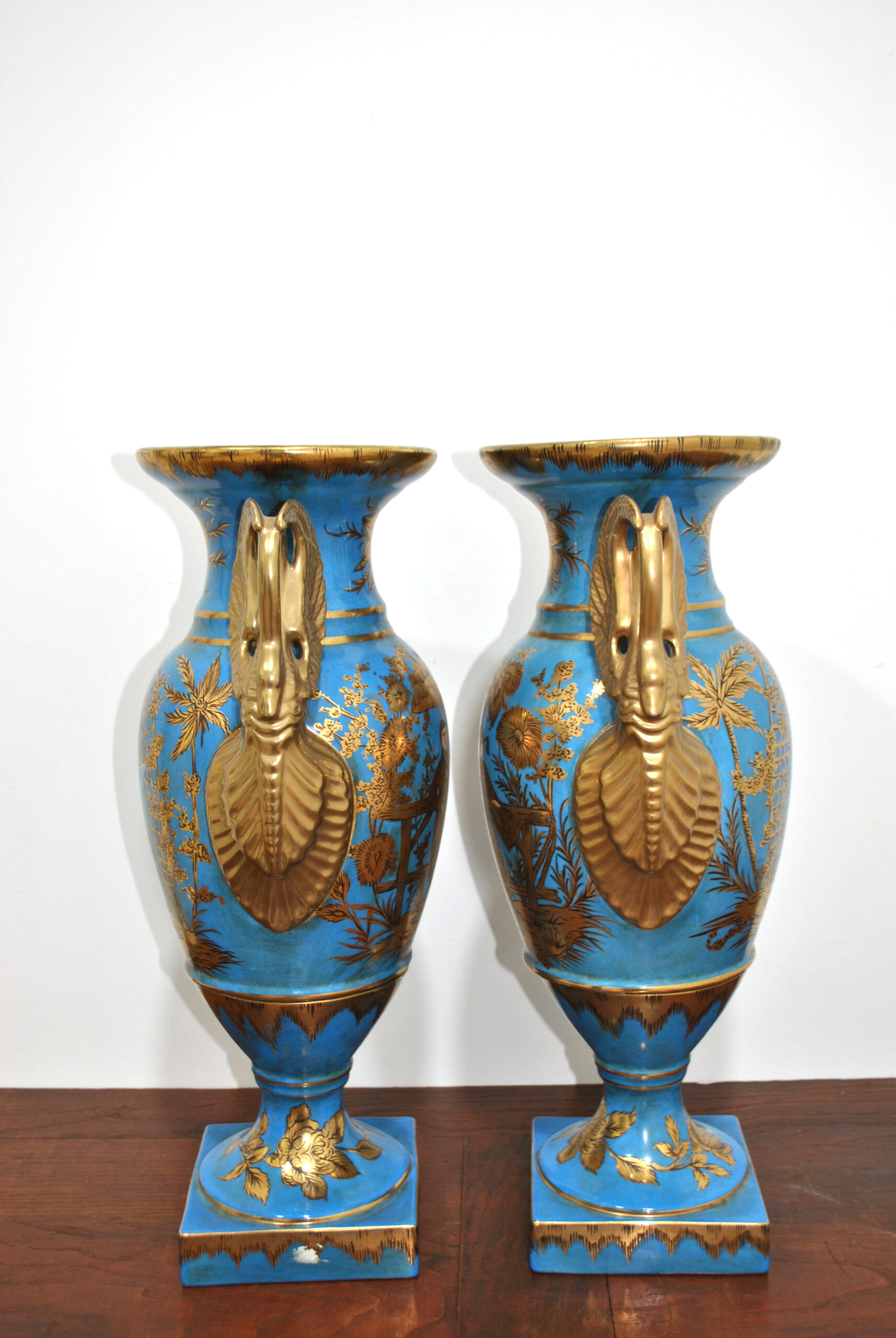 REF: 12240 – Impresionante pareja de jarrones antiguos realizados en porcelana esmaltada en intenso azul turquesa, ricamente decorados con escenas orientales en dorado fino.