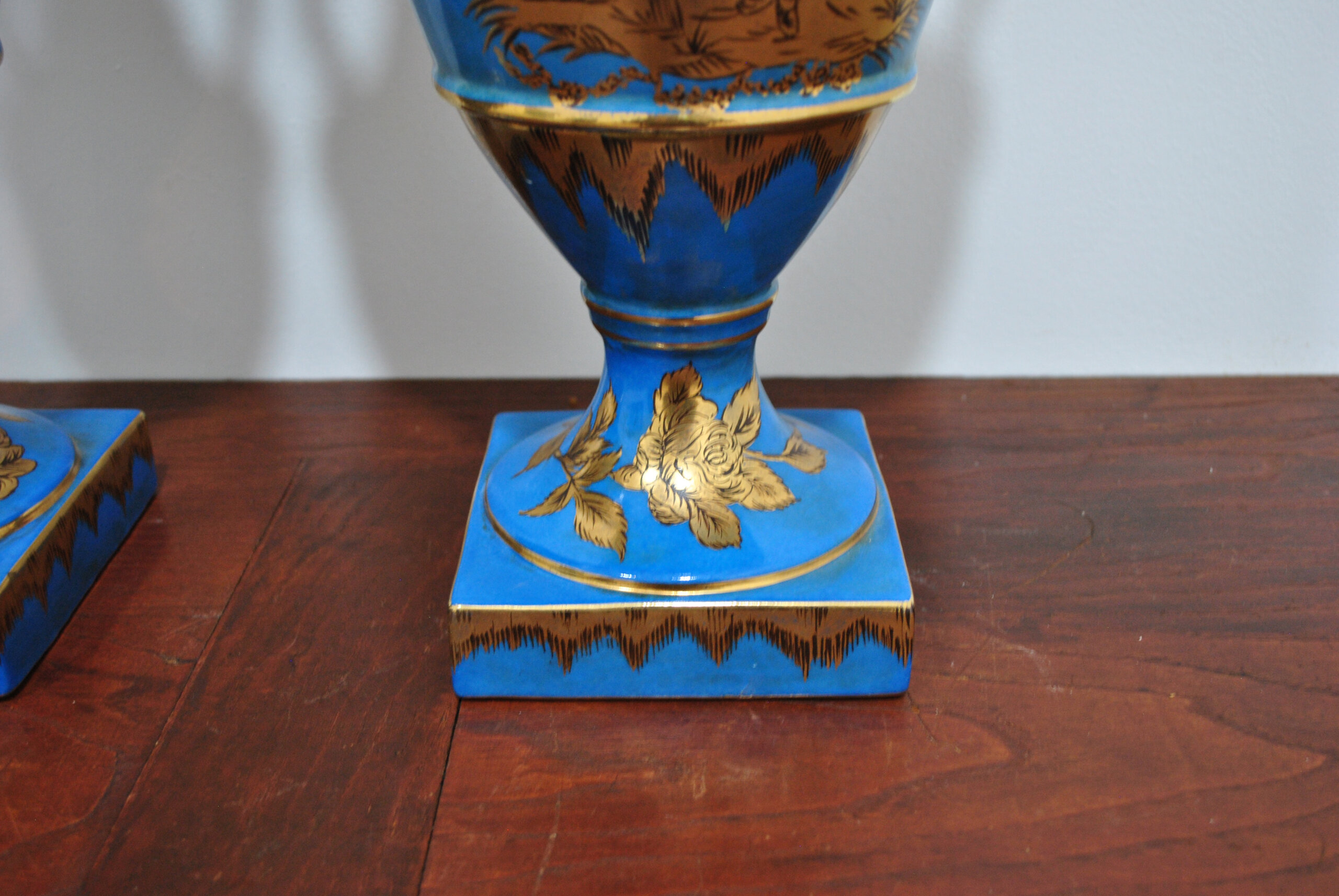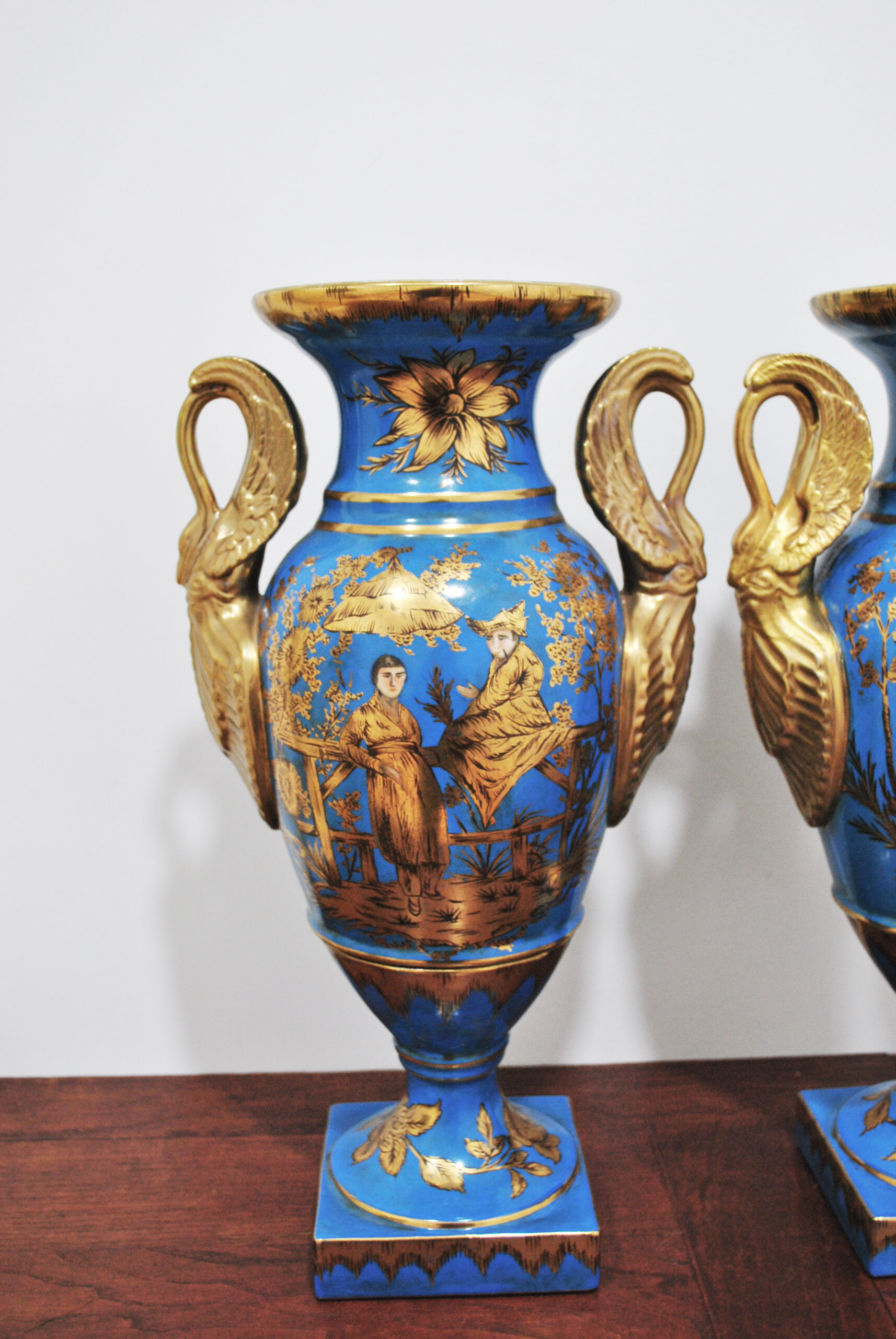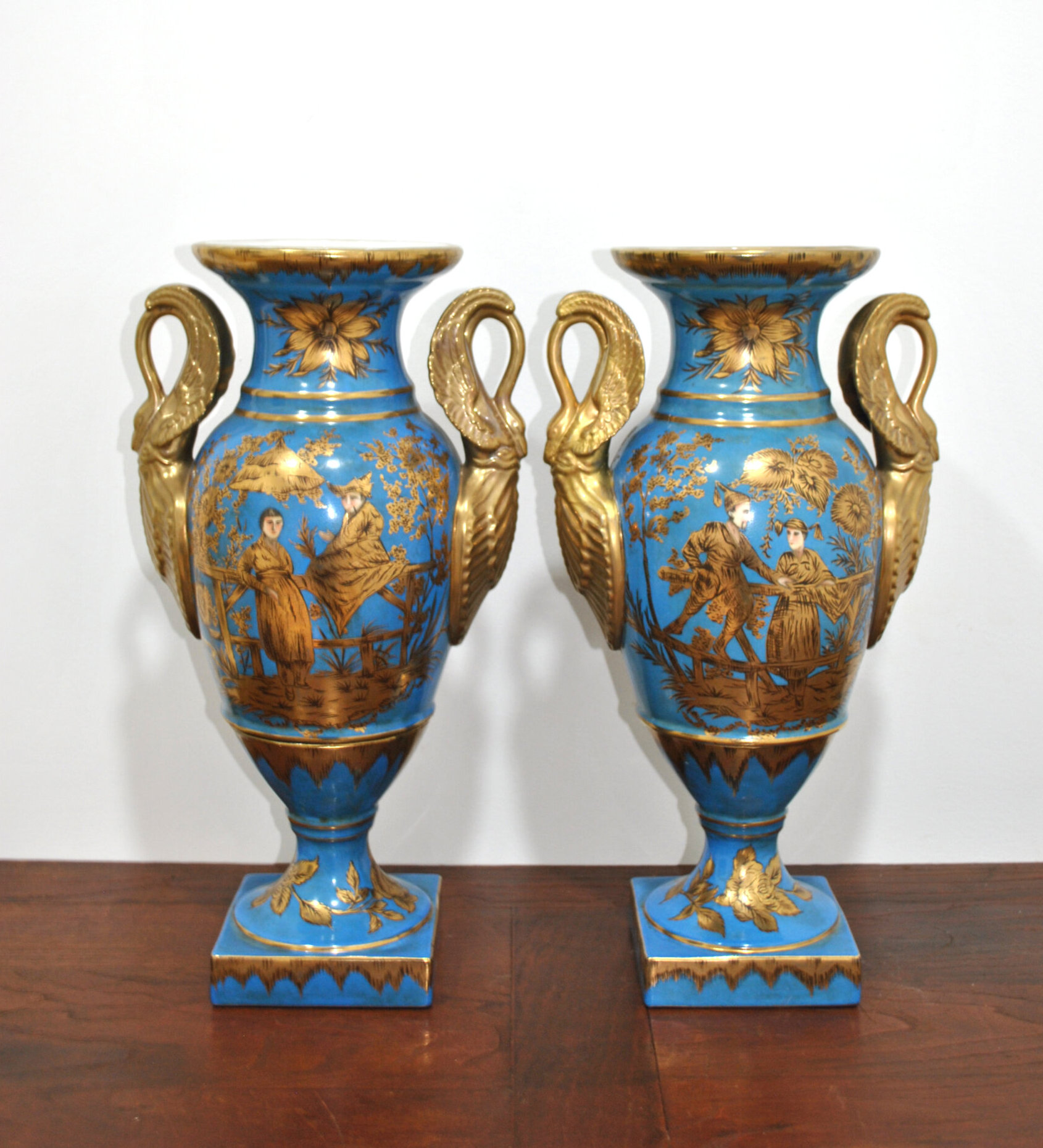 REF: 12240 – Impresionante pareja de jarrones antiguos realizados en porcelana esmaltada en intenso azul turquesa, ricamente decorados con escenas orientales en dorado fino.