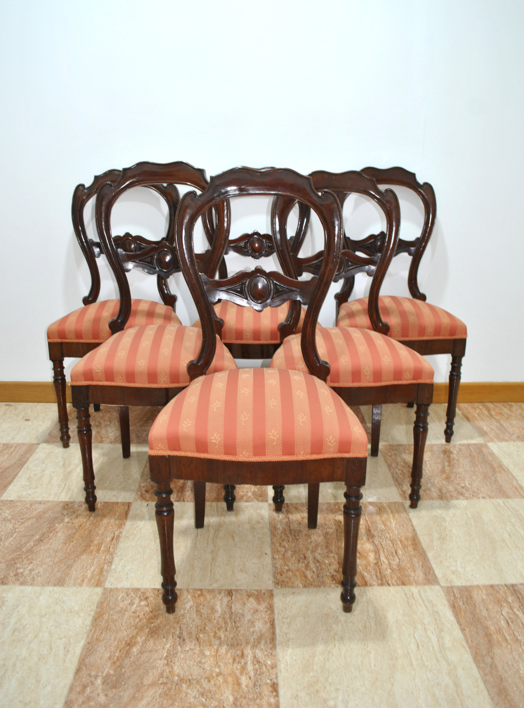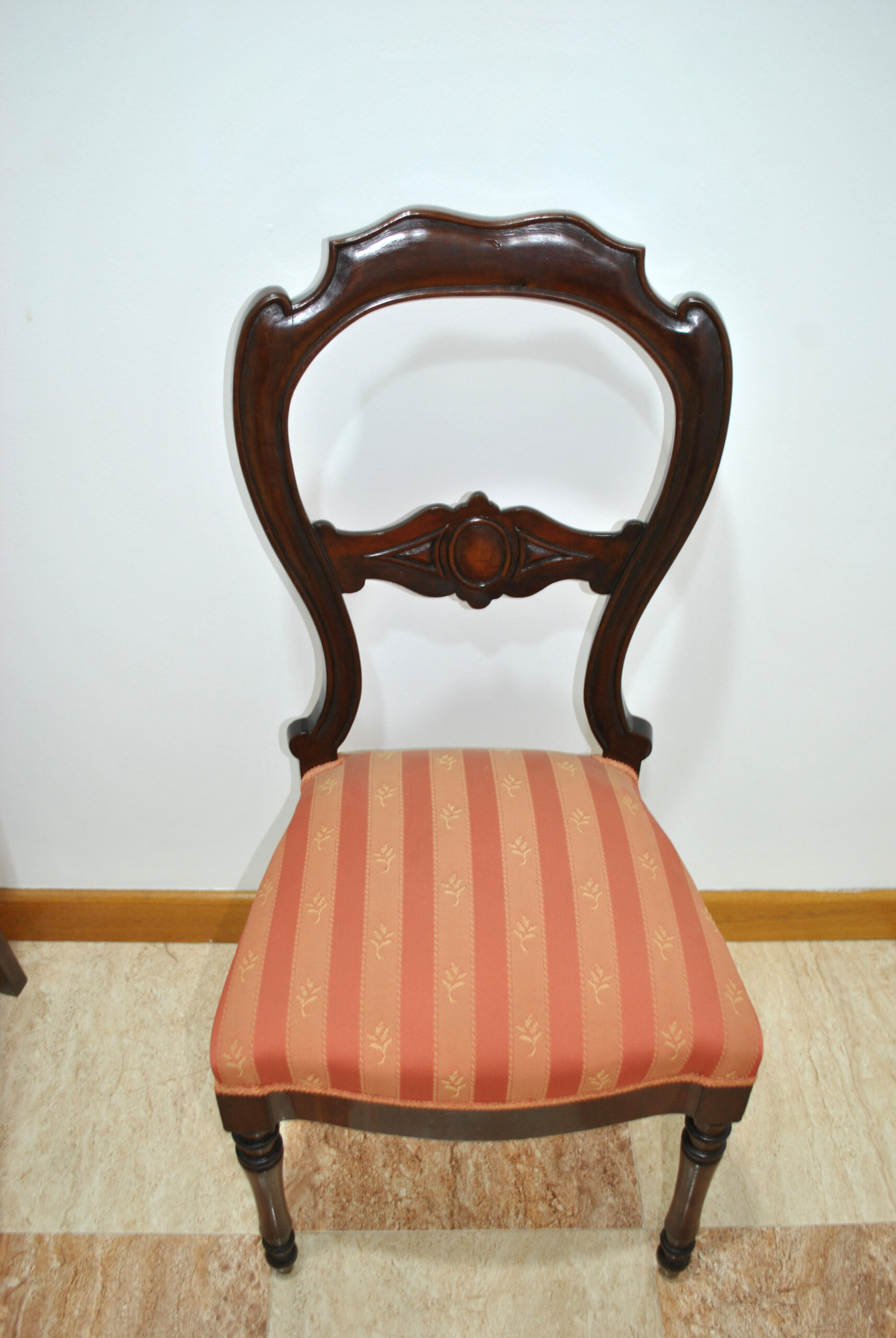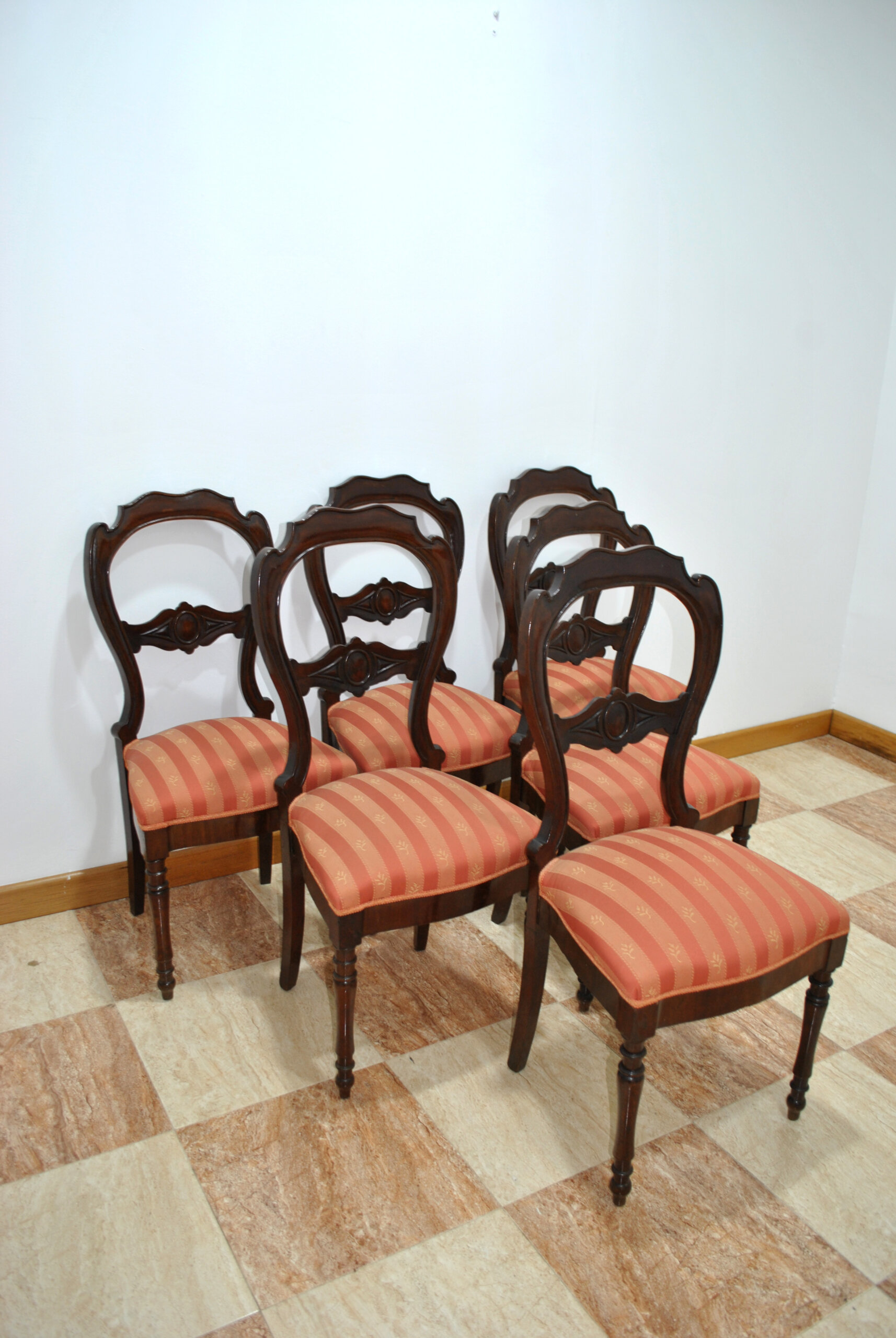 REF: 11857 – Magnífico conjunto de seis sillas de estilo clásico isabelino, realizadas en madera maciza en tono nogal oscuro, con estructura sólida y elegante trabajo de líneas curvas.
