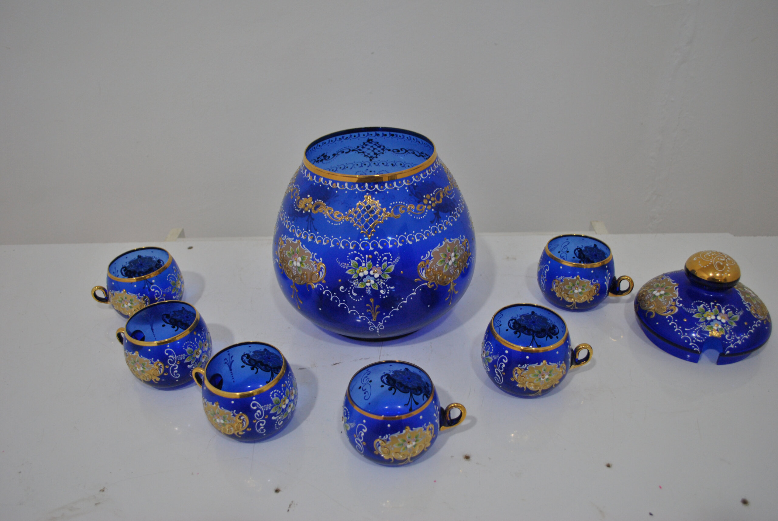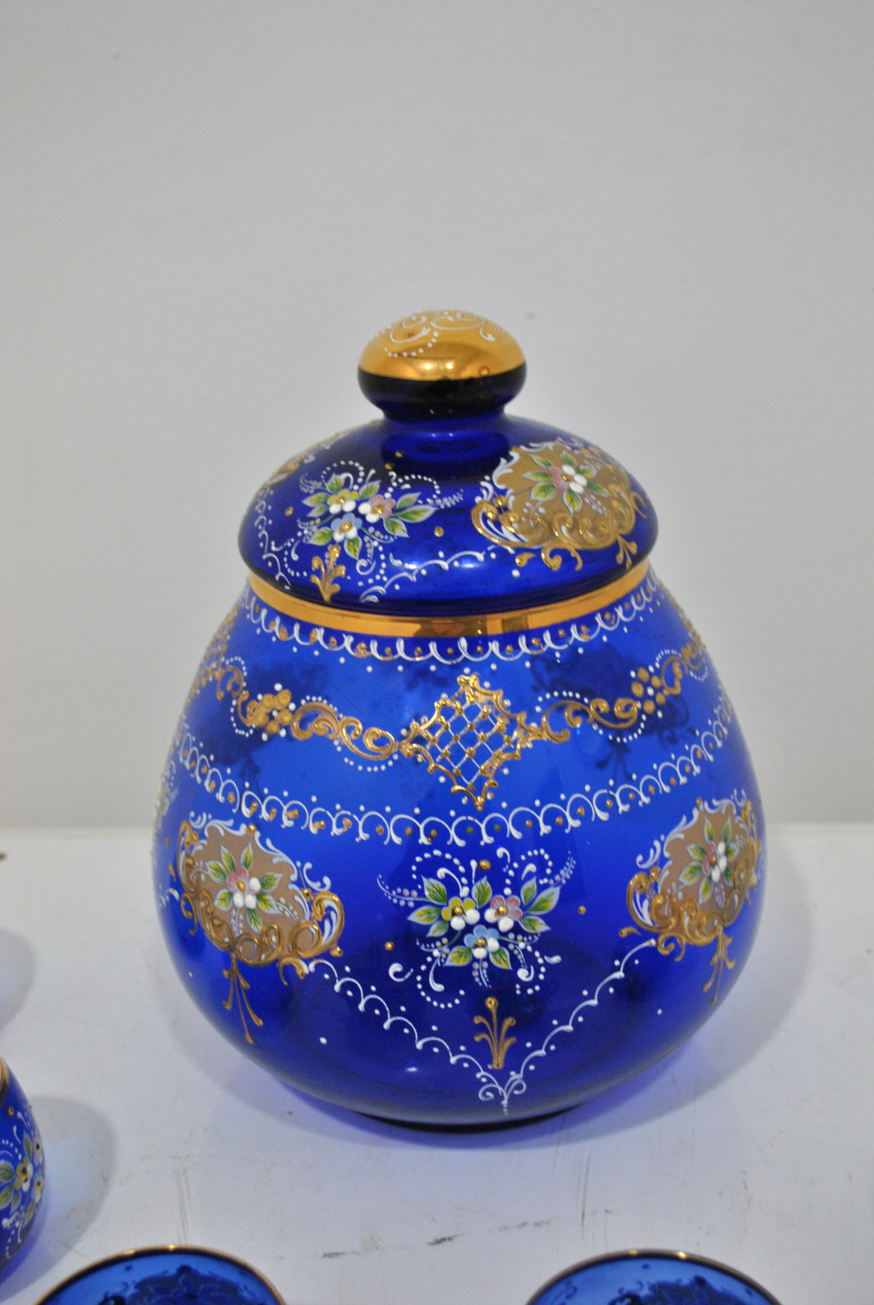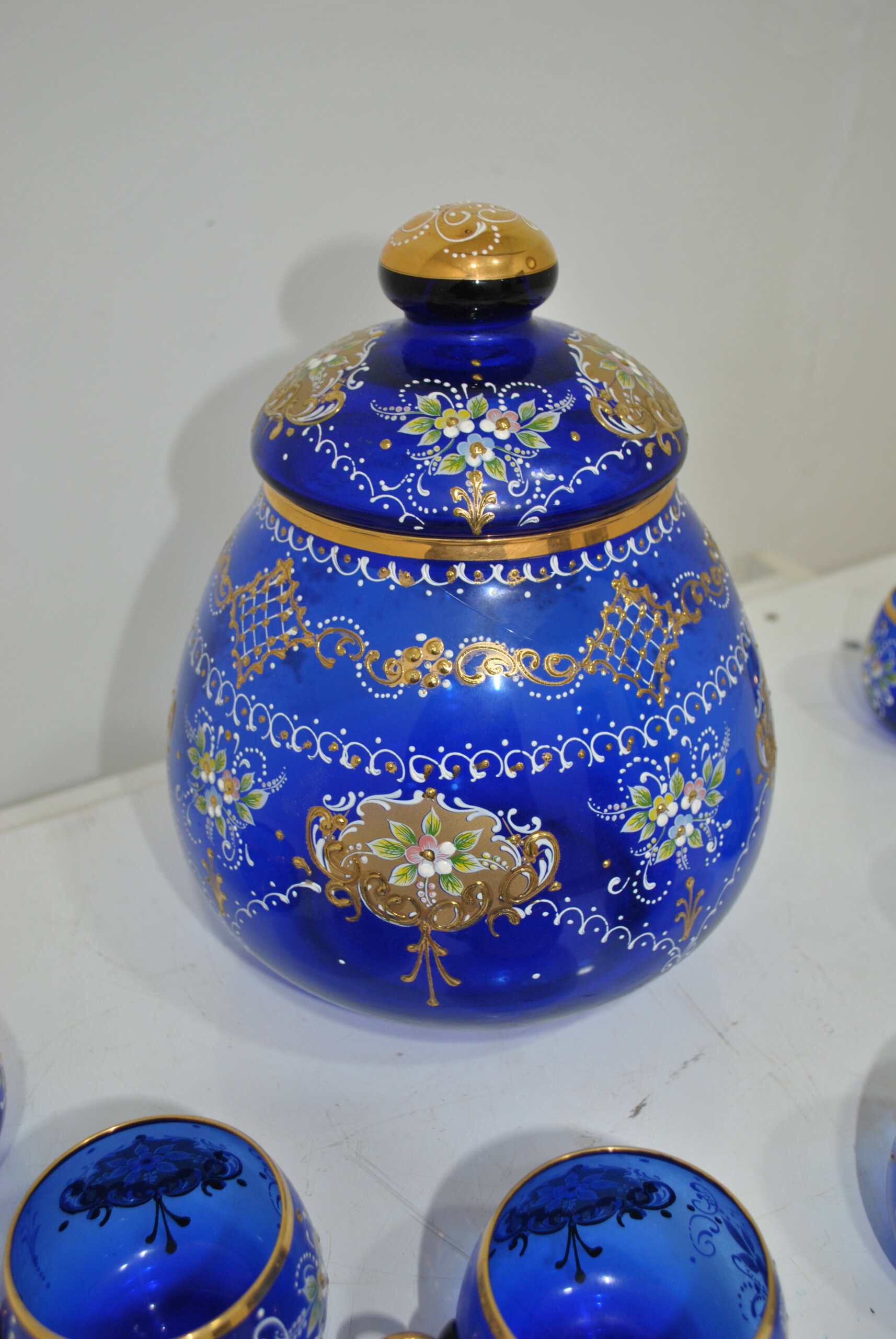 REF: 12202 – Exquisito juego de licor en cristal de Murano, realizado en intenso azul cobalto y ricamente decorado a mano con aplicaciones florales y detalles en oro de 18 quilates. El conjunto está compuesto por: