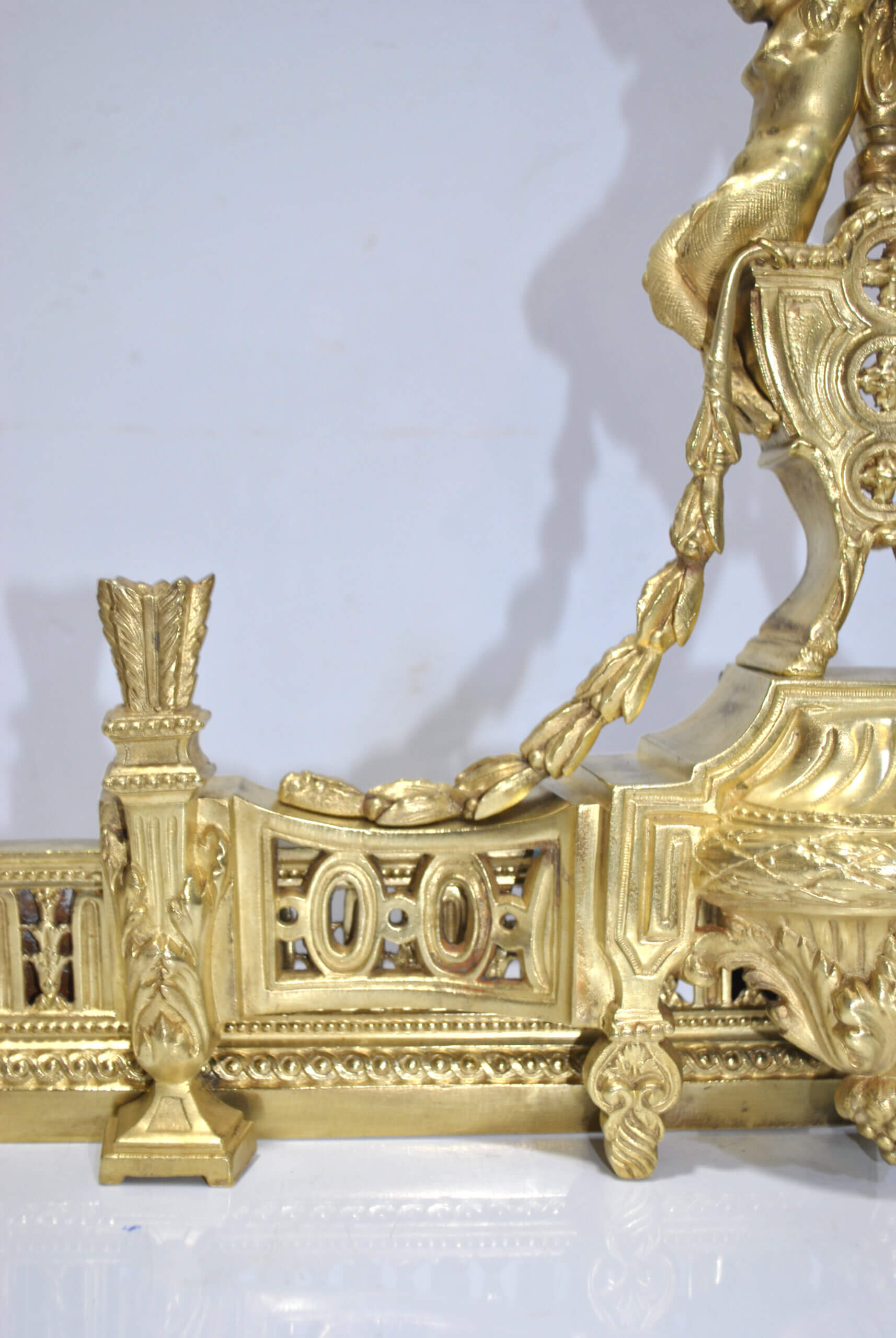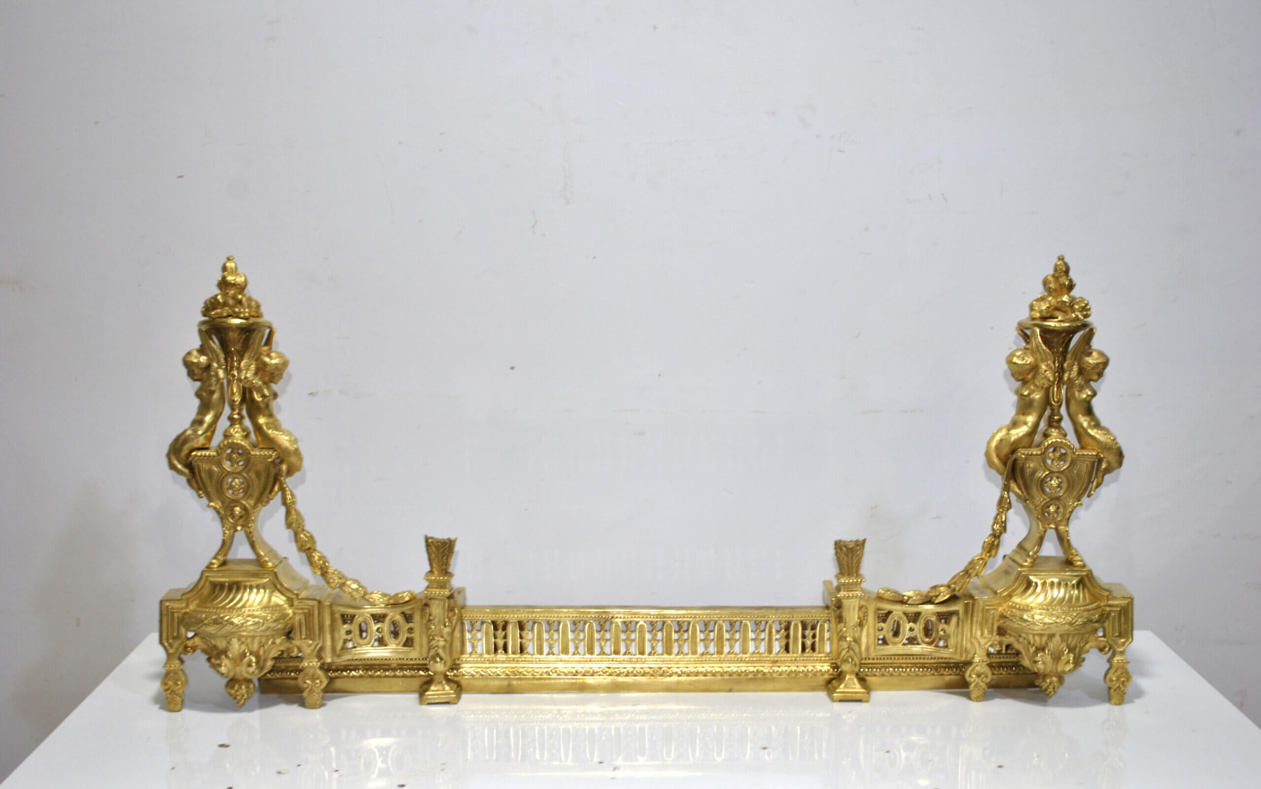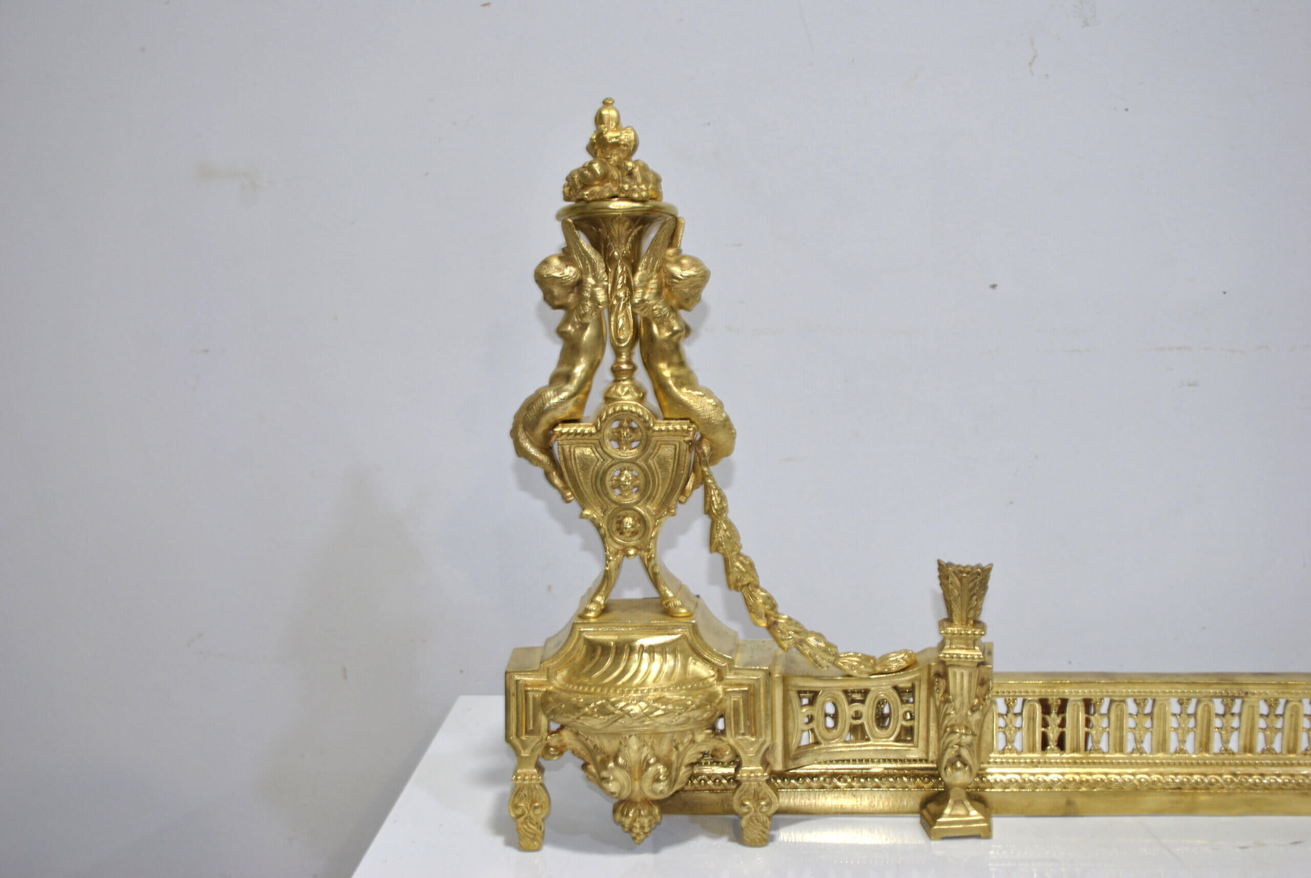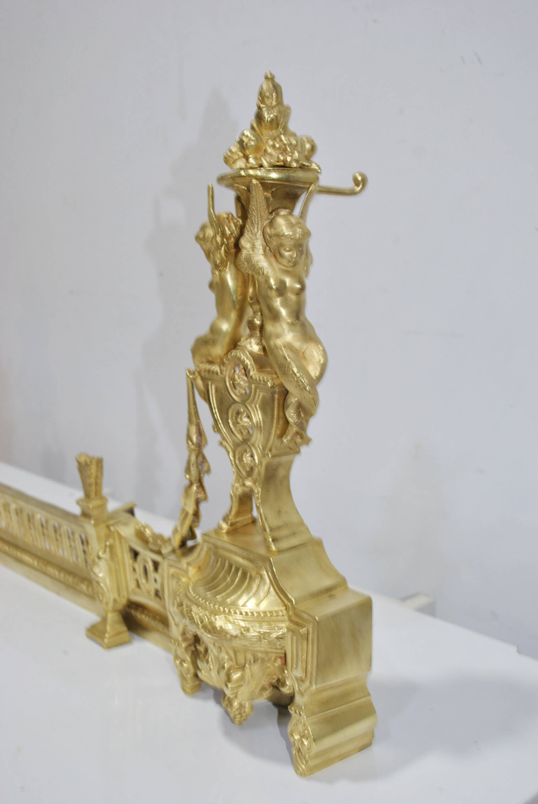 REF: 12043 – Elegante frente de chimenea antiguo de origen francés, realizado en bronce dorado y ricamente decorado con un elaborado diseño neoclásico, destacando en sus extremos figuras alegóricas femeninas de gran calidad escultórica, guirnaldas, roleos y balaustrada central calada; una pieza de finales del siglo XIX, de excelente presencia y cuidada ejecución, que conserva su dorado original con pátina propia del paso del tiempo, pequeñas marcas y signos de uso acordes a su antigüedad que realzan su autenticidad. Ideal como elemento decorativo de gran impacto para chimeneas, son extensibles.