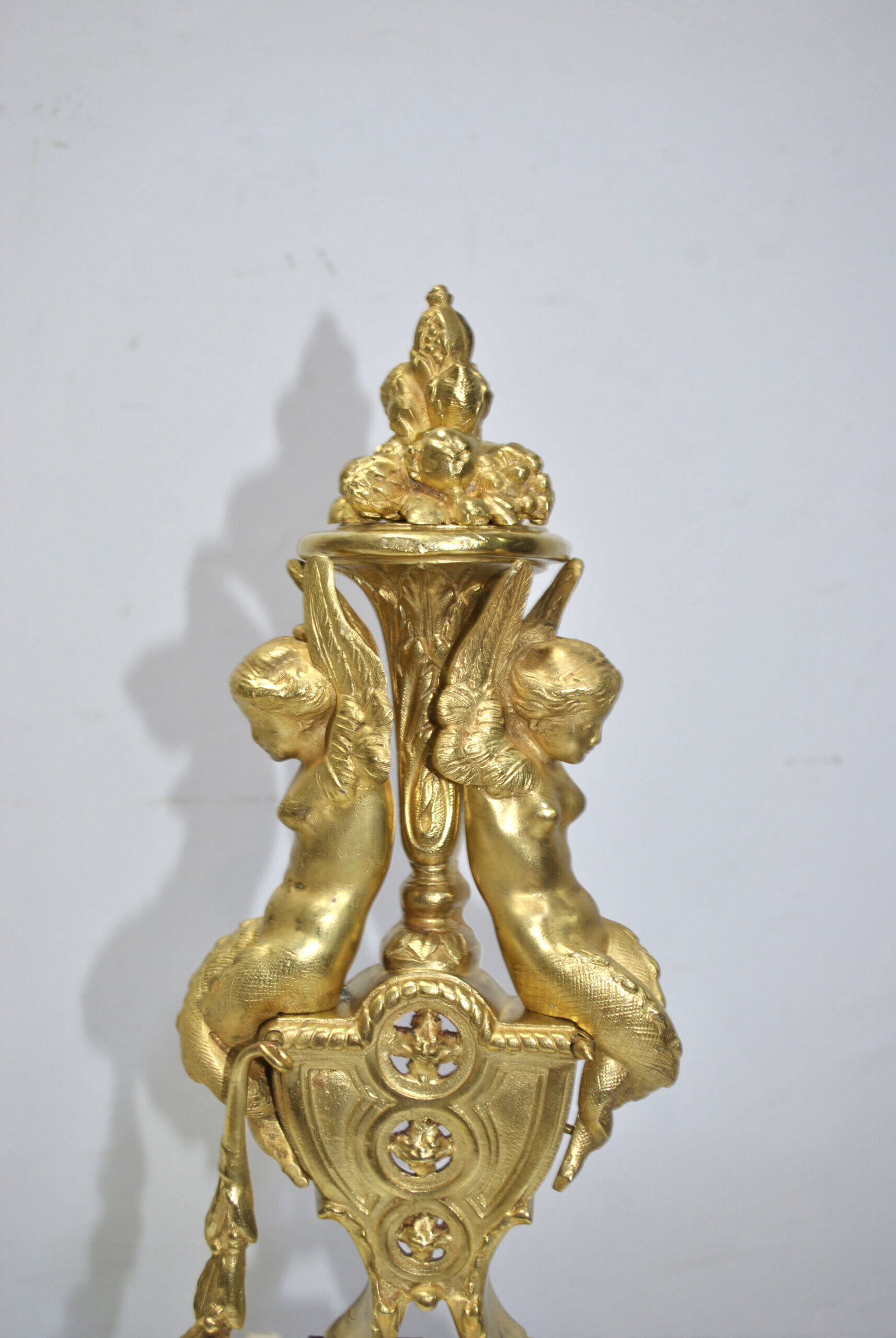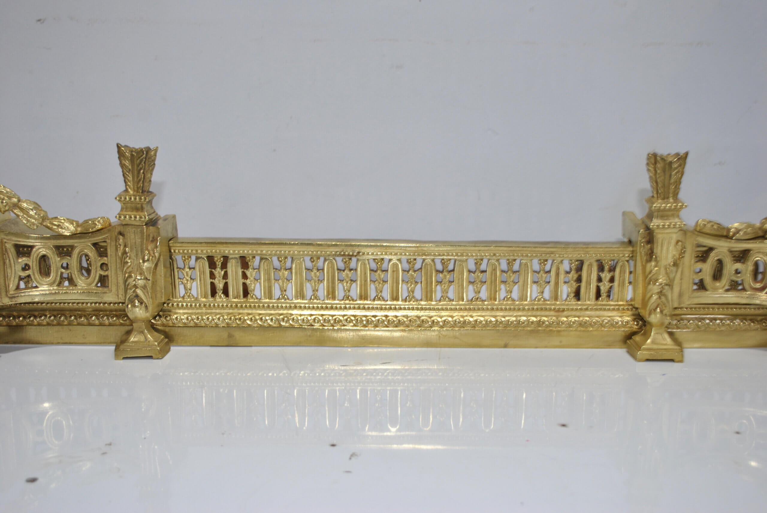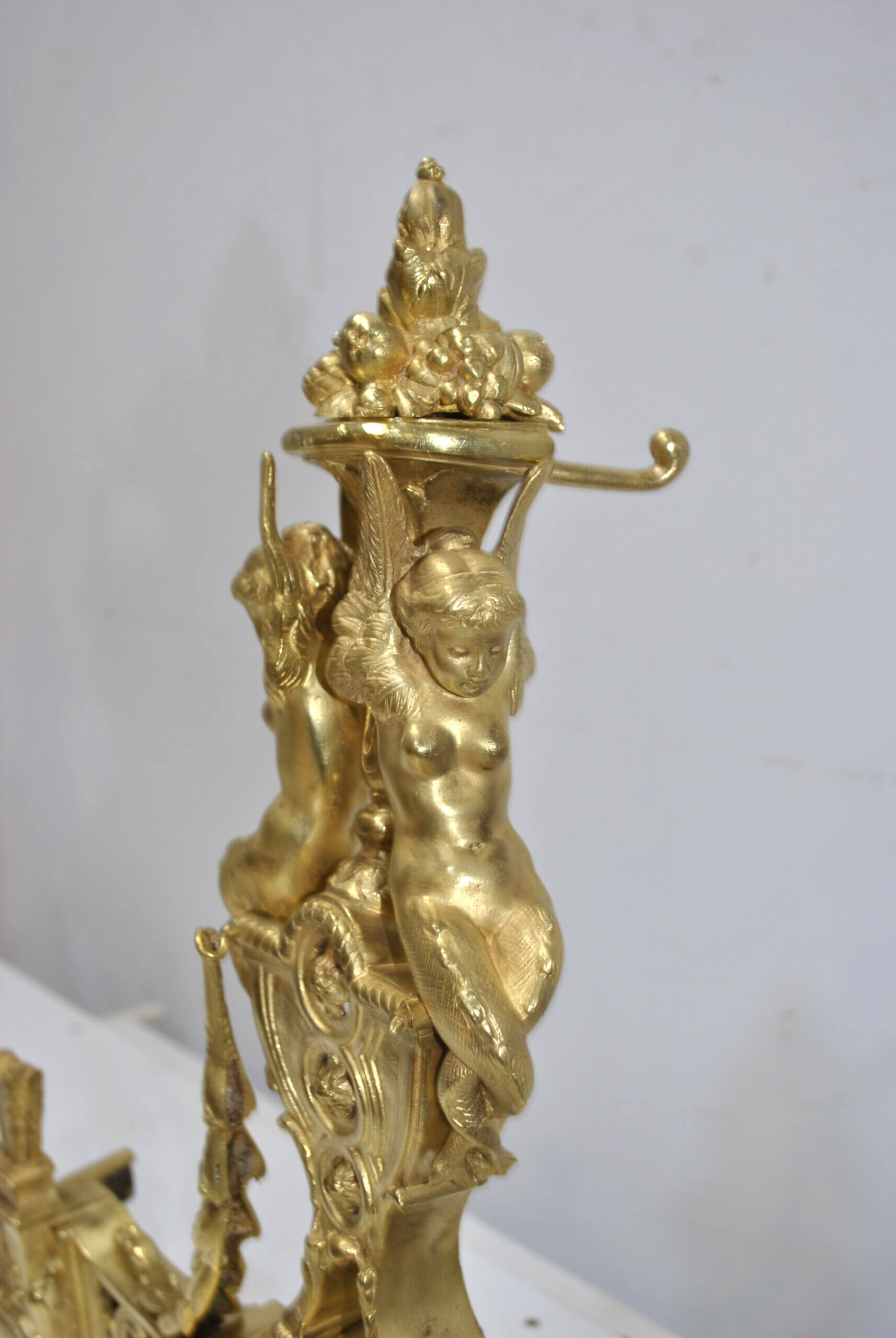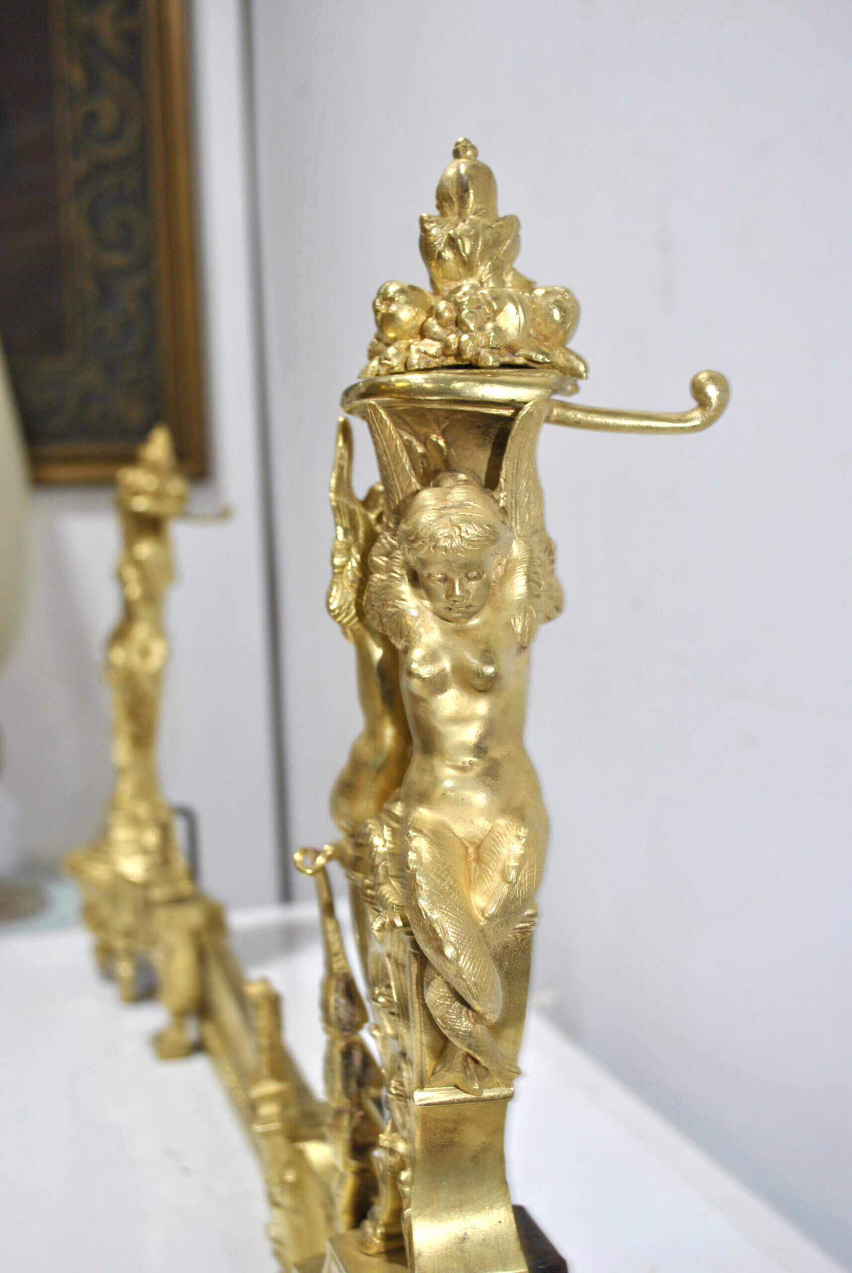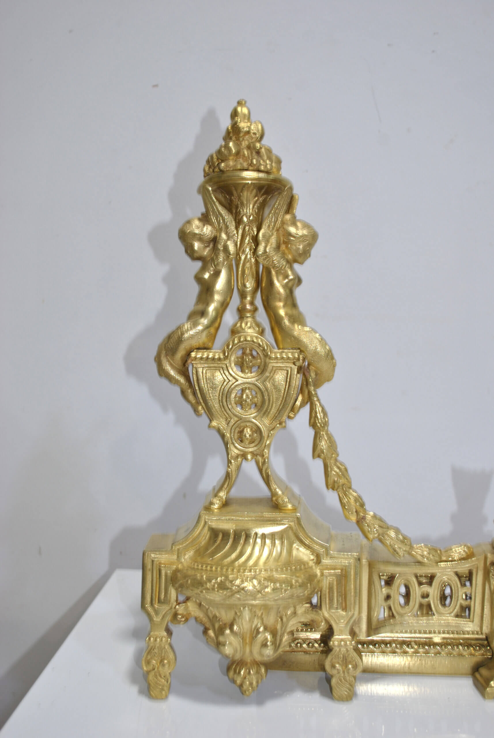 REF: 12043 – Elegante frente de chimenea antiguo de origen francés, realizado en bronce dorado y ricamente decorado con un elaborado diseño neoclásico, destacando en sus extremos figuras alegóricas femeninas de gran calidad escultórica, guirnaldas, roleos y balaustrada central calada; una pieza de finales del siglo XIX, de excelente presencia y cuidada ejecución, que conserva su dorado original con pátina propia del paso del tiempo, pequeñas marcas y signos de uso acordes a su antigüedad que realzan su autenticidad. Ideal como elemento decorativo de gran impacto para chimeneas, son extensibles.