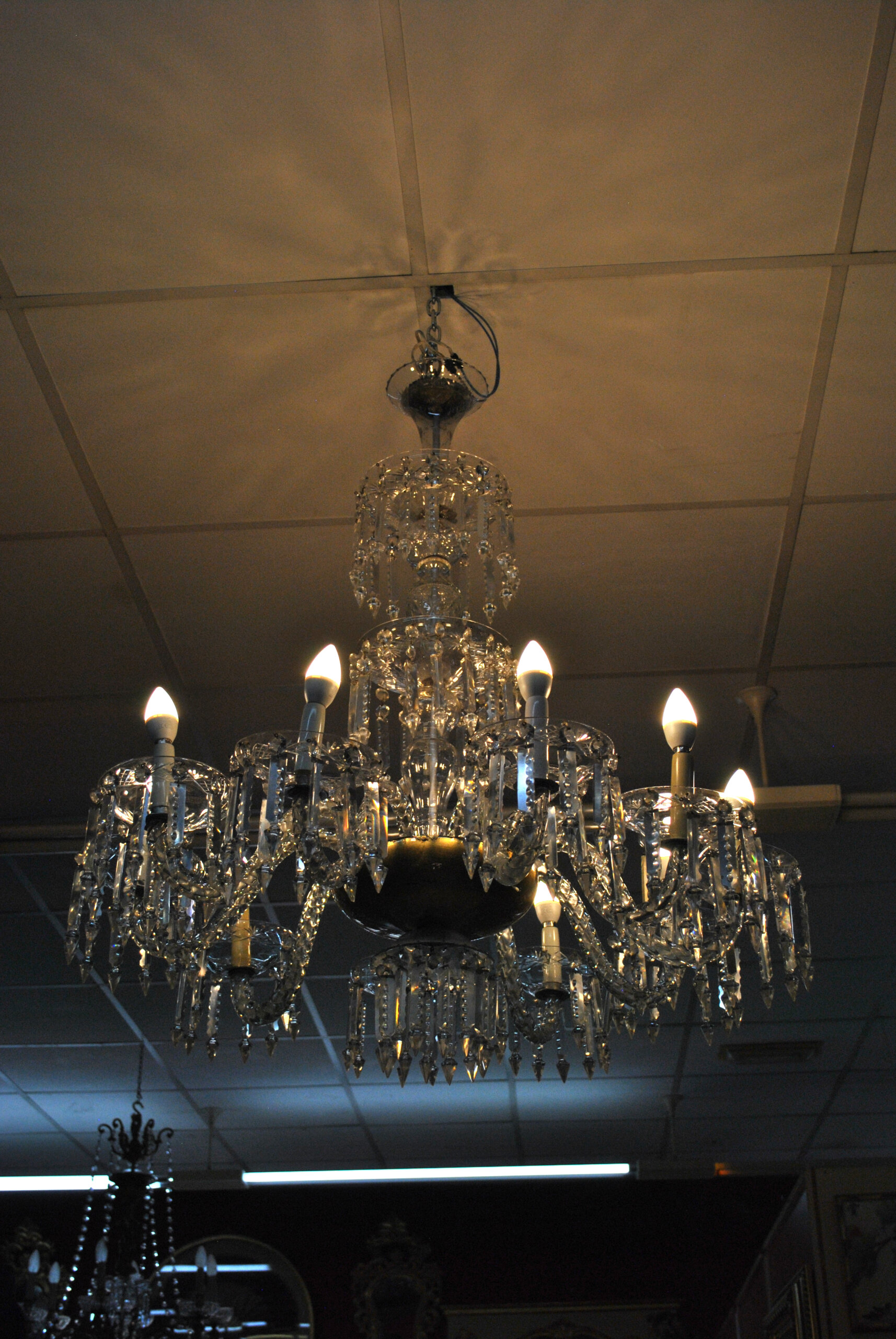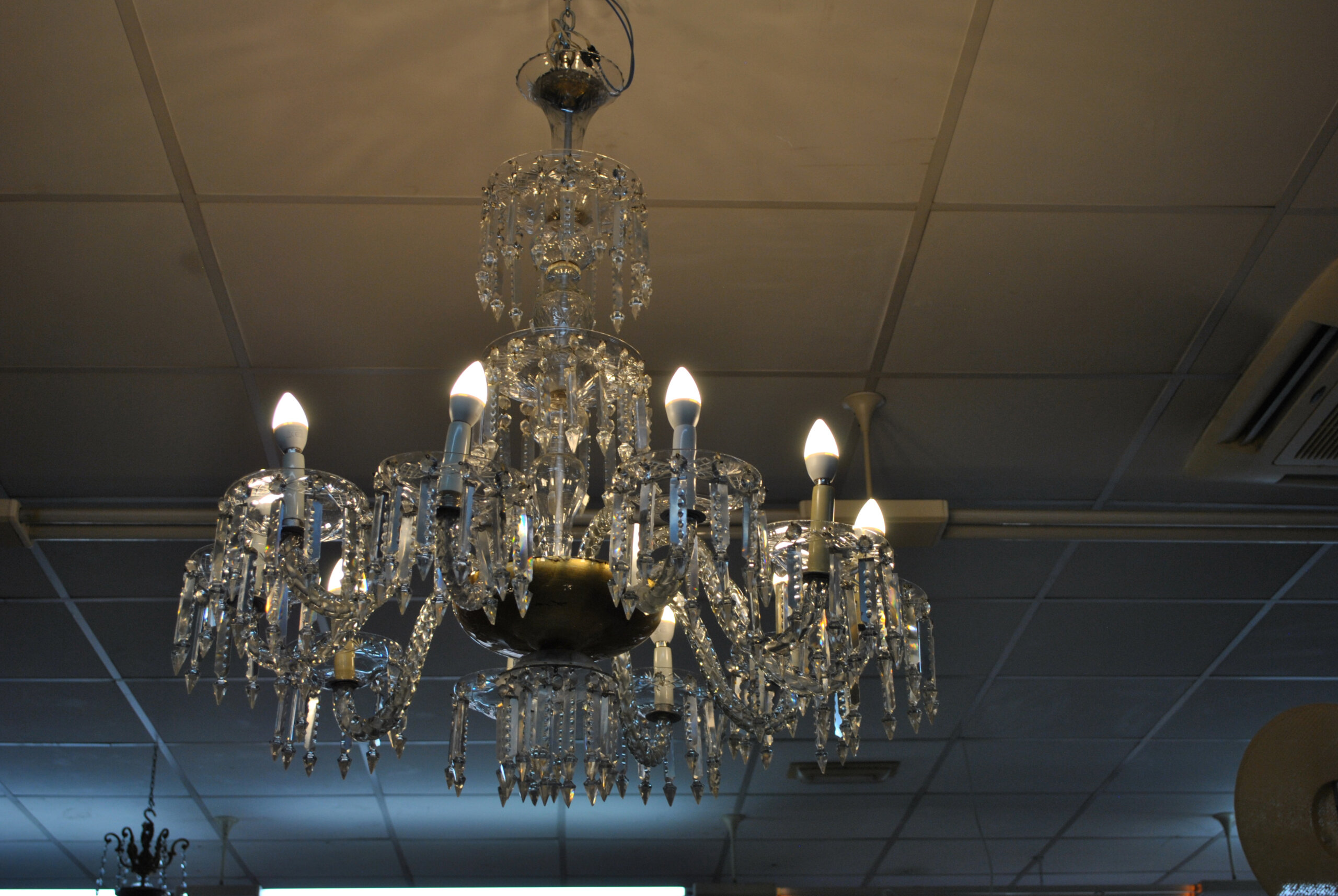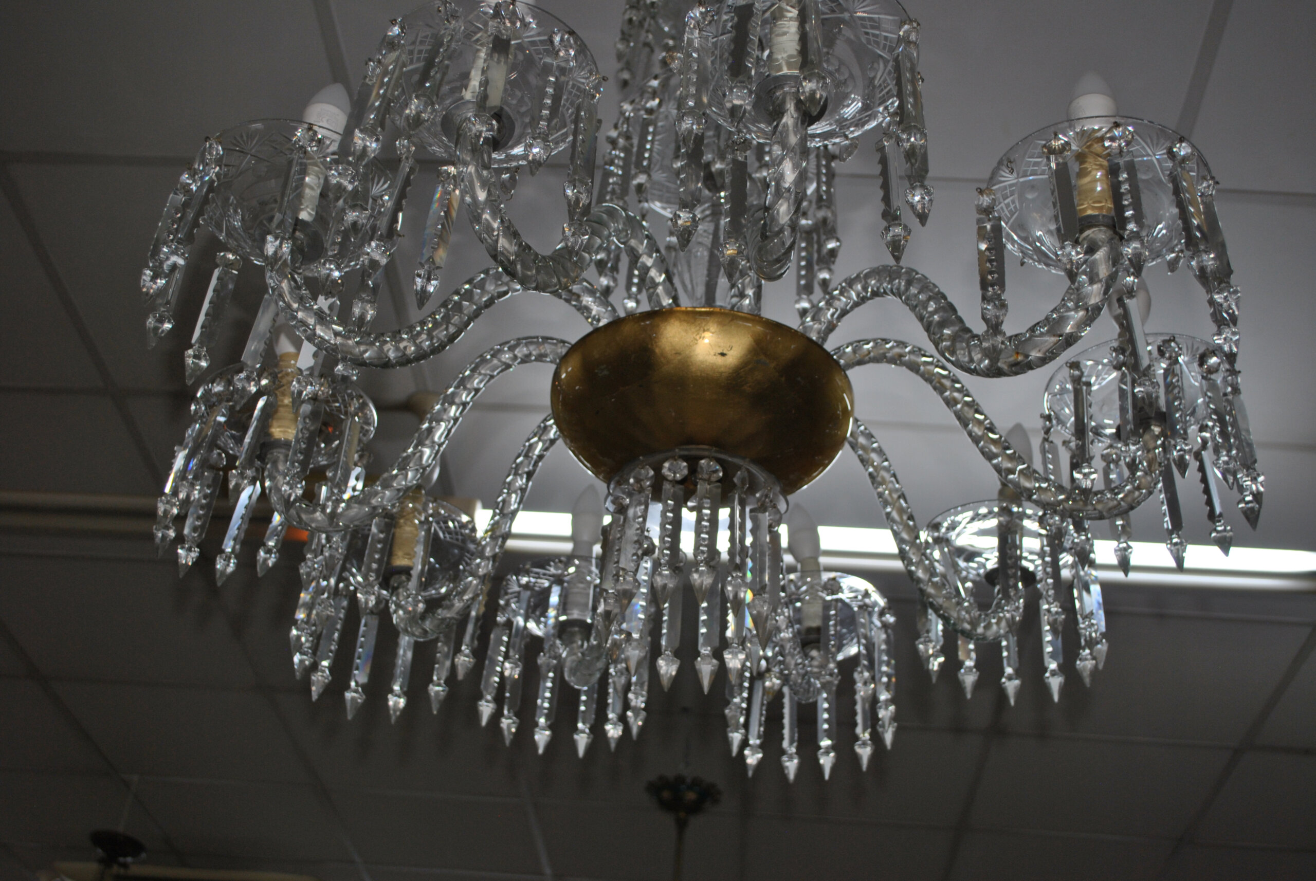 REF: 12314 – Espectacular lámpara de araña antigua de cristal, una pieza de gran elegancia y presencia que destaca por su diseño clásico y sus 10 brazos curvados, cada uno con portalámparas tipo vela, aportando un estilo sofisticado y atemporal.