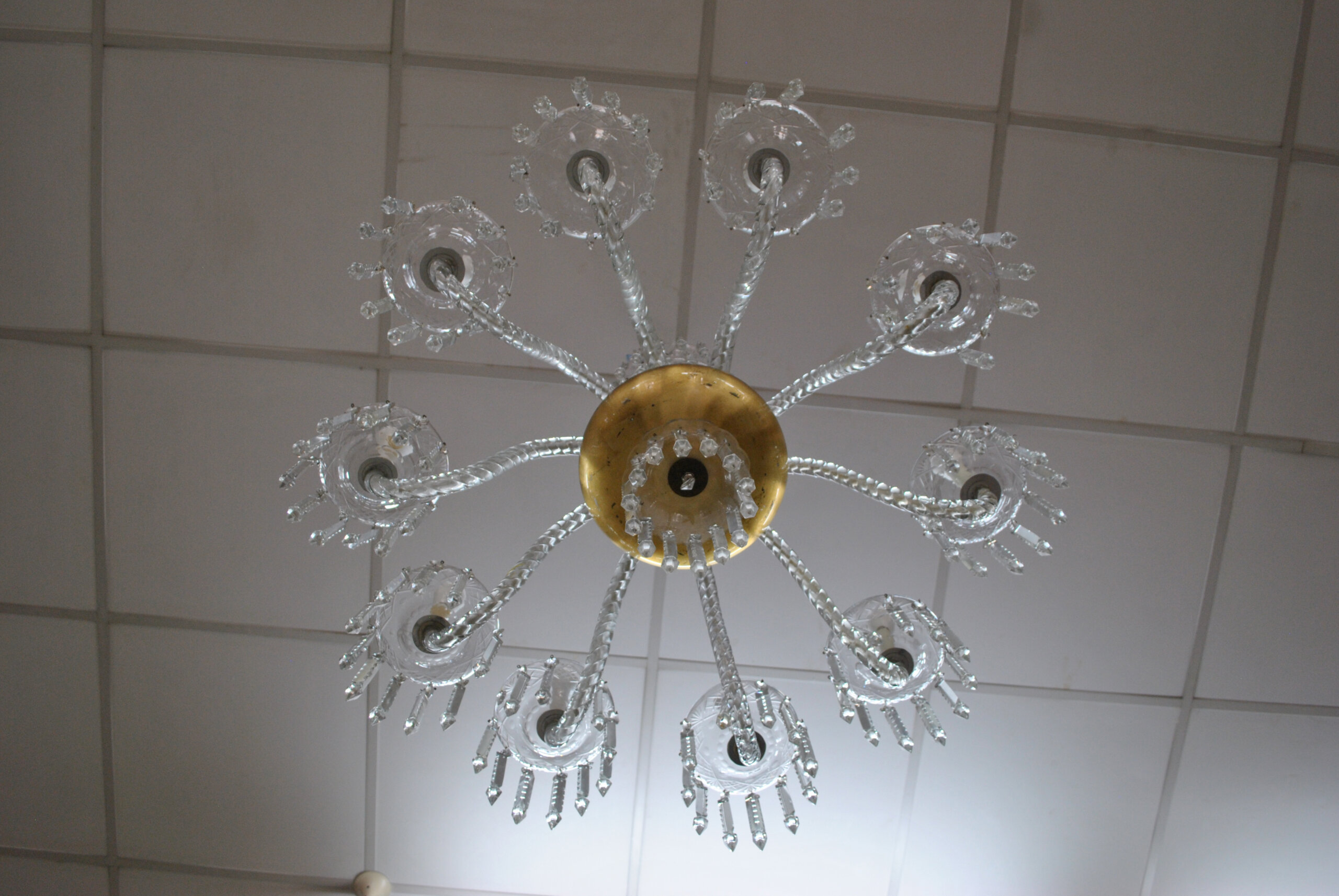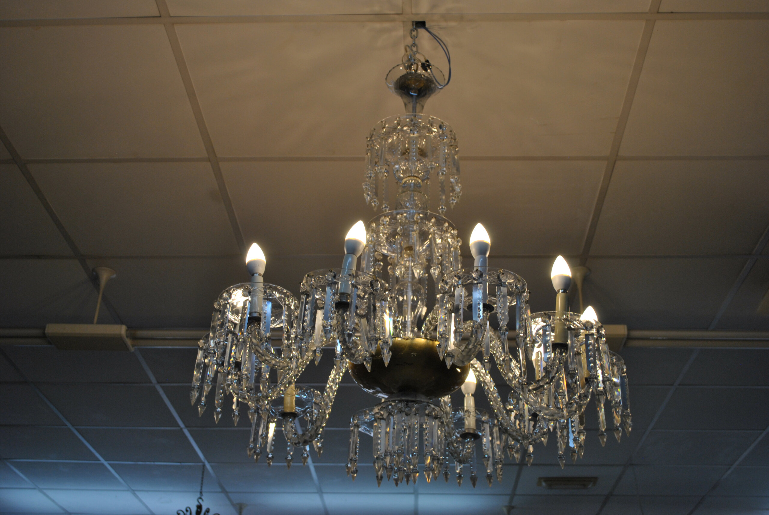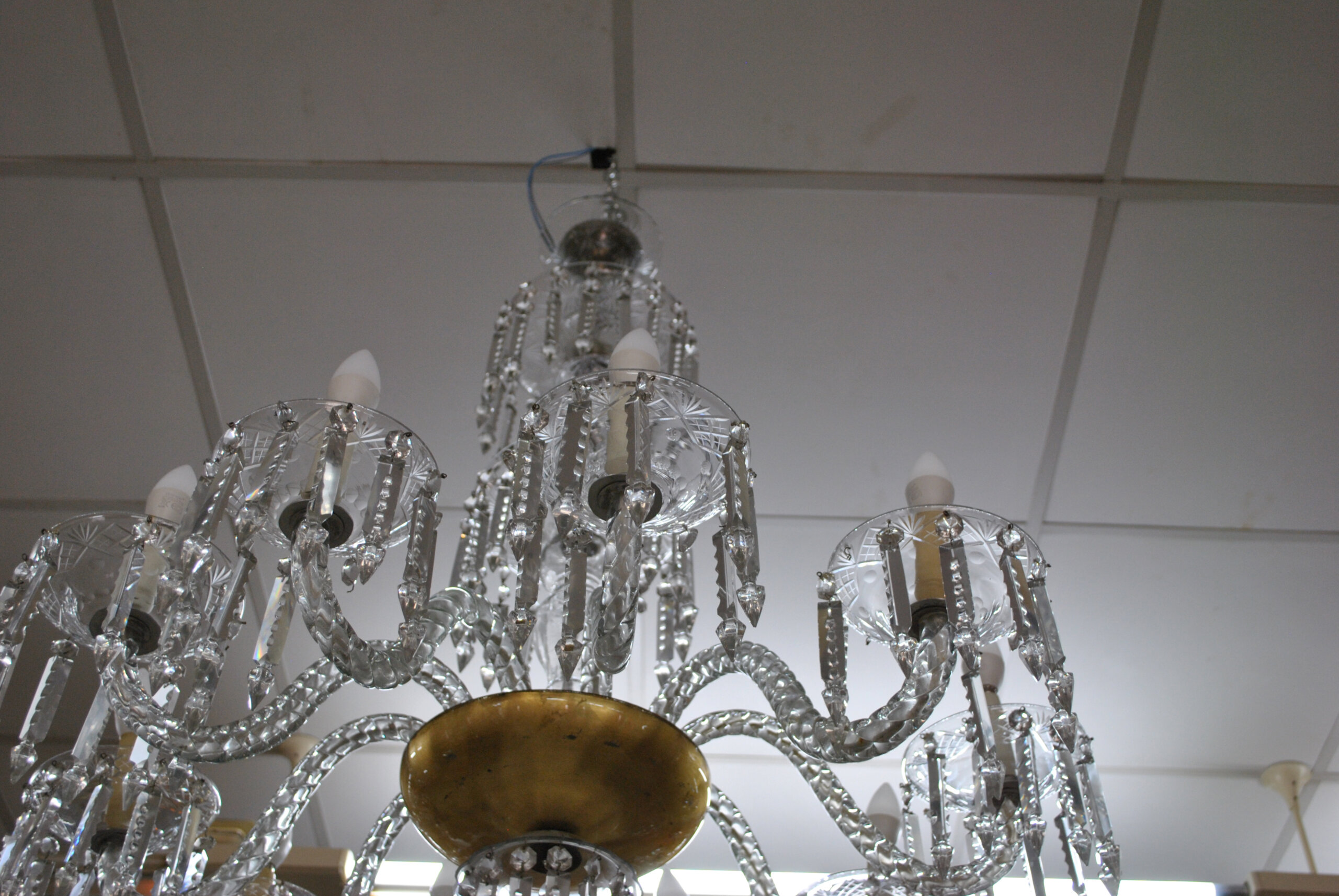 REF: 12314 – Espectacular lámpara de araña antigua de cristal, una pieza de gran elegancia y presencia que destaca por su diseño clásico y sus 10 brazos curvados, cada uno con portalámparas tipo vela, aportando un estilo sofisticado y atemporal.