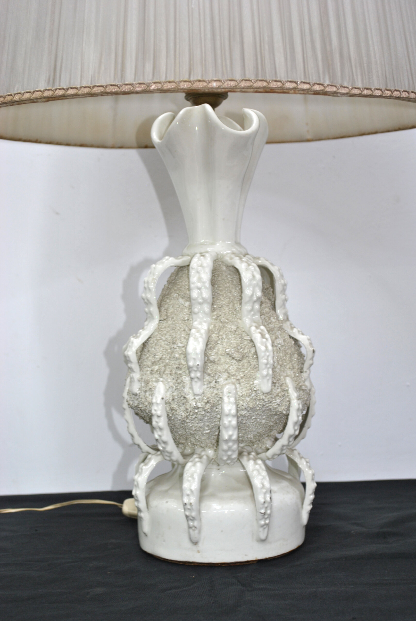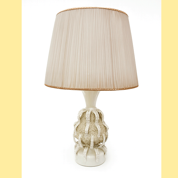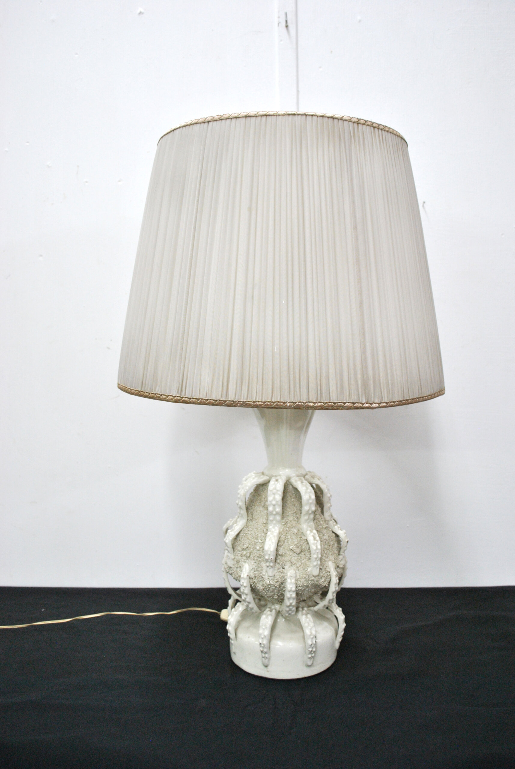 REF: 11885 – Elegante lámpara de mesa con base de cerámica esmaltada de Manises en tono marfil y diseño artístico de textura rugosa y aplicaciones en relieve que evocan formas naturales. La pantalla de tela plisada en color beige claro complementa su estilo clásico y sofisticado, aportando una iluminación cálida y acogedora. Ideal para decorar salas, dormitorios o espacios de estilo retro o contemporáneo. En buen estado general y completamente funcional, presenta leves señales de uso propias de su antigüedad. Una pieza decorativa con carácter y distinción.