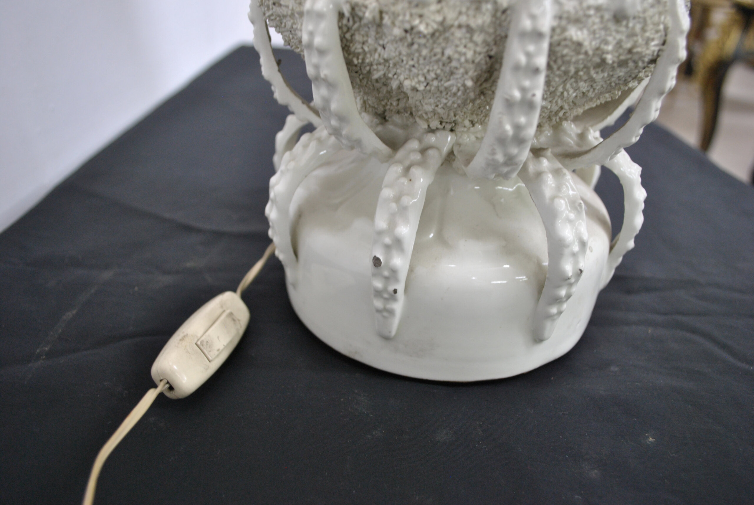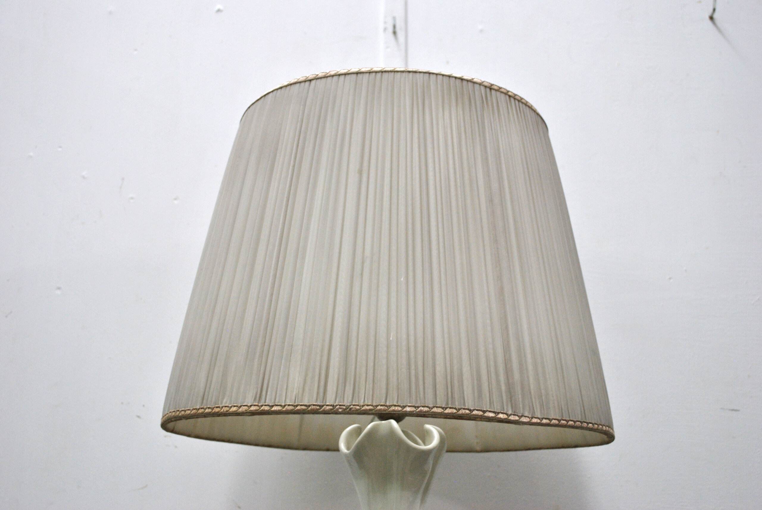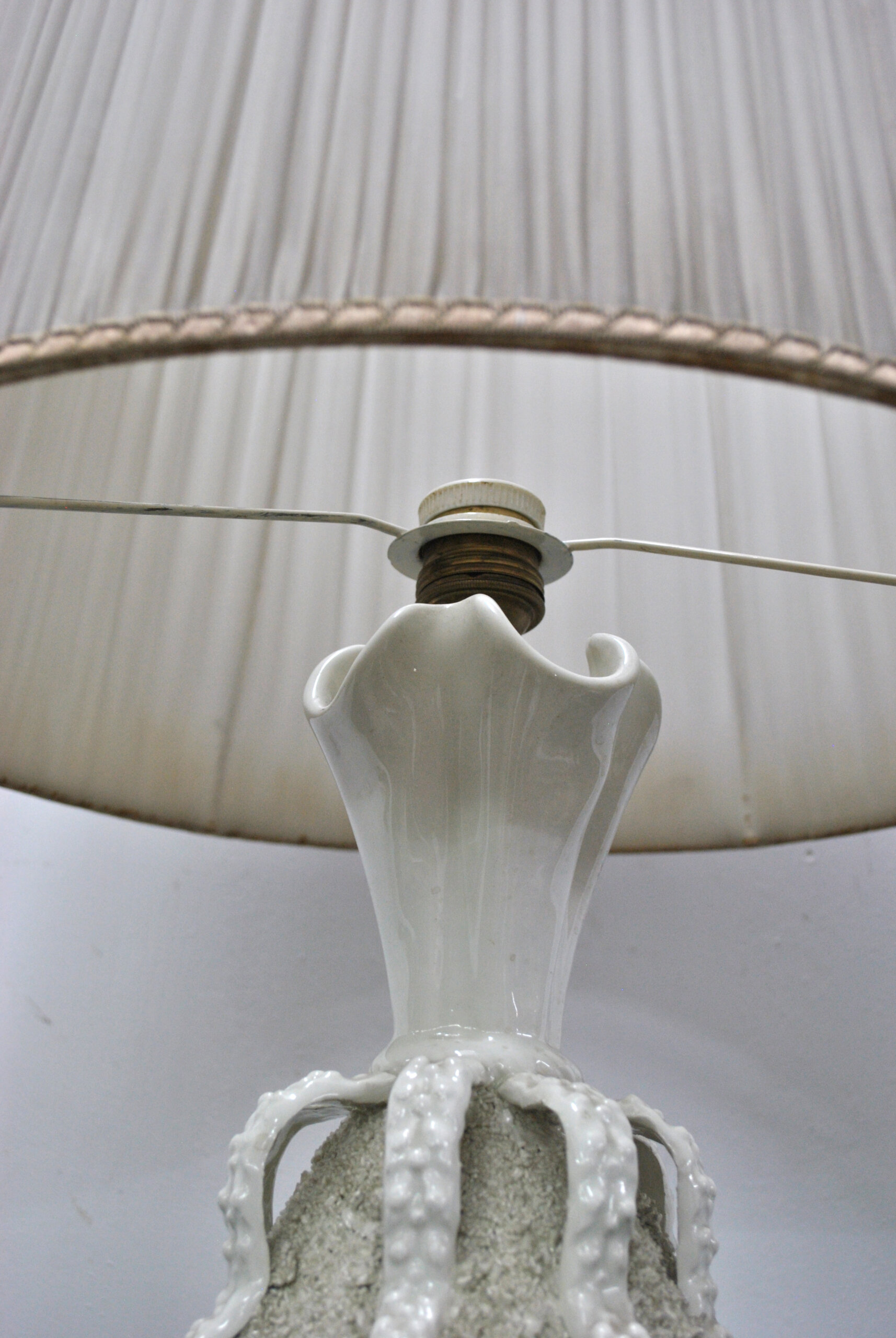 REF: 11885 – Elegante lámpara de mesa con base de cerámica esmaltada de Manises en tono marfil y diseño artístico de textura rugosa y aplicaciones en relieve que evocan formas naturales. La pantalla de tela plisada en color beige claro complementa su estilo clásico y sofisticado, aportando una iluminación cálida y acogedora. Ideal para decorar salas, dormitorios o espacios de estilo retro o contemporáneo. En buen estado general y completamente funcional, presenta leves señales de uso propias de su antigüedad. Una pieza decorativa con carácter y distinción.