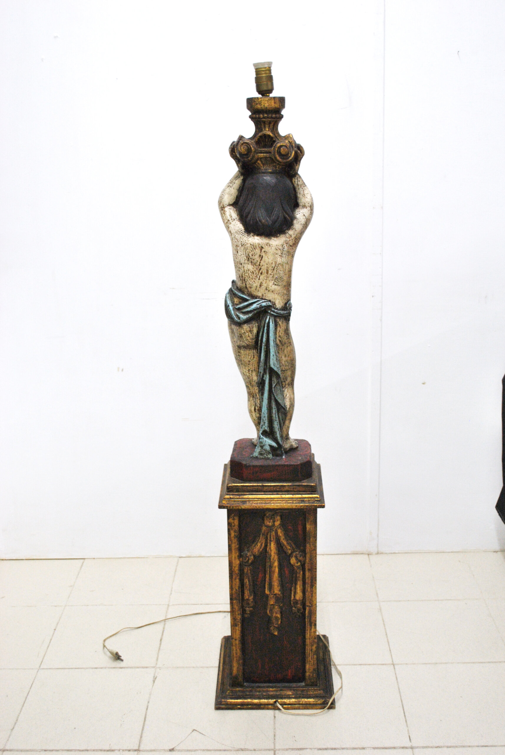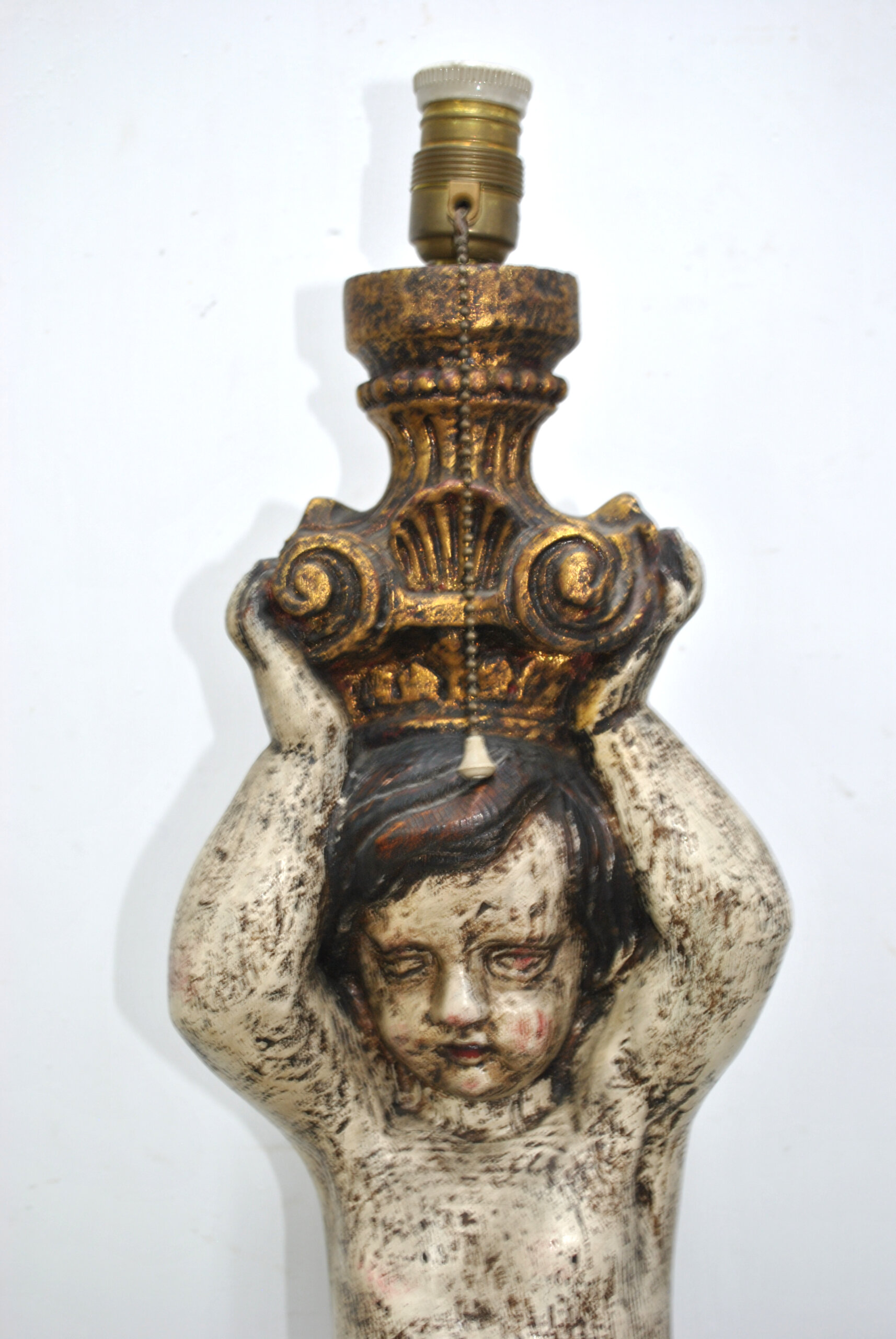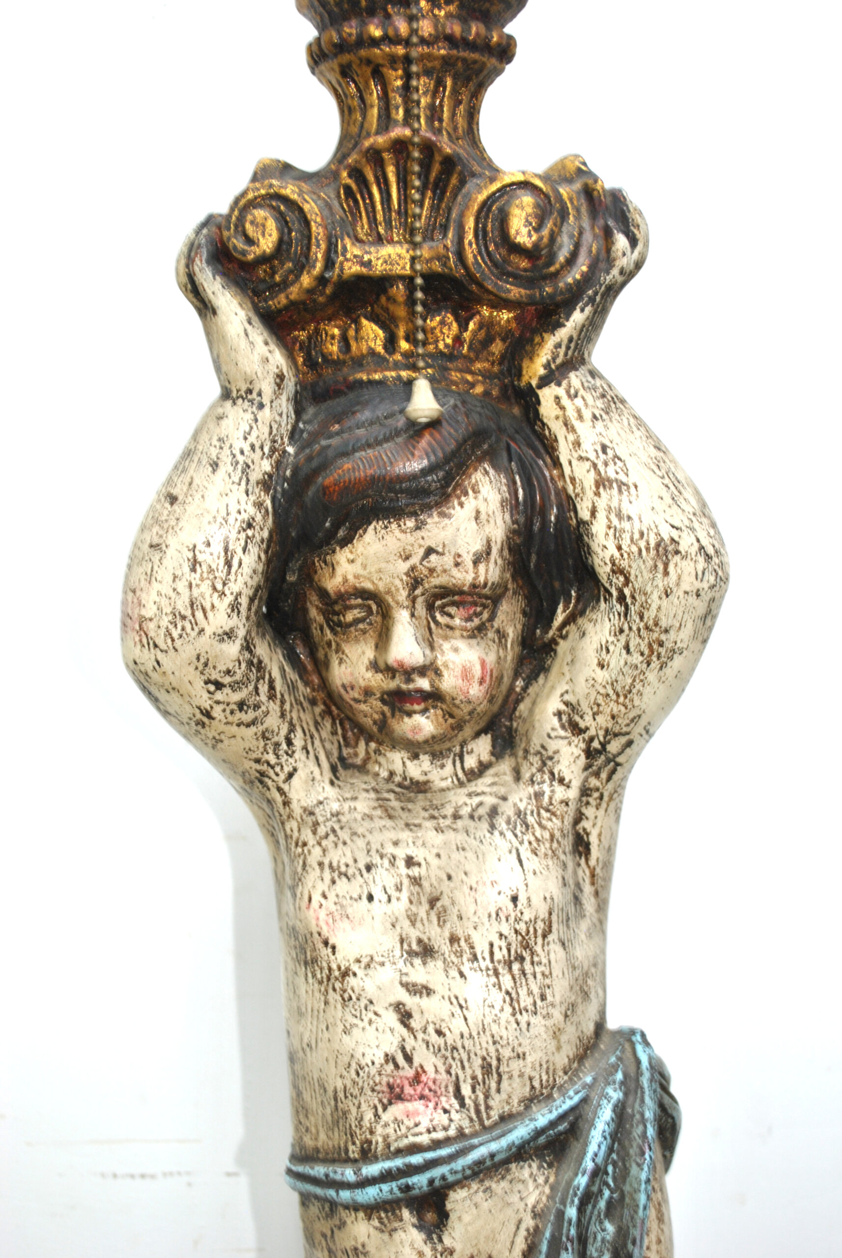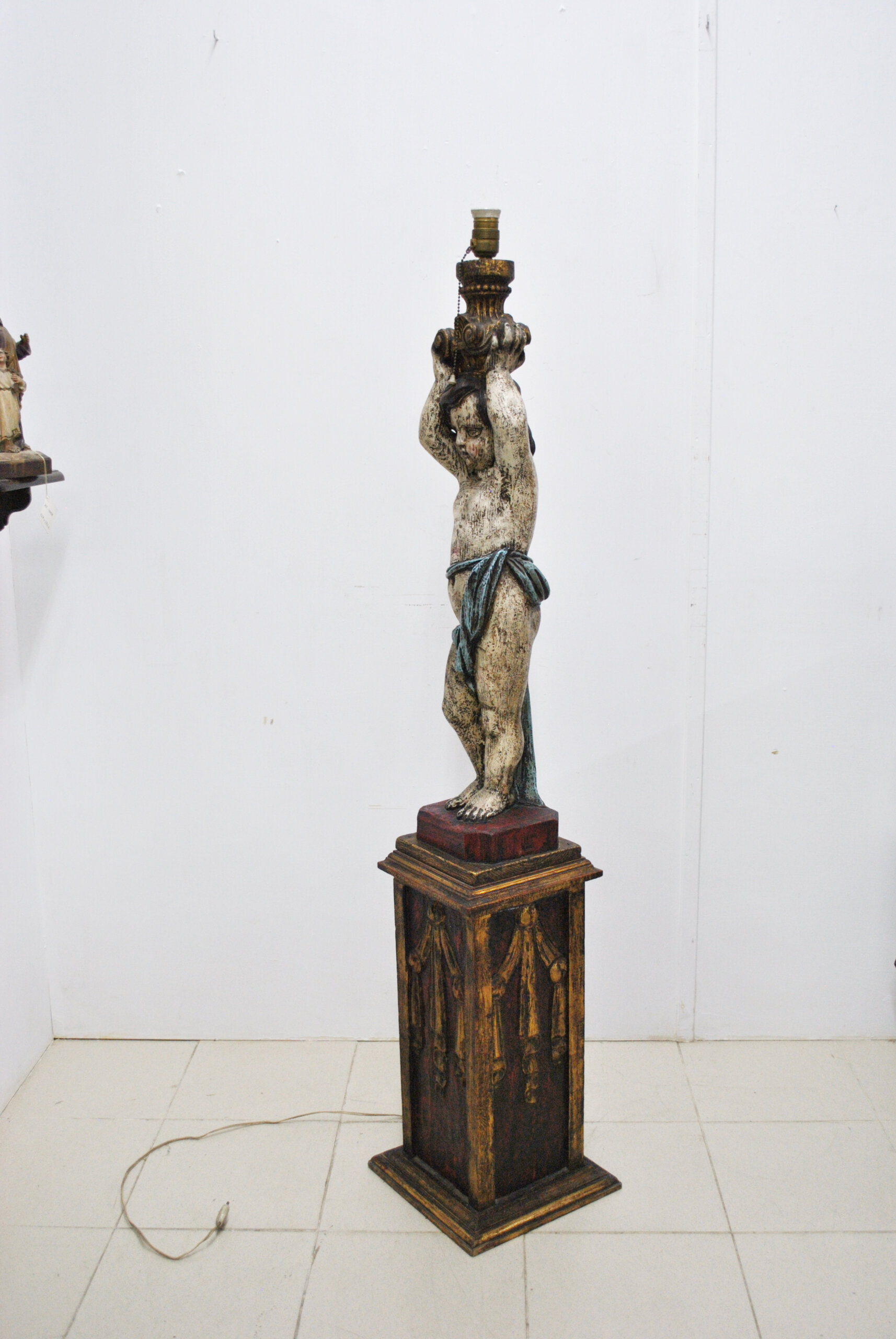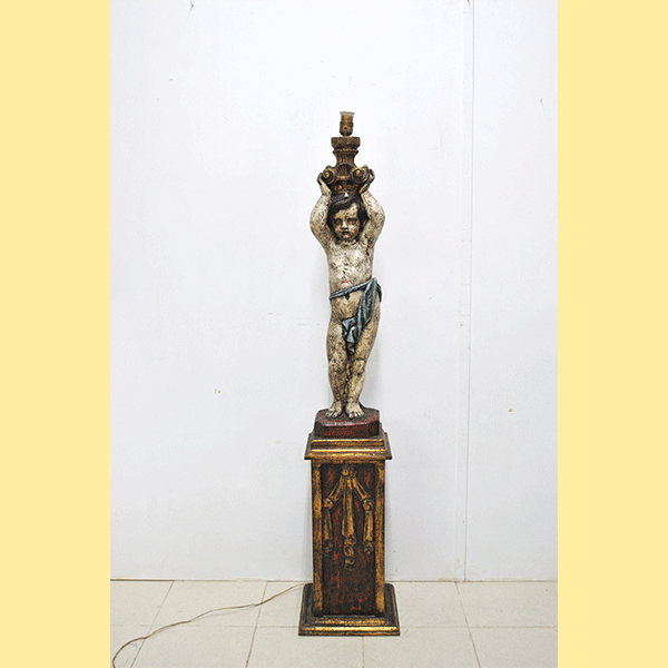 REF: 11908 – Magnífica lámpara escultórica de pie representando la escena de un bellísimo angelito querubín, tallado con gran detalle y delicadeza. La figura sostiene sobre su cabeza una base ornamentada que sirve de soporte para el portalámparas, evocando las composiciones clásicas de inspiración barroca y renacentista. El cuerpo del querubín presenta un acabado policromado en tonos marfil envejecido, con matices dorados y pátina oscura que resalta su textura y volumen. Lleva un paño azul drapeado alrededor de la cintura, y se apoya sobre una base columnar rectangular ricamente decorada con motivos de guirnaldas y lazos en relieve dorado sobre fondo rojo oscuro.
