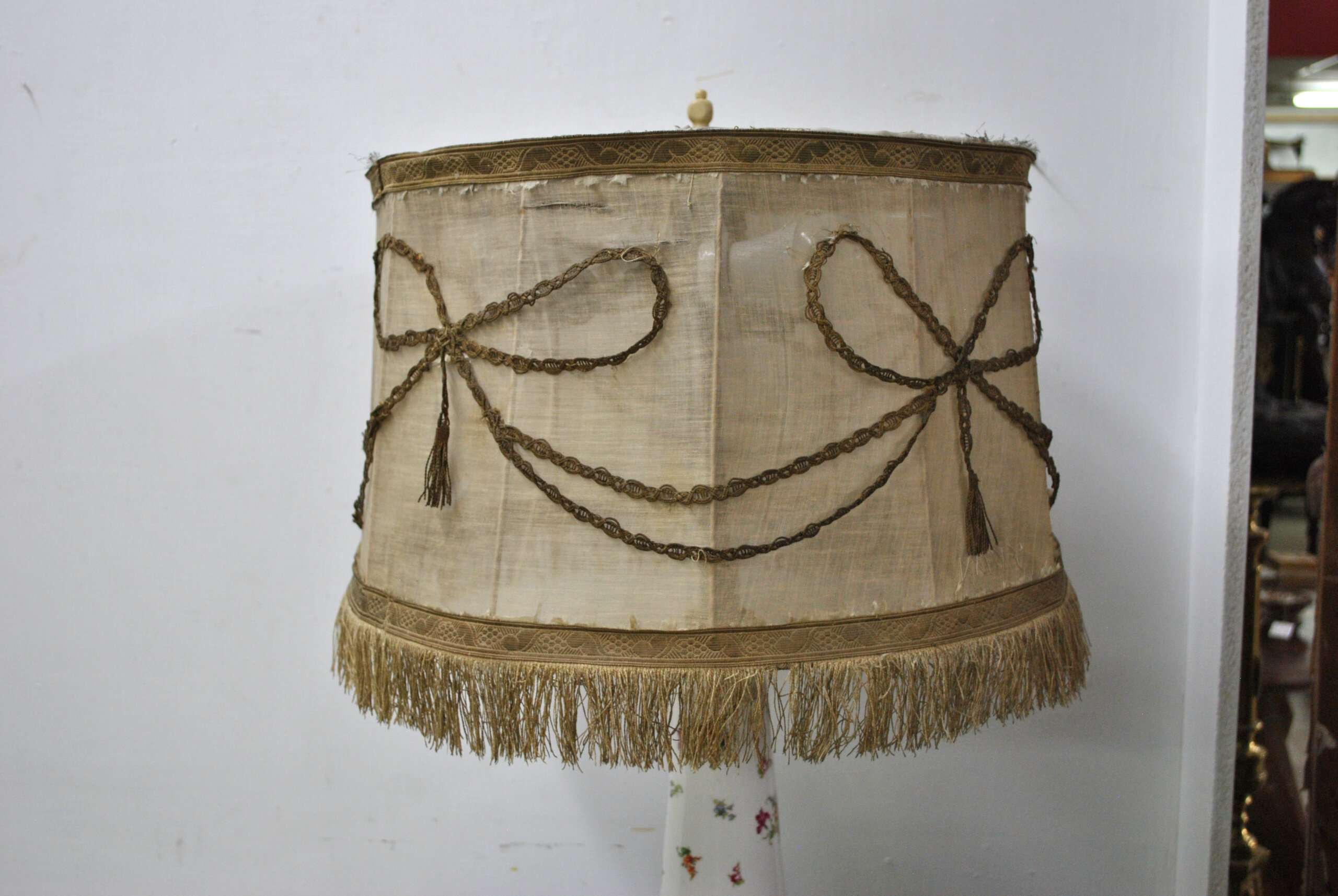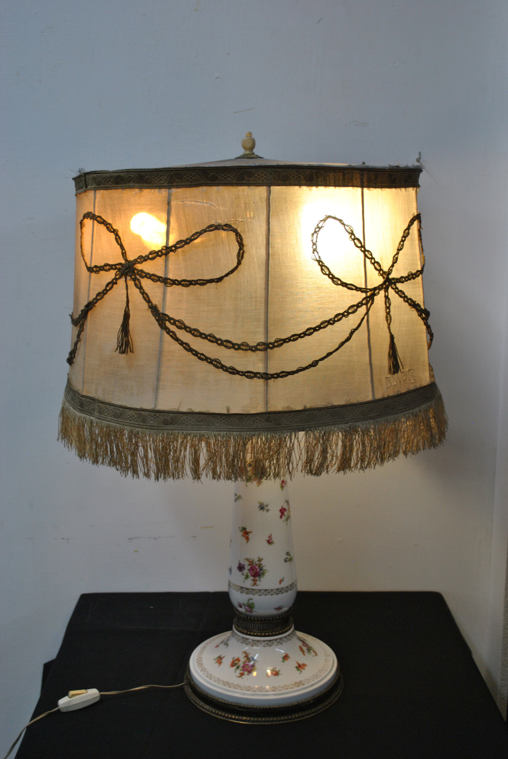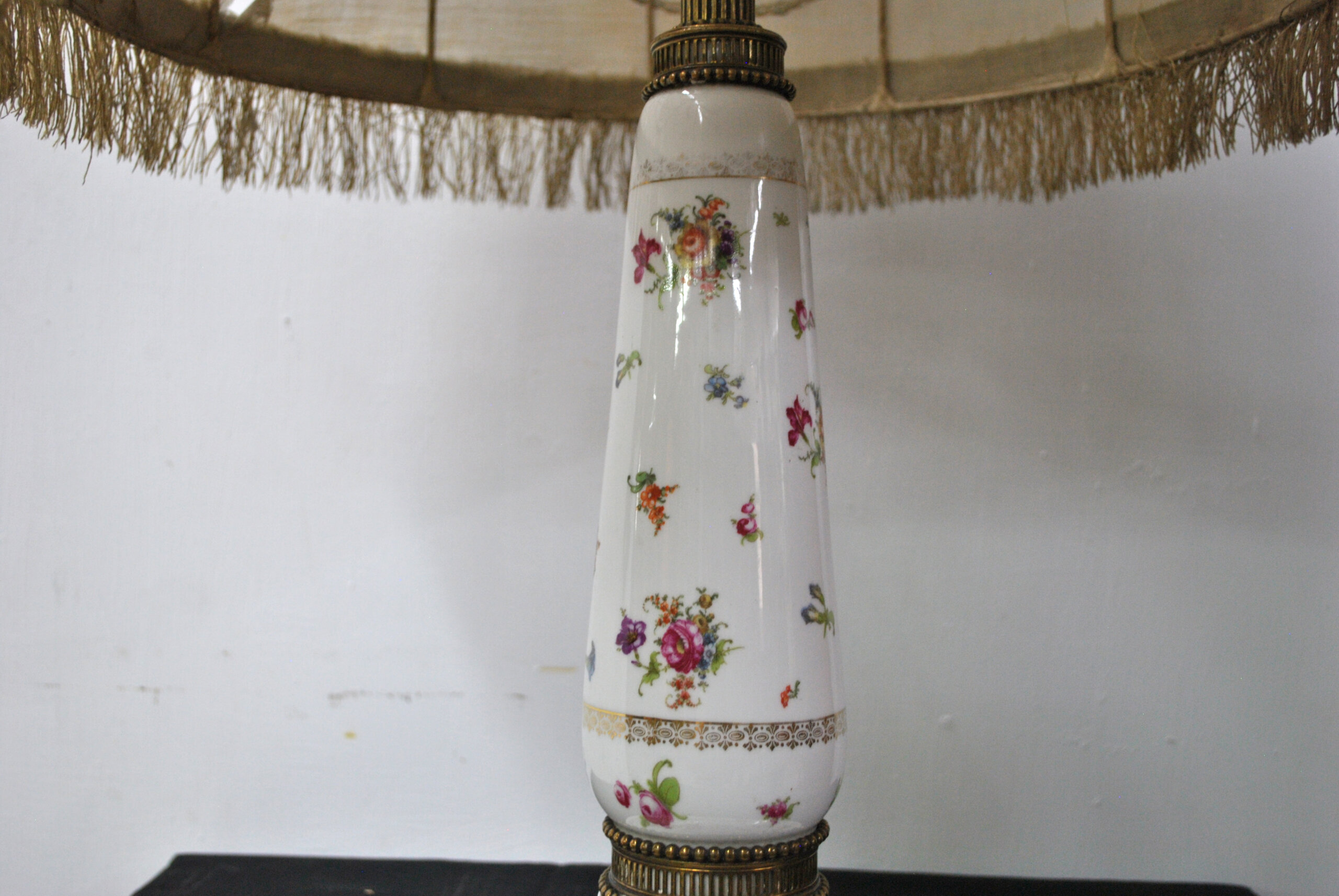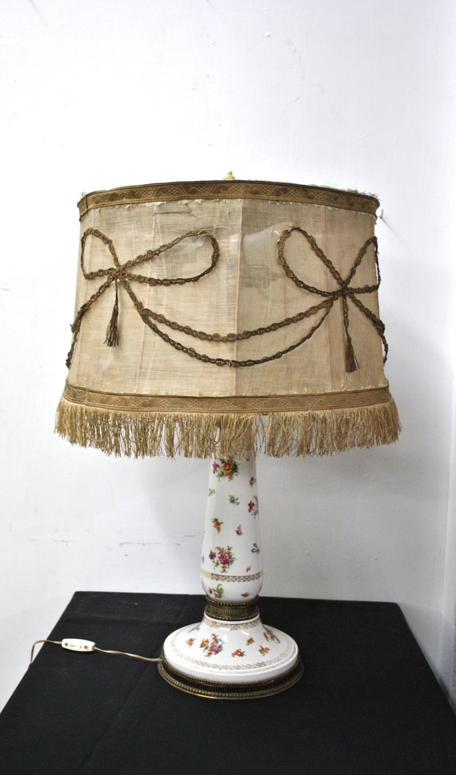 REF: 11968 – Elegante lámpara de mesa de estilo clásico vintage, ideal para ambientes refinados o decoraciones con aire romántico o retro. Su base está elaborada en porcelana blanca finamente decorada con motivos florales multicolor, realzada con delicados detalles dorados y apliques metálicos en tono bronce antiguo.