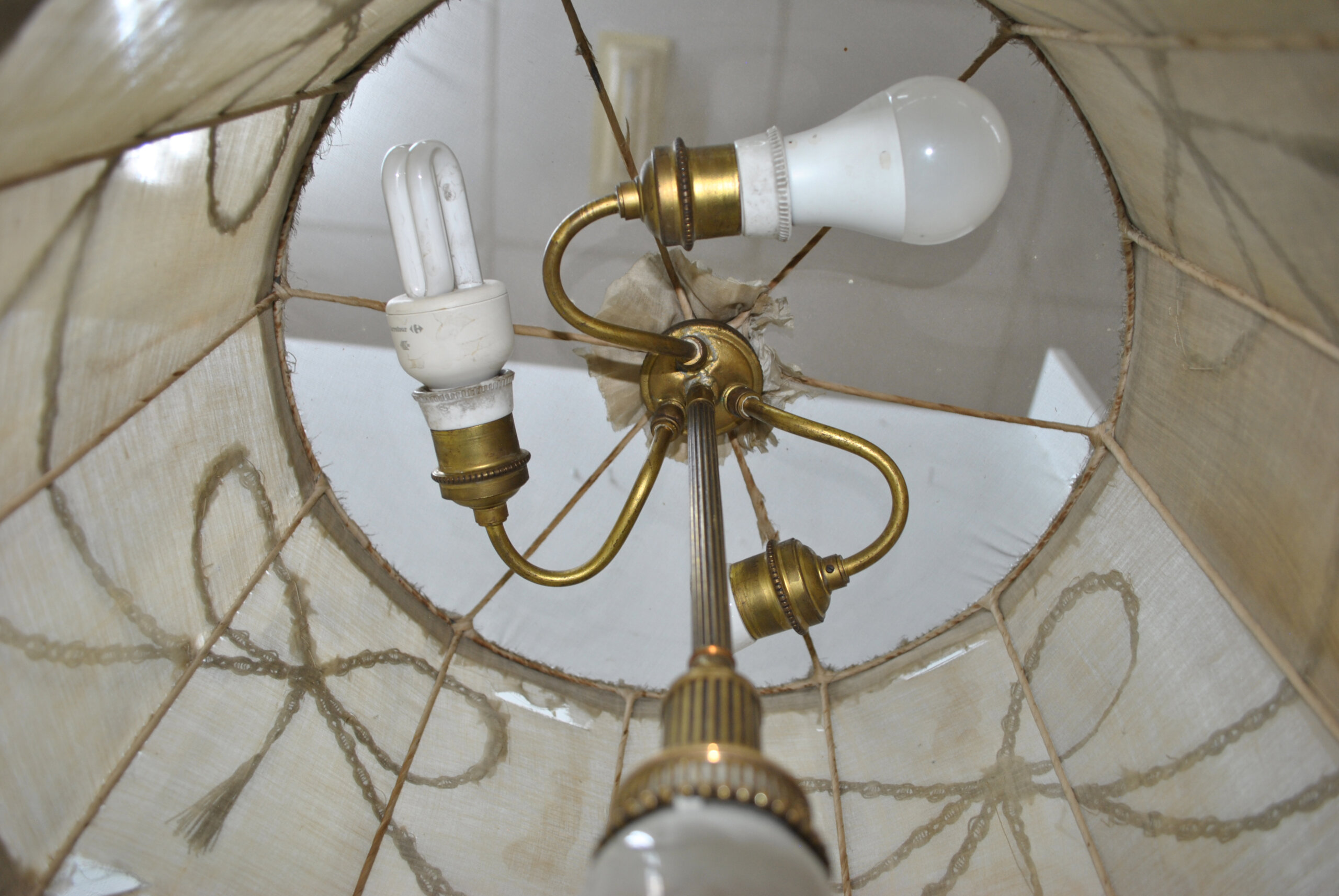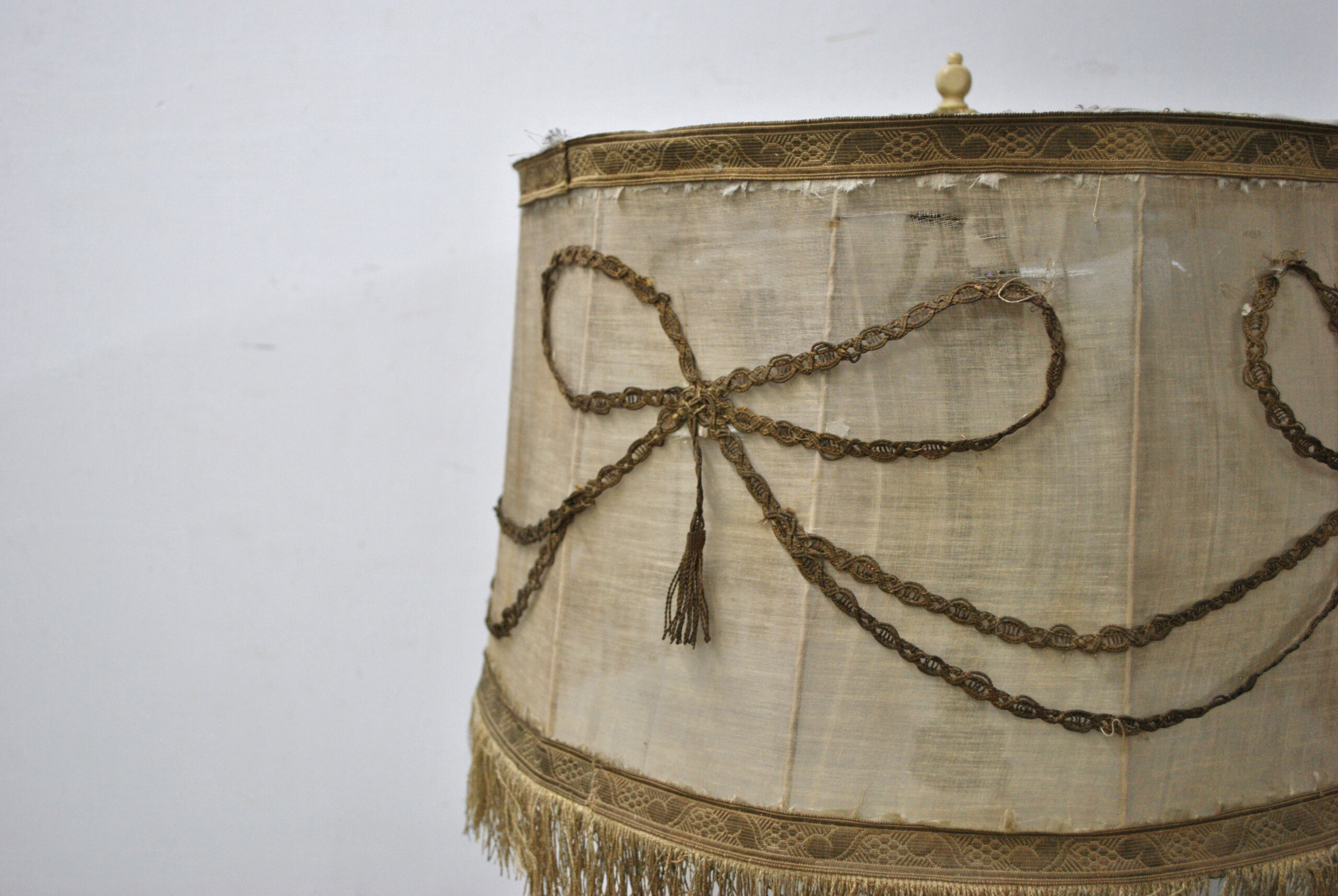 La pantalla es de tela beige con adornos de pasamanería dorada, que forman lazos y guirnaldas decorativas, además de un elegante flequillo en la parte inferior. Su estructura interna es metálica, con brazos de latón y doble portalámpara, lo que permite una iluminación cálida y uniforme.