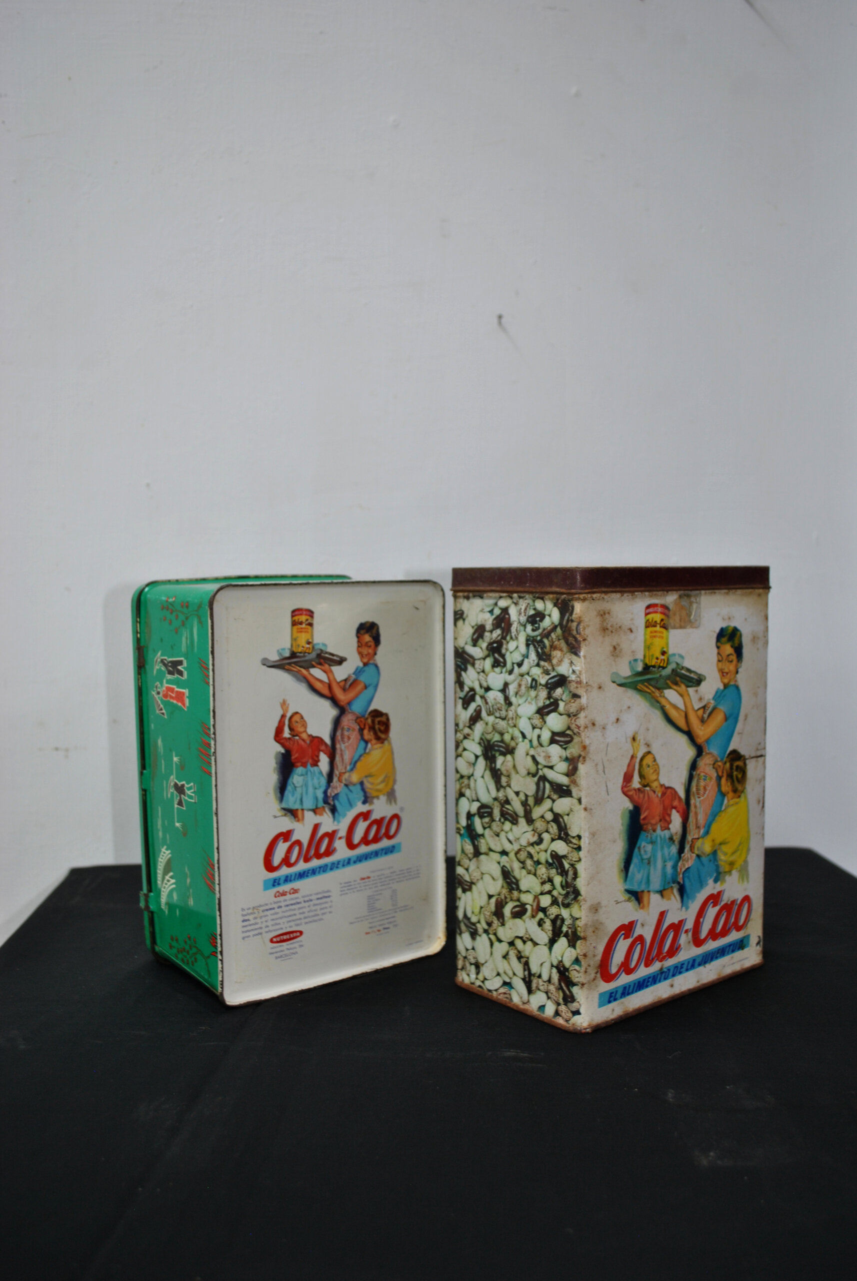 • Original de mediados del siglo XX, esta icónica lata conserva la clásica ilustración publicitaria de una madre sirviendo Cola Cao a sus hijos, acompañada del eslogan característico.
