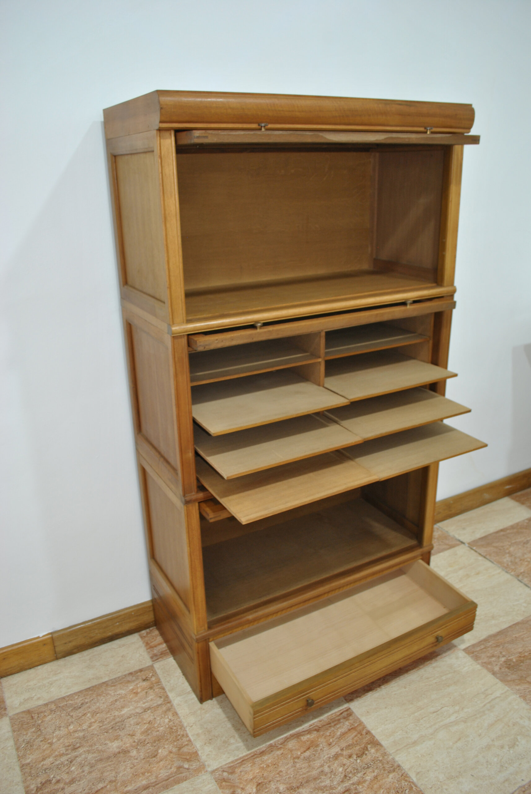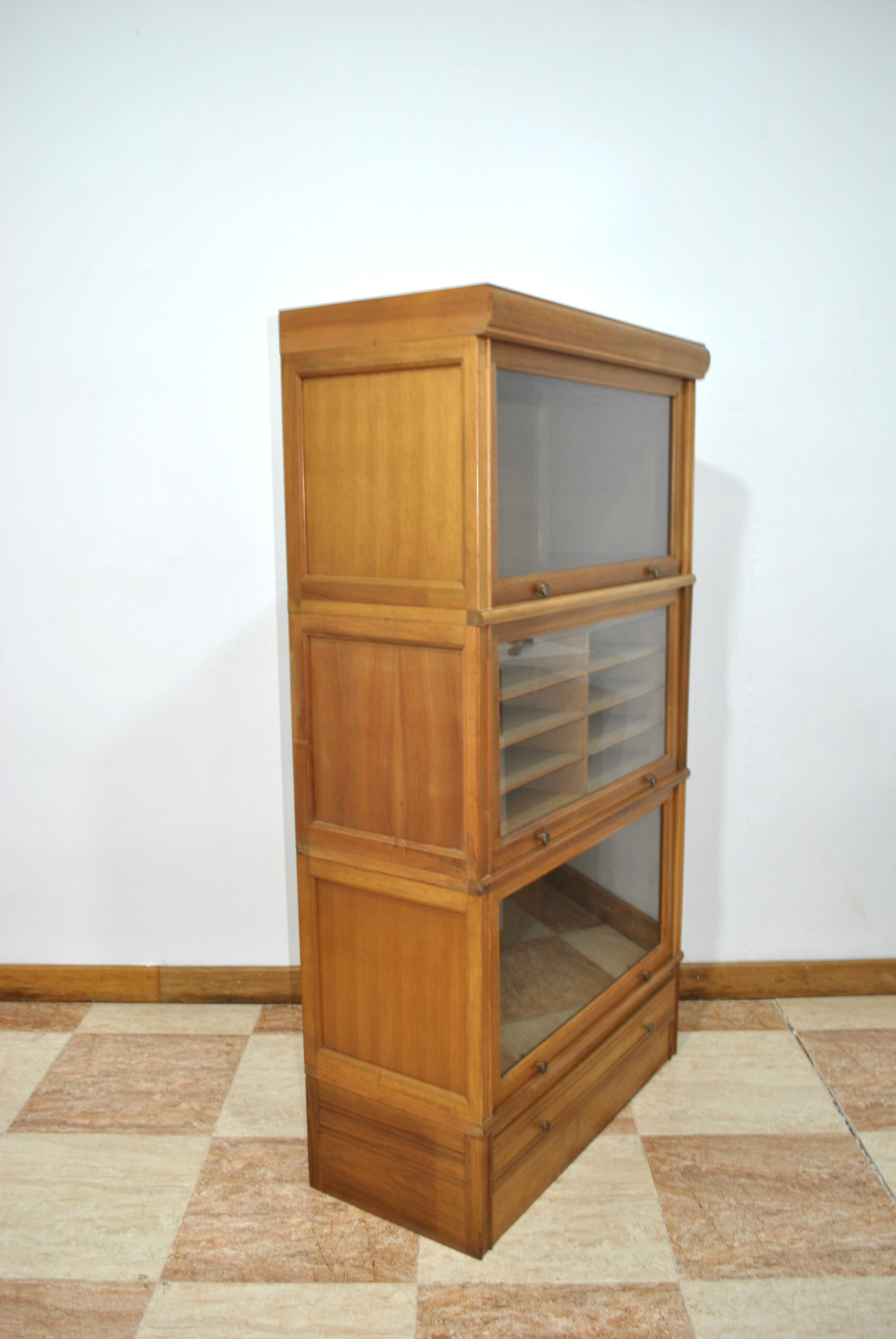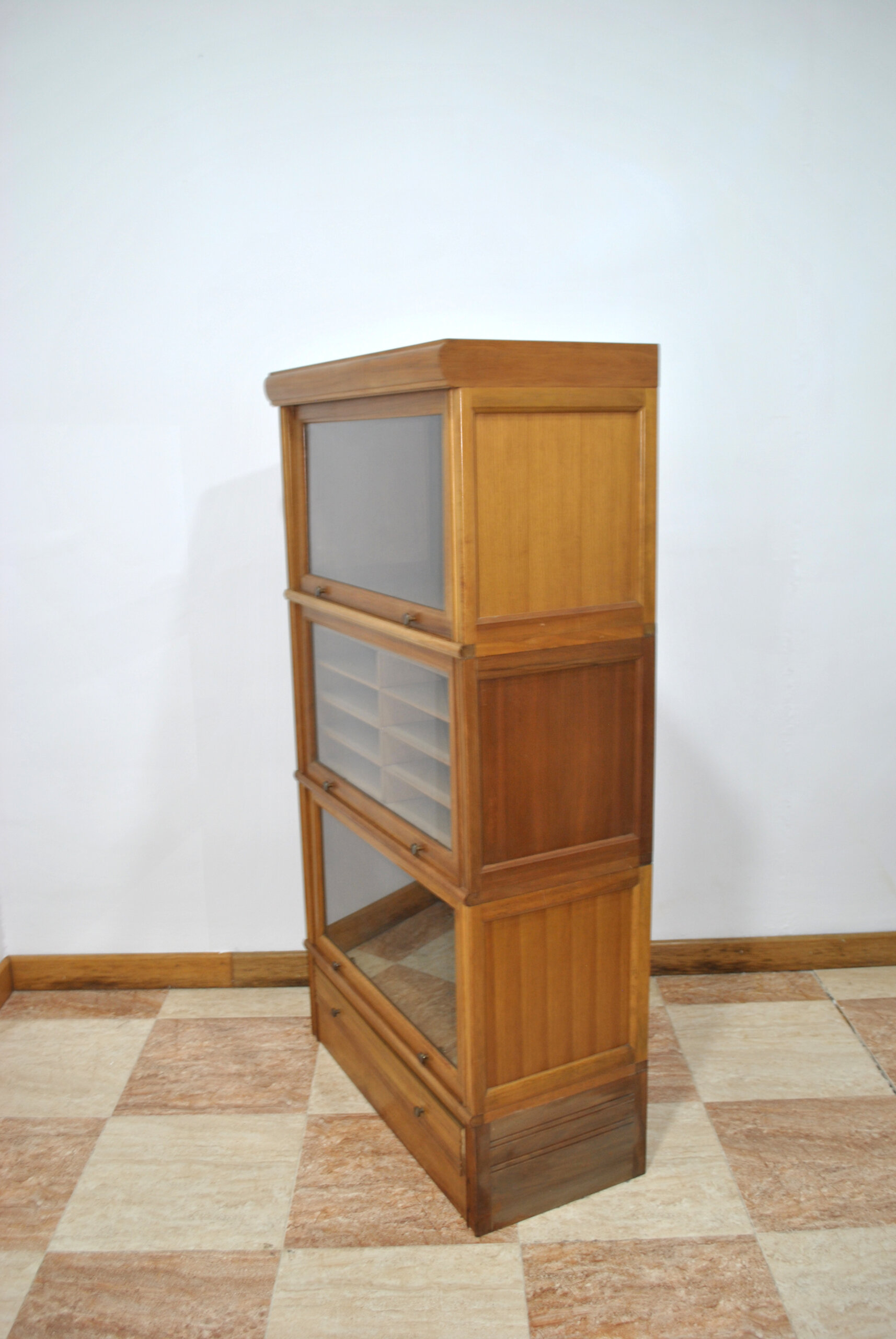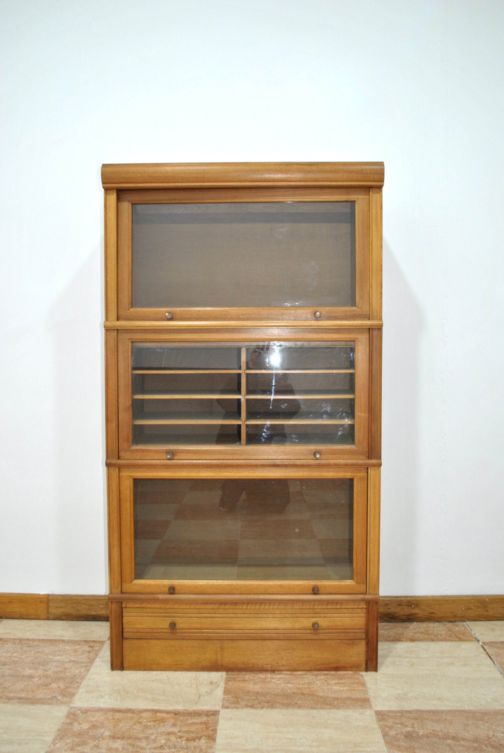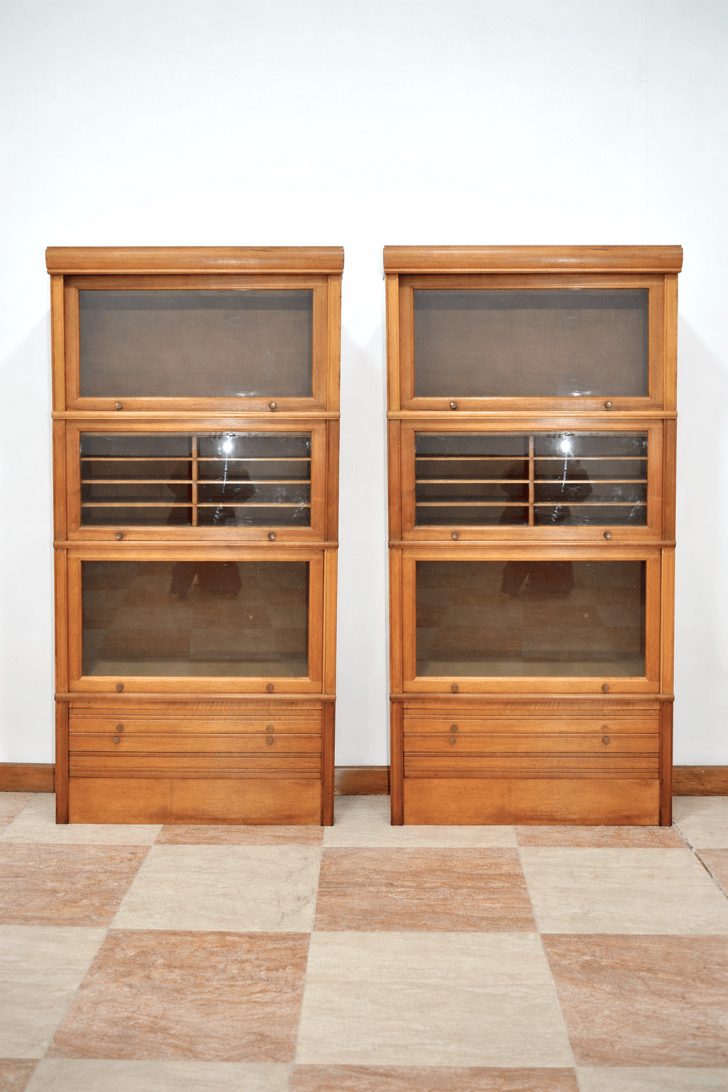 REF: 12149 – Estupenda pareja de muebles archivadores antiguos de oficina realizados en madera maciza en tono cálido miel. Compuestos por tres cuerpos con puertas correderas acristaladas y tiradores originales, incorpora en la parte central compartimentos y baldas extraíbles ideales para archivo de documentos, partituras o material de despacho.
